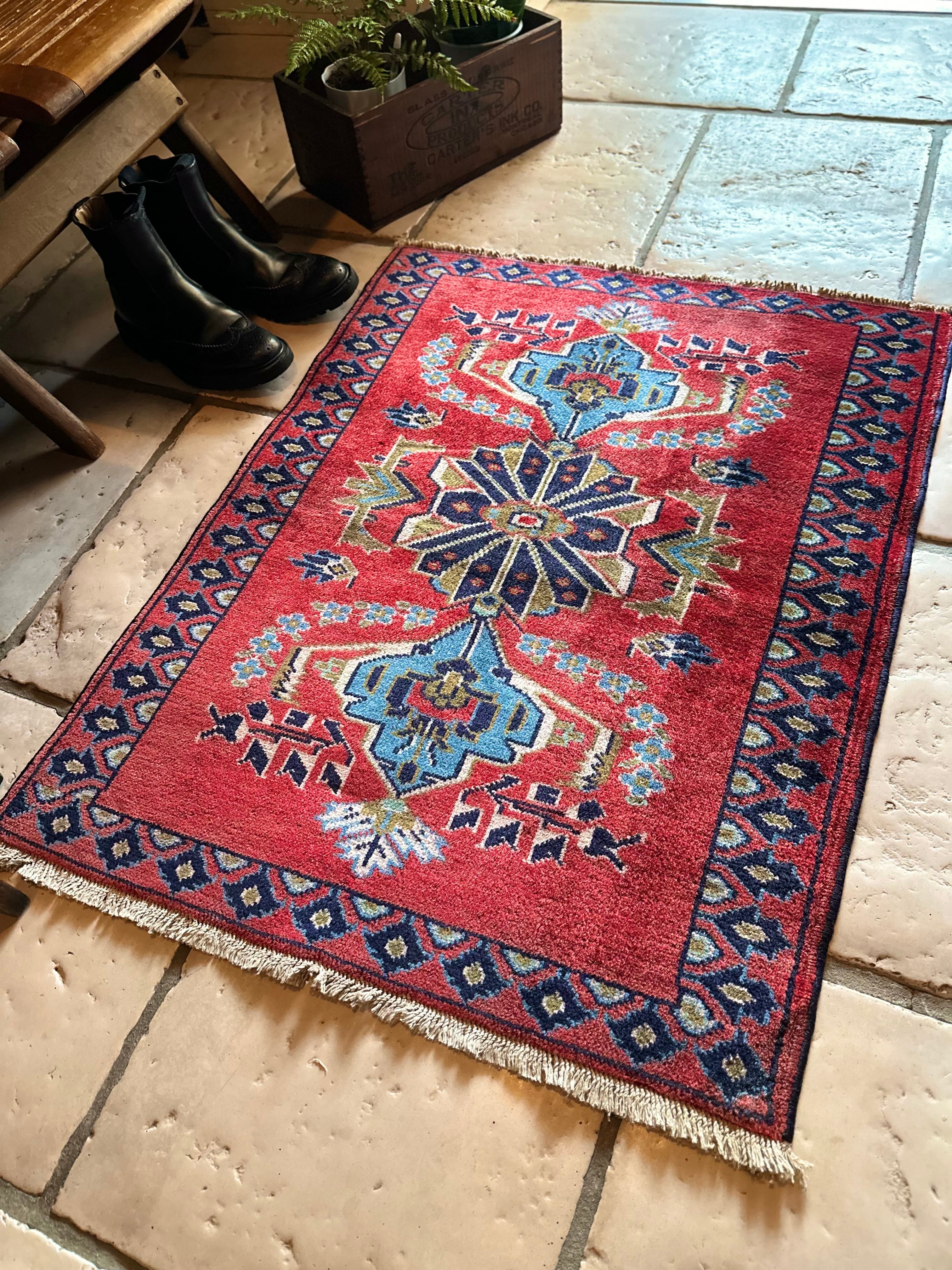 真っ赤というよりは優しい赤味で、それに対比するかのような水色との混ざり具合がネイティブ・アメリカンっぽくも見えるでしょうか。マンションの玄関にピッタリなサイズ感となりますが、色んな場所で試すのも面白いですね。