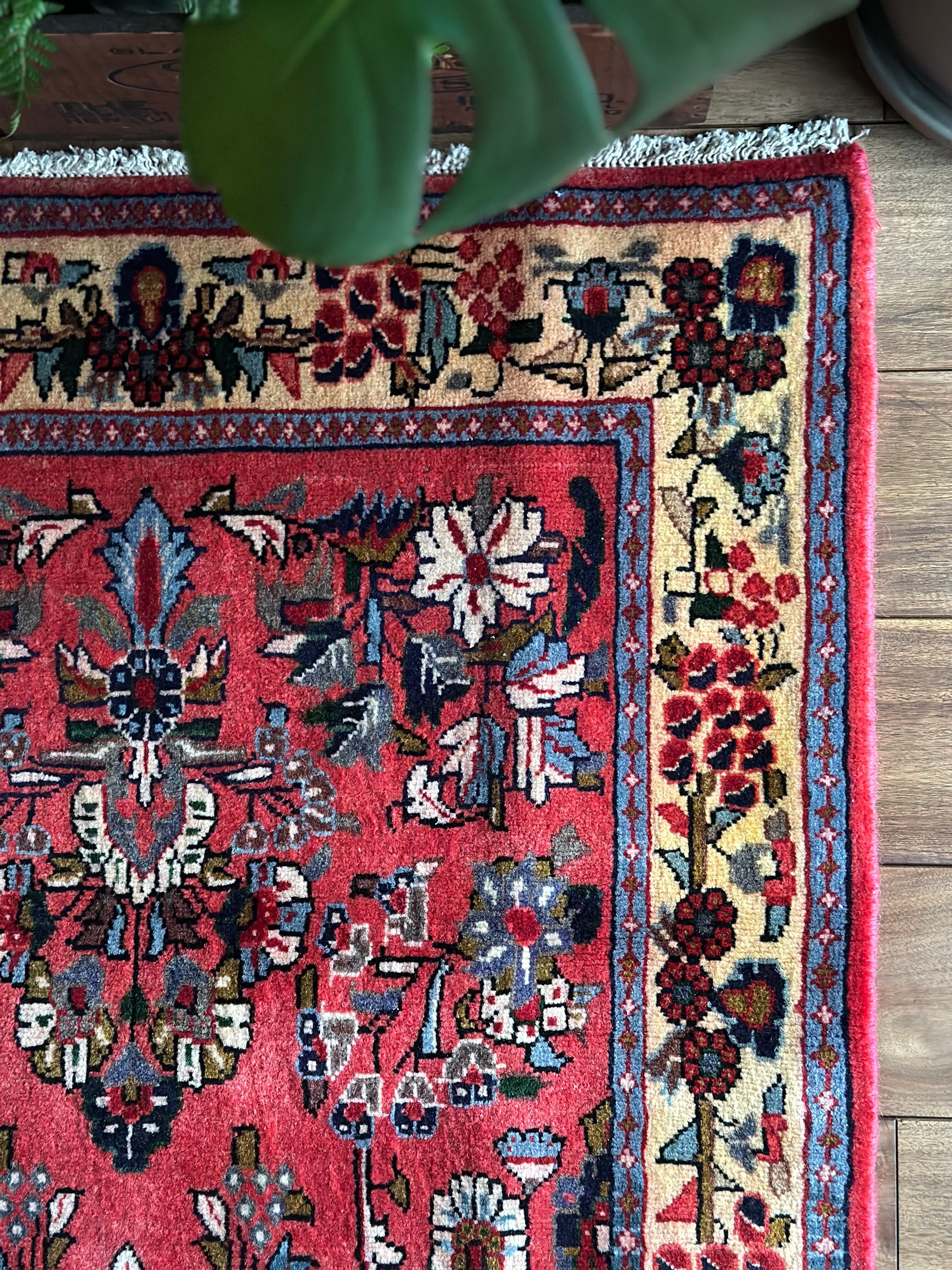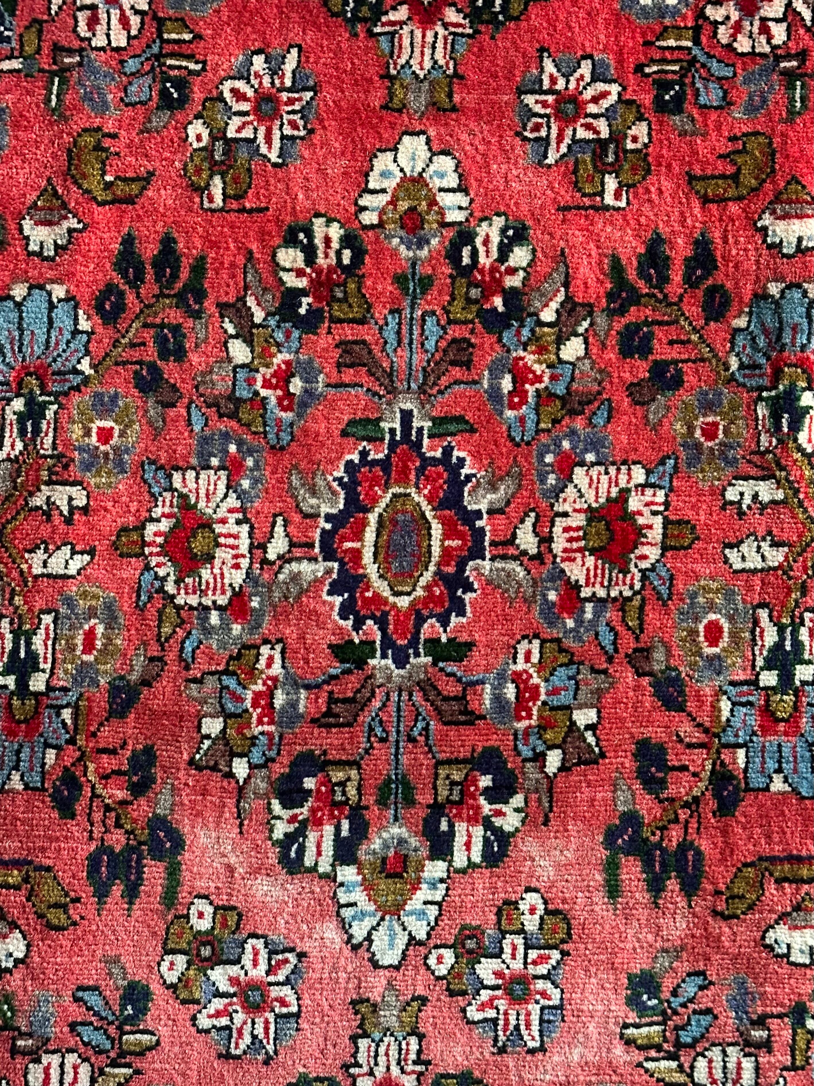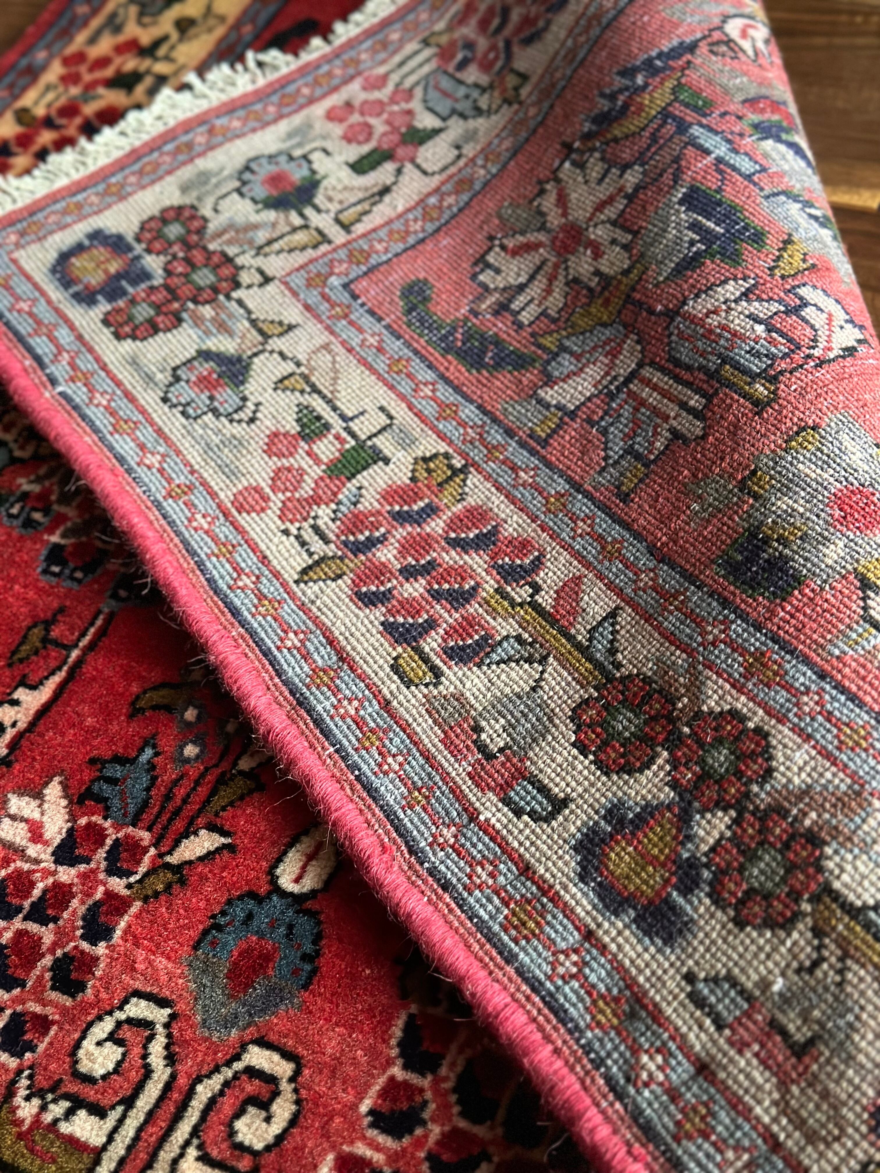 織りの細かさで欧米でも人気のアラクですが、こちらはどちらかと言えばハマダン色が濃い柄にそのしっかりとした厚みが長年使えそうかと、全体的に描かれた花や植物にアブラッシュがかった淡いピンクが美しい1枚になります。