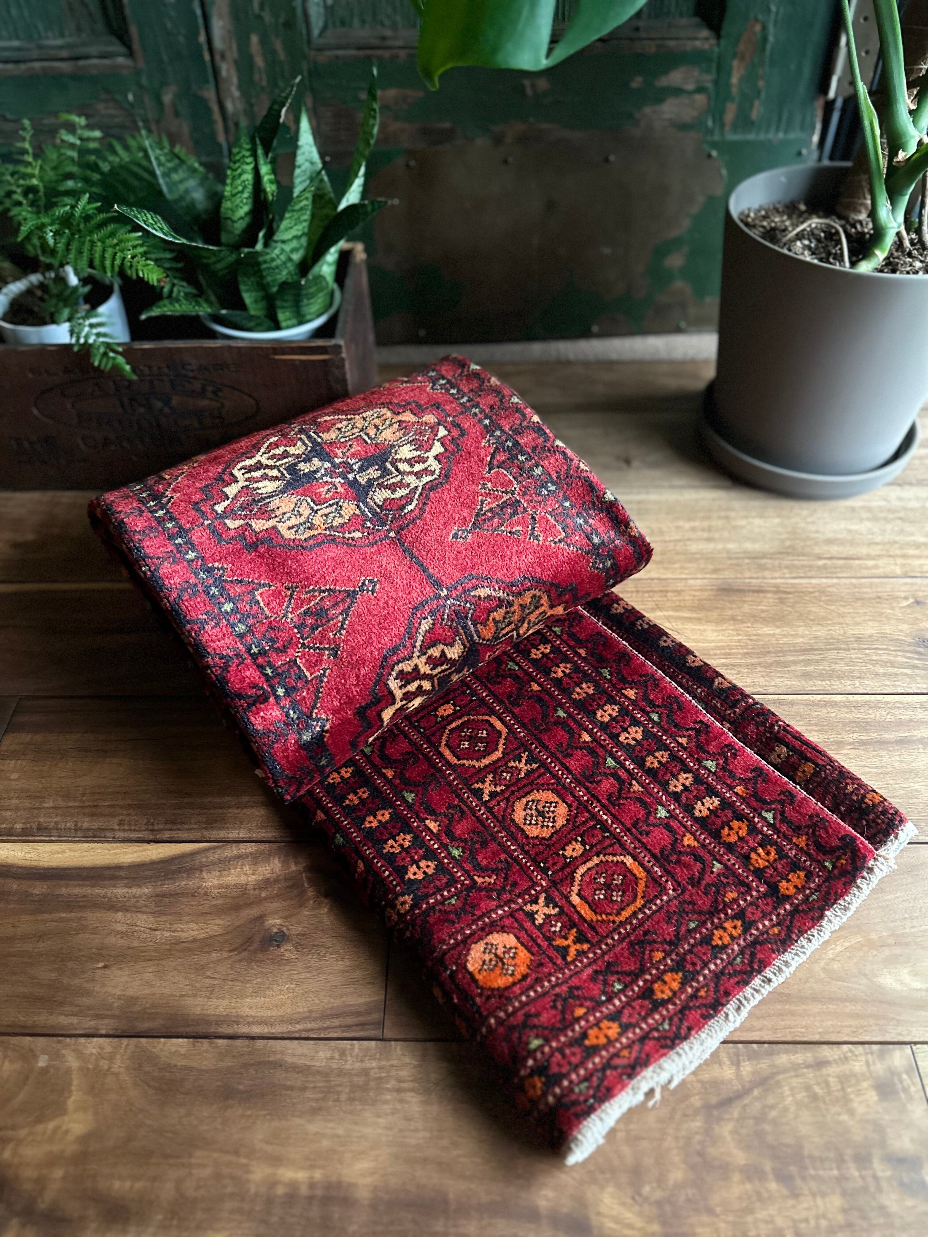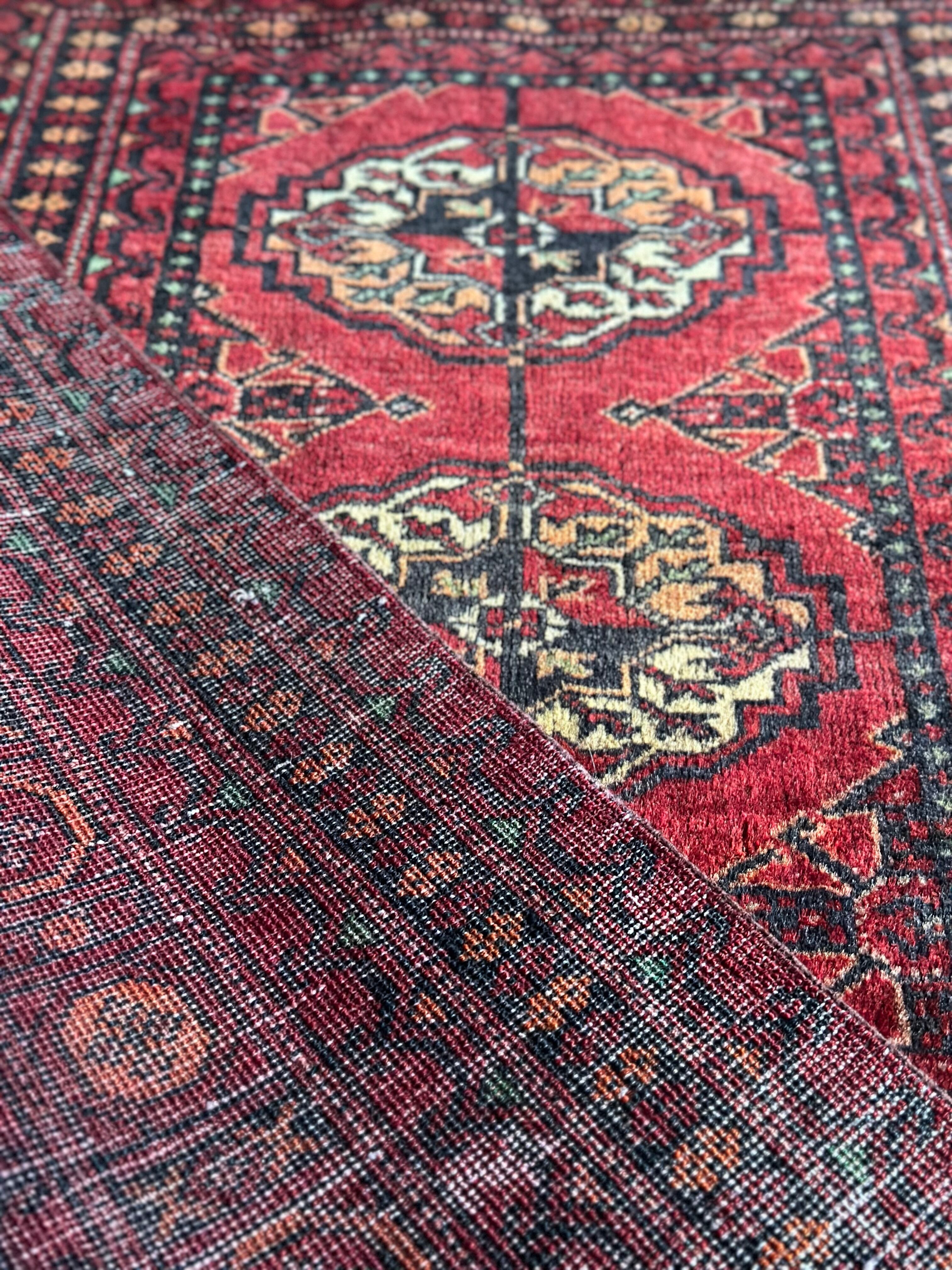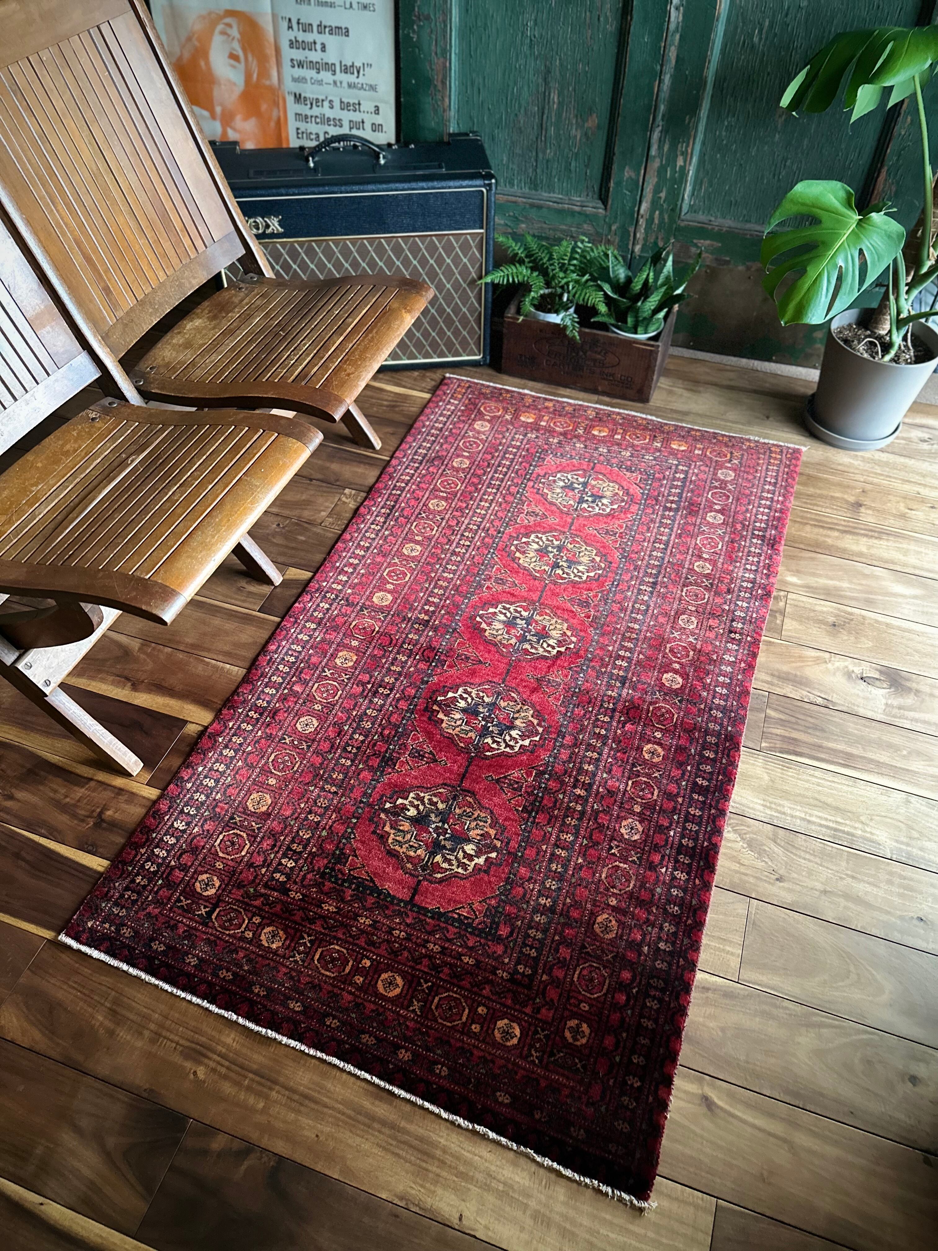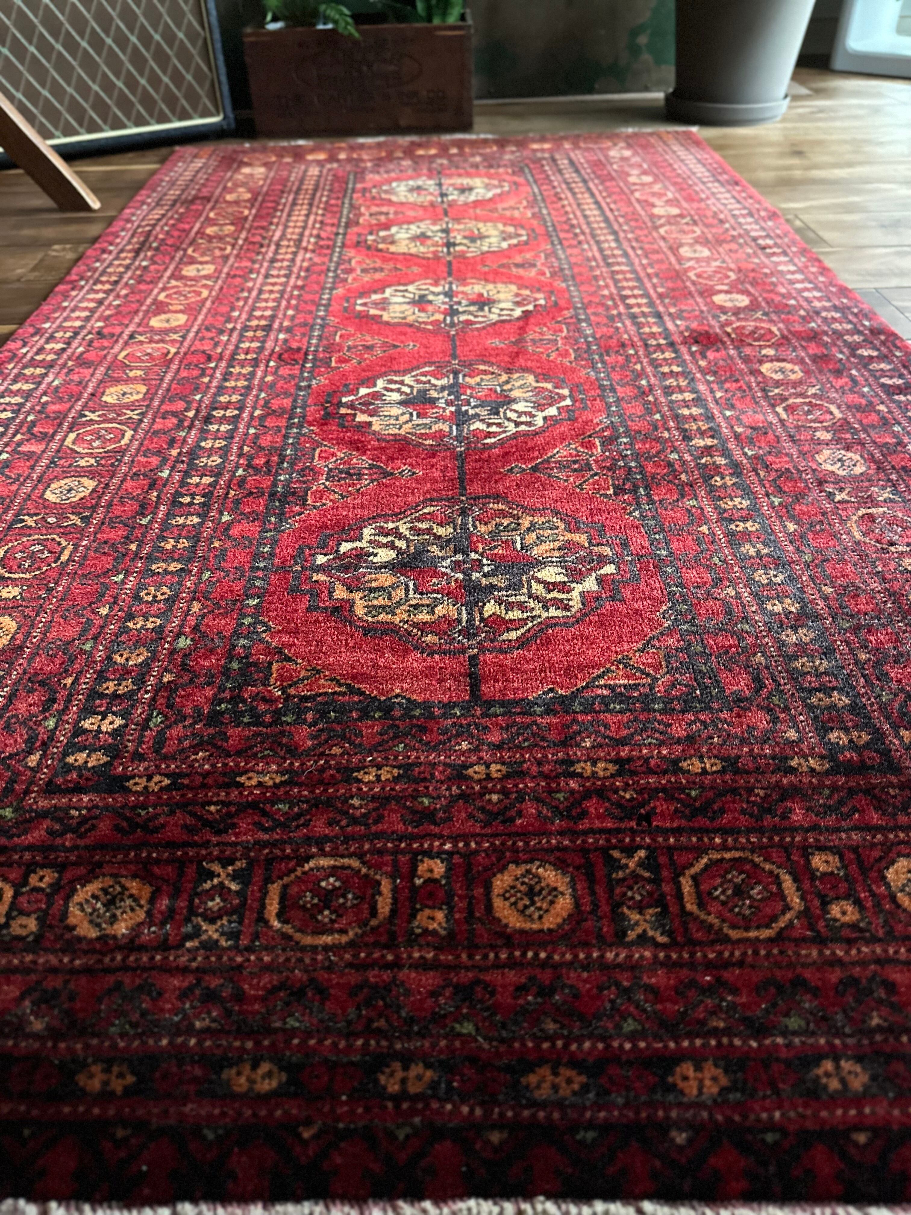 程よく色褪せたワインレッドにビシっと配列された規則正しさがカッコいいトライバルラグと言えば、バルーチにトルクメンと相場は決まってますが、こちらそんな部族が混在するホラサン地方の異部族交流から産まれたテッケ族由来のトライバルラグになります。