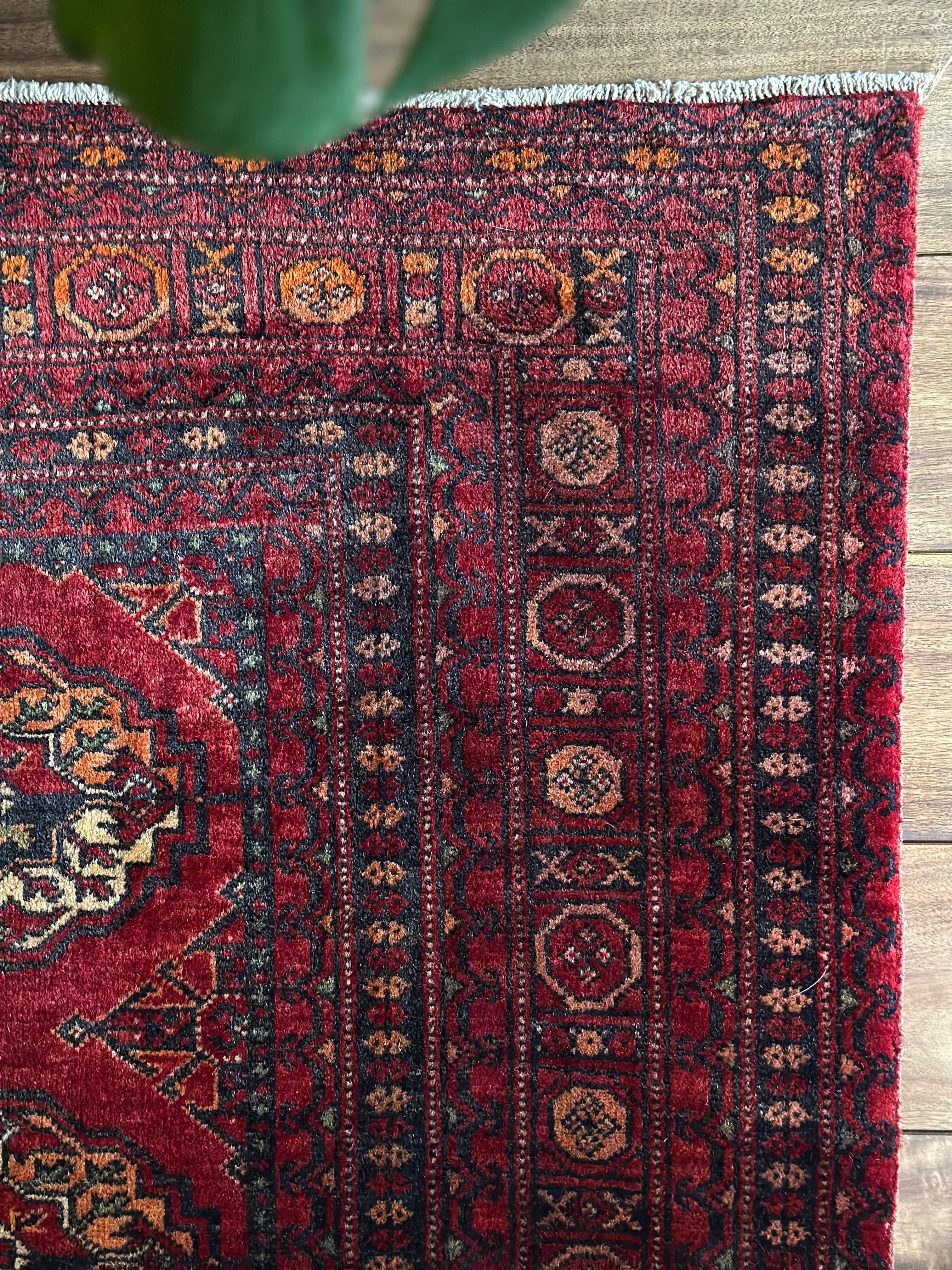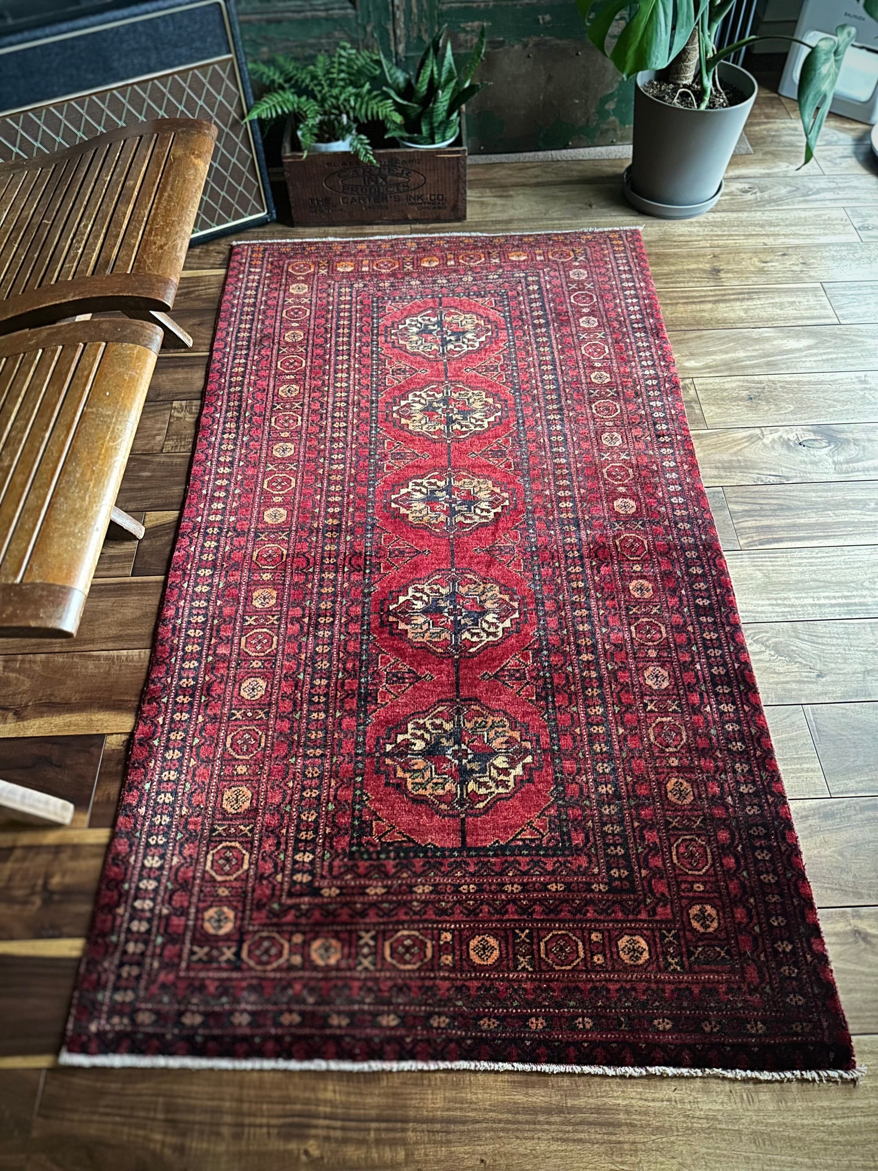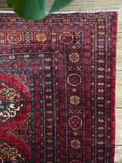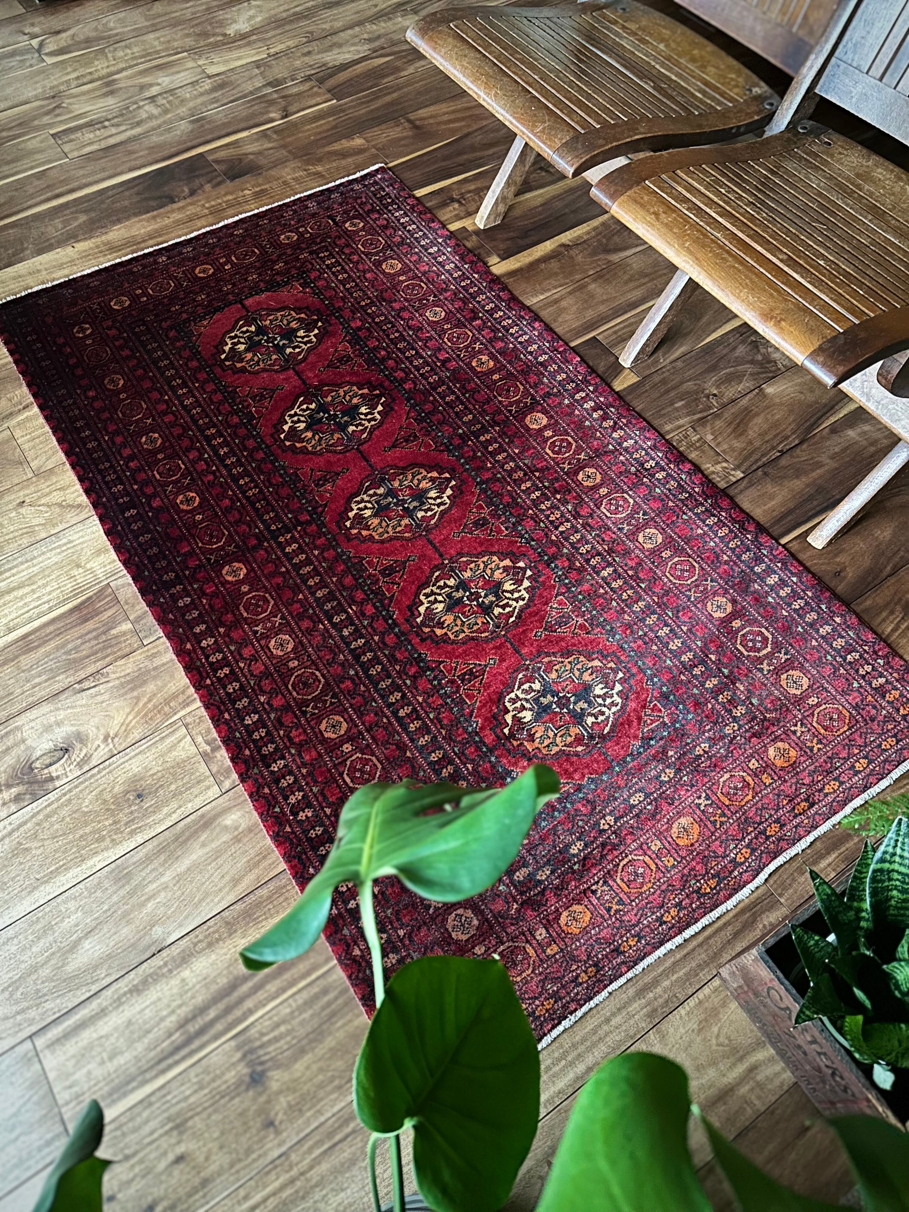 程よく色褪せたワインレッドにビシっと配列された規則正しさがカッコいいトライバルラグと言えば、バルーチにトルクメンと相場は決まってますが、こちらそんな部族が混在するホラサン地方の異部族交流から産まれたテッケ族由来のトライバルラグになります。