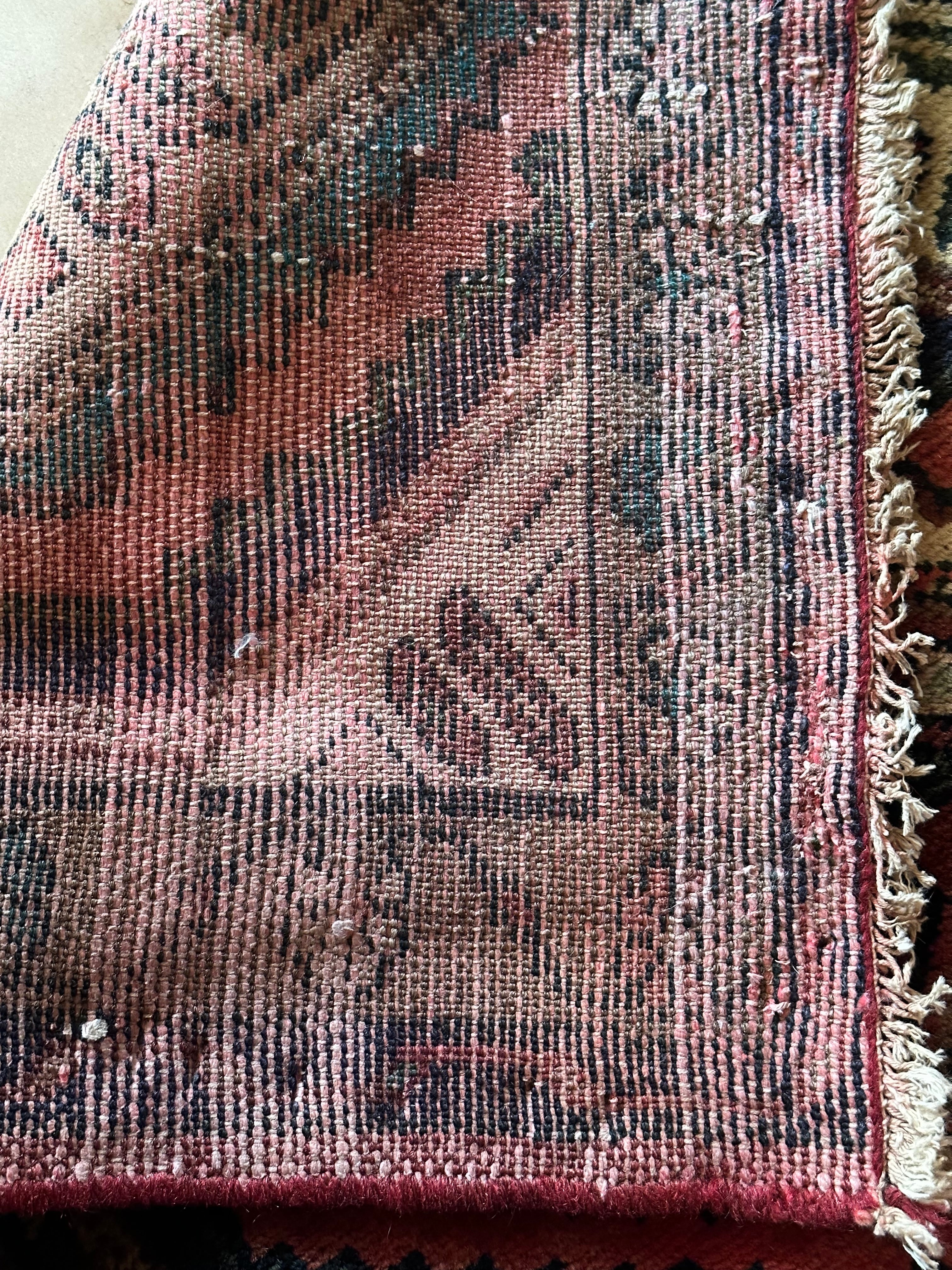 またラグそのものに関しては羊毛特有の匂いがあり手織りによる歪みや経年劣化、草木染めによる色ムラなどがありますが、それもまたトライバルラグの魅力かとご理解ください。