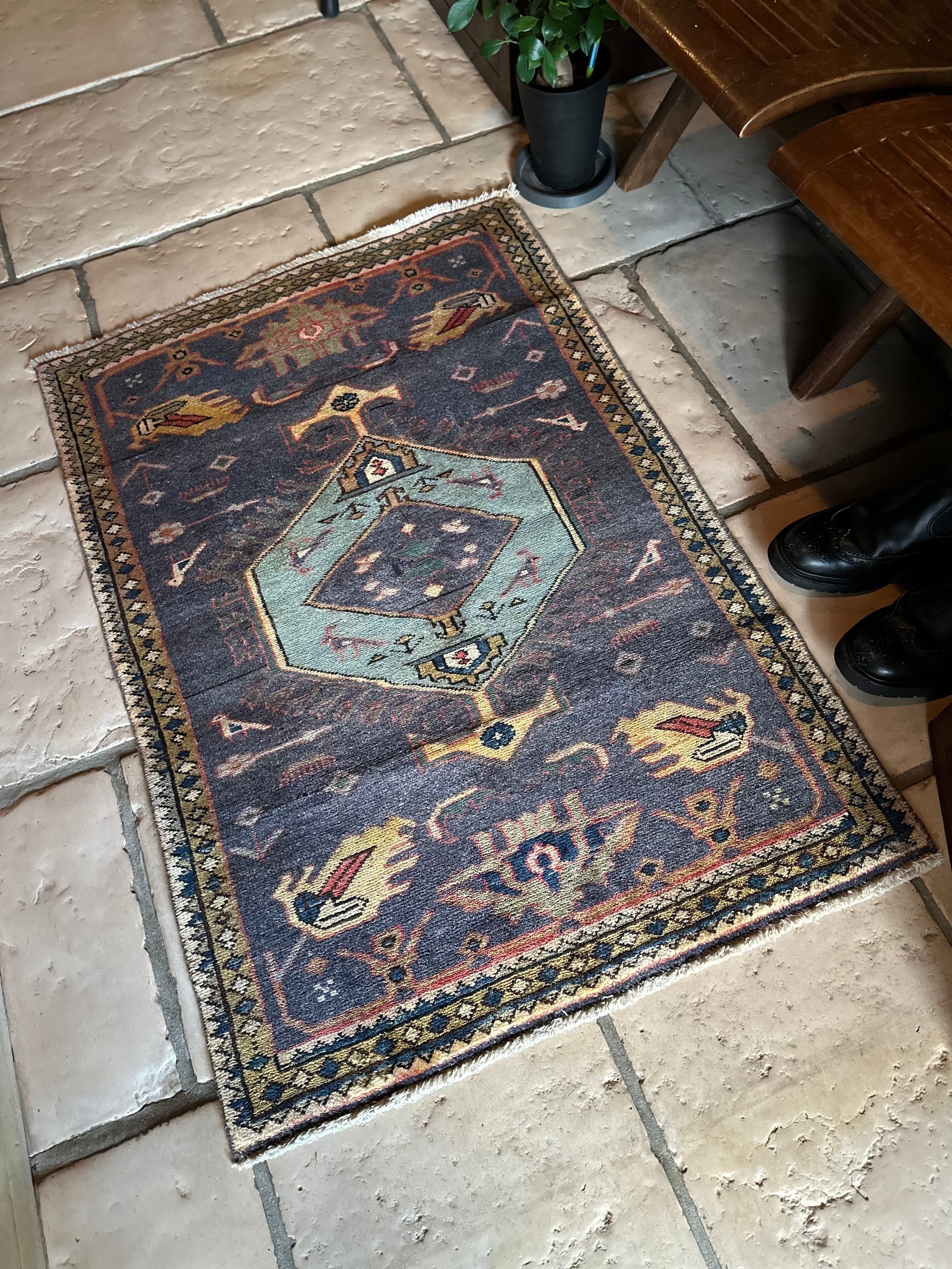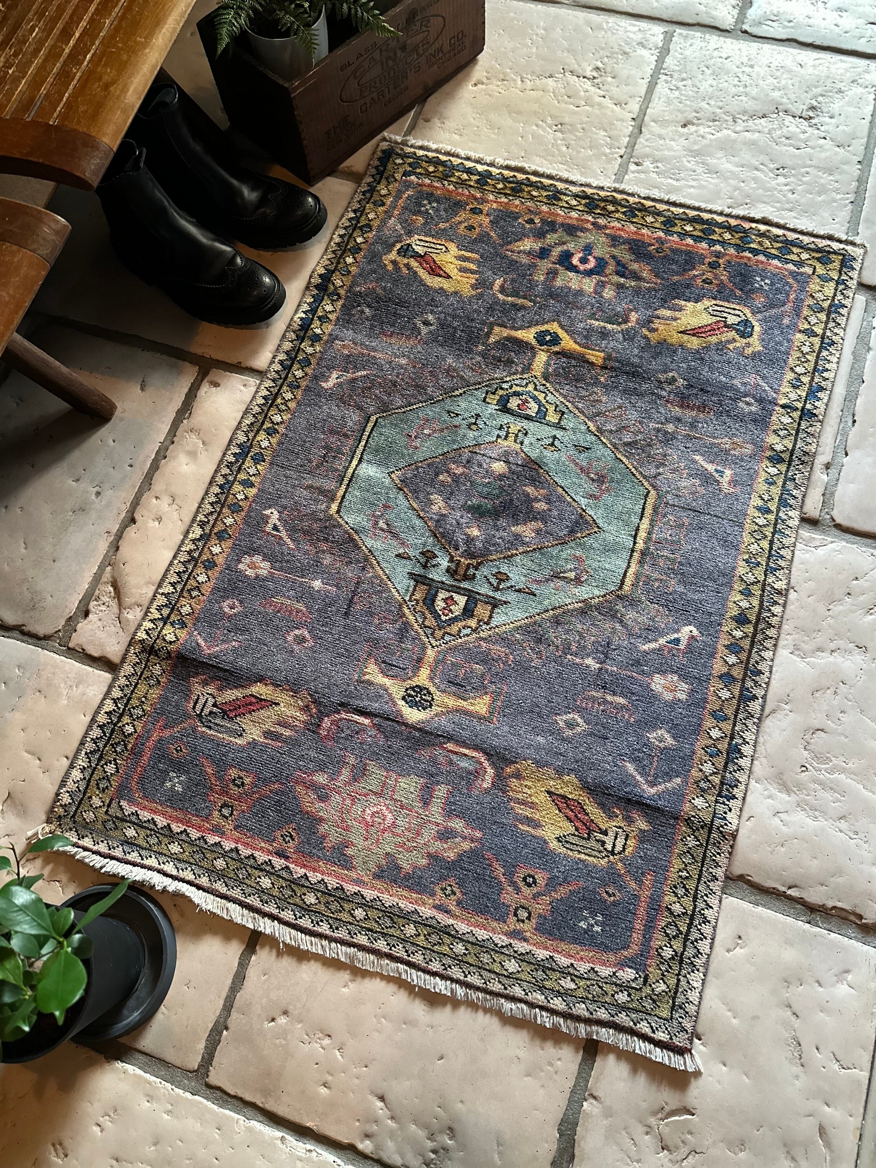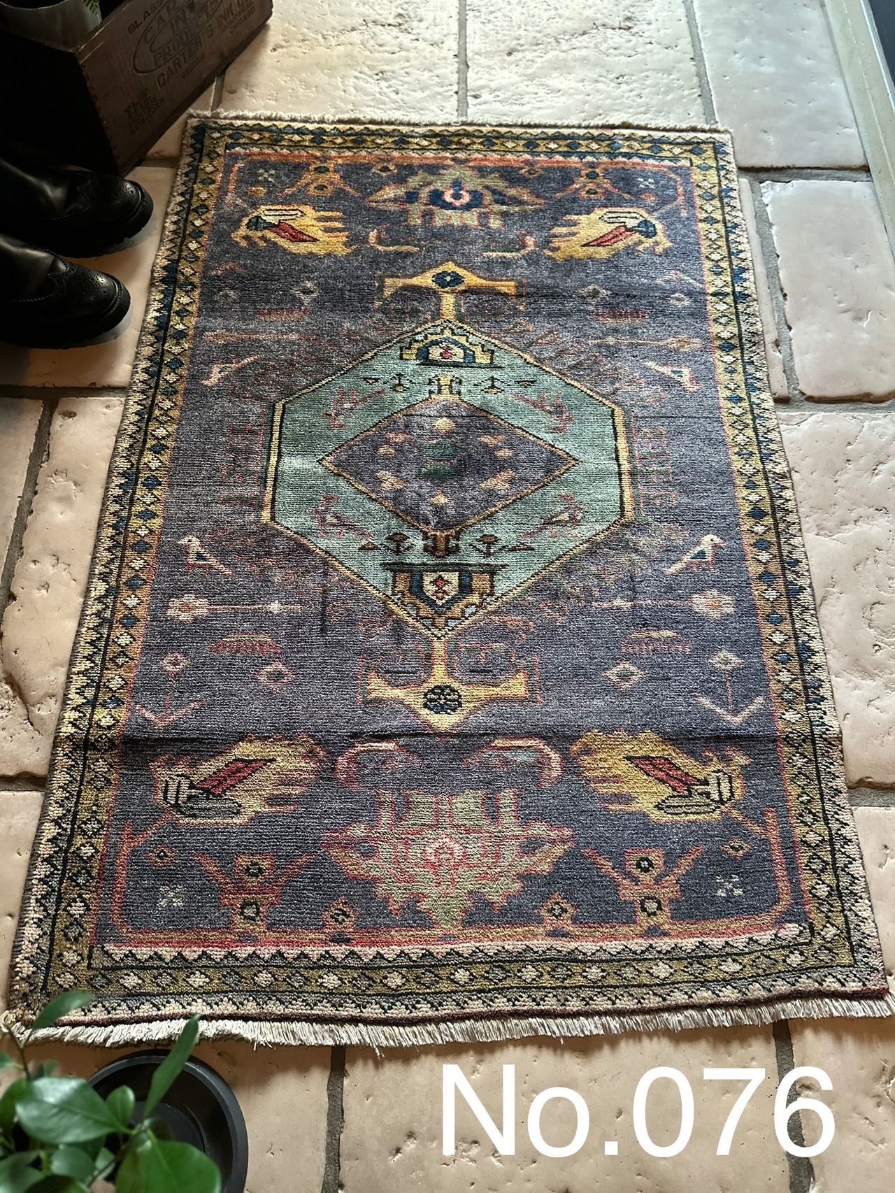 玄関マットとしてもちょうど良いサイズ感のこちらはジョフトと呼ばれる2対の絨毯となり、現地ではセットで買わされるのが常ですが、経年としては30〜40年ほど前でそれなりの使用感があり、画像は全てNo.076になりますがこちらのみ中心部分にリペアがあります。またパイルは短めながらも程よい厚みで、全体的な雰囲気は最後の動画(室内での自然光にて撮影)を参照して下さい。