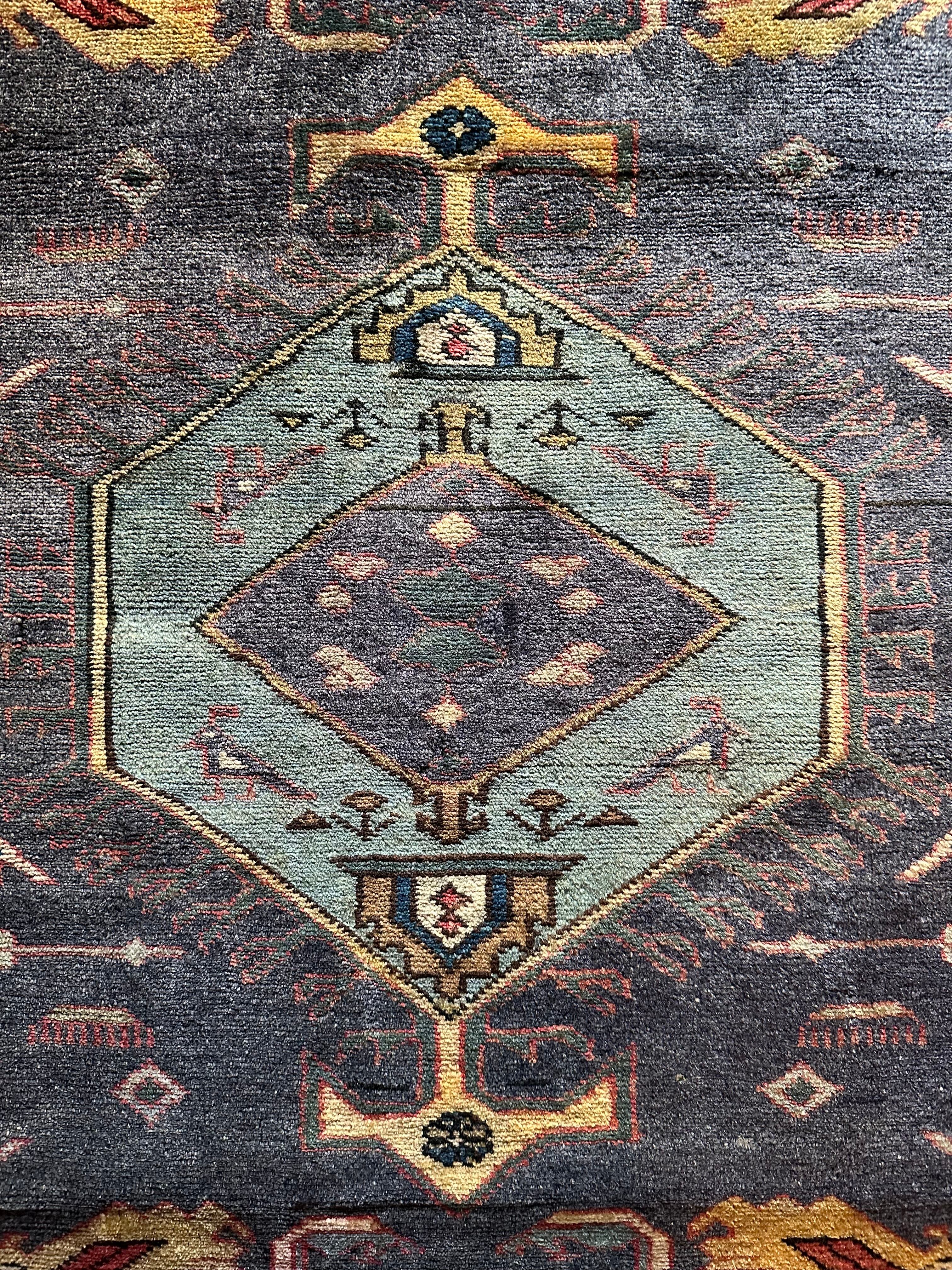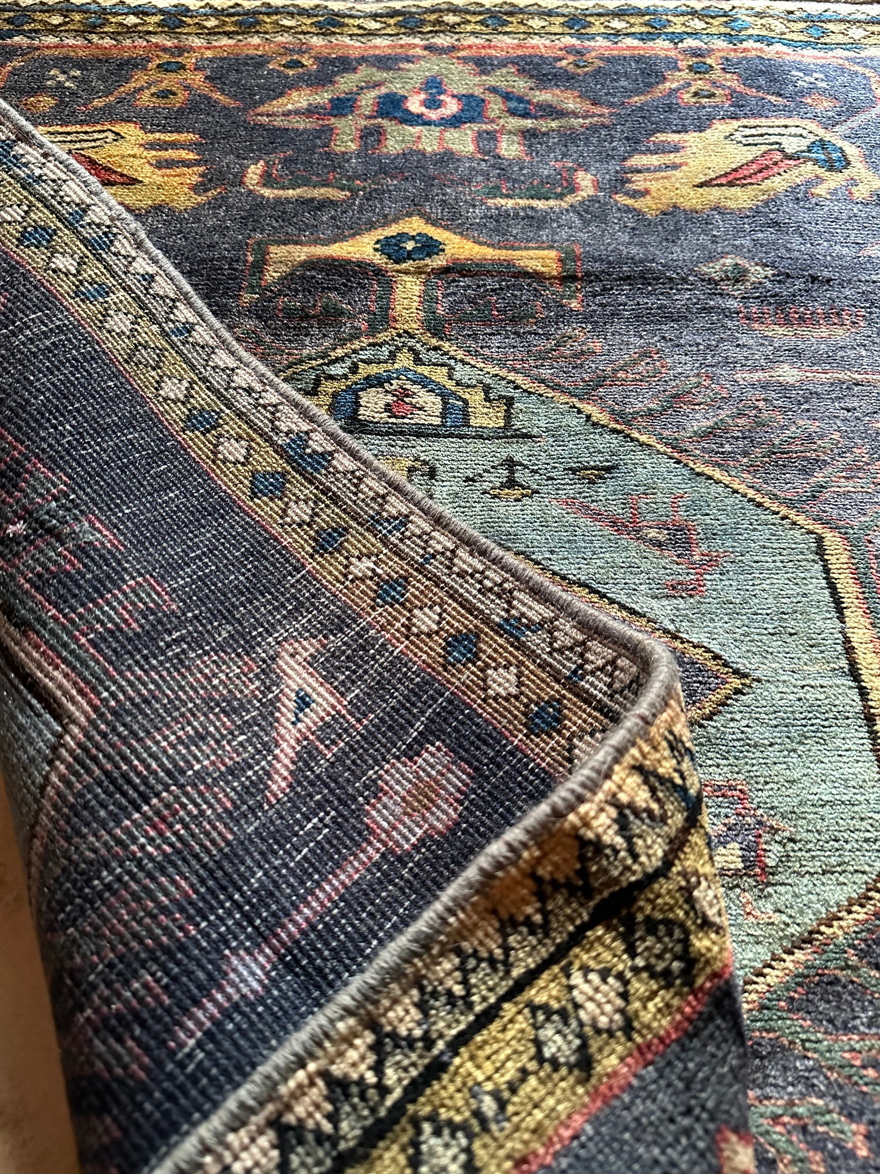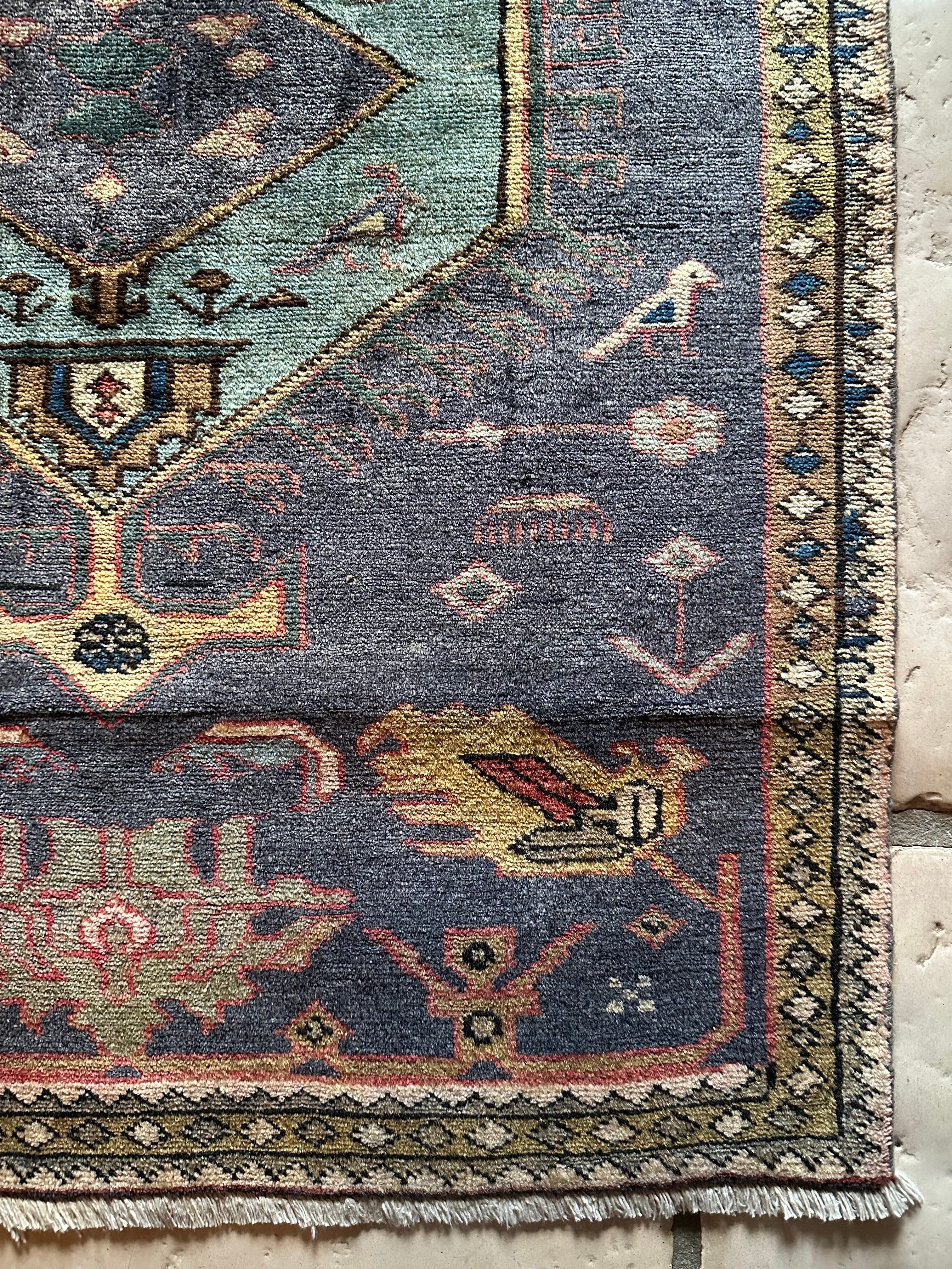 写真では上手く表現されないブルーグレーのシンプルな配色に、所々に鎮座する鳥のモチーフが愛らしいイラン北西部に位置するアルダビールのヴィレッジラグになります。