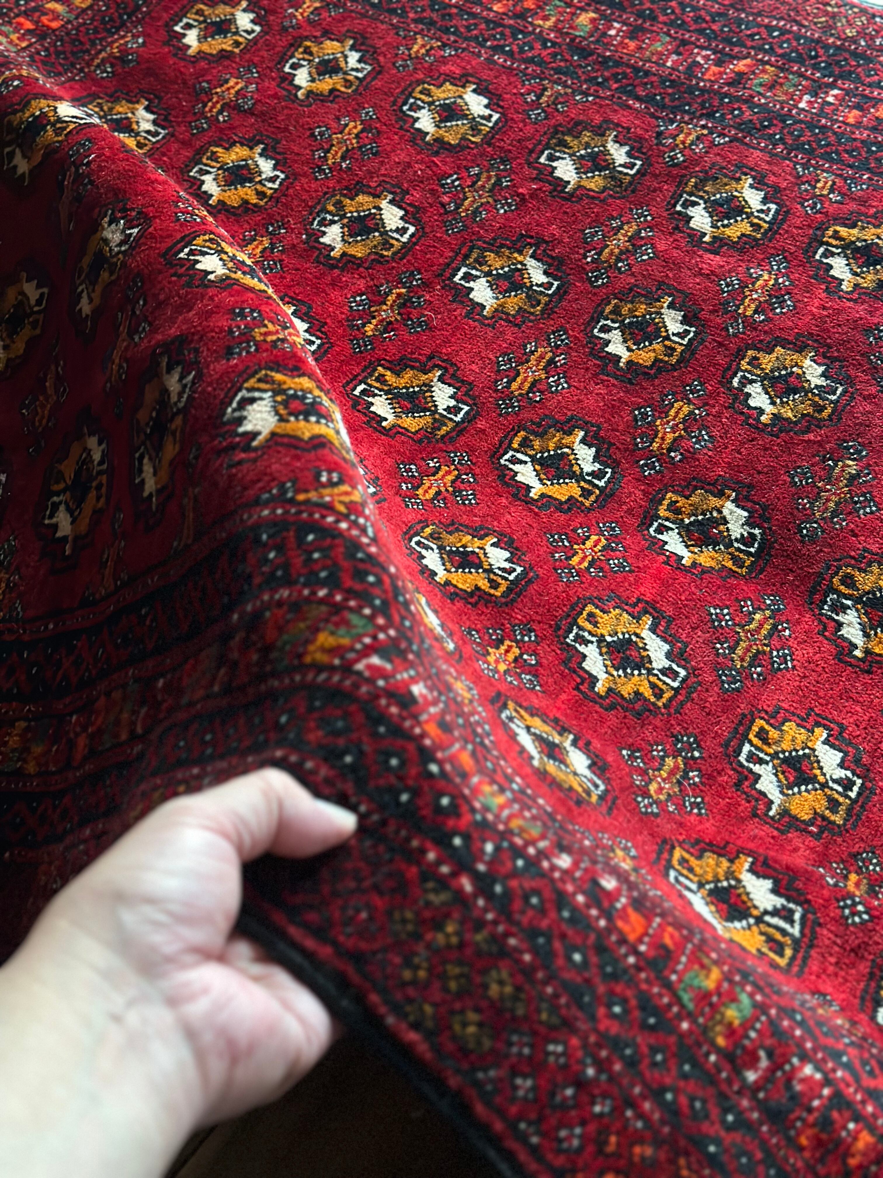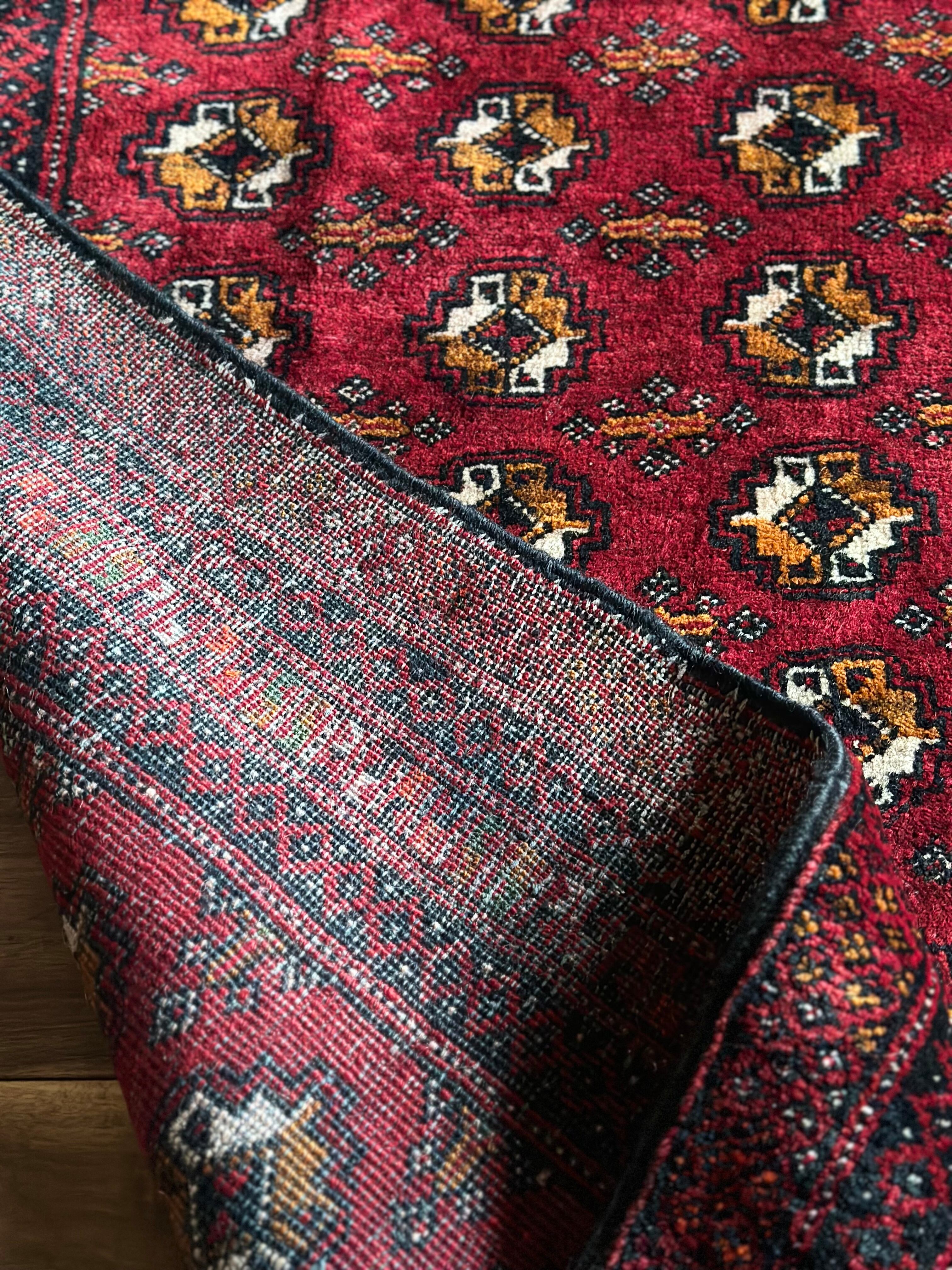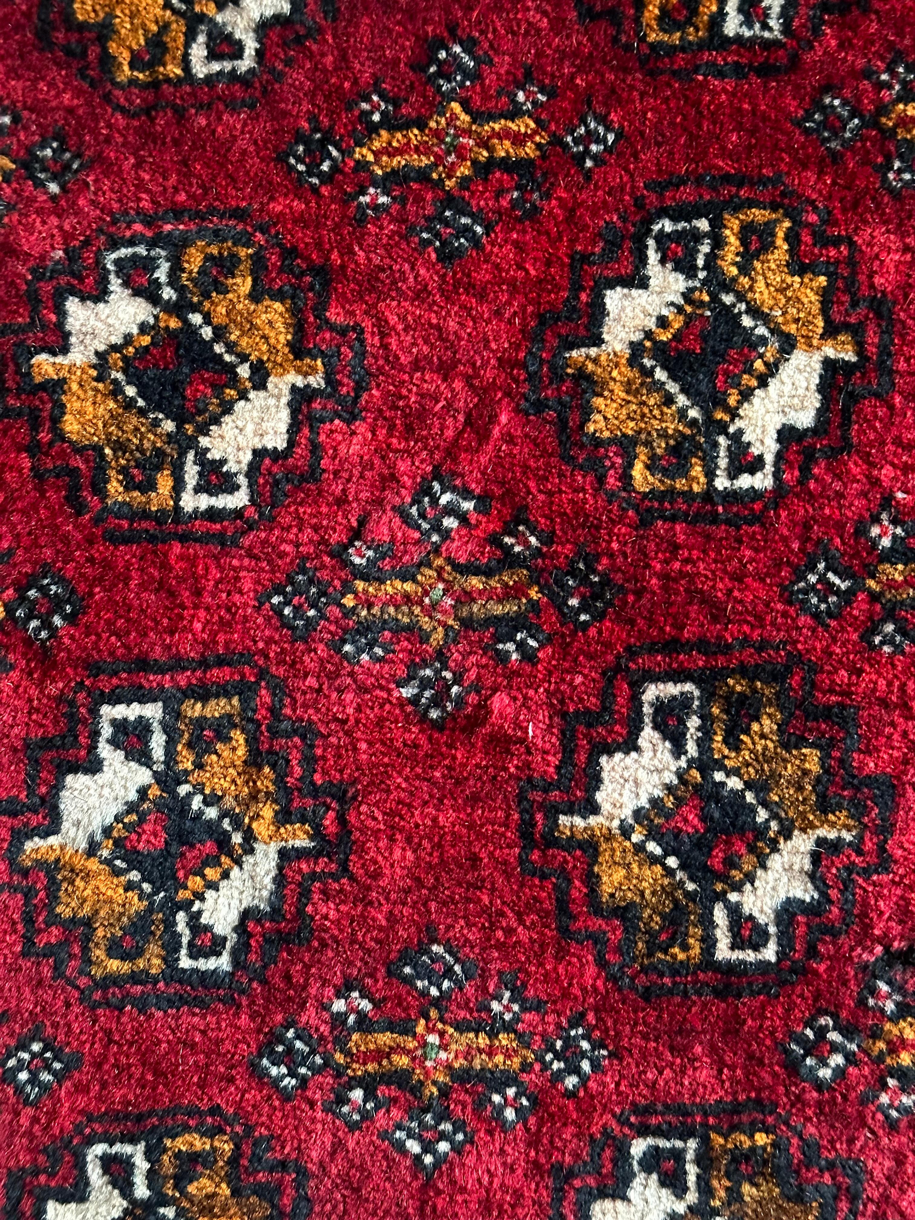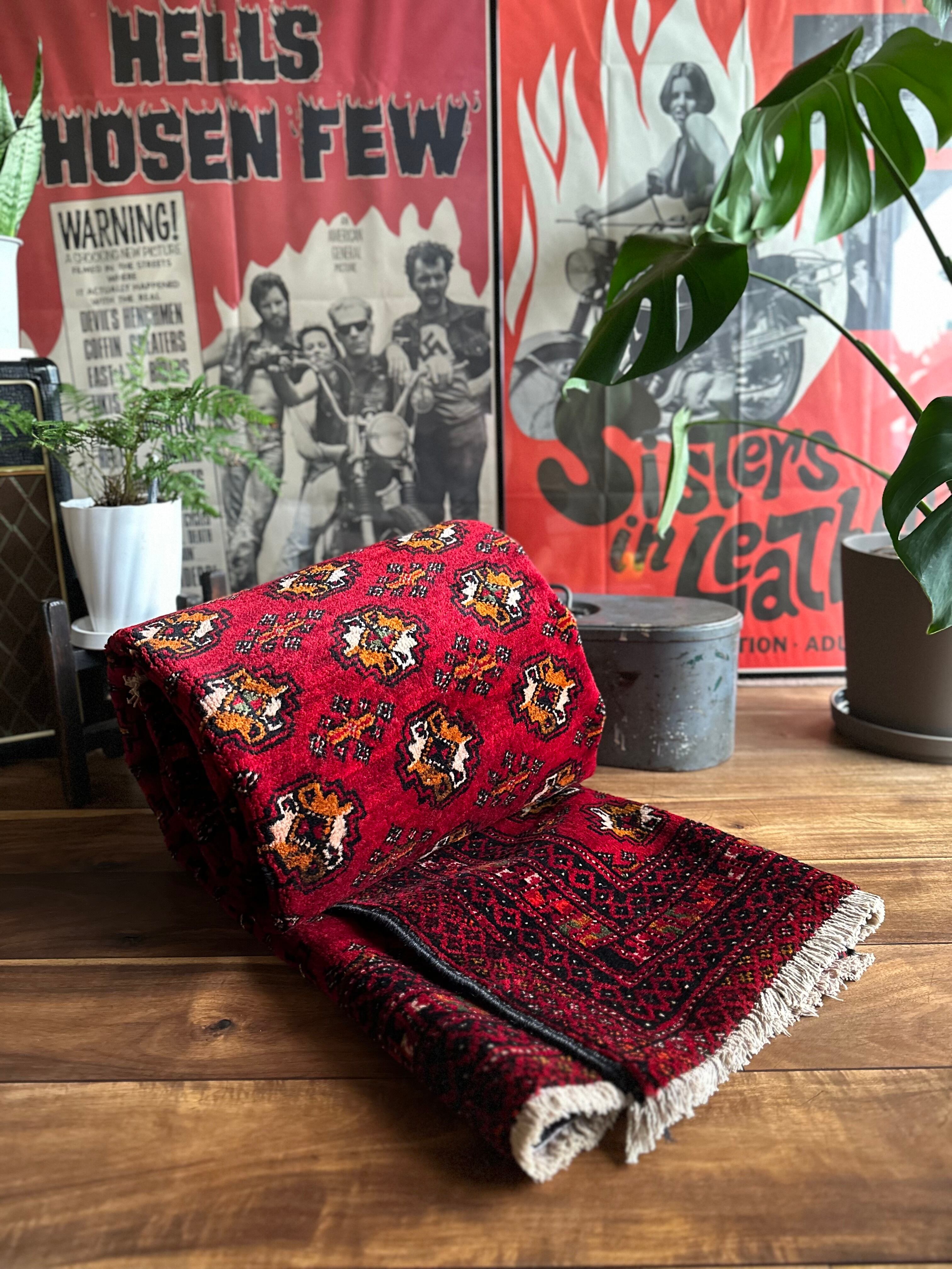 バルーチにしては発色の良い赤がトルクメンを思わす1枚で、女性の装飾具をモチーフとしたサロールギュルの連続紋様もトルクメンと似た印象を受けます。