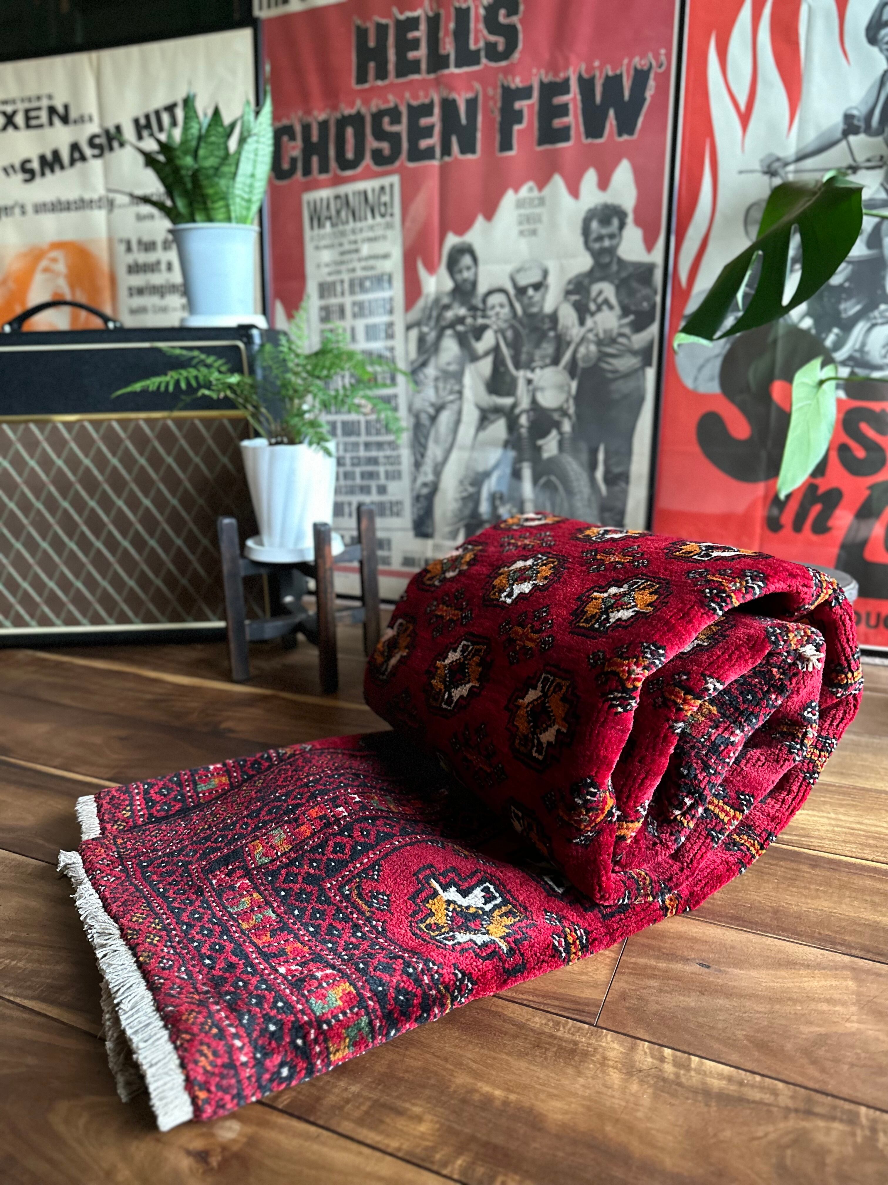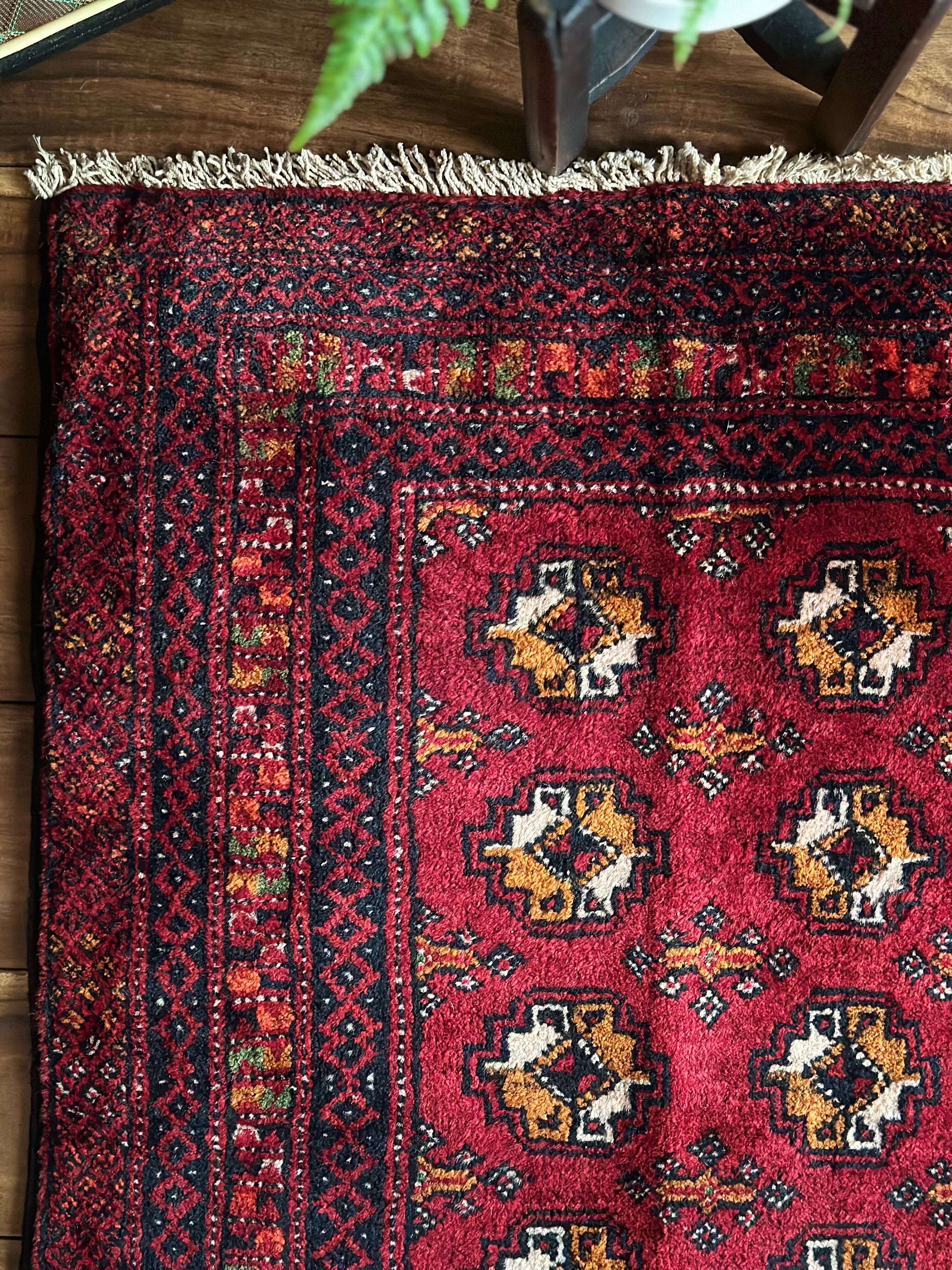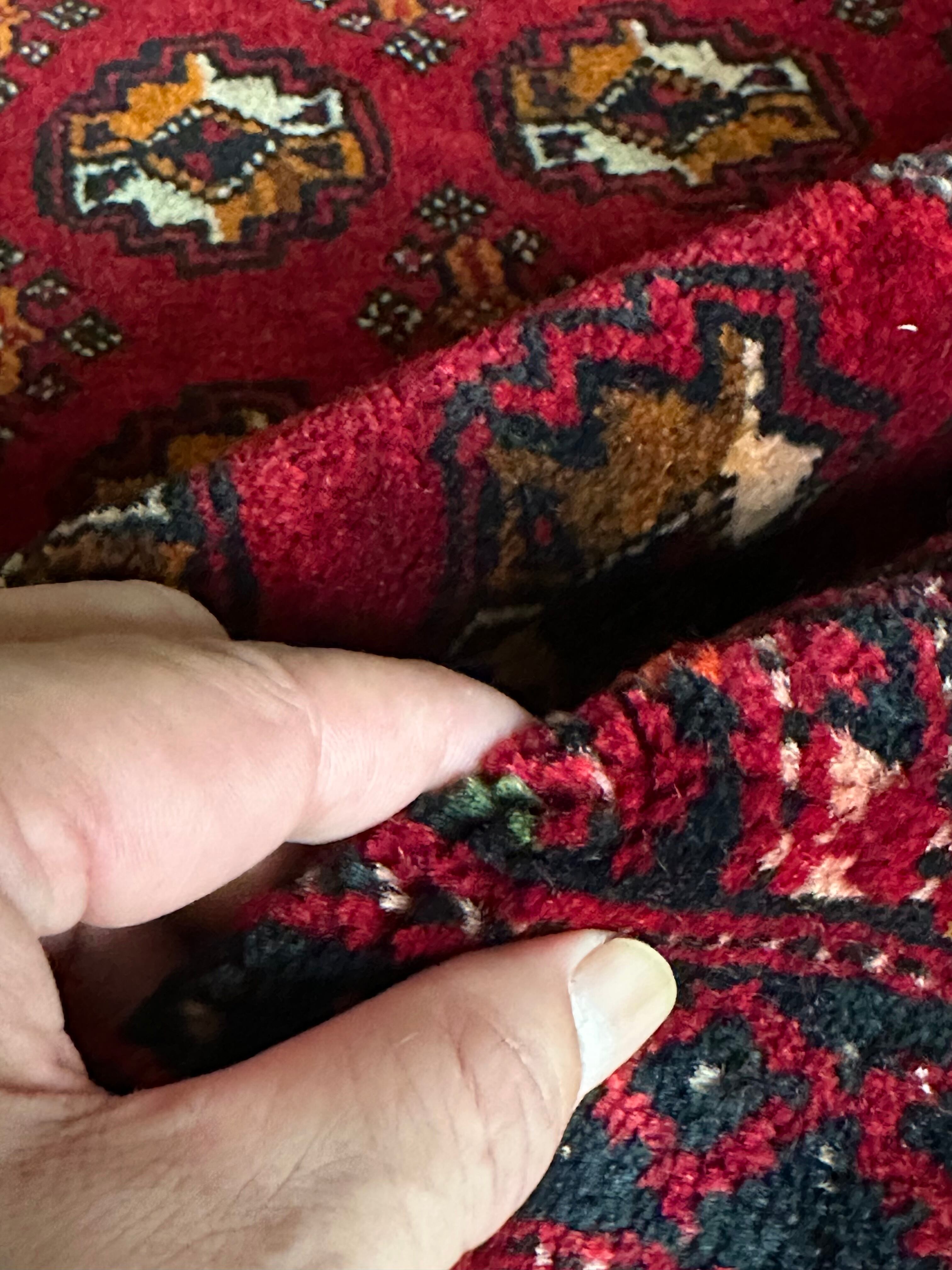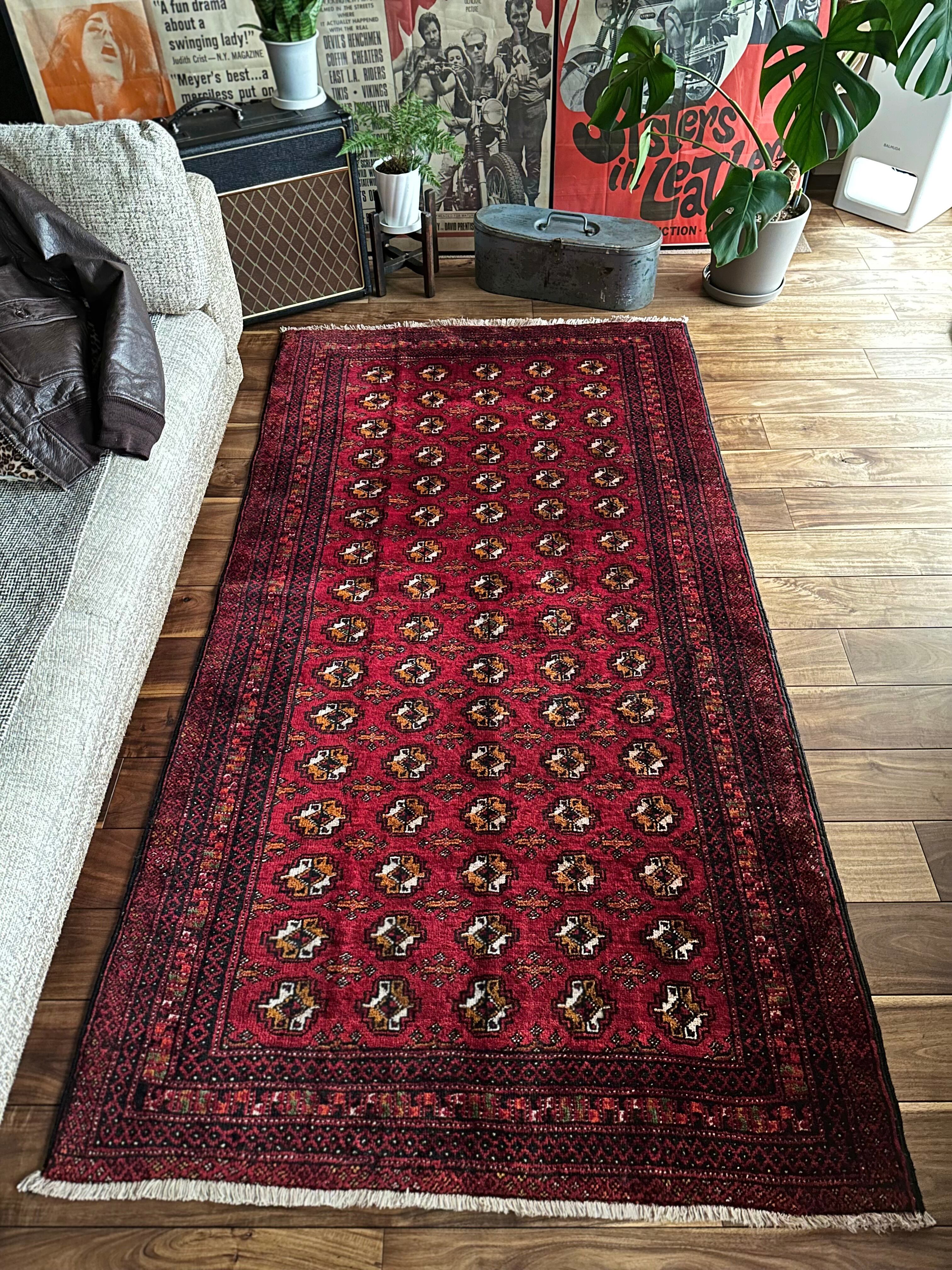 バルーチにしては発色の良い赤がトルクメンを思わす1枚で、女性の装飾具をモチーフとしたサロールギュルの連続紋様もトルクメンと似た印象を受けます。