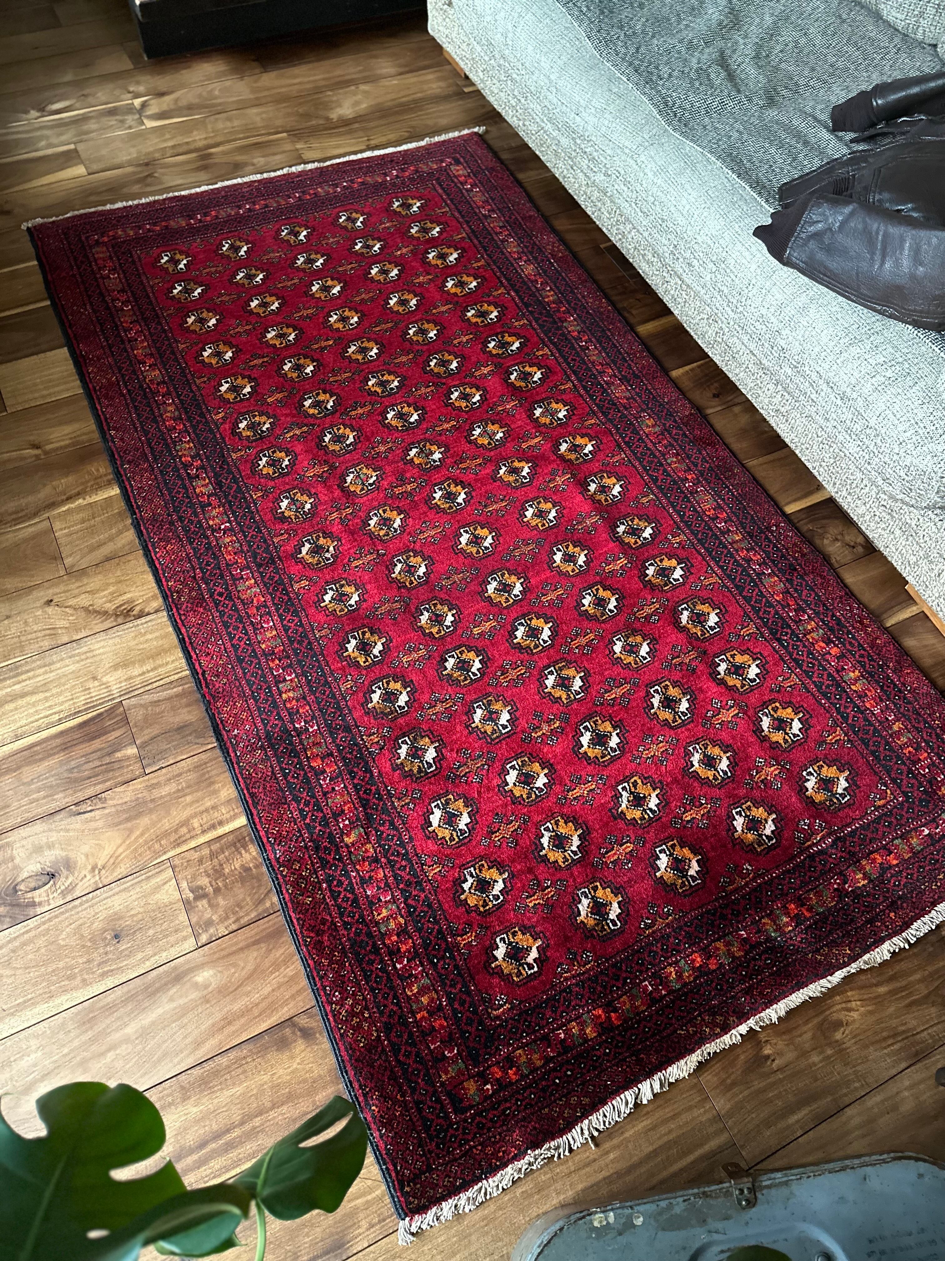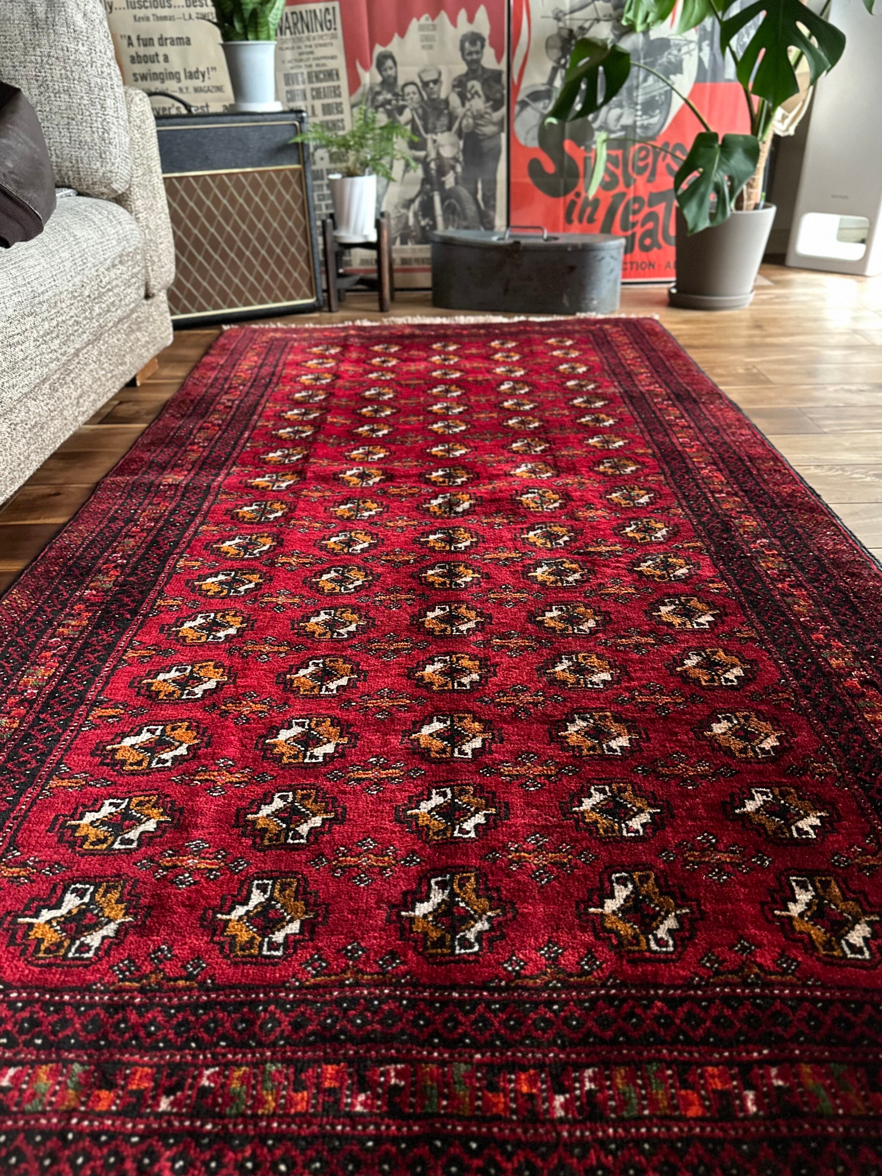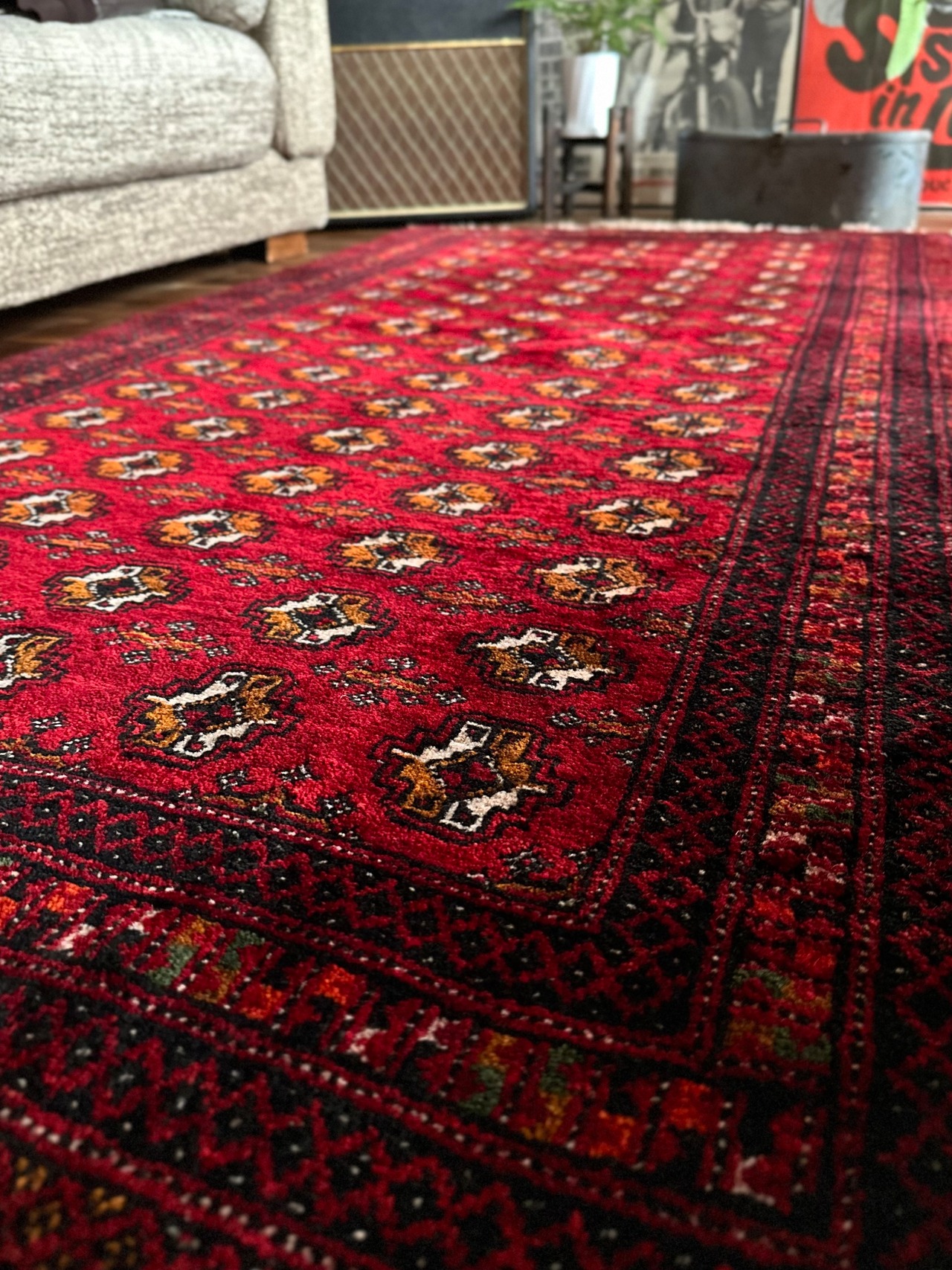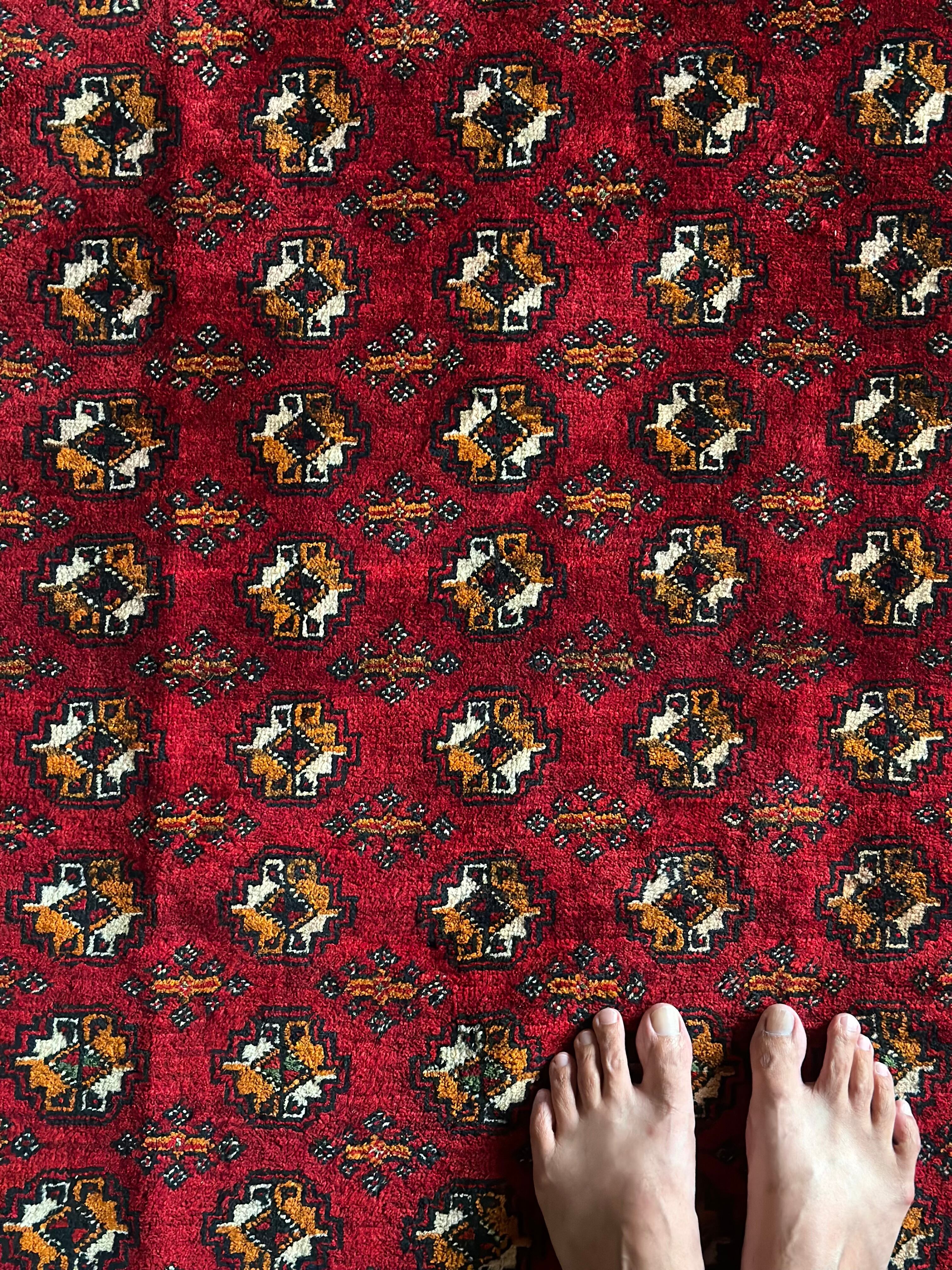 バルーチにしては発色の良い赤がトルクメンを思わす1枚で、女性の装飾具をモチーフとしたサロールギュルの連続紋様もトルクメンと似た印象を受けます。