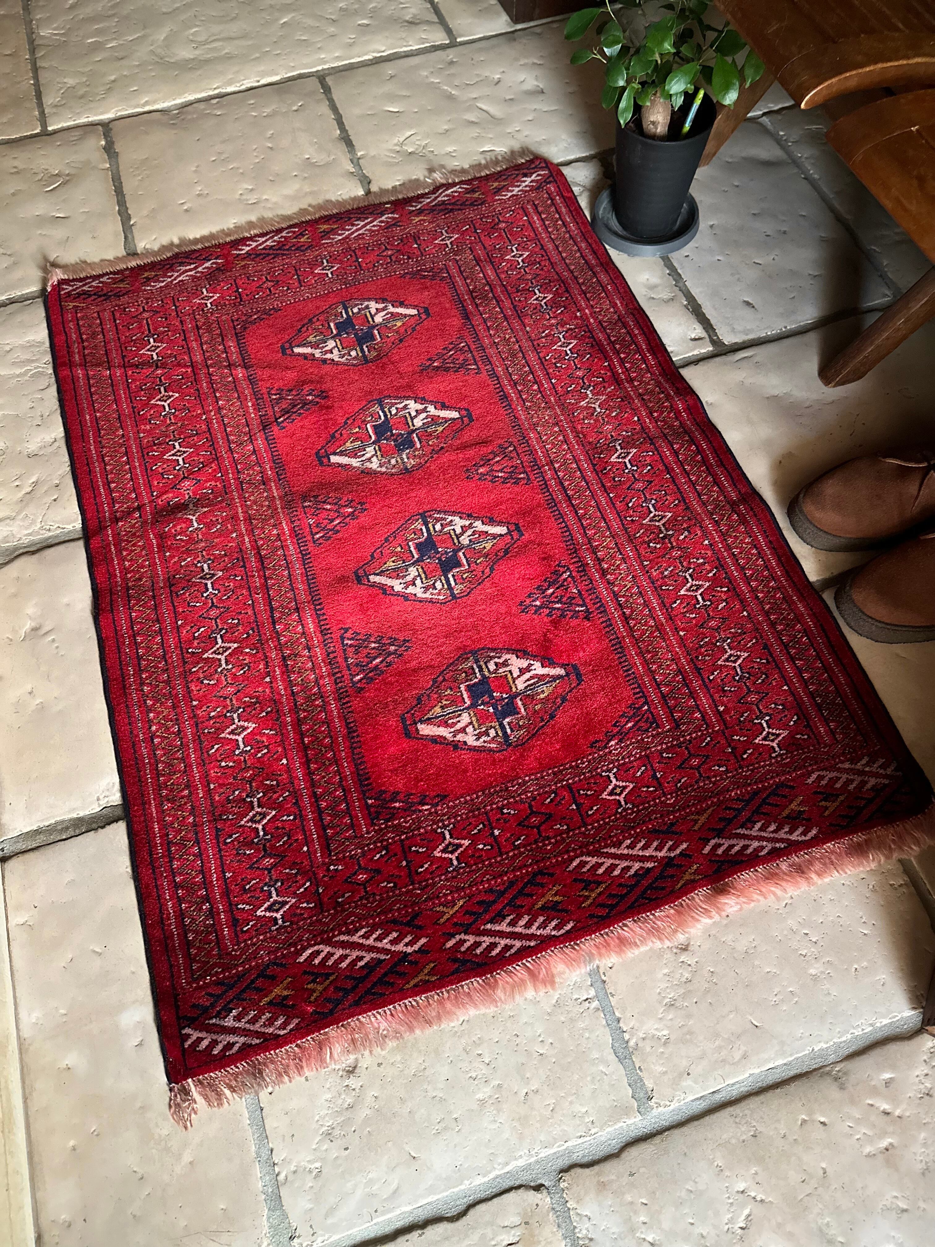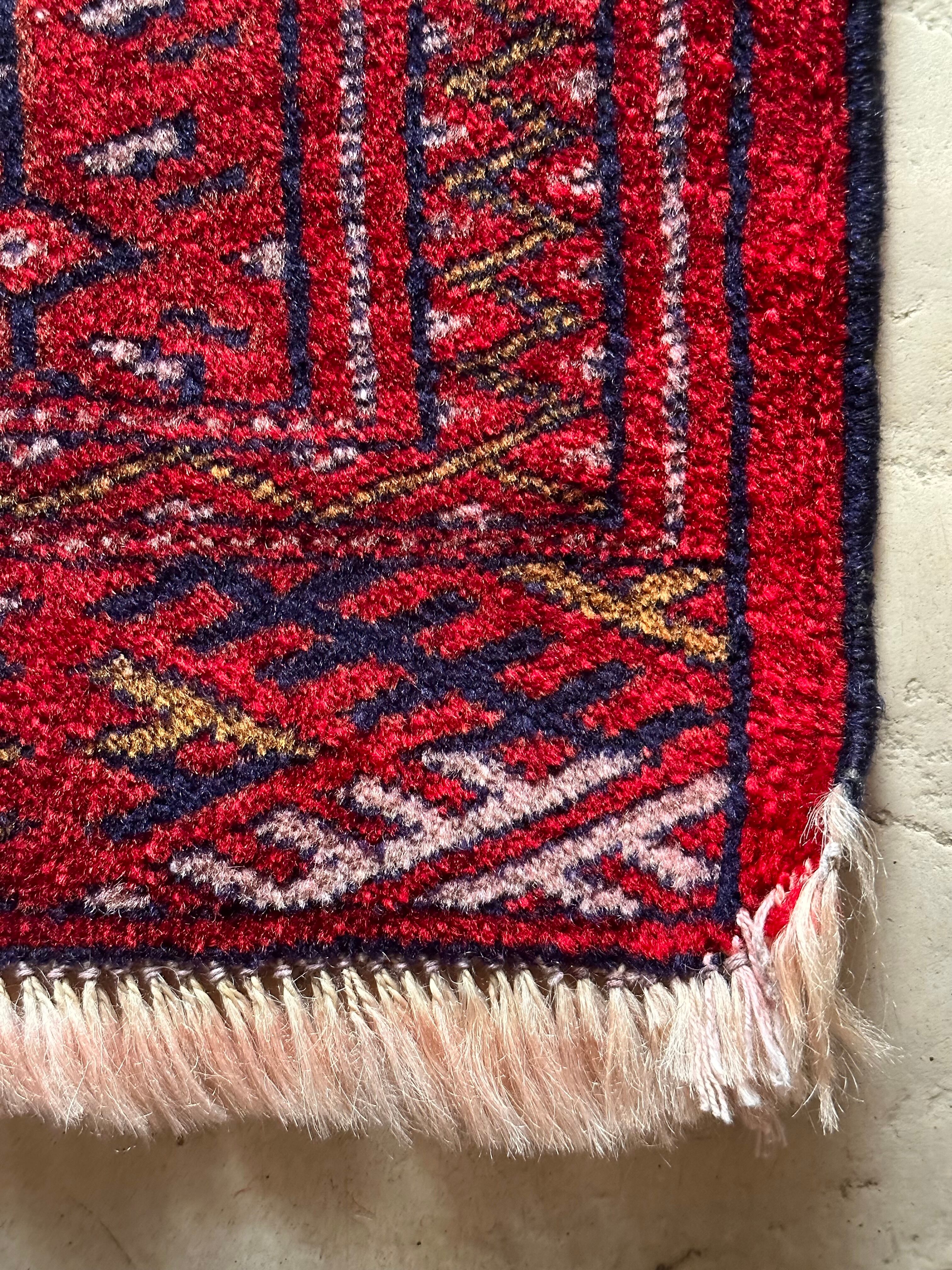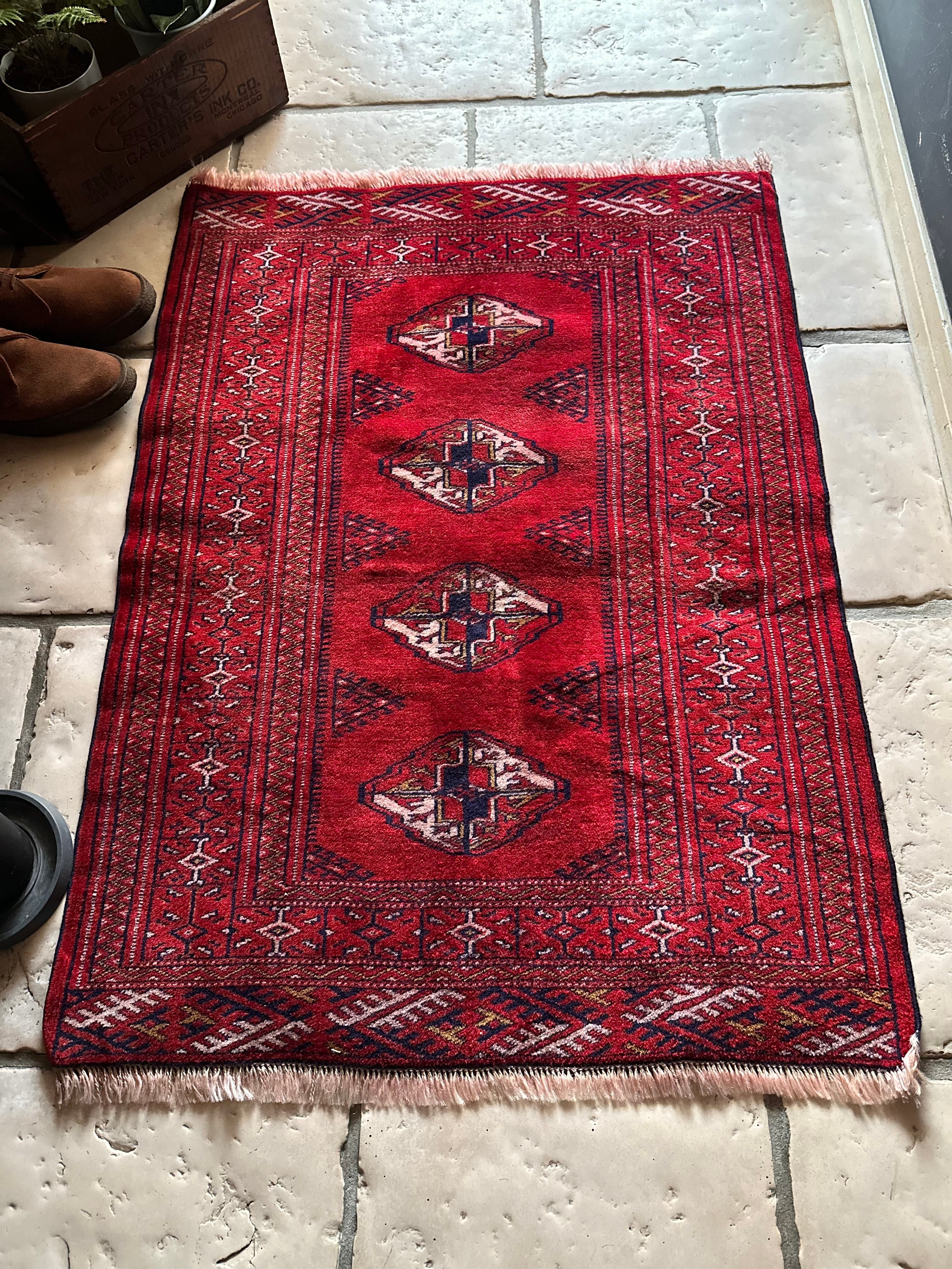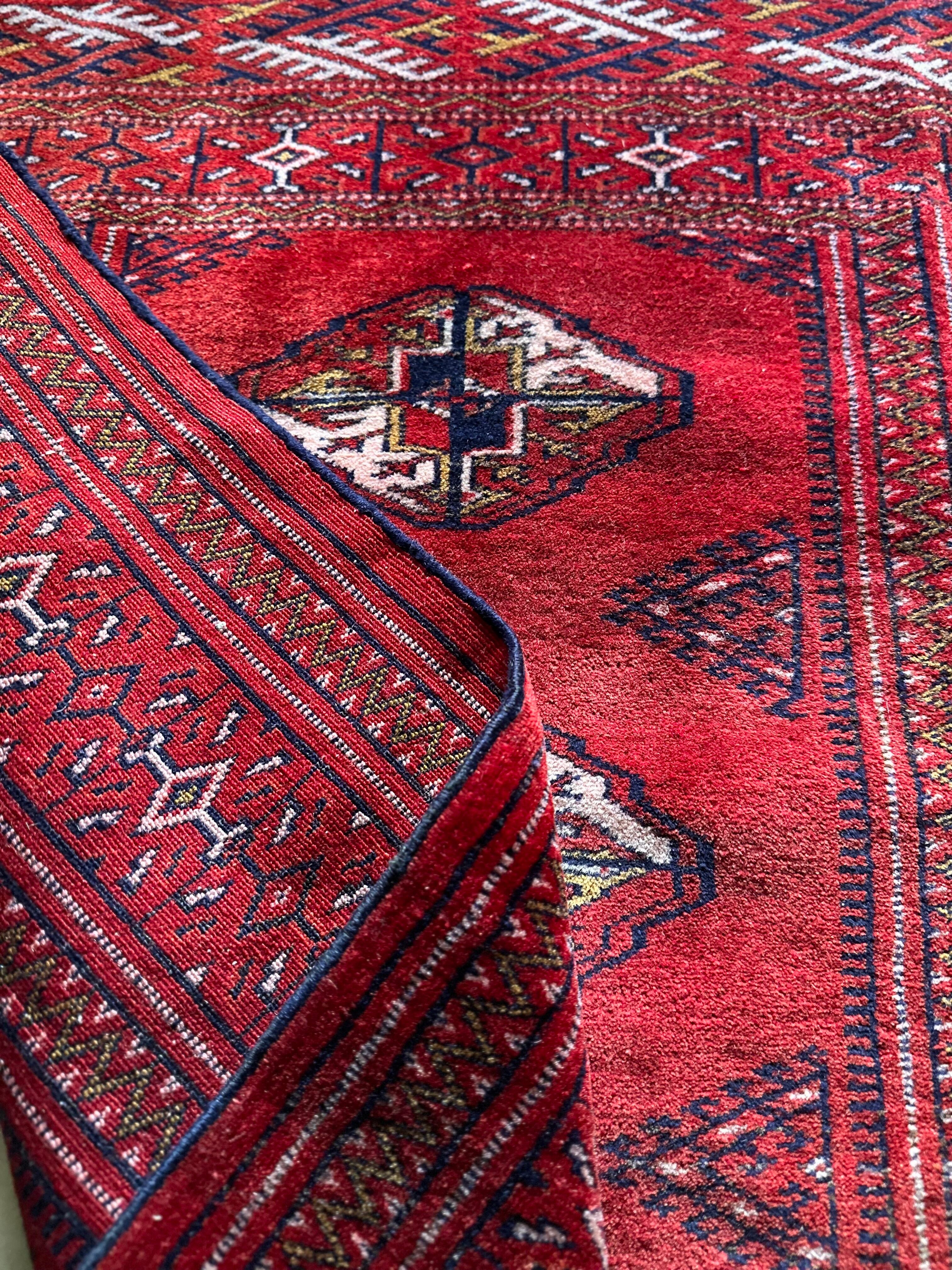茜で染められた真っ赤な色合いに四連のテッケギュルが勇ましいトルクメンらしい1枚で、しなやかな羊毛の織りの細かさから伺える柄のくっきり具合が見る者を虜にします。