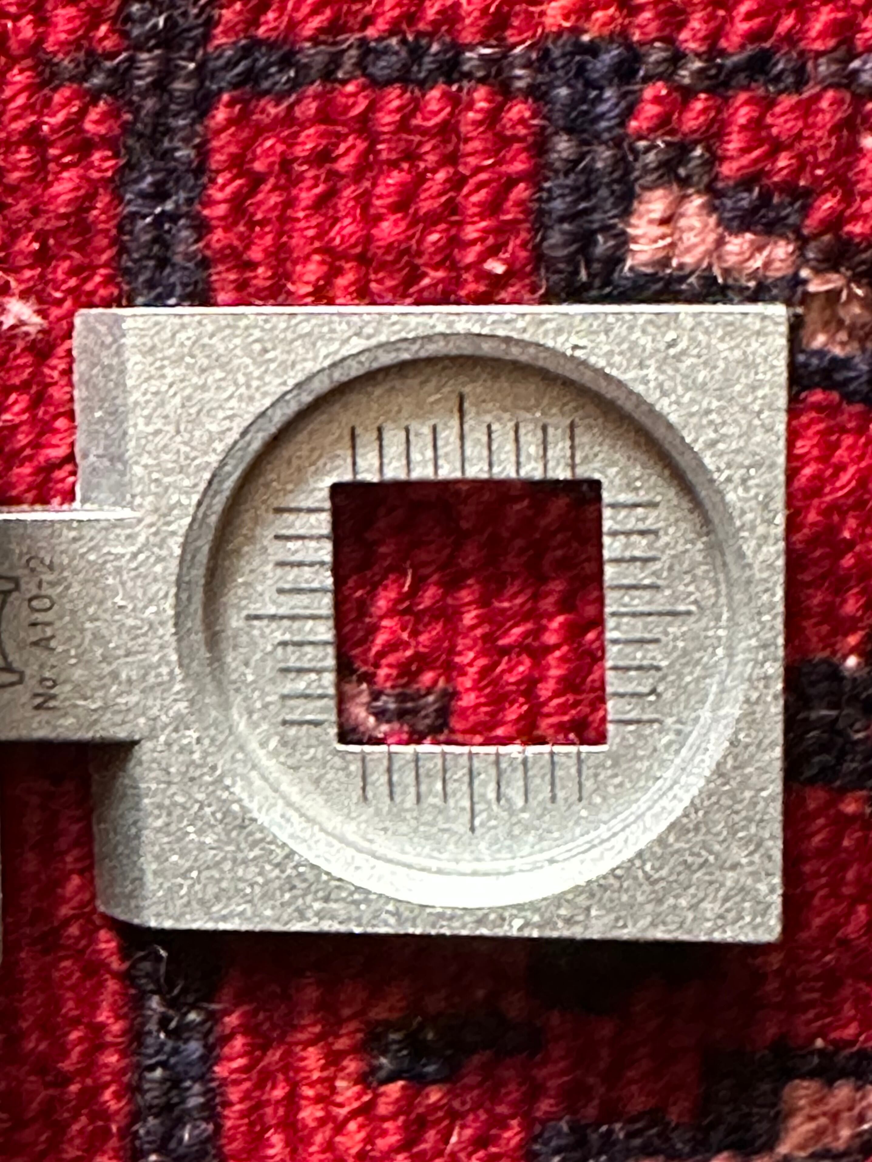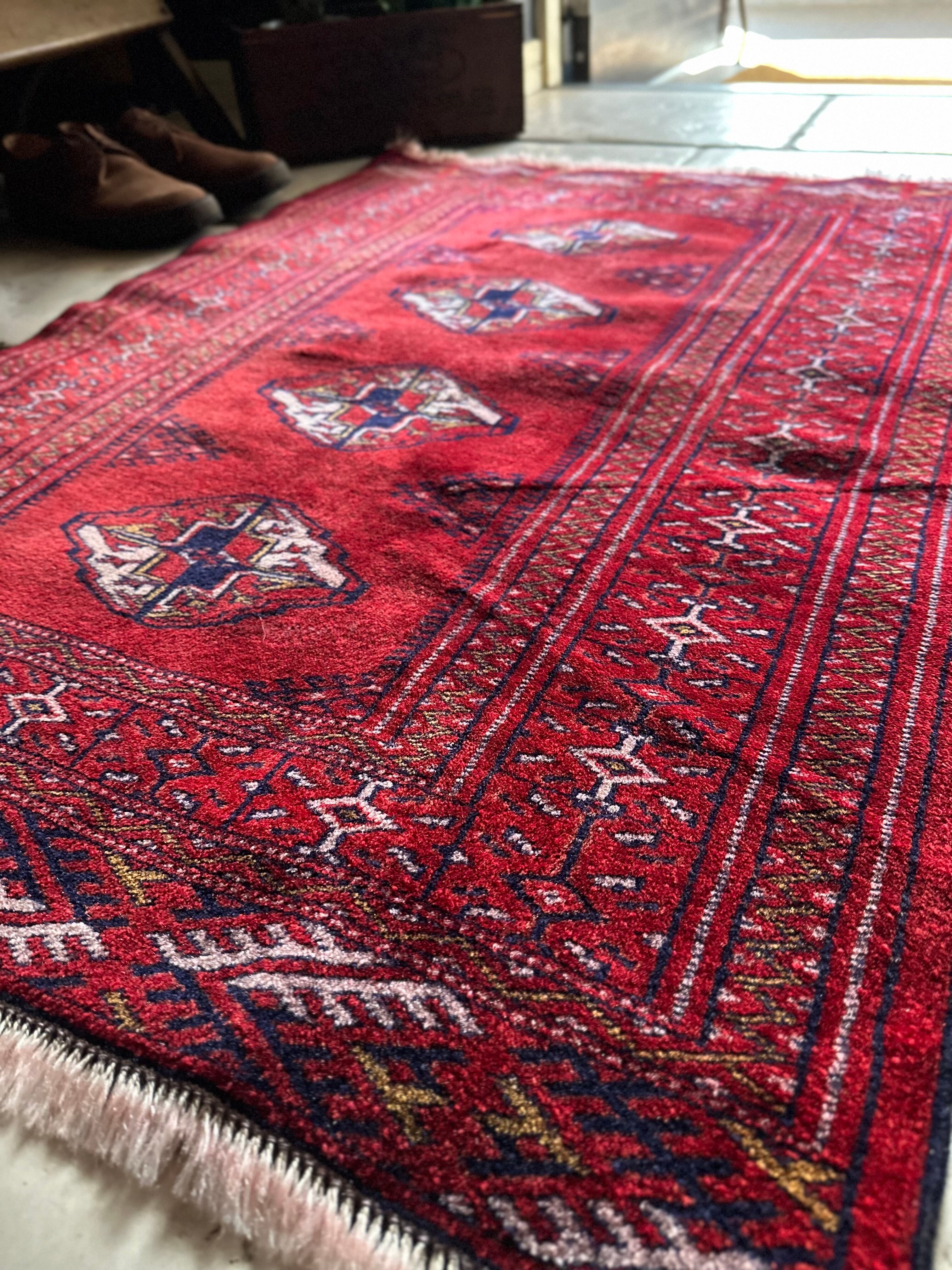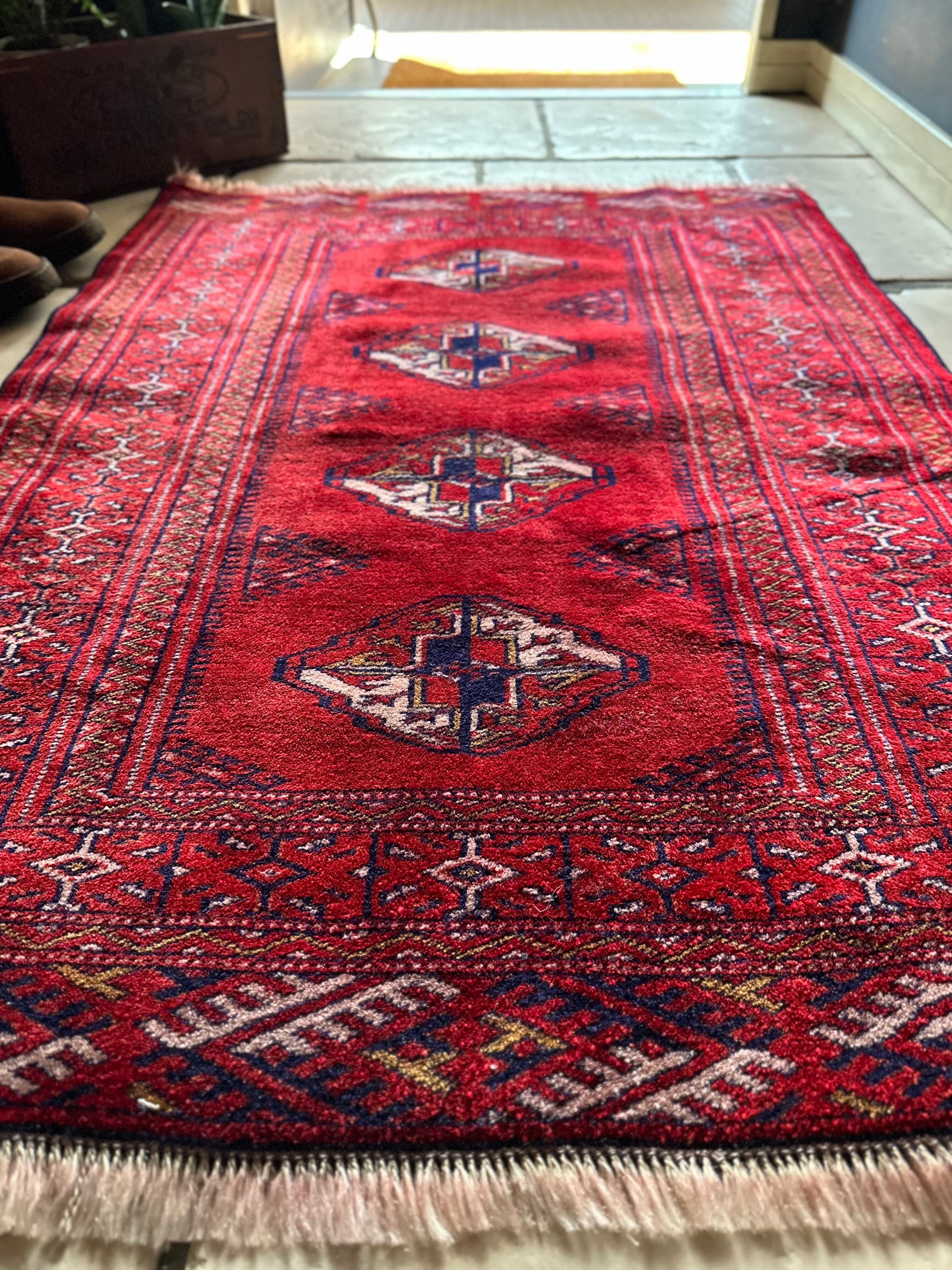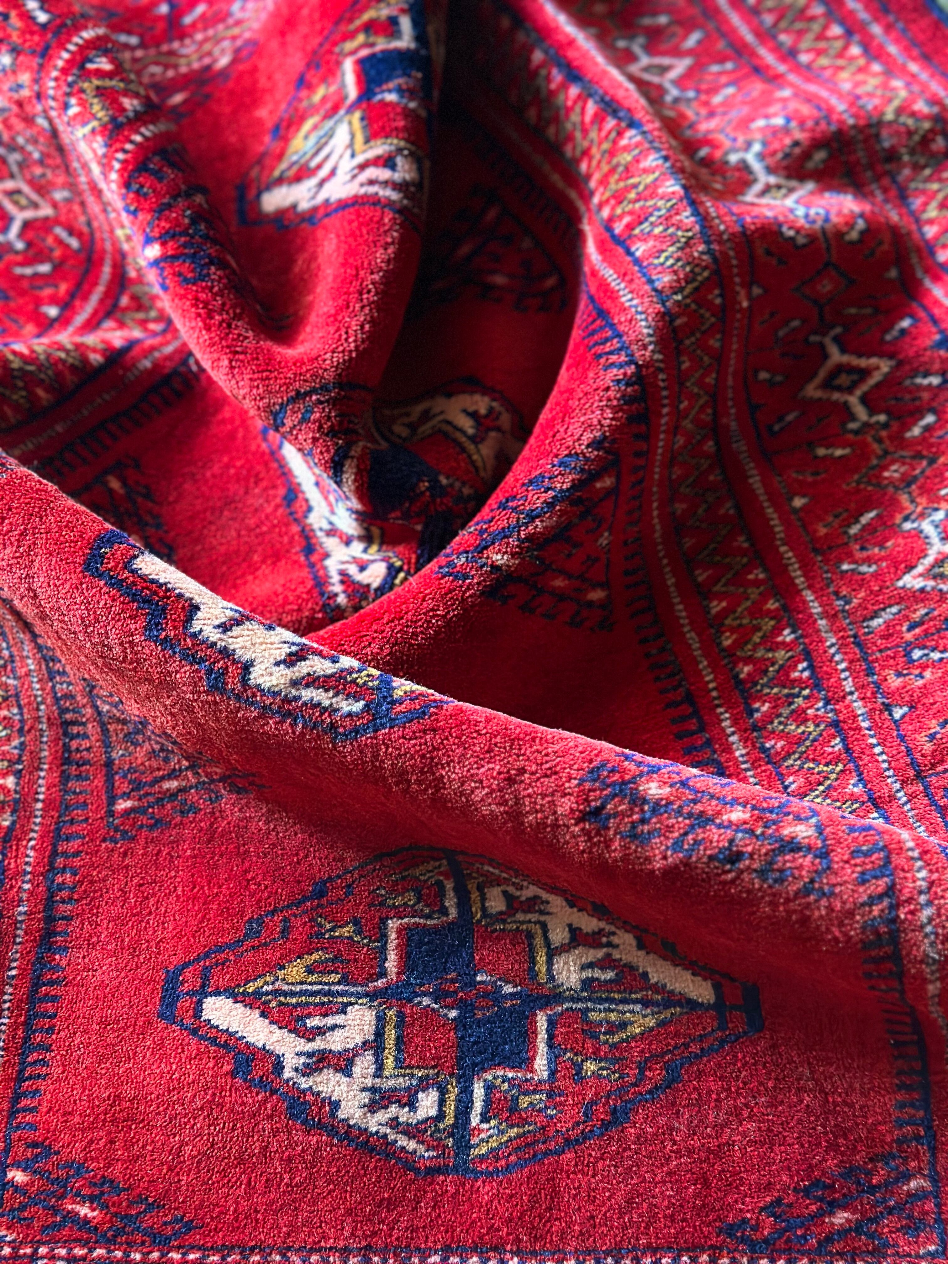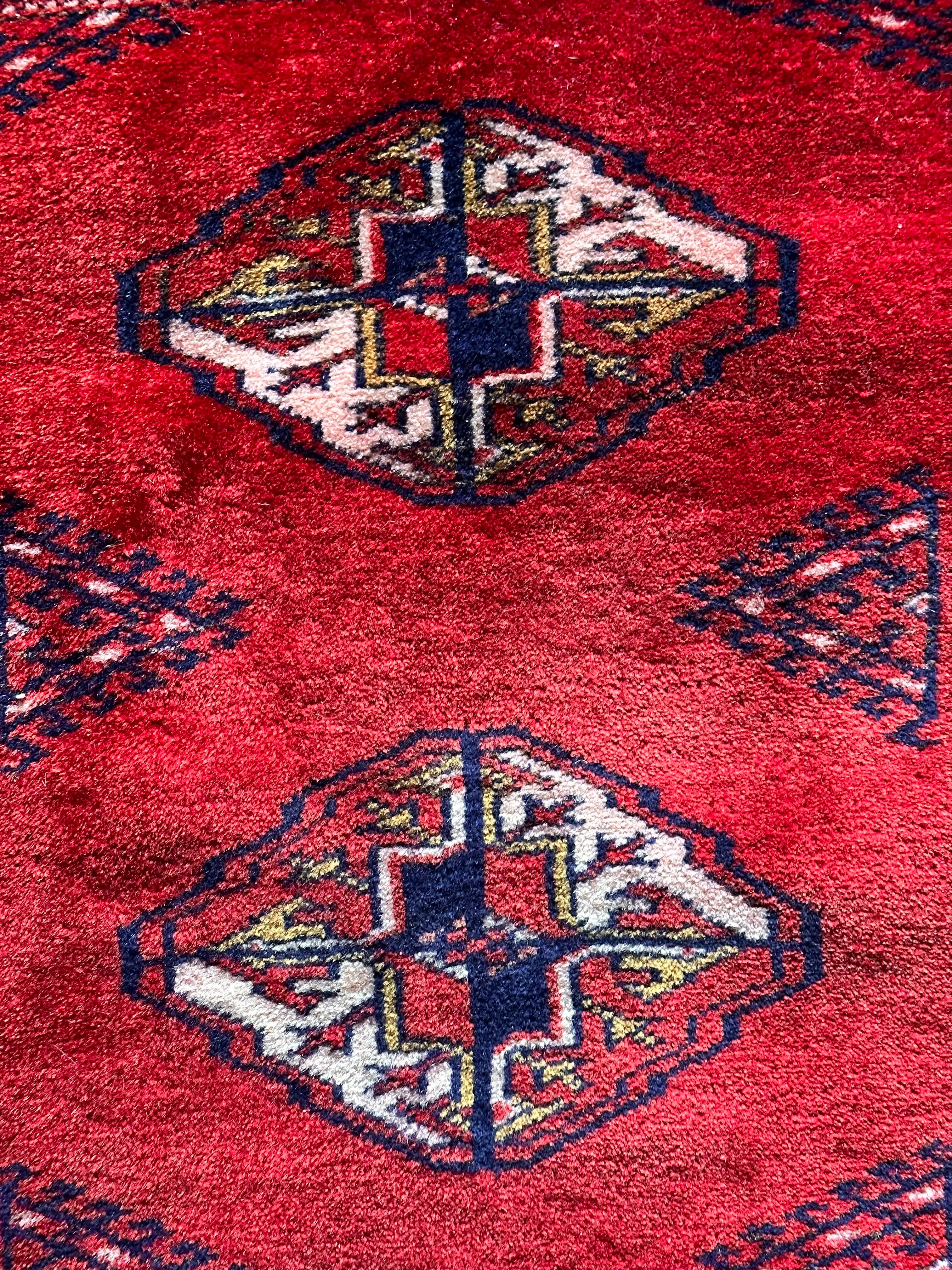 茜で染められた真っ赤な色合いに四連のテッケギュルが勇ましいトルクメンらしい1枚で、しなやかな羊毛の織りの細かさから伺える柄のくっきり具合が見る者を虜にします。
