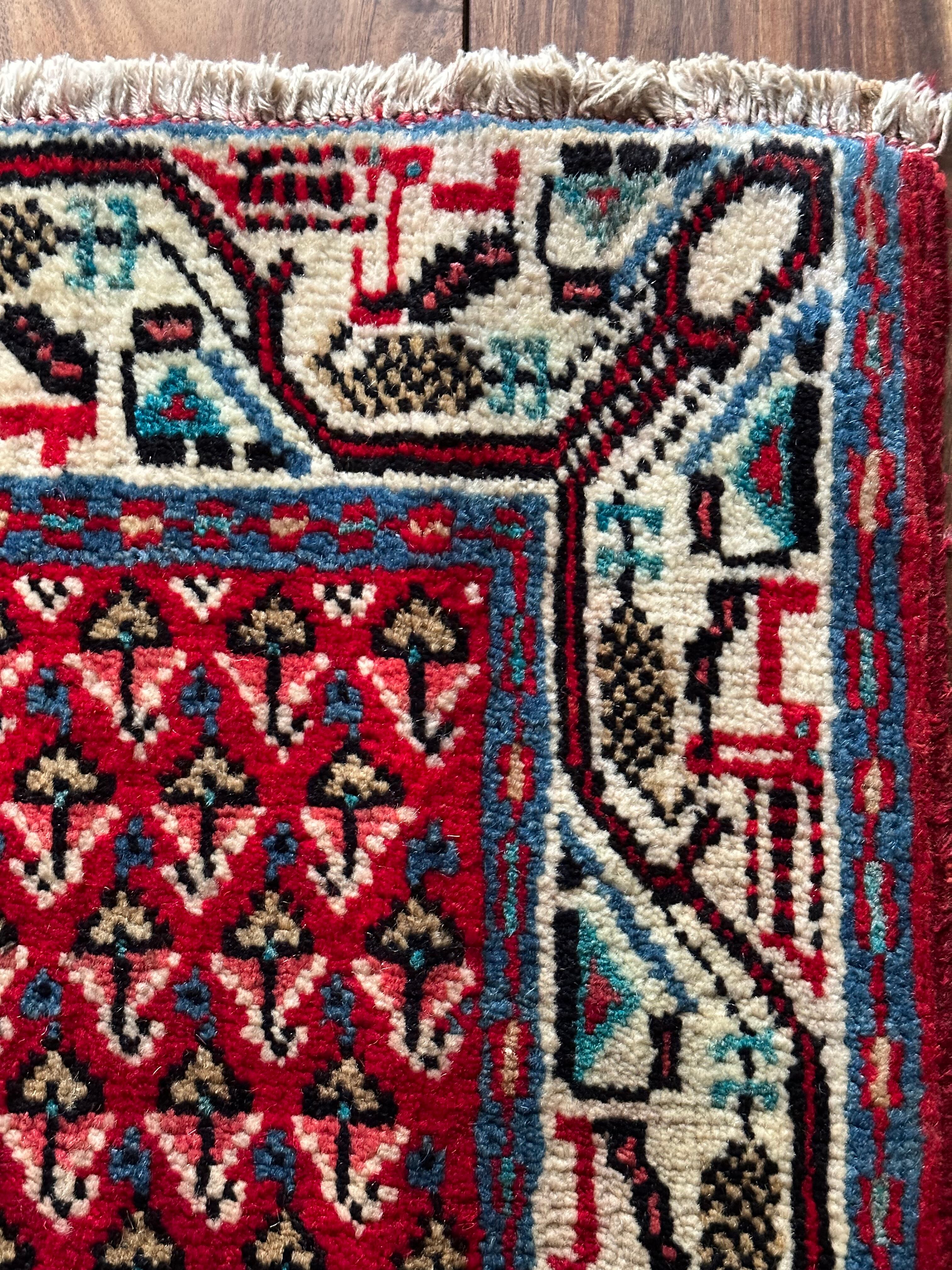 またラグそのものに関しては羊毛特有の匂いがあり手織りによる歪みや経年劣化、草木染めによる色ムラなどがありますが、それもまたトライバルラグの魅力かとご理解ください。