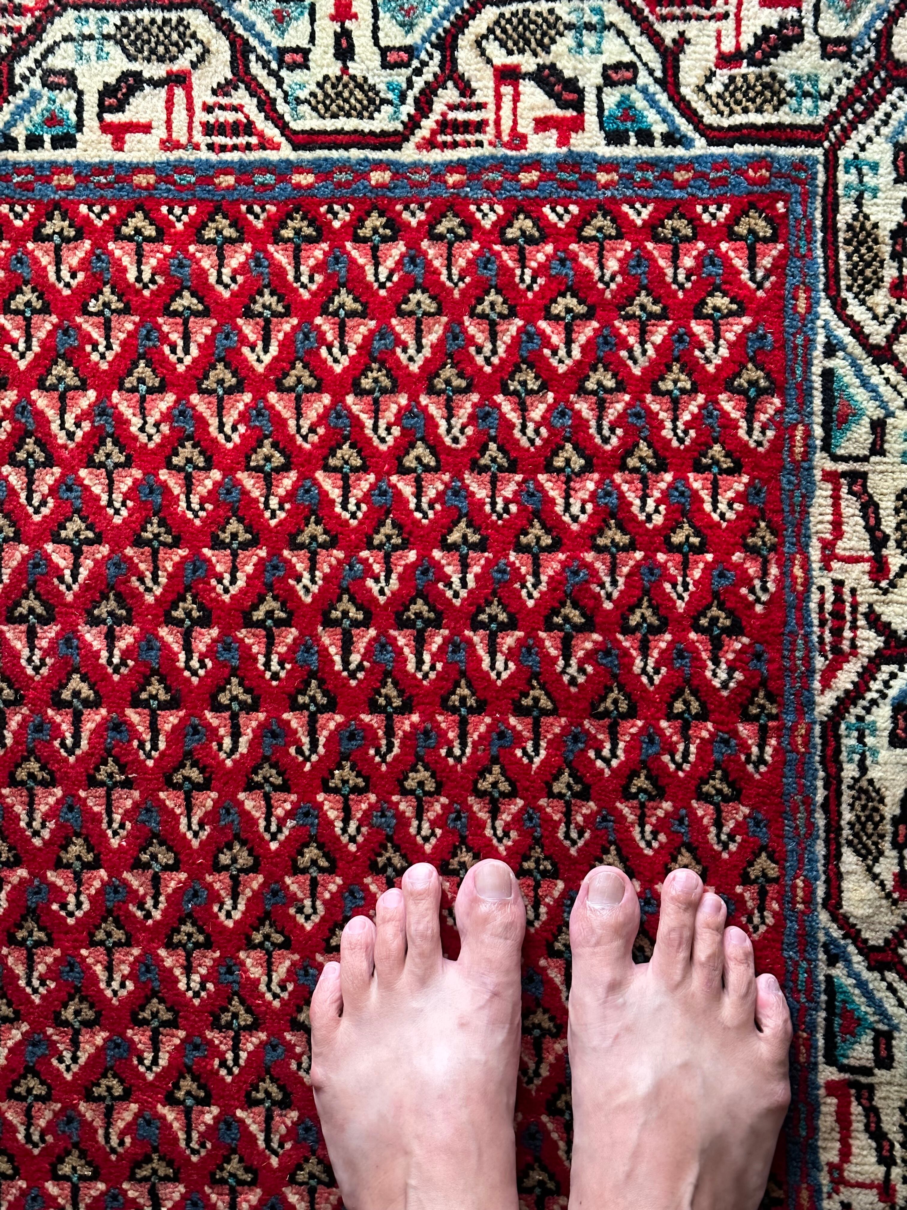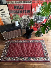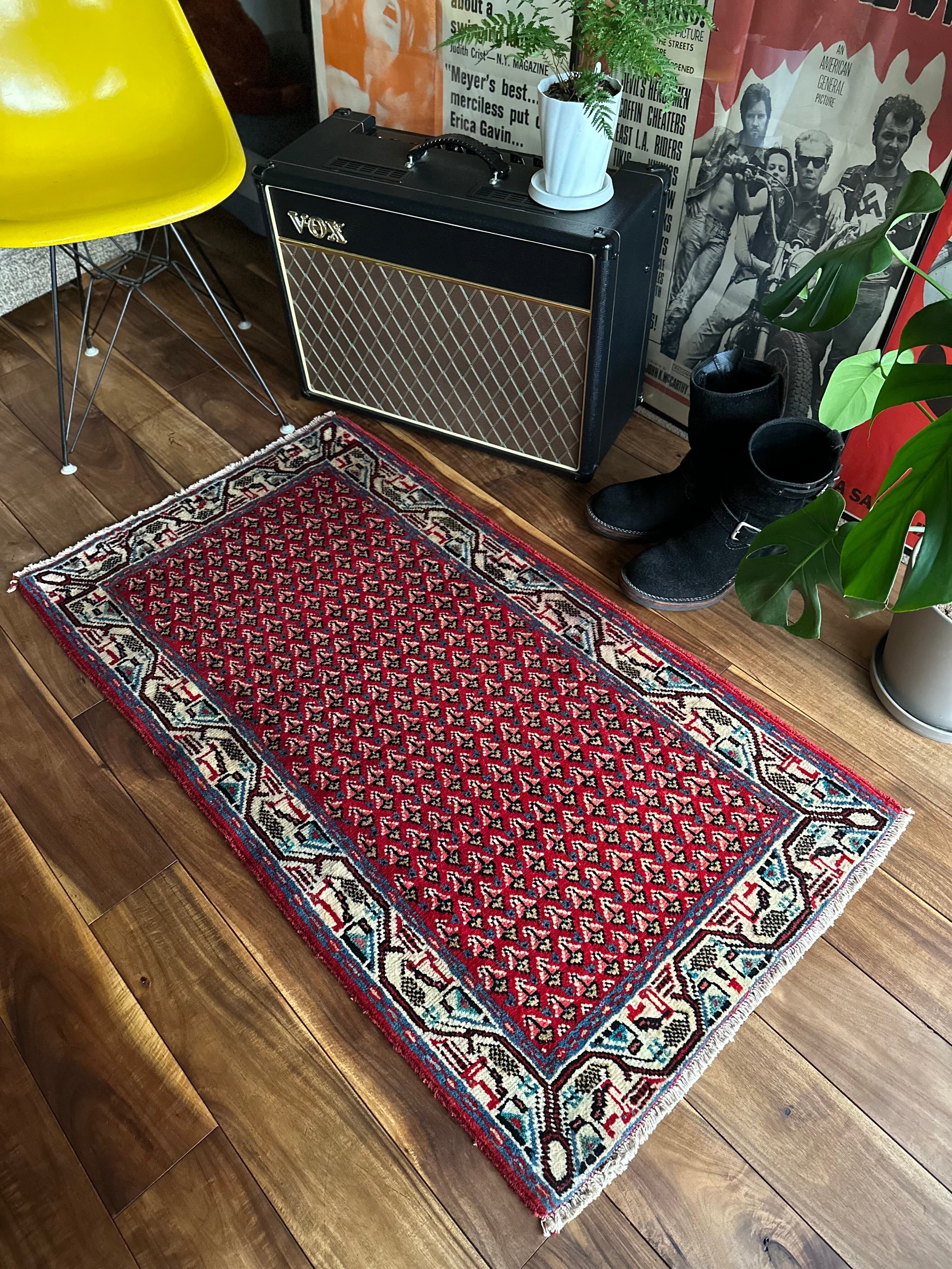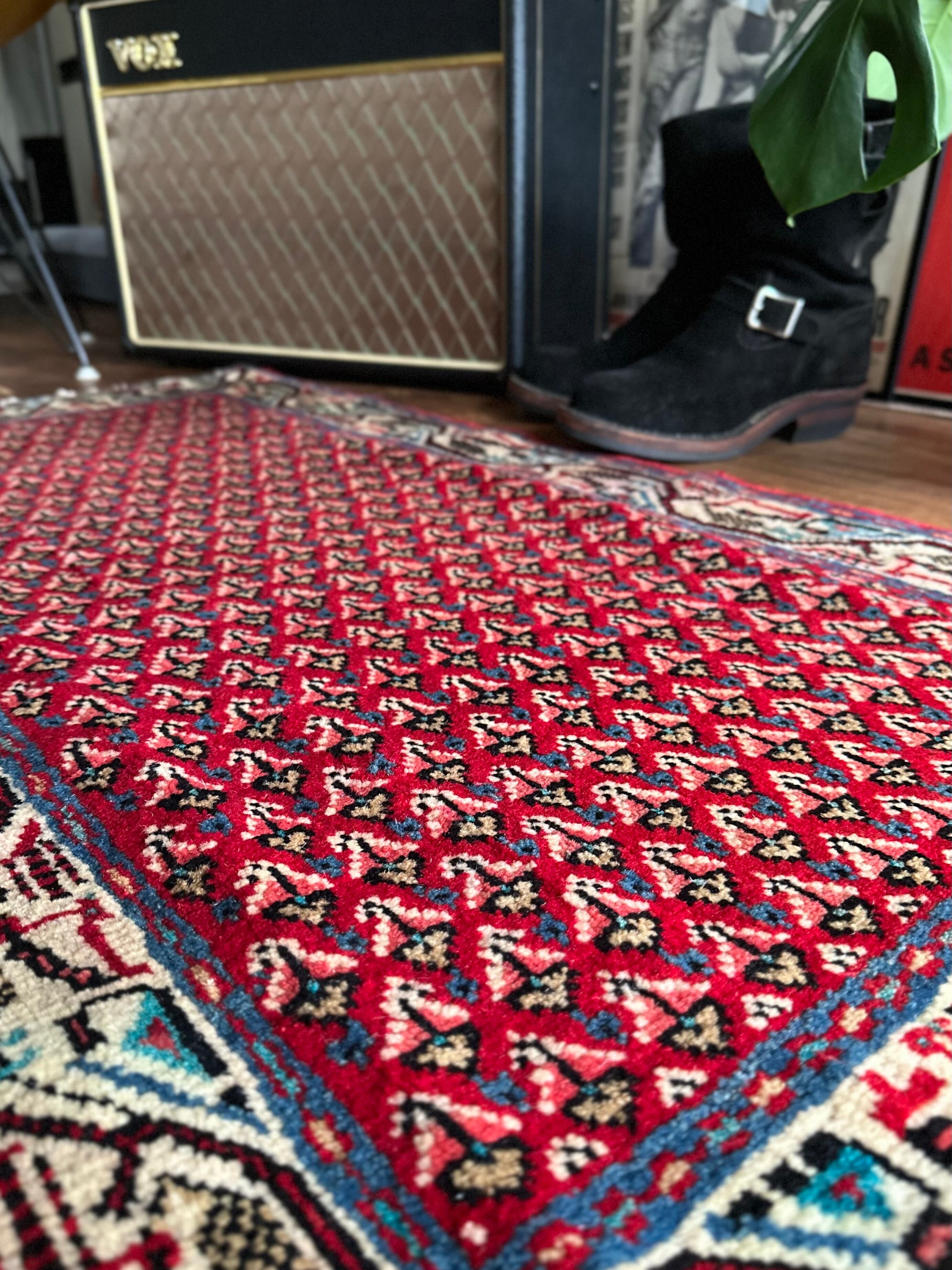 経年としては20〜30年ほど前のヴィンテージラグになり、マンションの玄関としては少し大きめですが、個人的には写真のようにギターアンプの前に敷いて個人レッスンする様が浮かんでくる弾き語りサイズでしょうか。特に目立つリペアや汚れはありませんし、なんと言ってもこの気持ちの良いパイルの密度が素足には堪りませんと、全体的な雰囲気は下記URLのInstagramにて最後の動画(室内での自然光にて撮影)を参照して下さい。