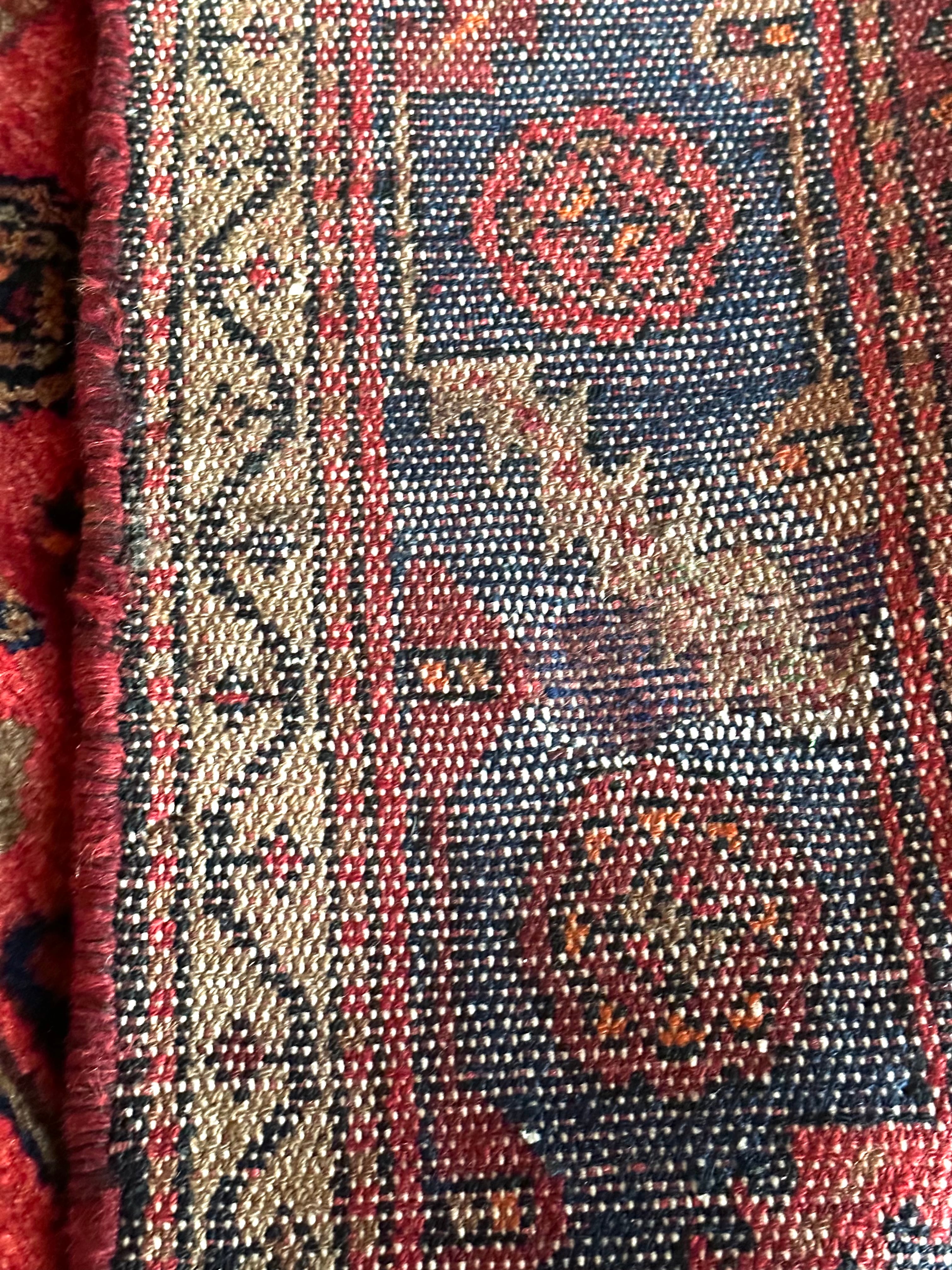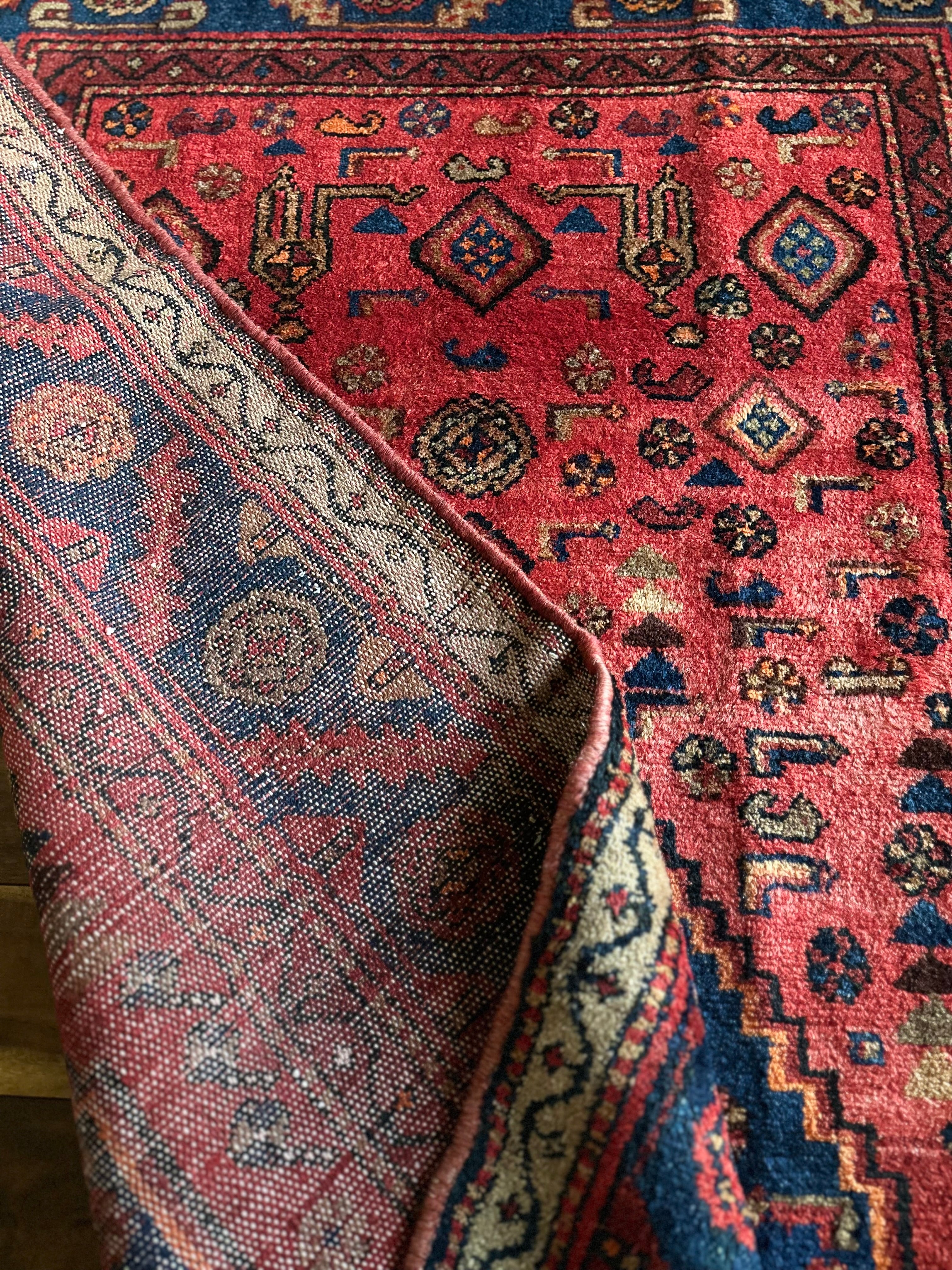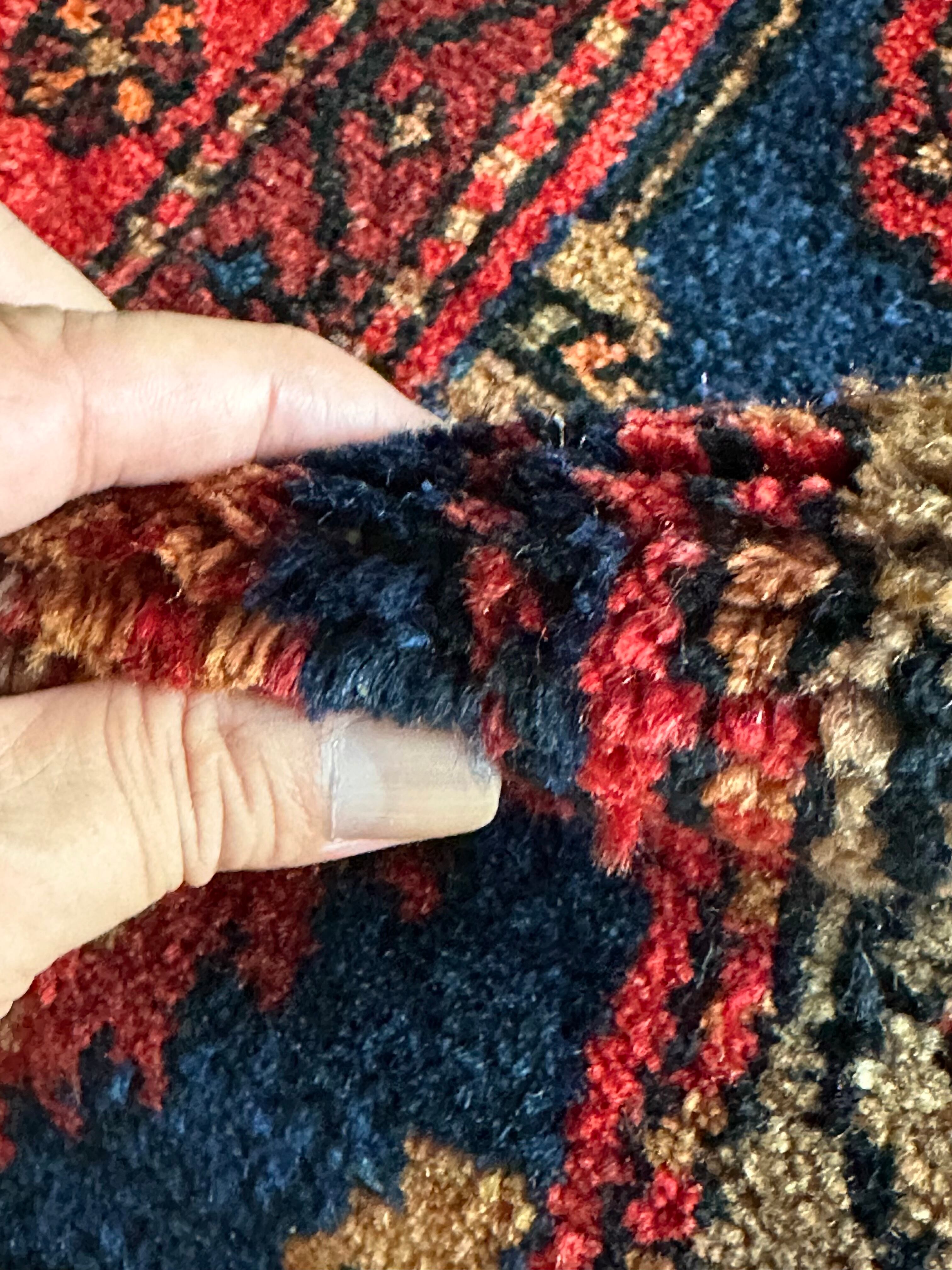 経年としては20〜30年前のモノとなりますが、パイルの毛足もフサフサとして心地よくハマダンならではの分厚さが丈夫で何よりと、細かなリペアはありますが表側からは気になるものではなく特に目立つ汚れはありません。