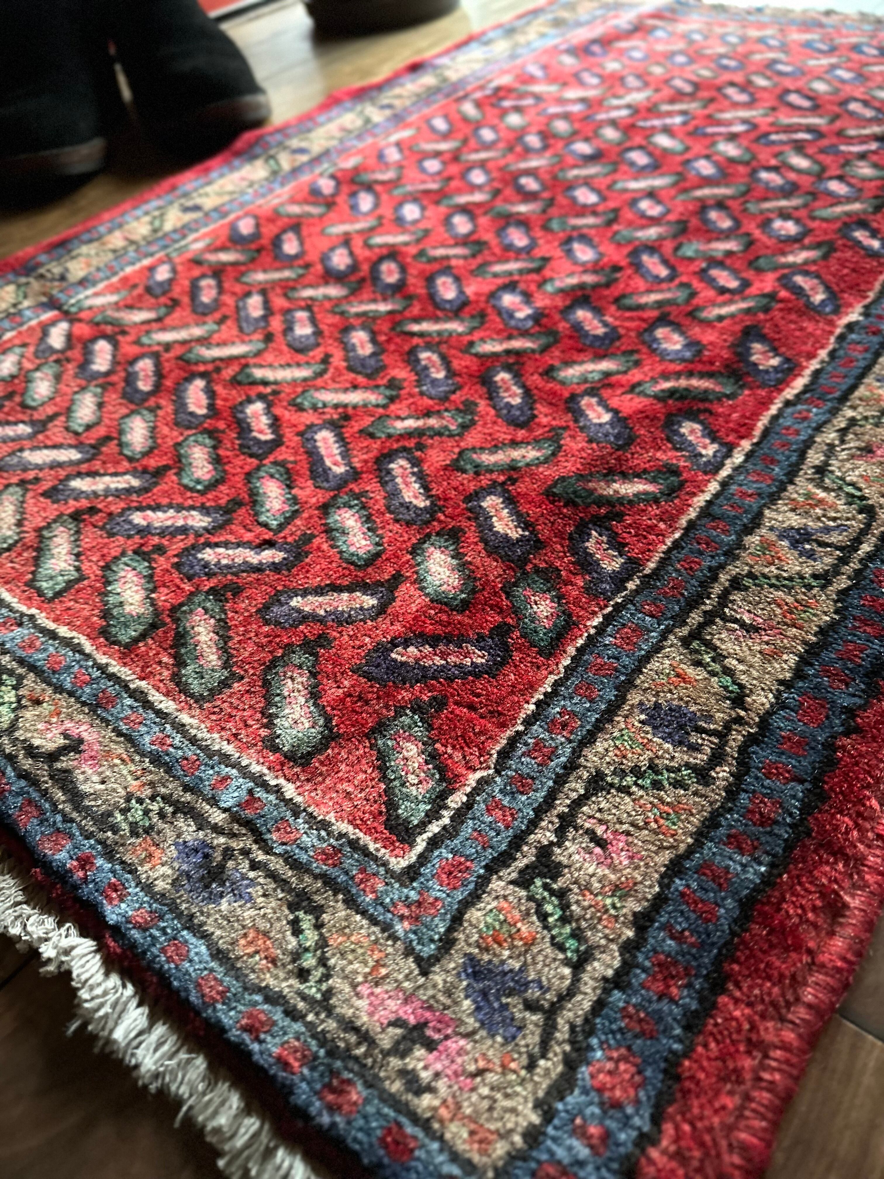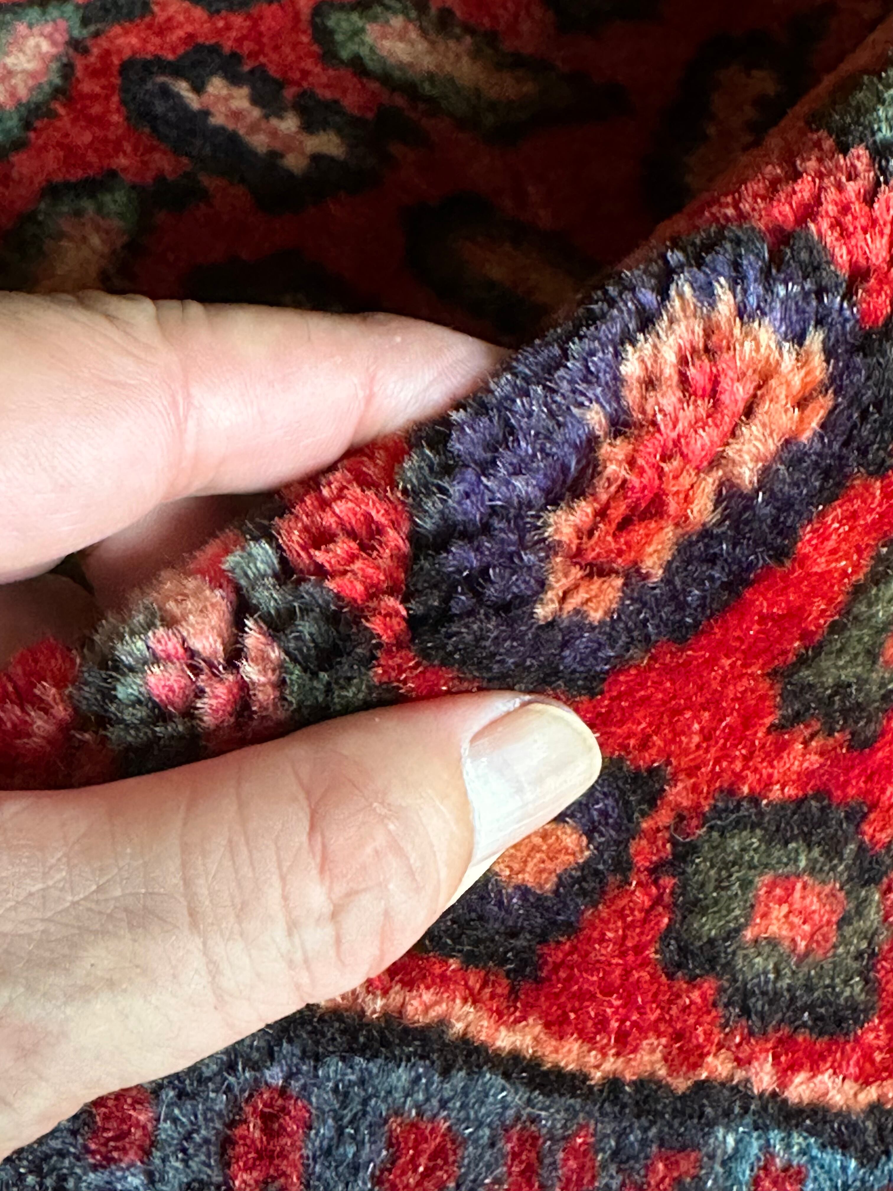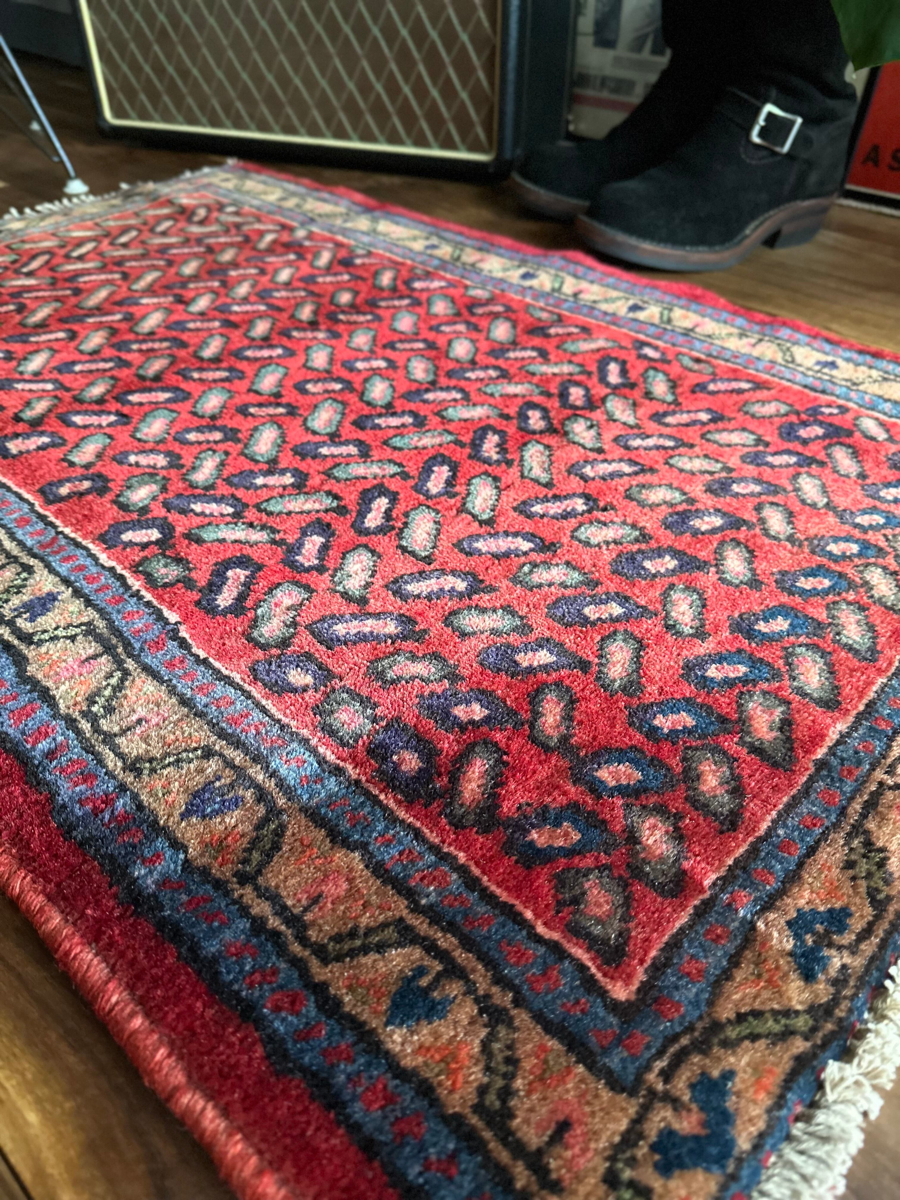 光の具合でなんとも良い輝きを放つシャイニーウールなボテ柄のこちらは、ハマダン近郊で手織りされたヴィレッジラグになります。