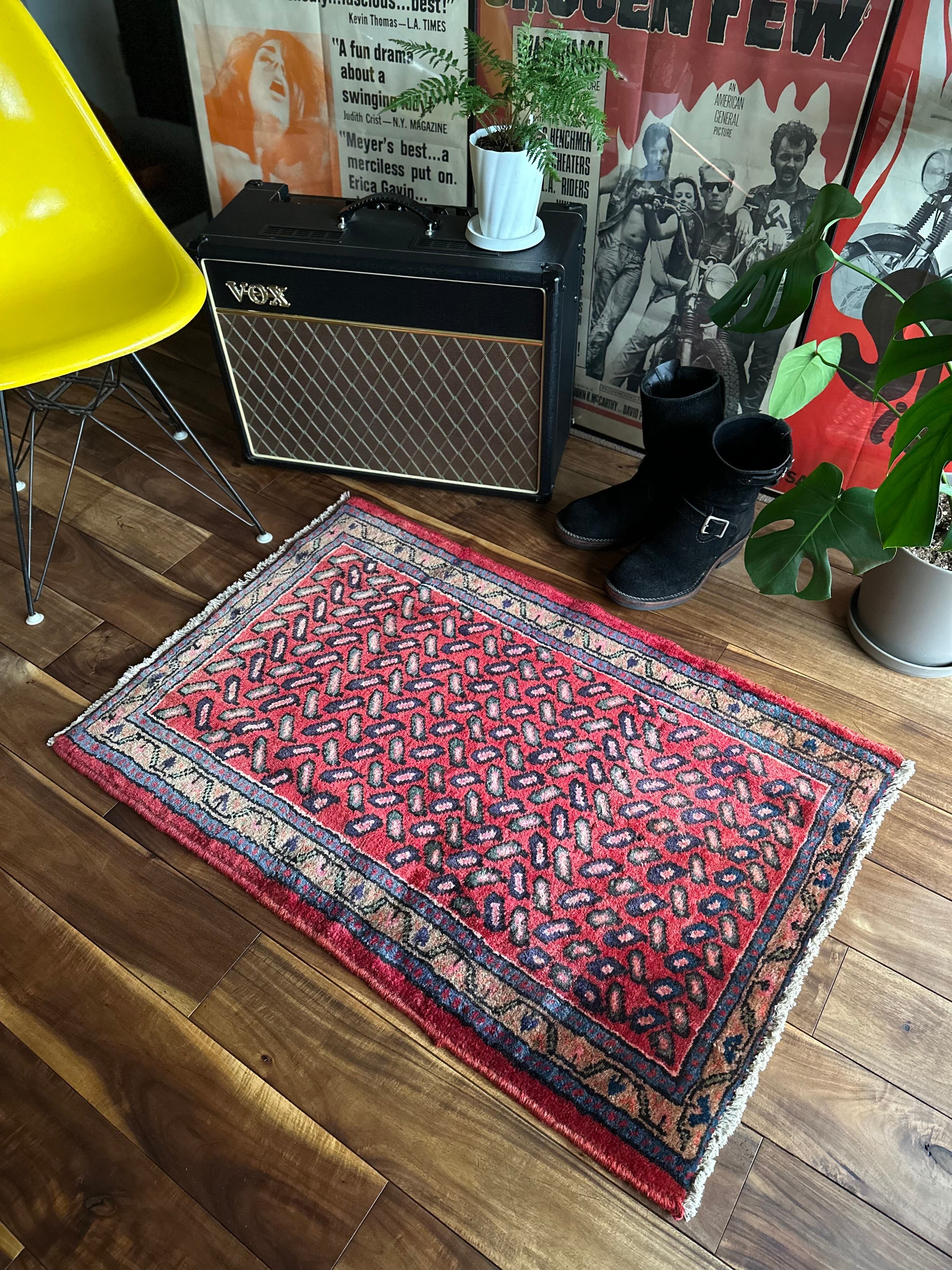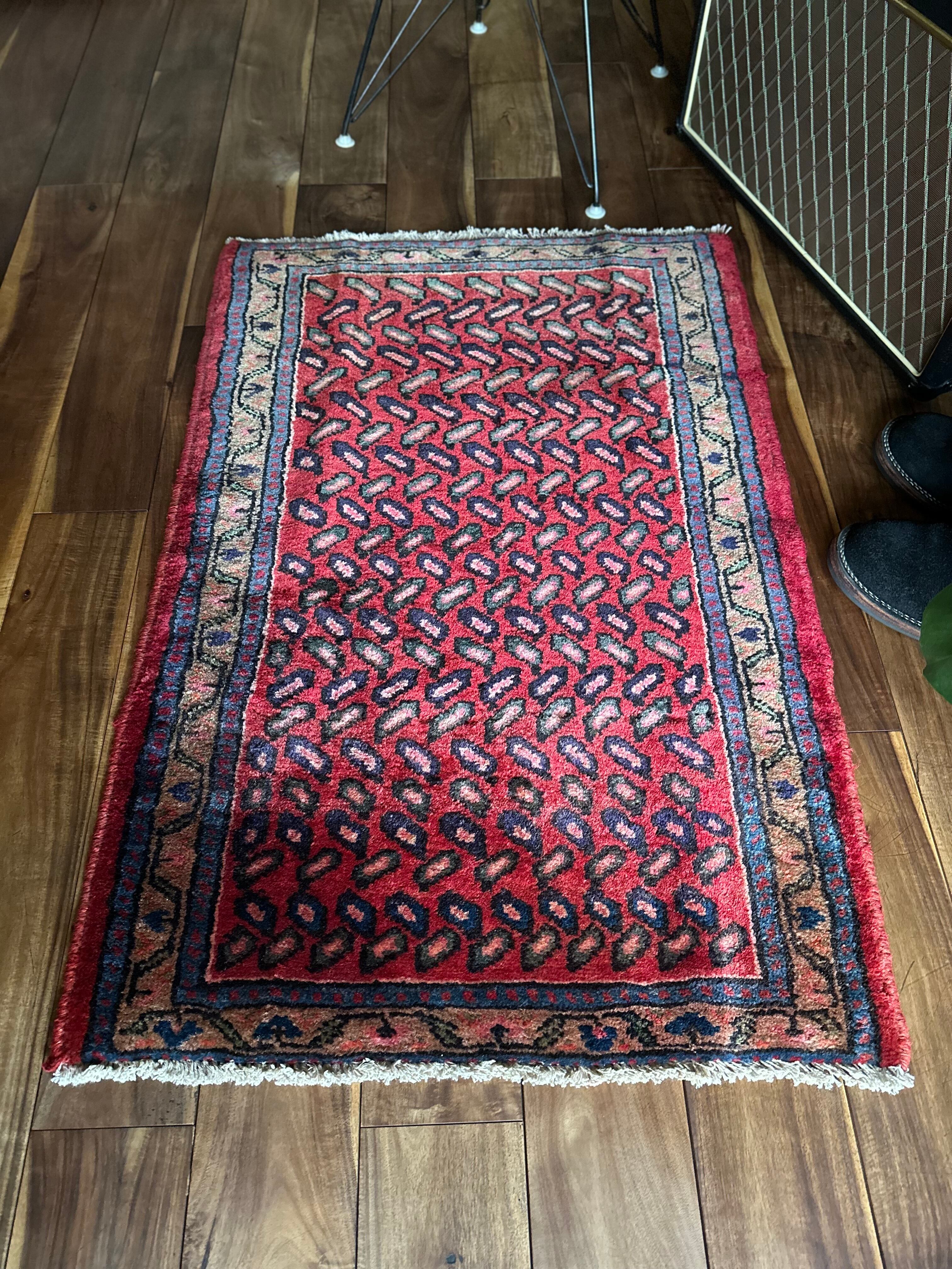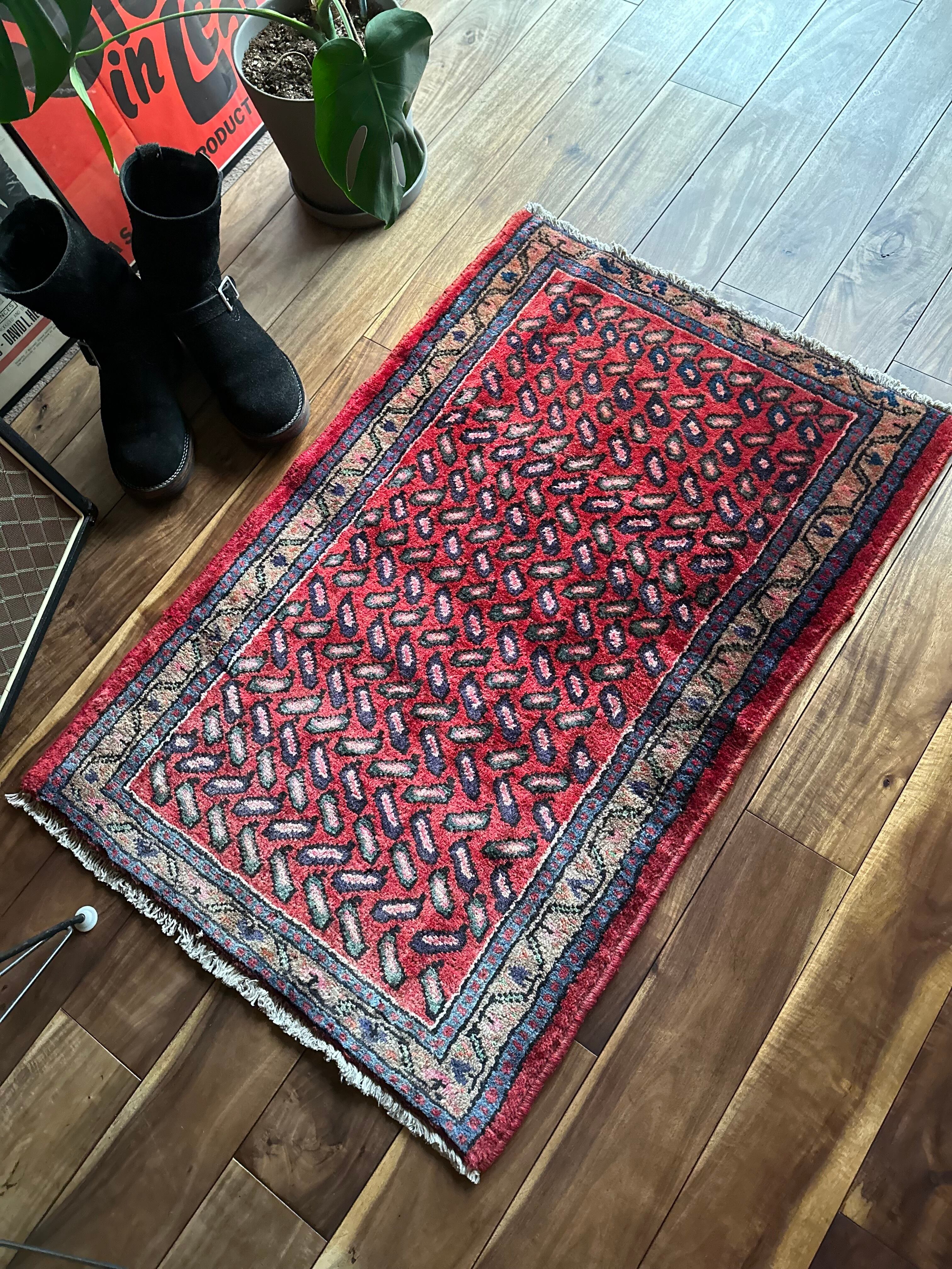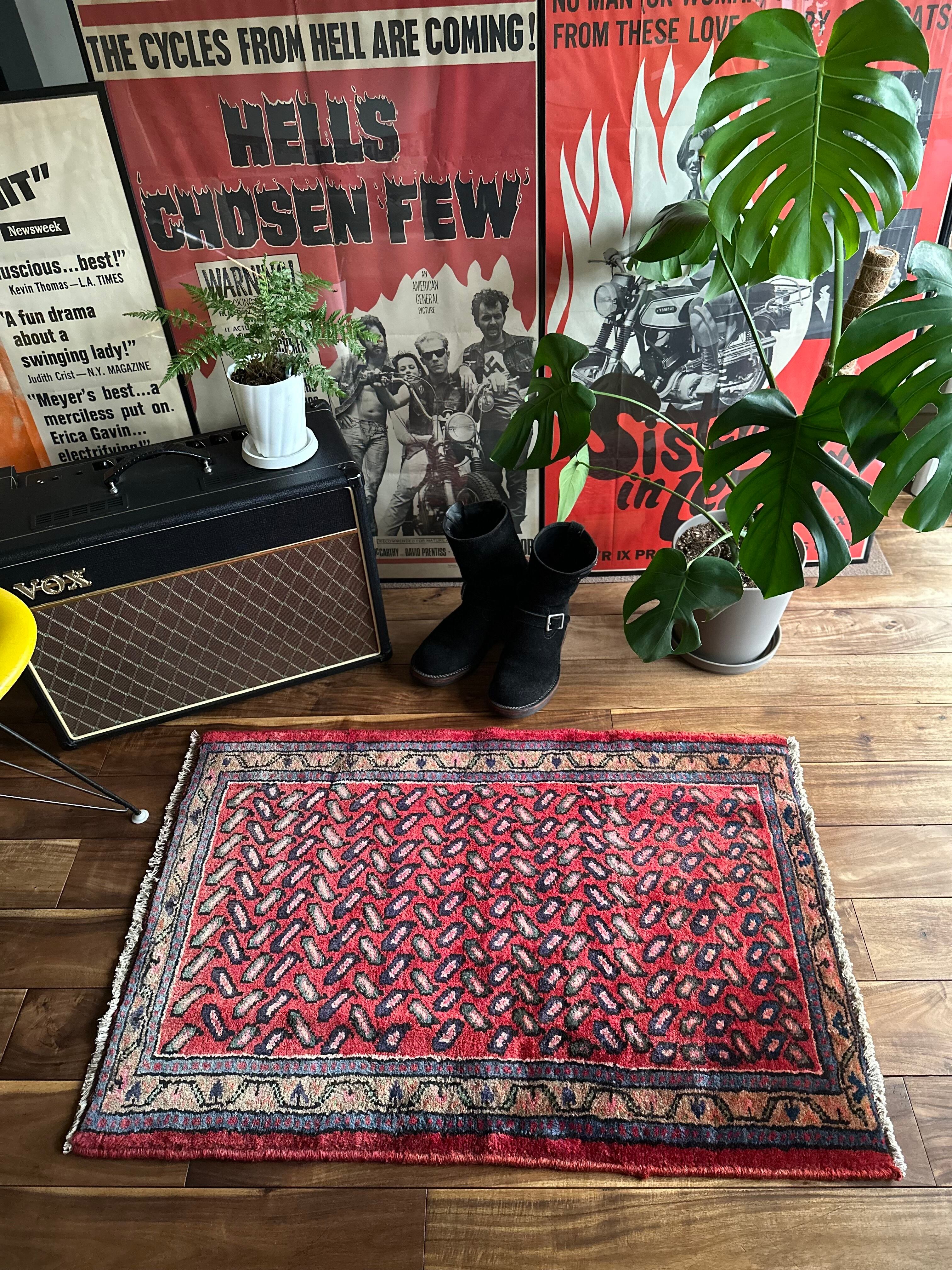 光の具合でなんとも良い輝きを放つシャイニーウールなボテ柄のこちらは、ハマダン近郊で手織りされたヴィレッジラグになります。