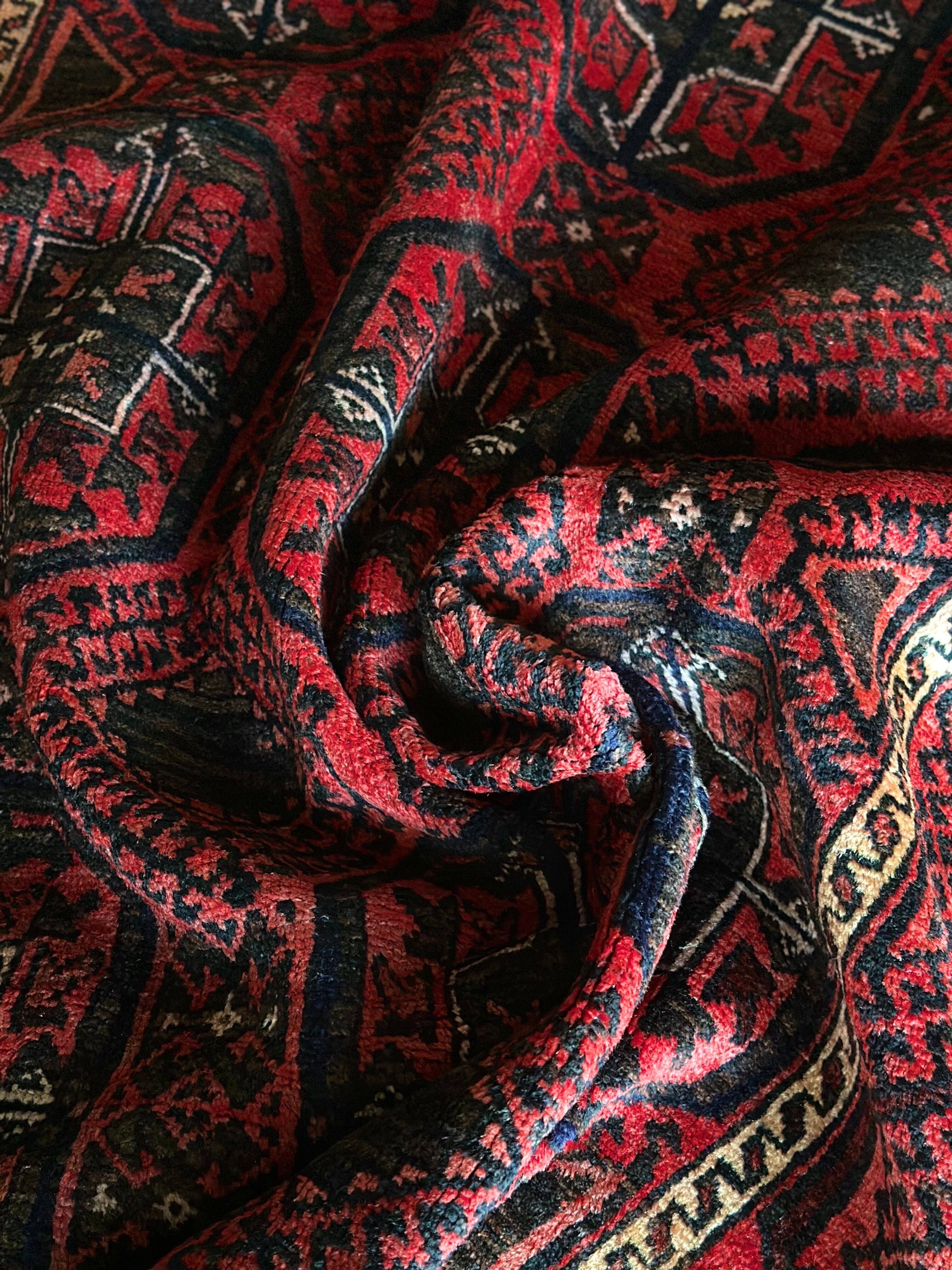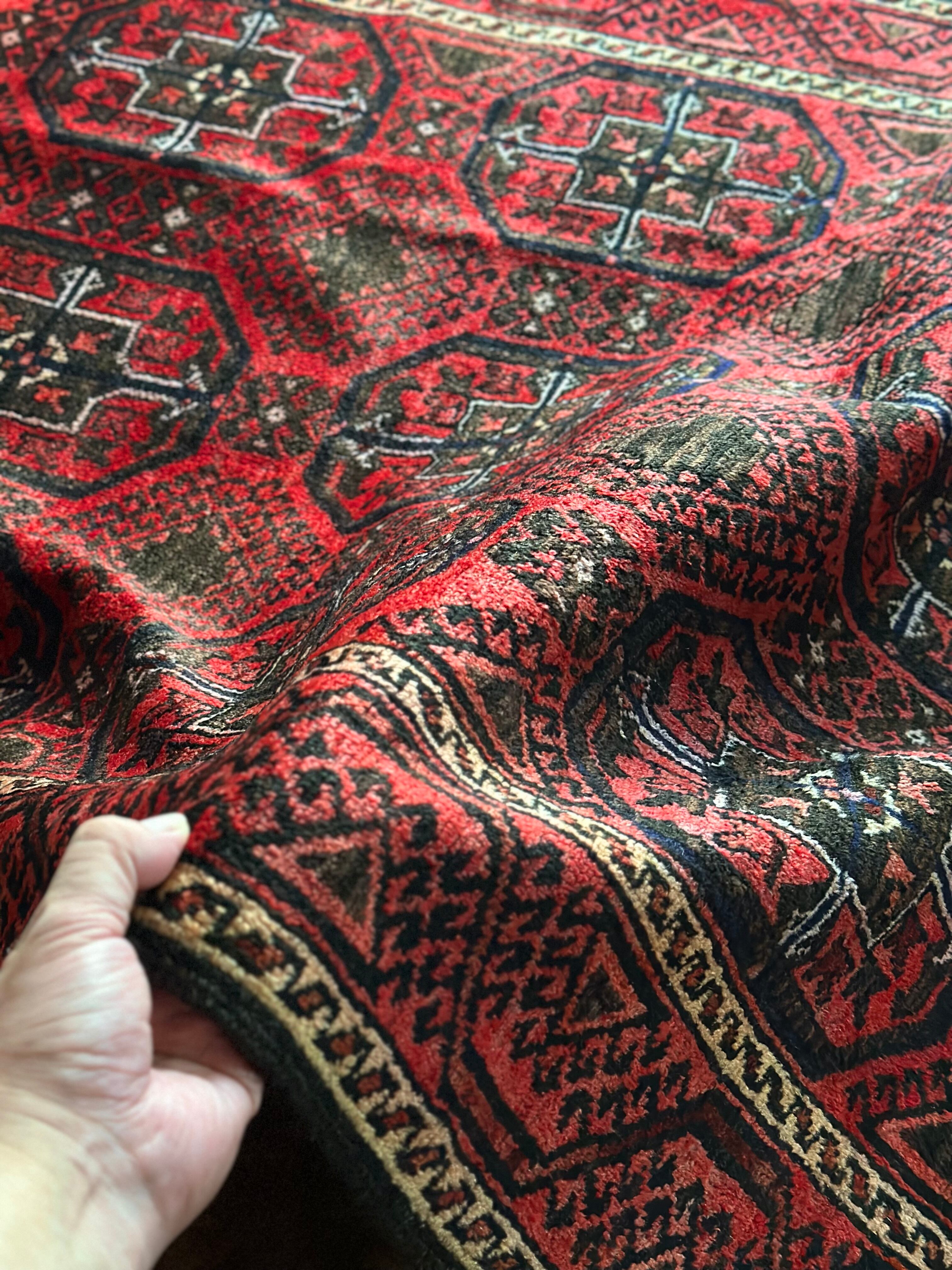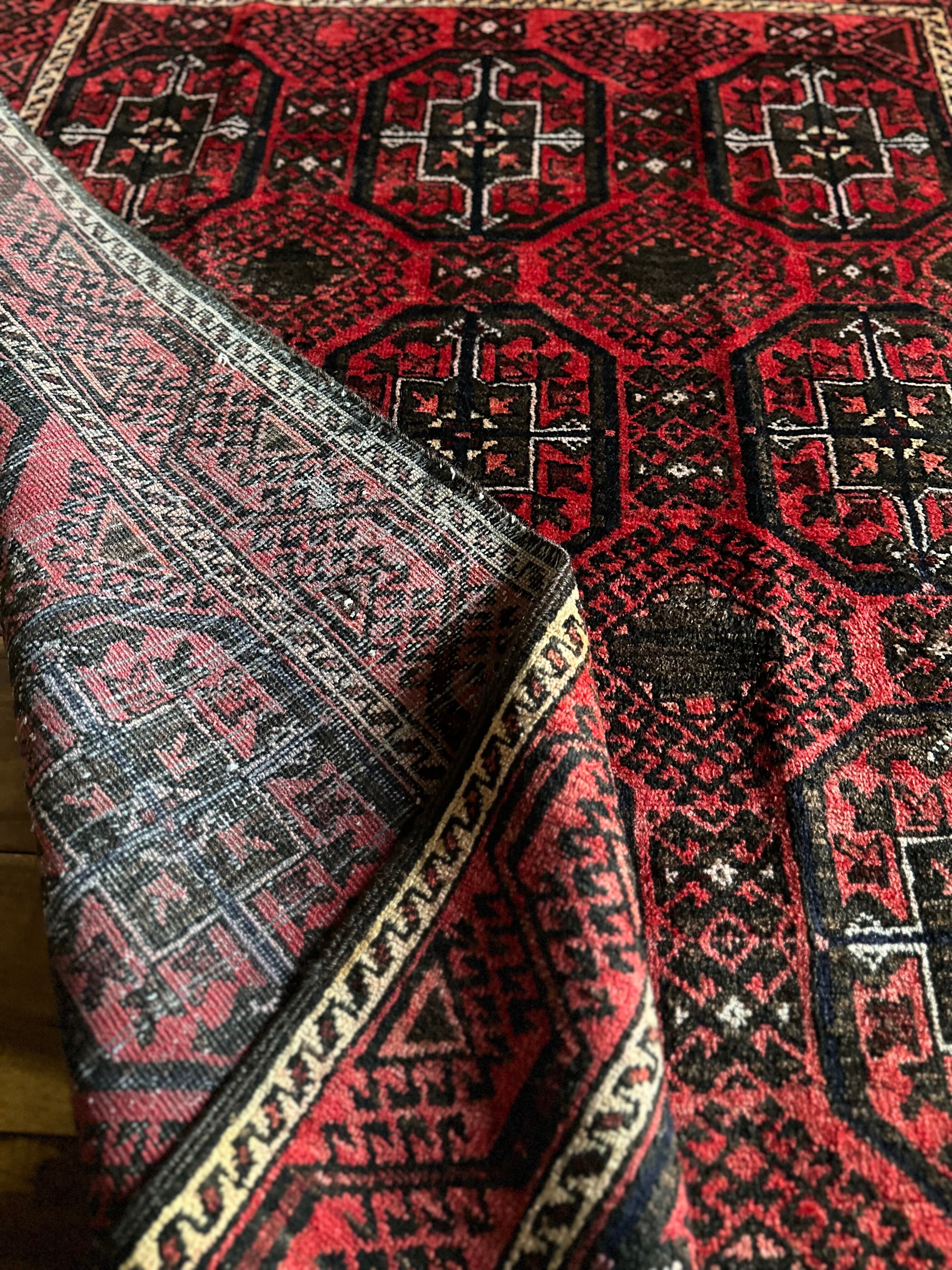 その色褪せ具合がヴィンテージラグの証とばかりに、新品では味わえない光沢が魅力的でしょうか。デフォルメされたテッケギュルの連続紋様に、お馴染みのボーダー装飾がバルーチ族らしいトライバルラグになります。