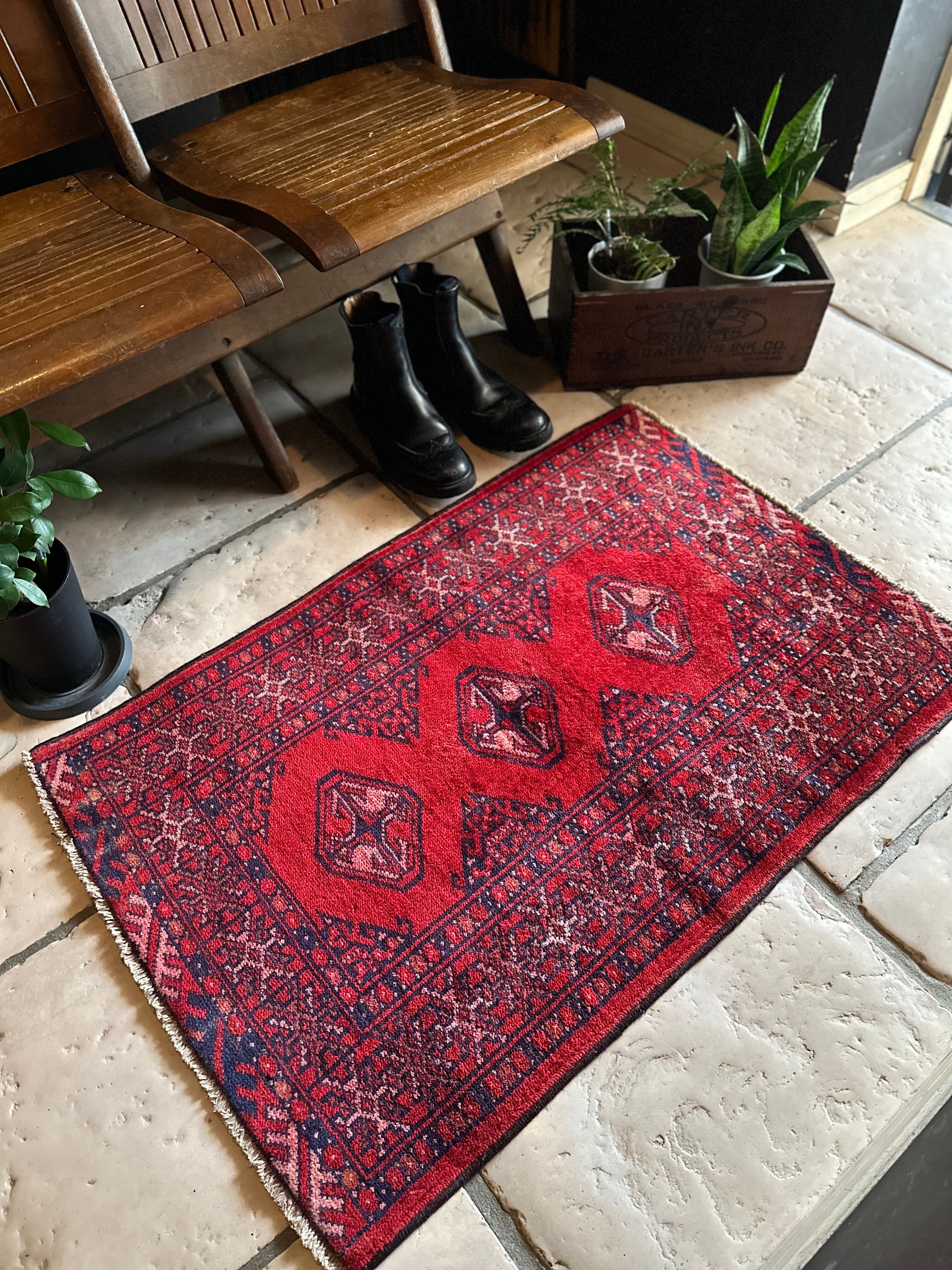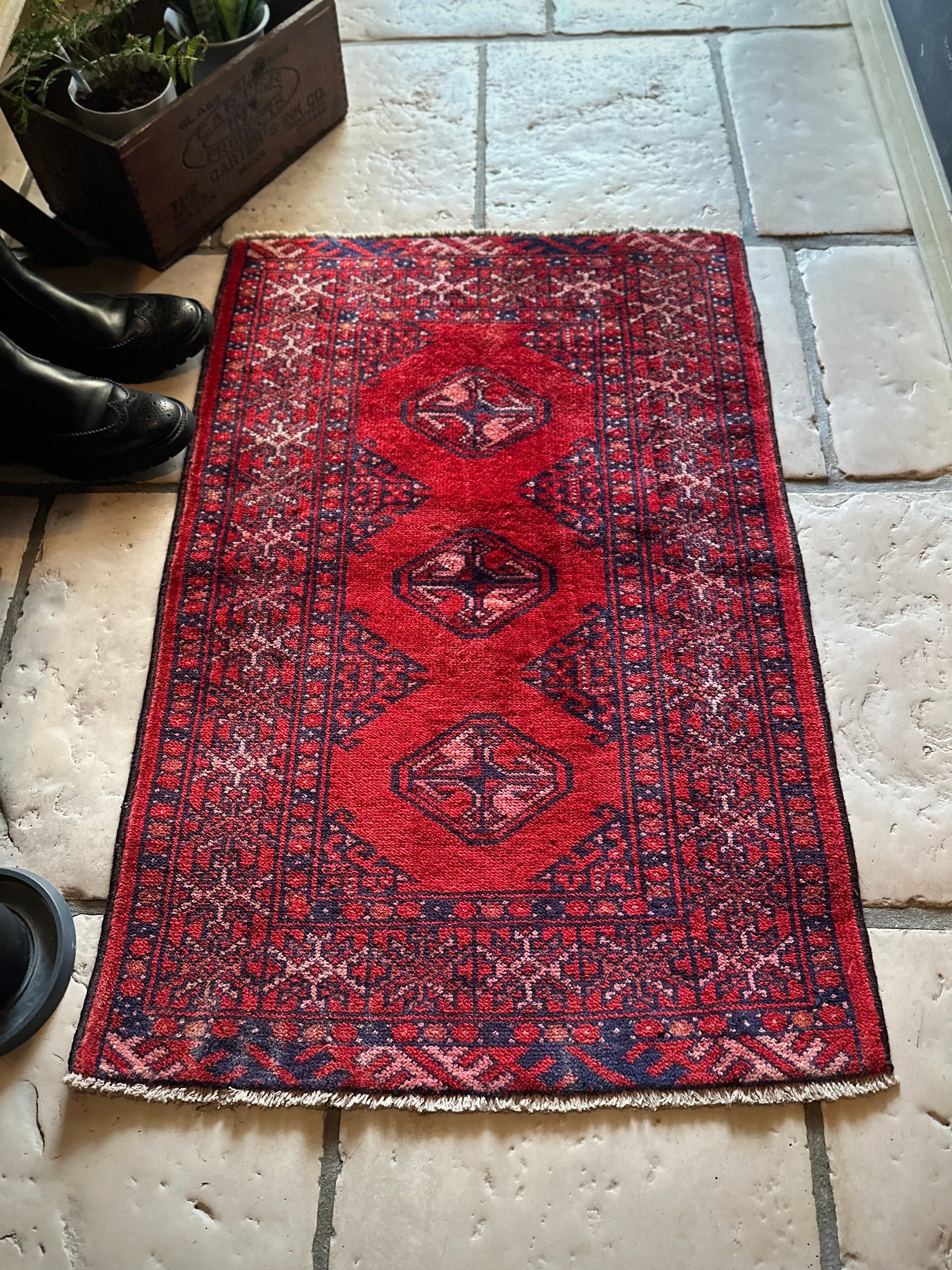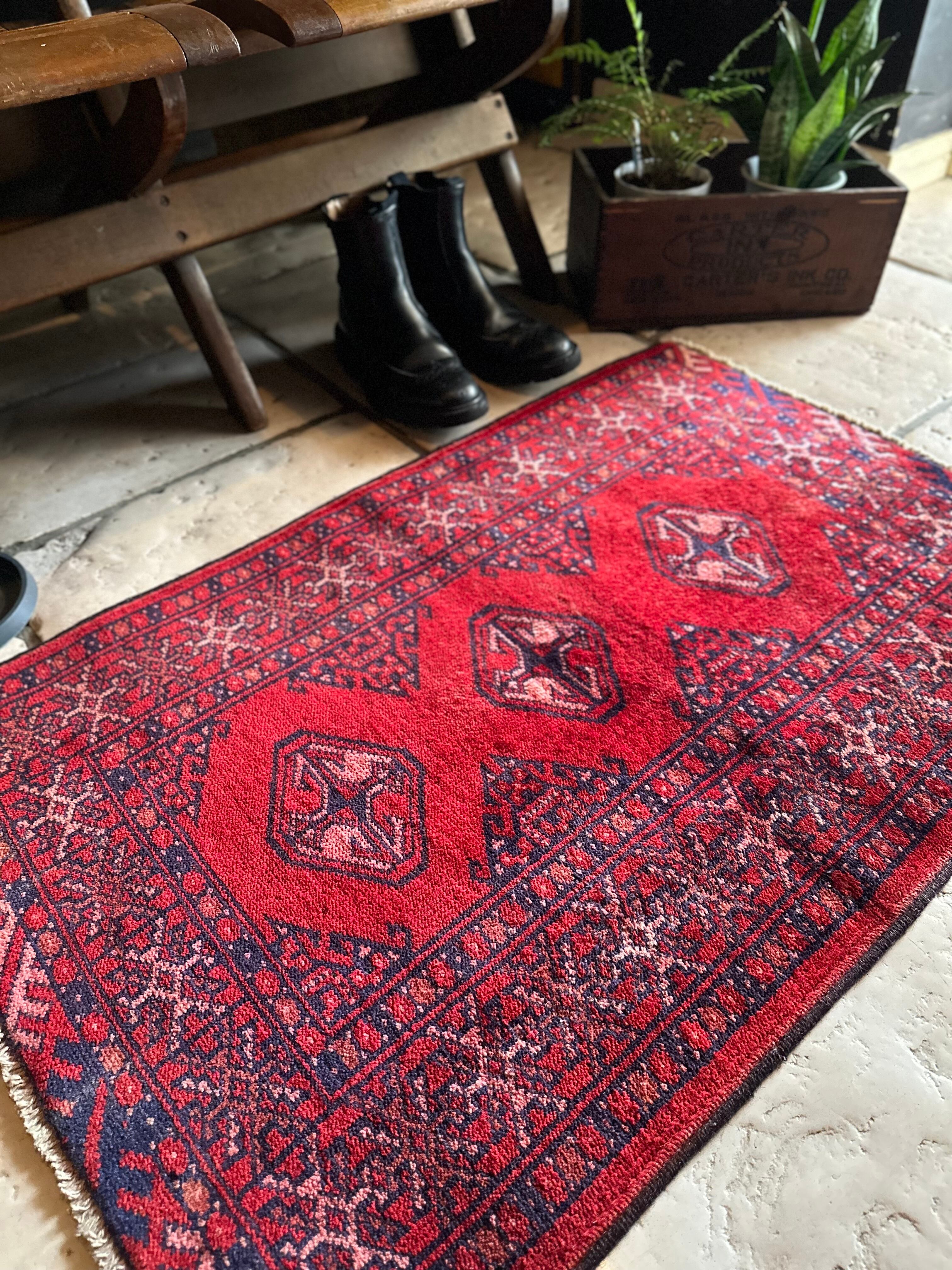 またラグそのものに関しては羊毛特有の匂いがあり手織りによる歪みや経年劣化、草木染めによる色ムラなどがありますが、それもまたトライバルラグの魅力かとご理解ください。