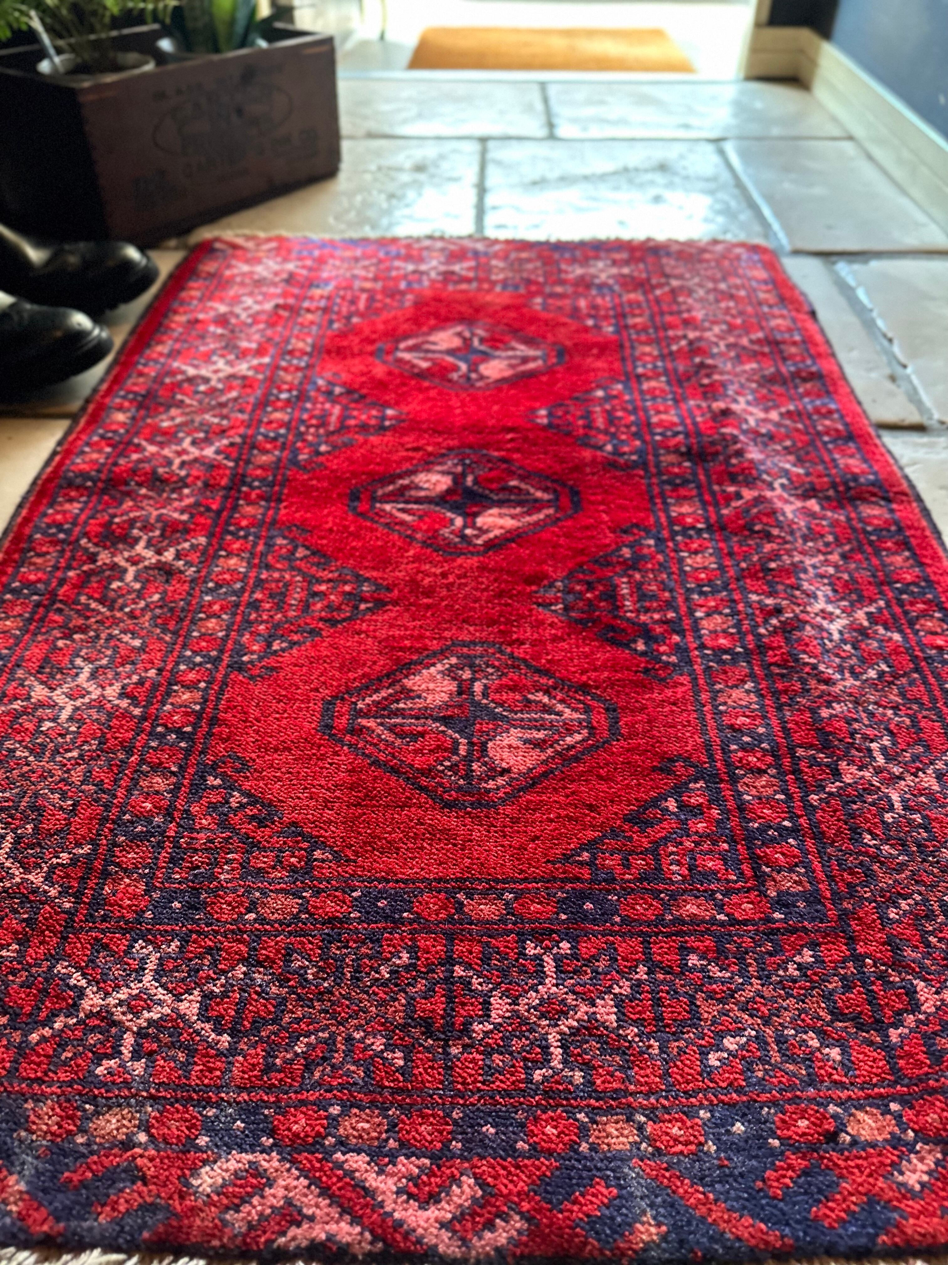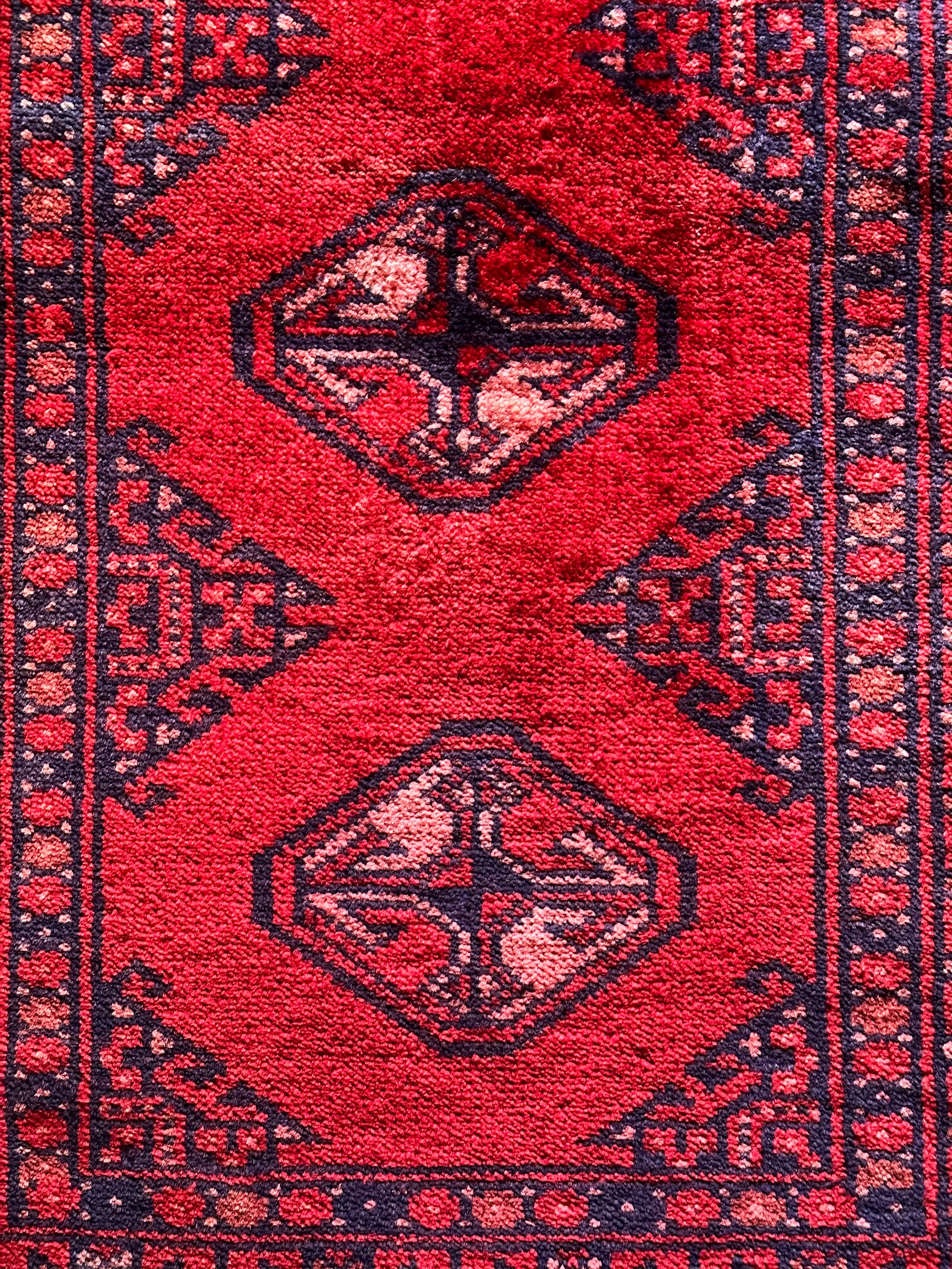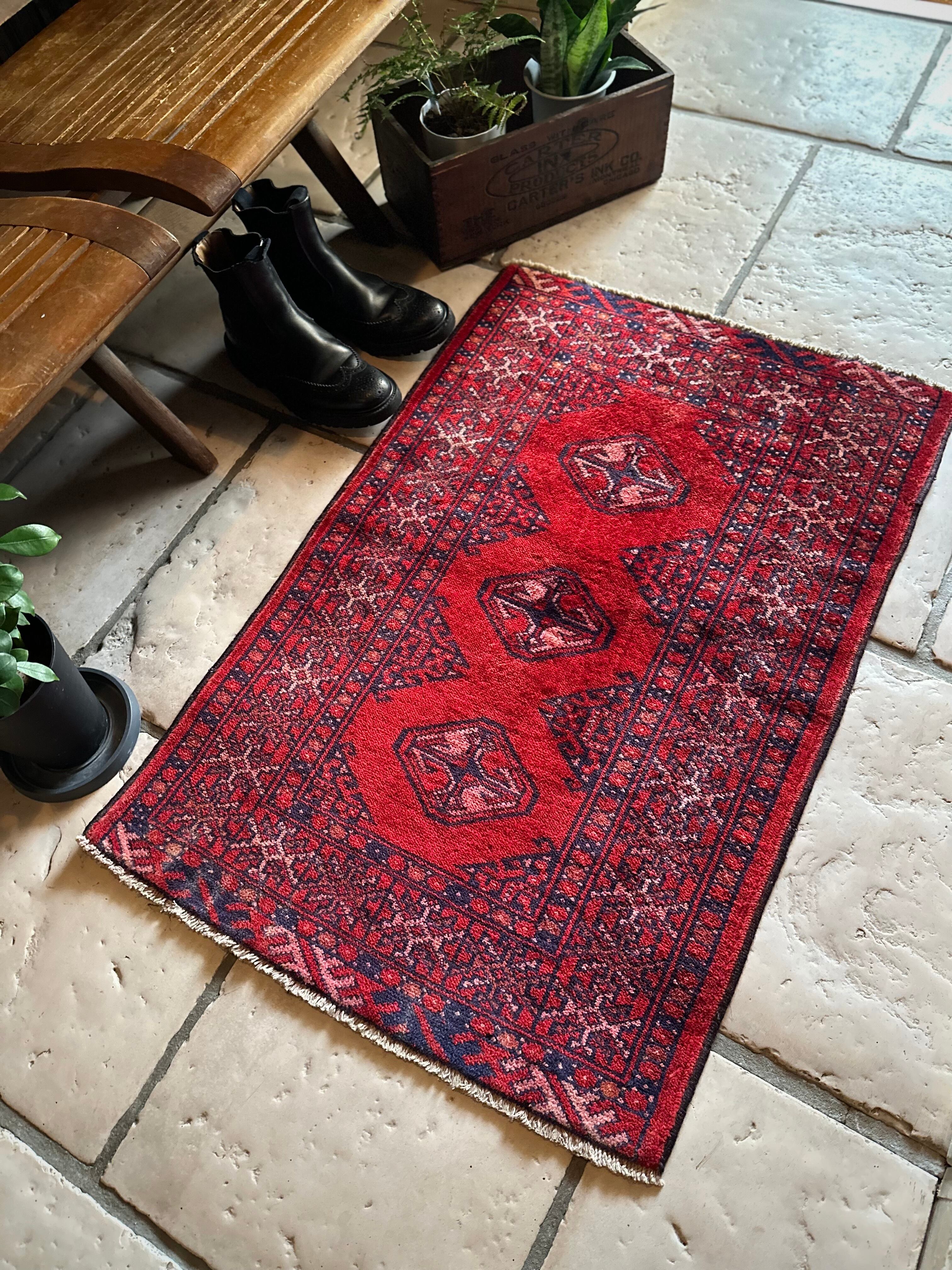 情熱の赤と言えるほど真っ赤な印象に見えますが、写真では白っぽく写り込んだ箇所はオレンジになりますこちら、お馴染みのギュル紋様が部族らしいトルクメンのトライバルラグになります。
