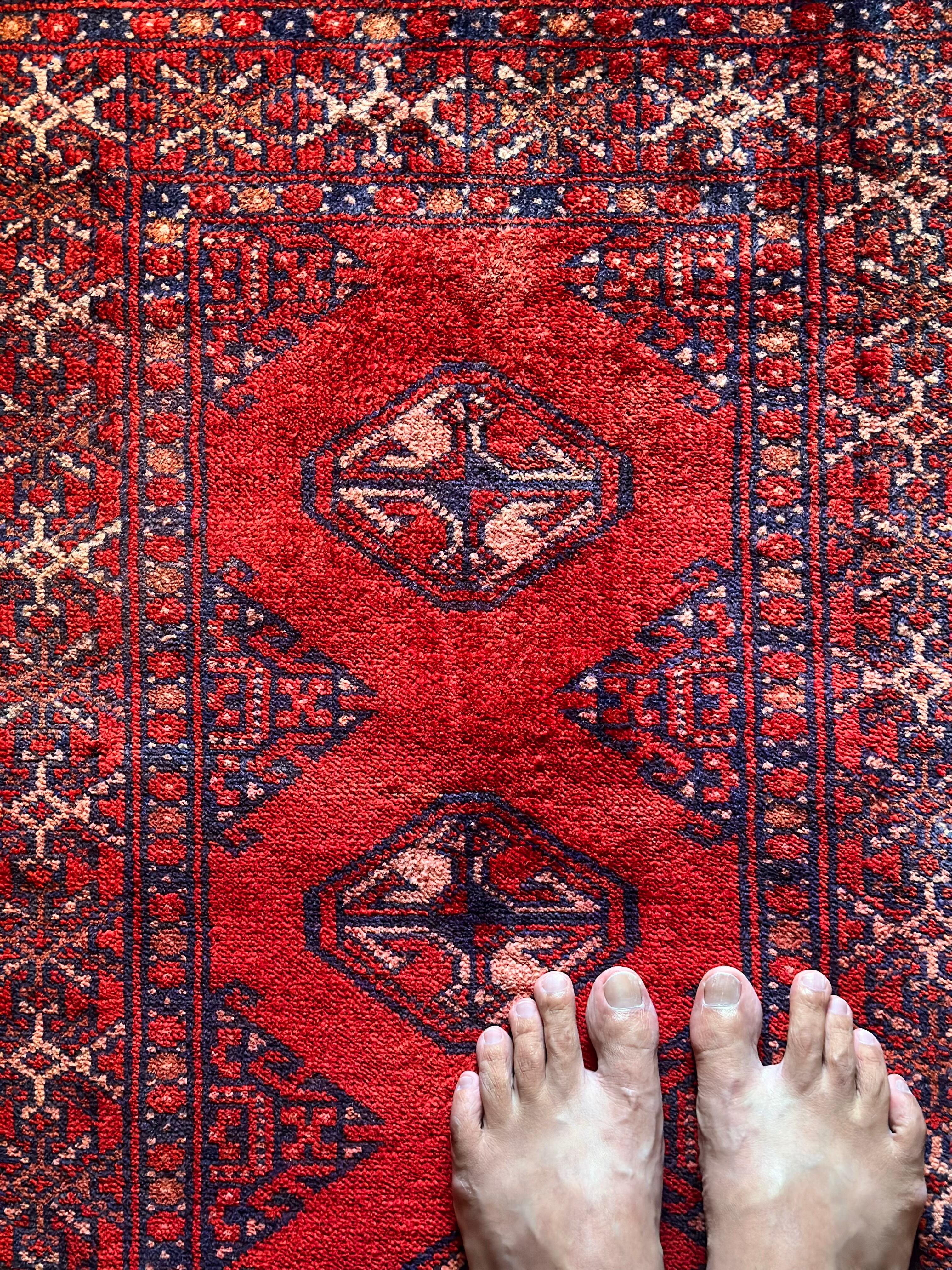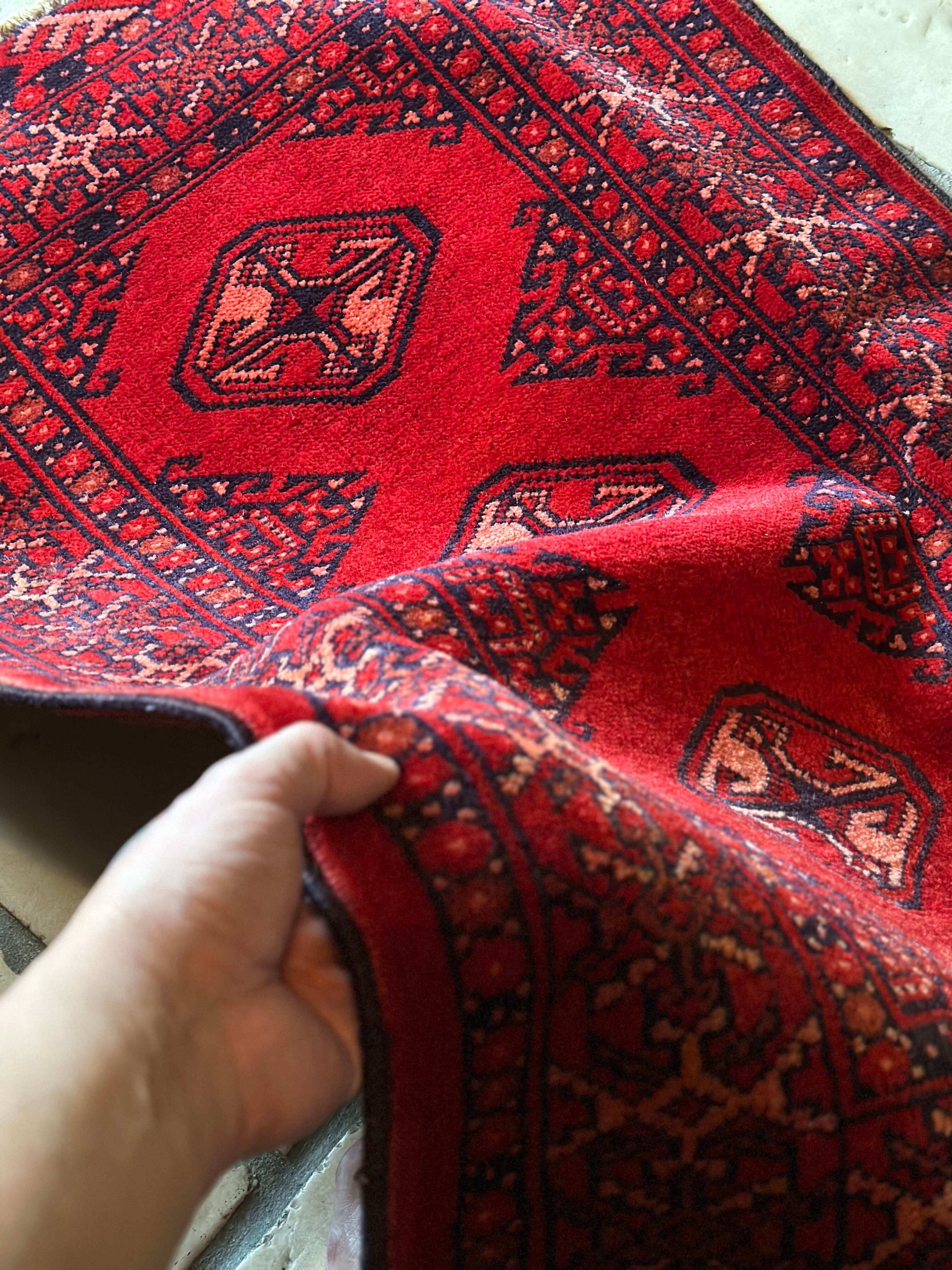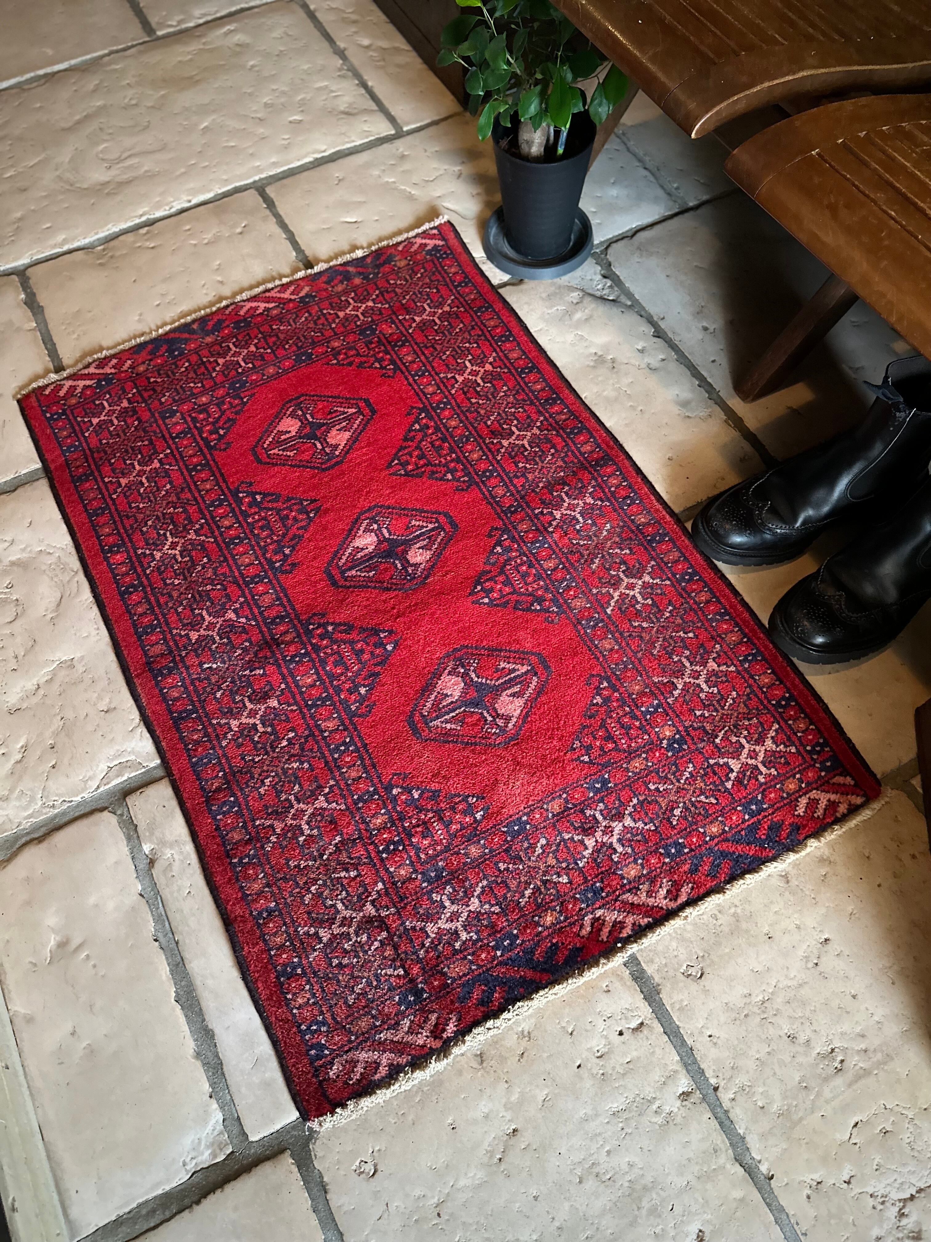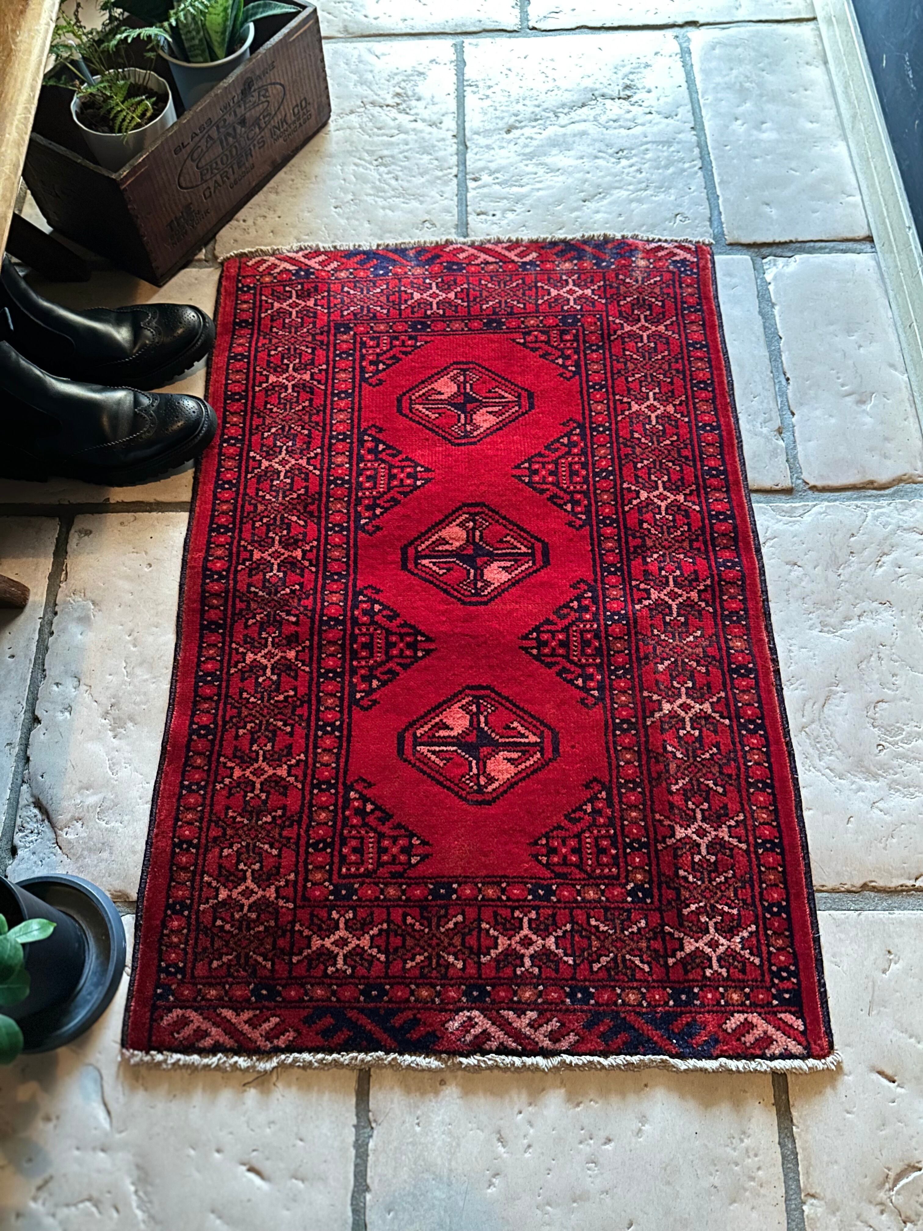 情熱の赤と言えるほど真っ赤な印象に見えますが、写真では白っぽく写り込んだ箇所はオレンジになりますこちら、お馴染みのギュル紋様が部族らしいトルクメンのトライバルラグになります。