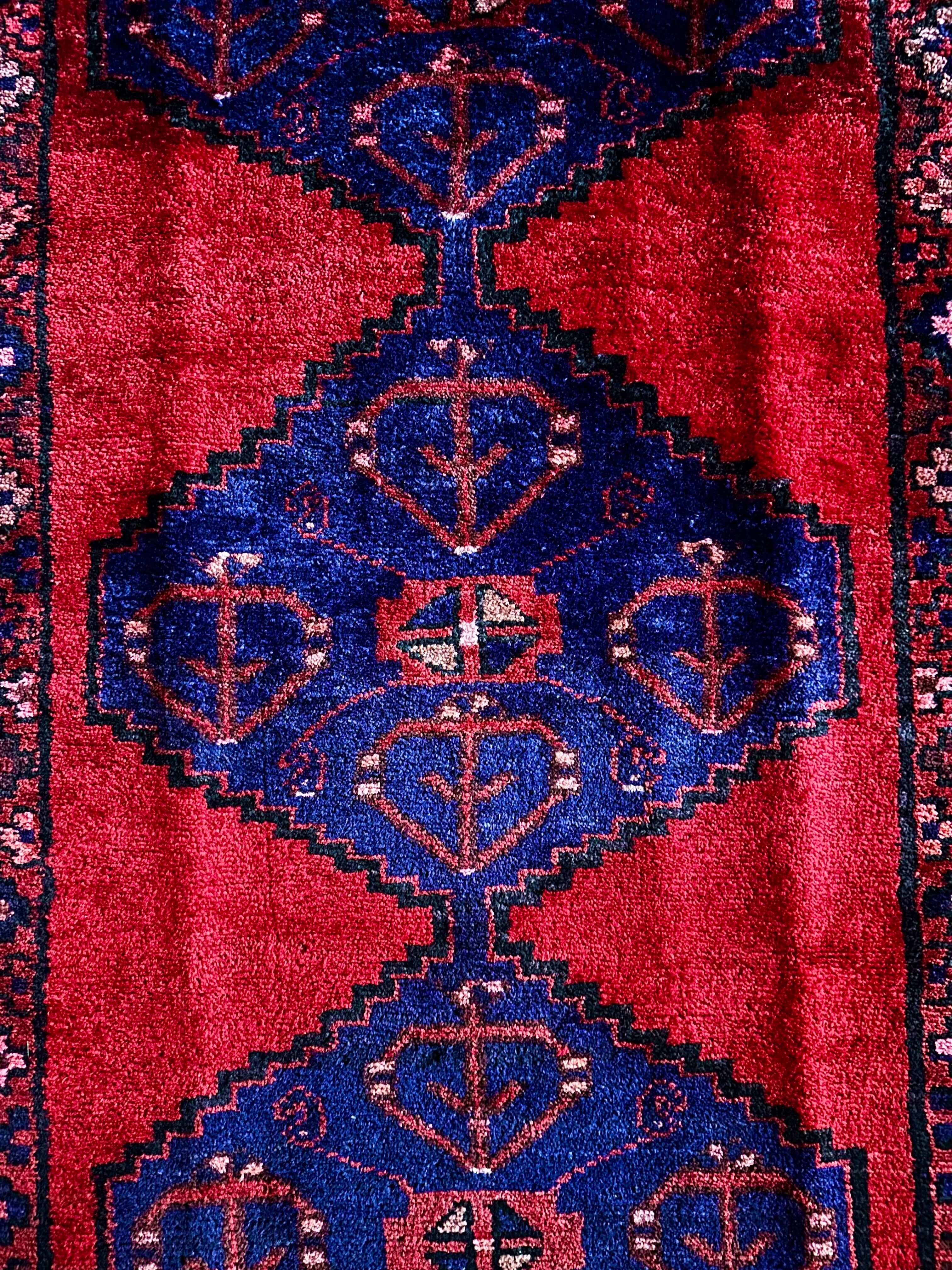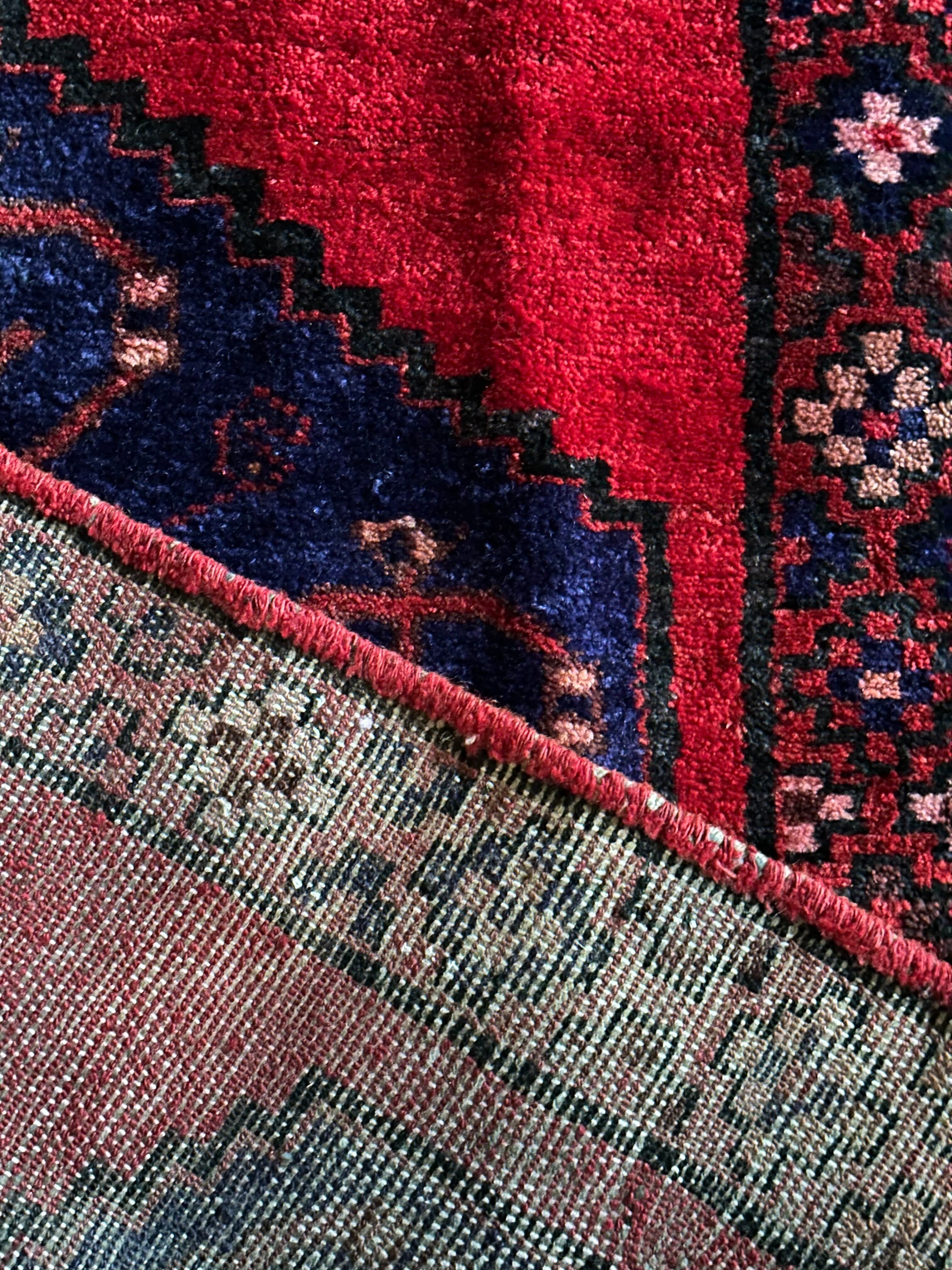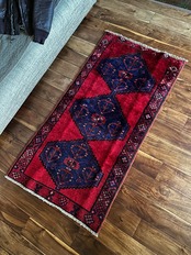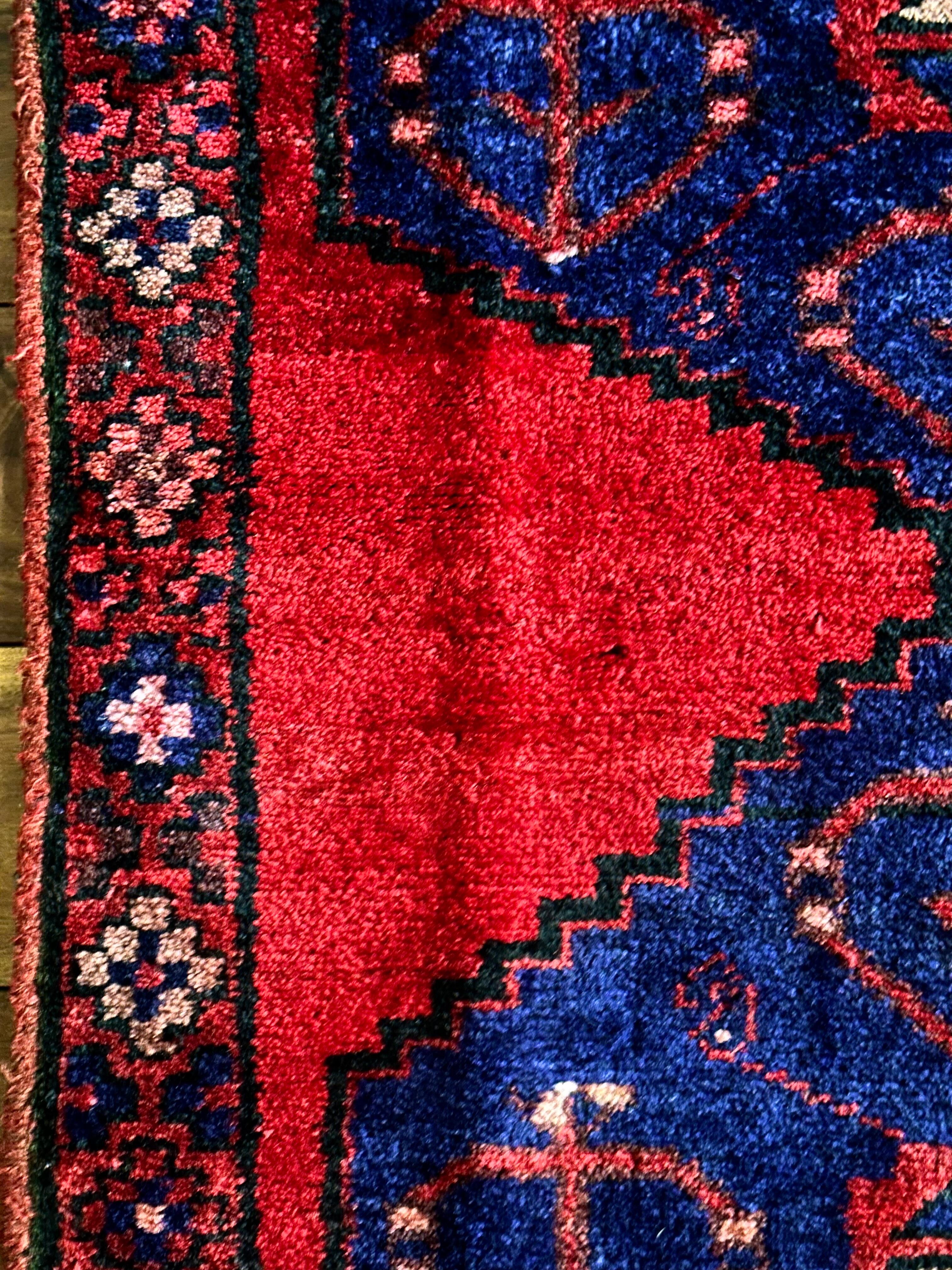 見た目のシンプルさとは裏腹にシャイニーレッドなフィールドにネイビーのメダリオンが力強さを感じるハマダン産のヴィレッジラグになりす。