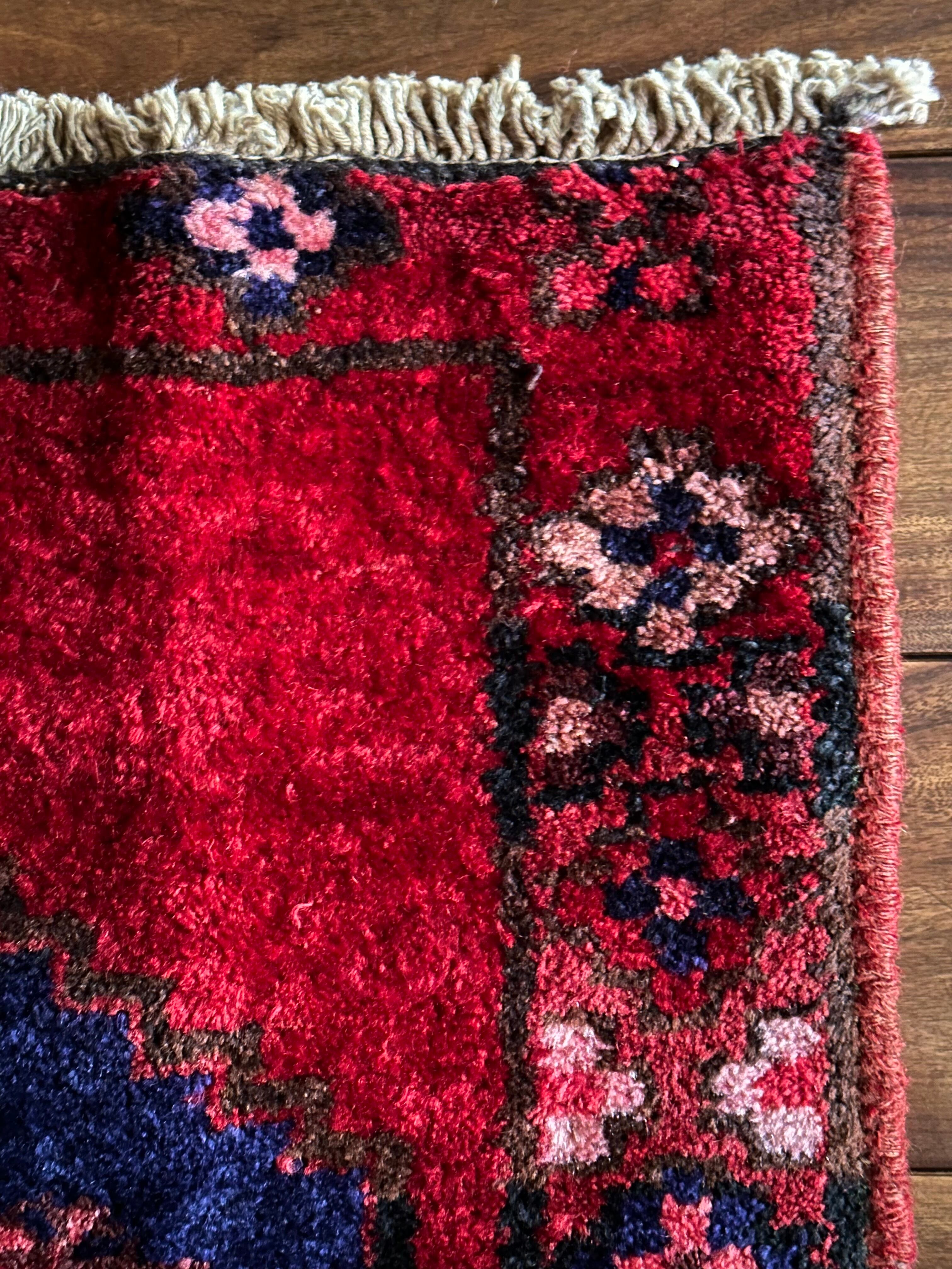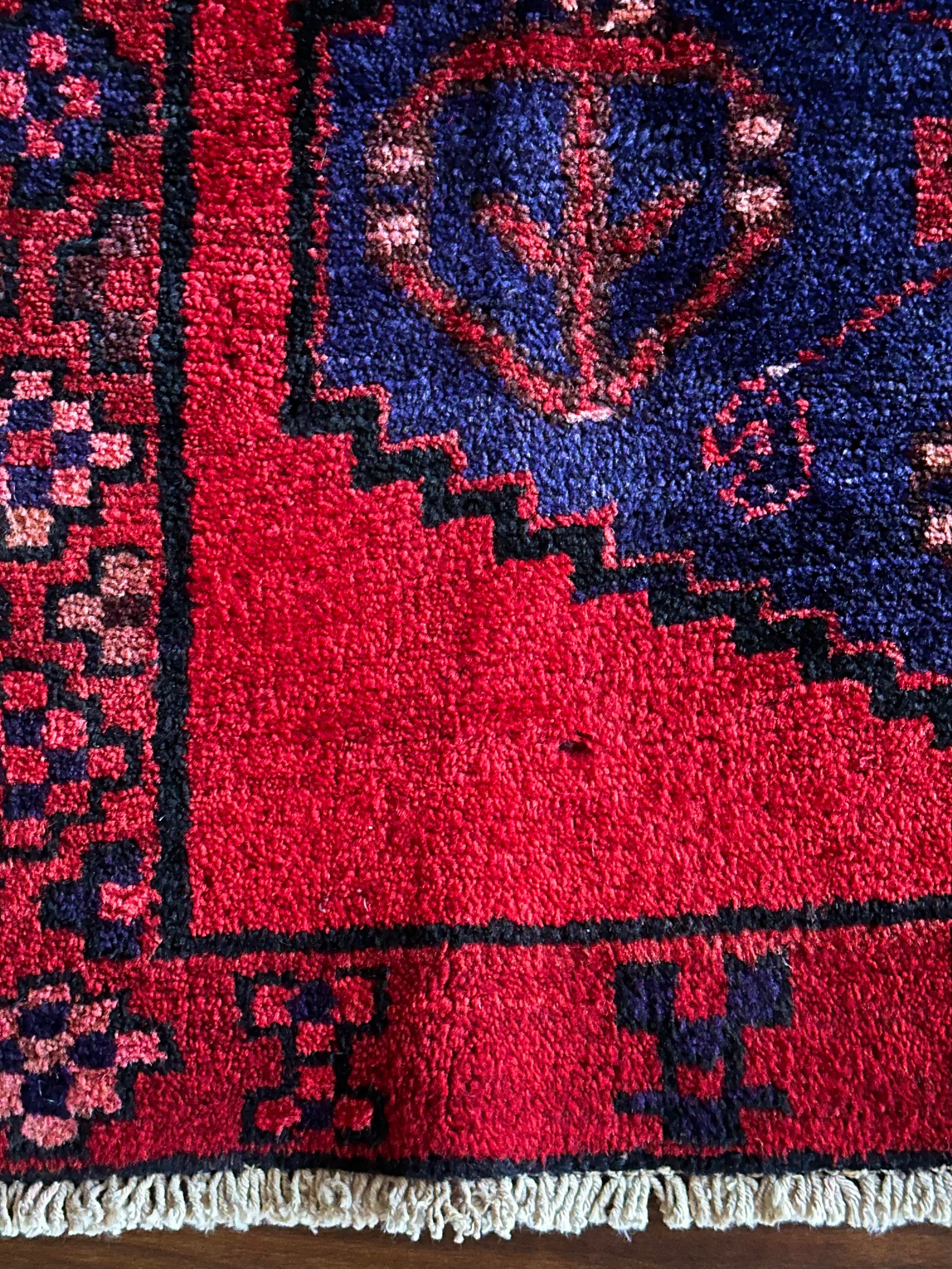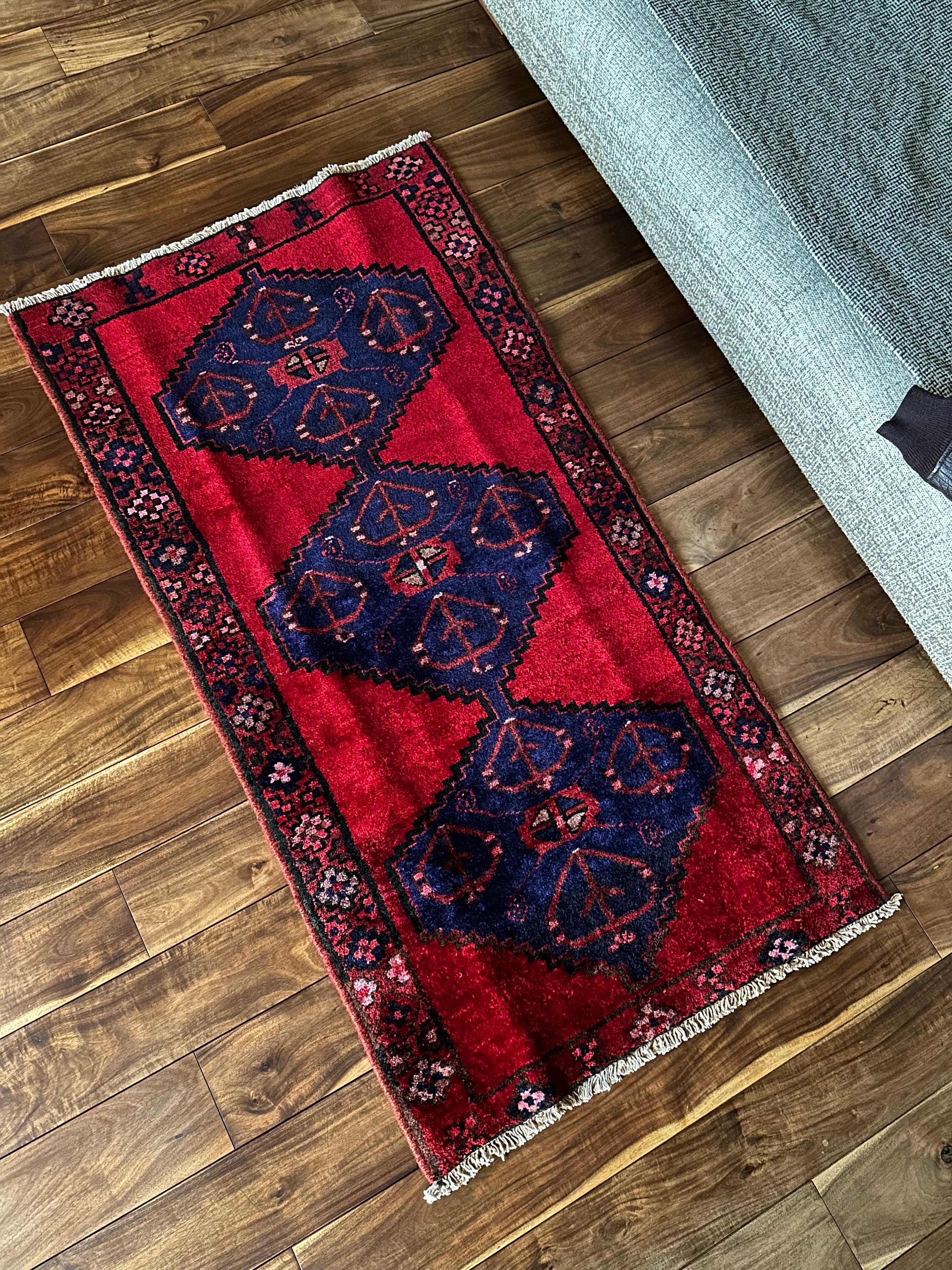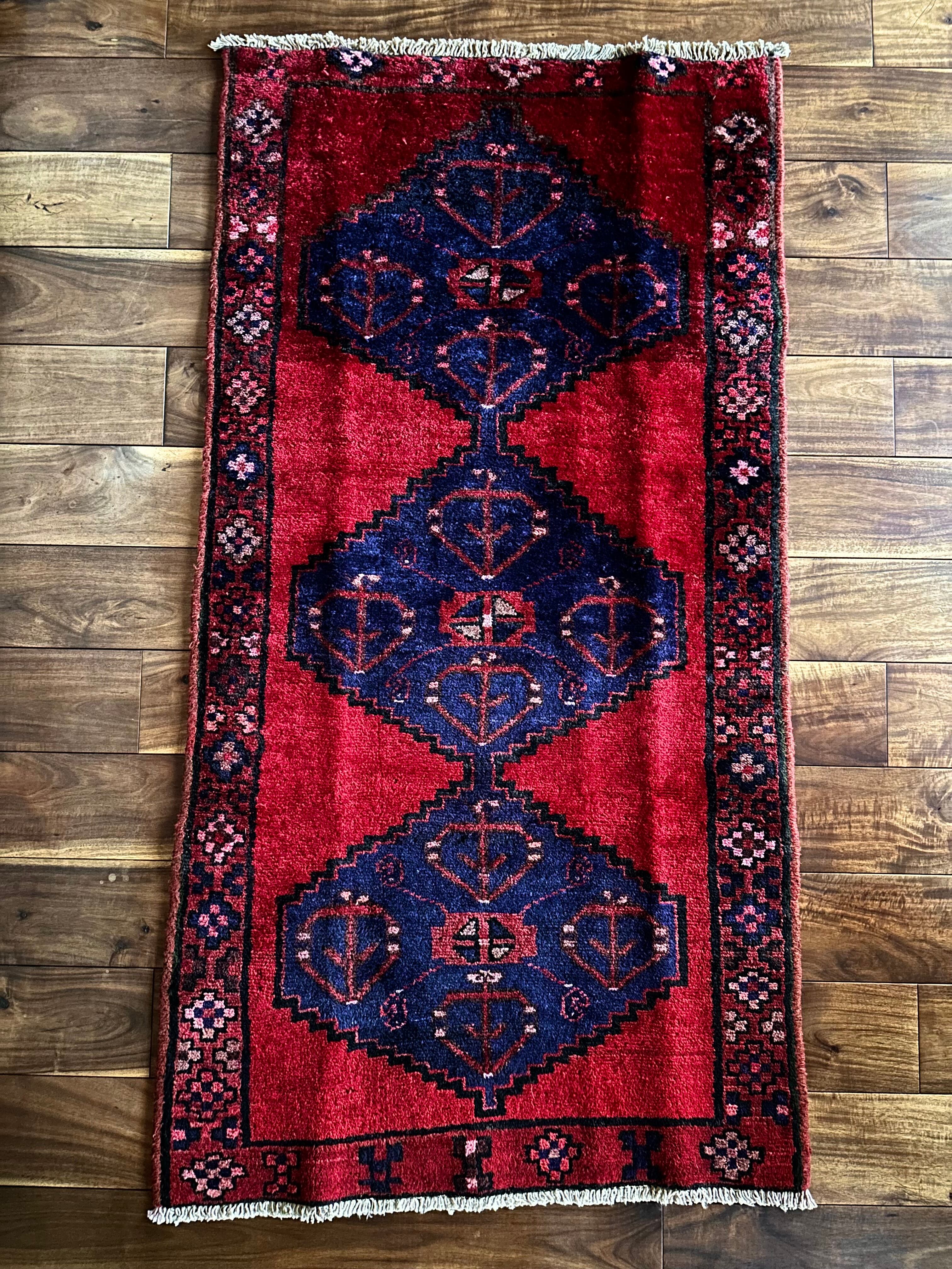 見た目のシンプルさとは裏腹にシャイニーレッドなフィールドにネイビーのメダリオンが力強さを感じるハマダン産のヴィレッジラグになりす。