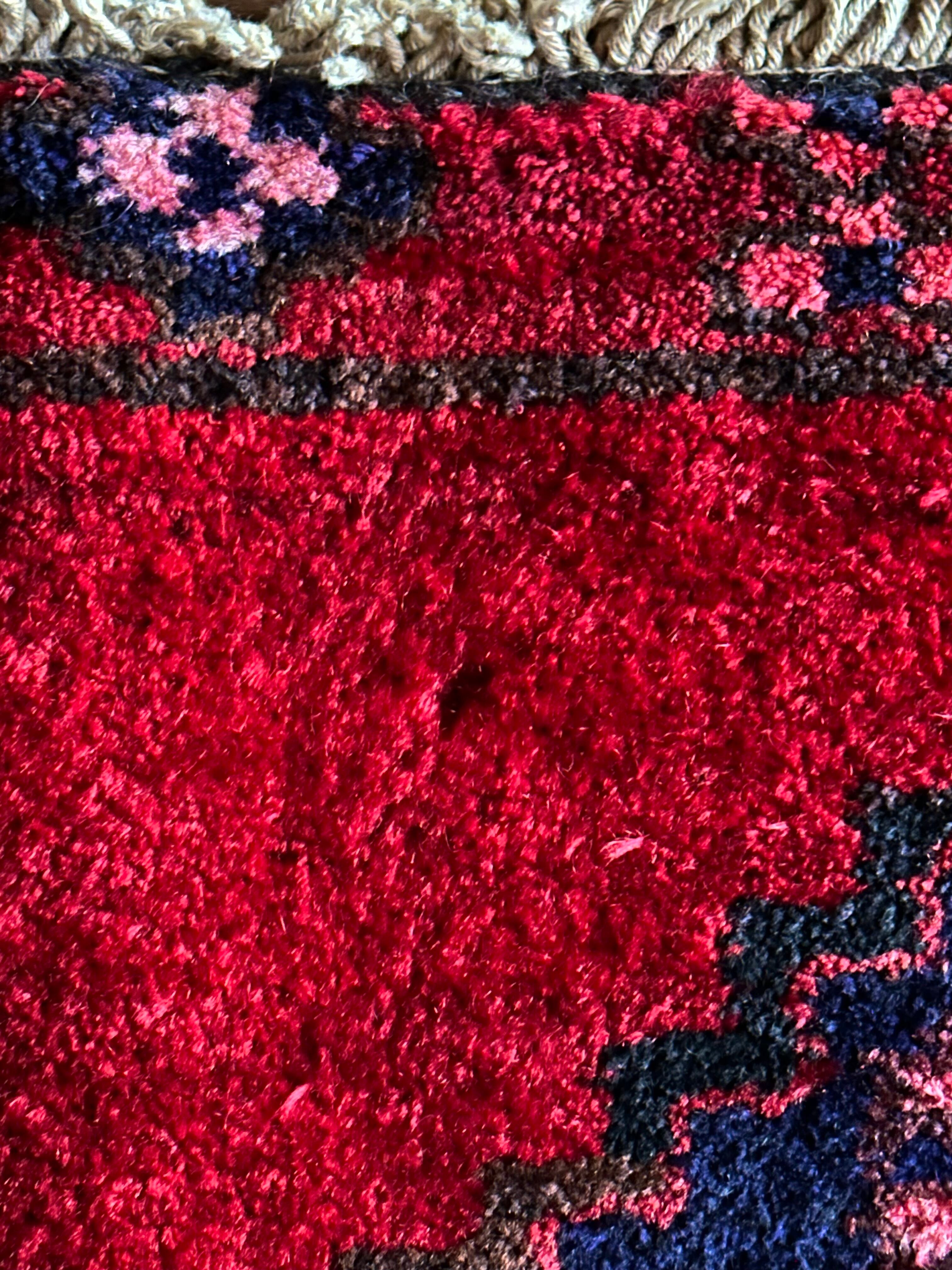 モチーフ的には不明ですが林檎やハートに見えなくもなく、ハマダンらしいガシっとしたシングルウェフトで、大きさ的にはベランダやサイドボードの足元に使えそうな1枚になります。
