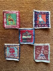 コースターとしてのご使用はもちろん、額装したりパッチワークにしたりと使い勝手のよいアイテムになり、大きさ的にはフリンジを含めて約10〜11cmほどになりますが、それよりも小さな個体差がありますのでセット内容の写真にてご判断ください。