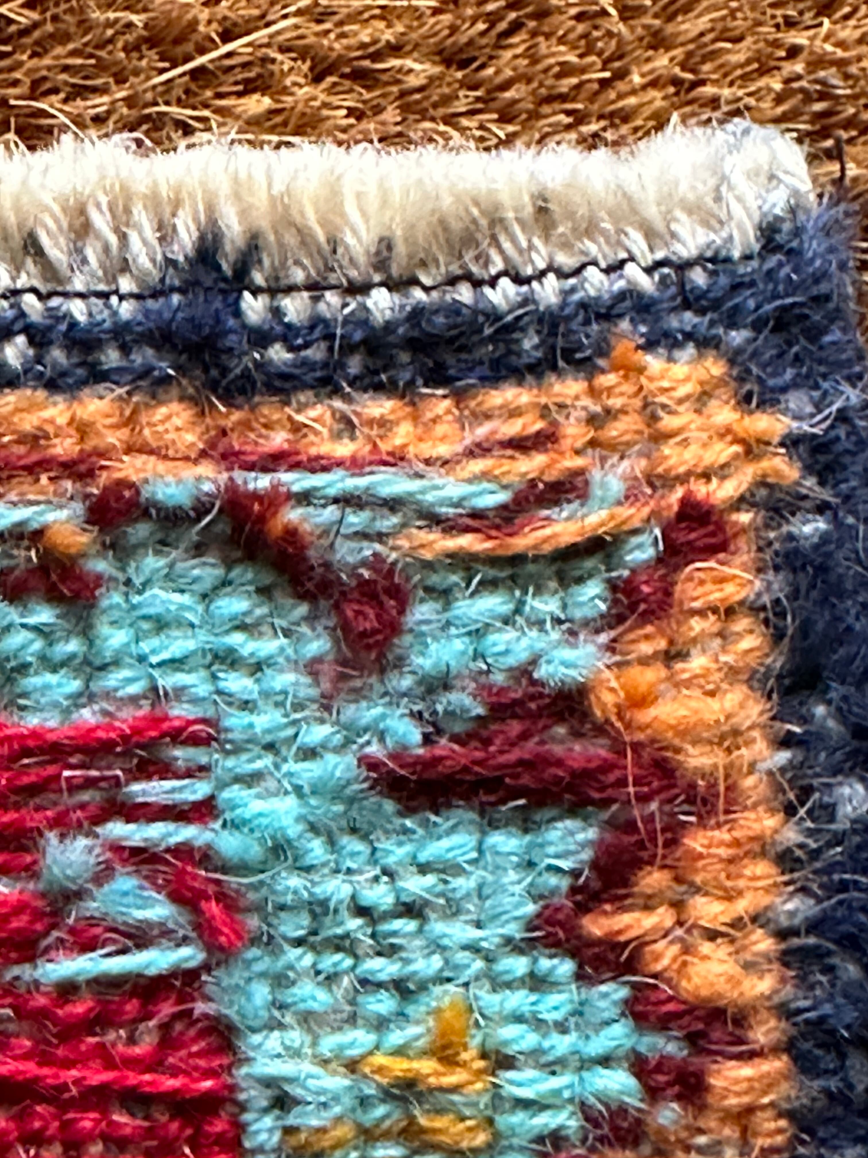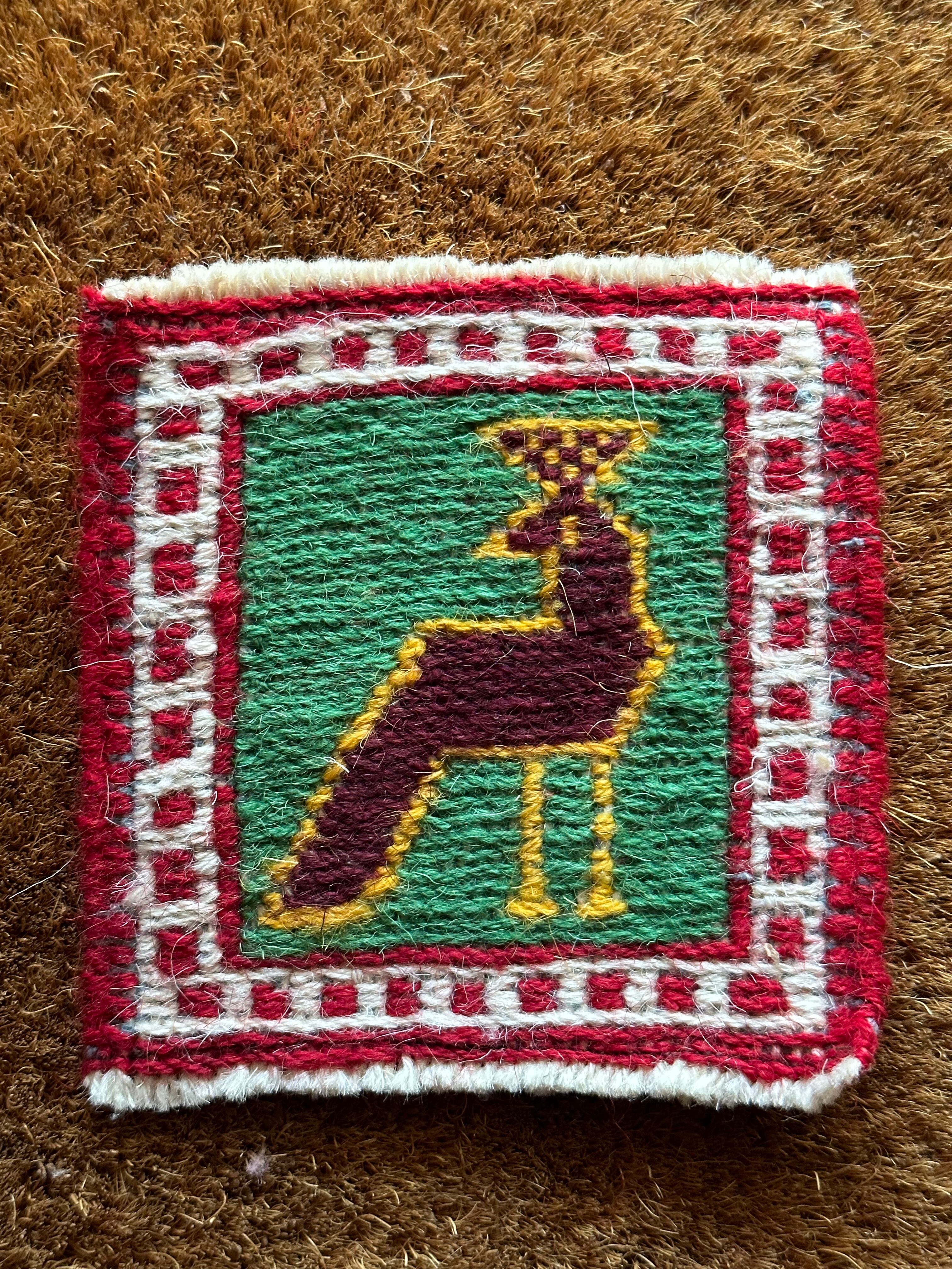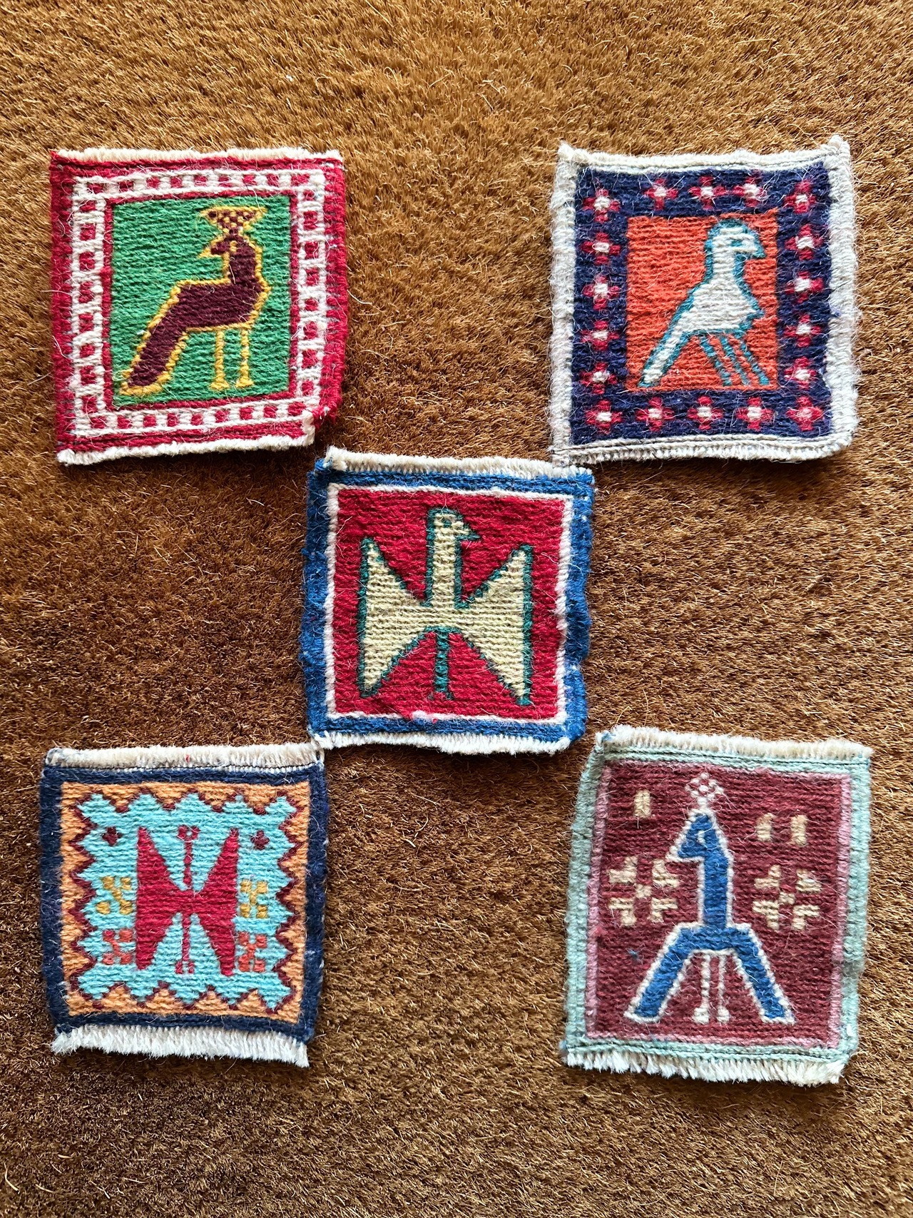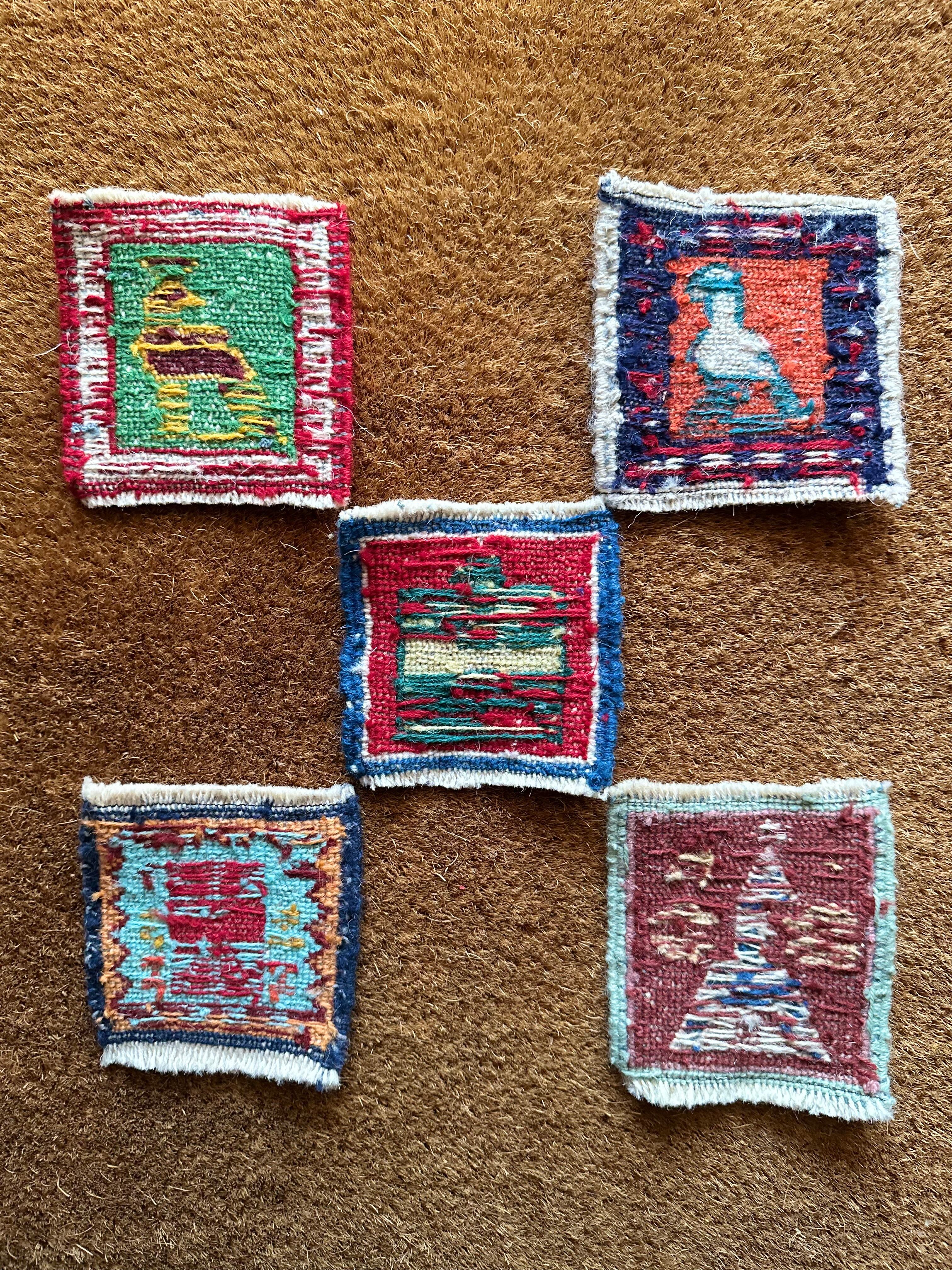 こちらは孔雀などが織り込まれた鳥柄の5枚セットになり、製作段階では20枚綴りの帯状ですが、イラン現地にてカットとフリンジのほどけ防止のかがり縫いを施してあり、本来のスマック織りならではの裏面のムダ毛もカットしています。