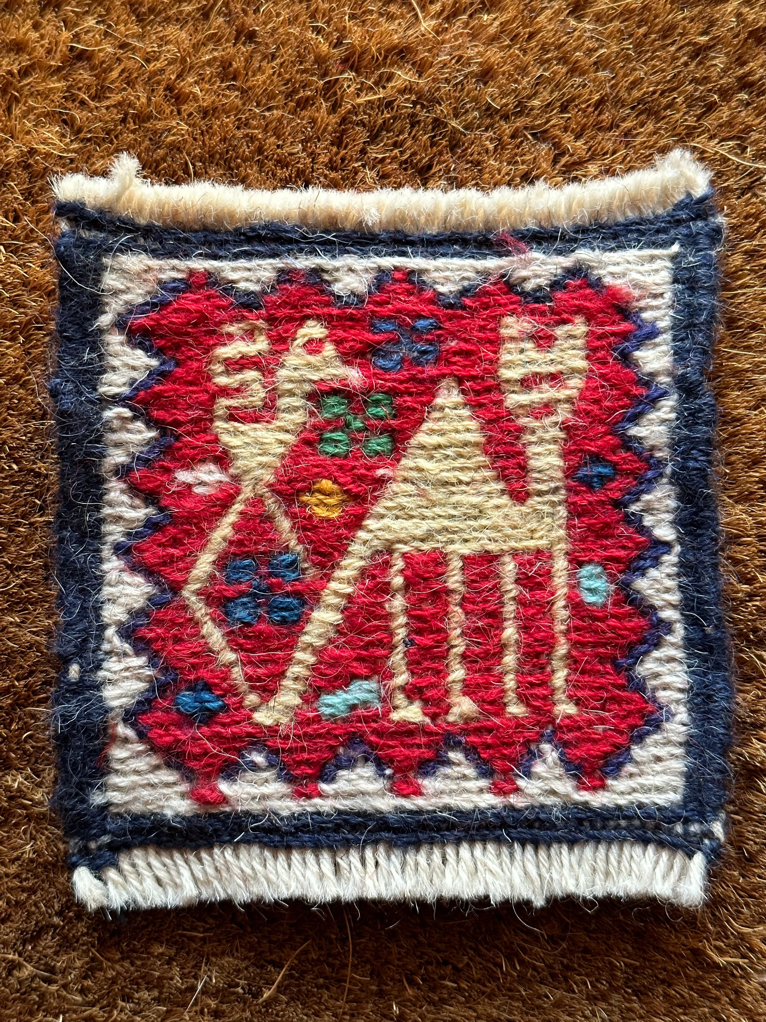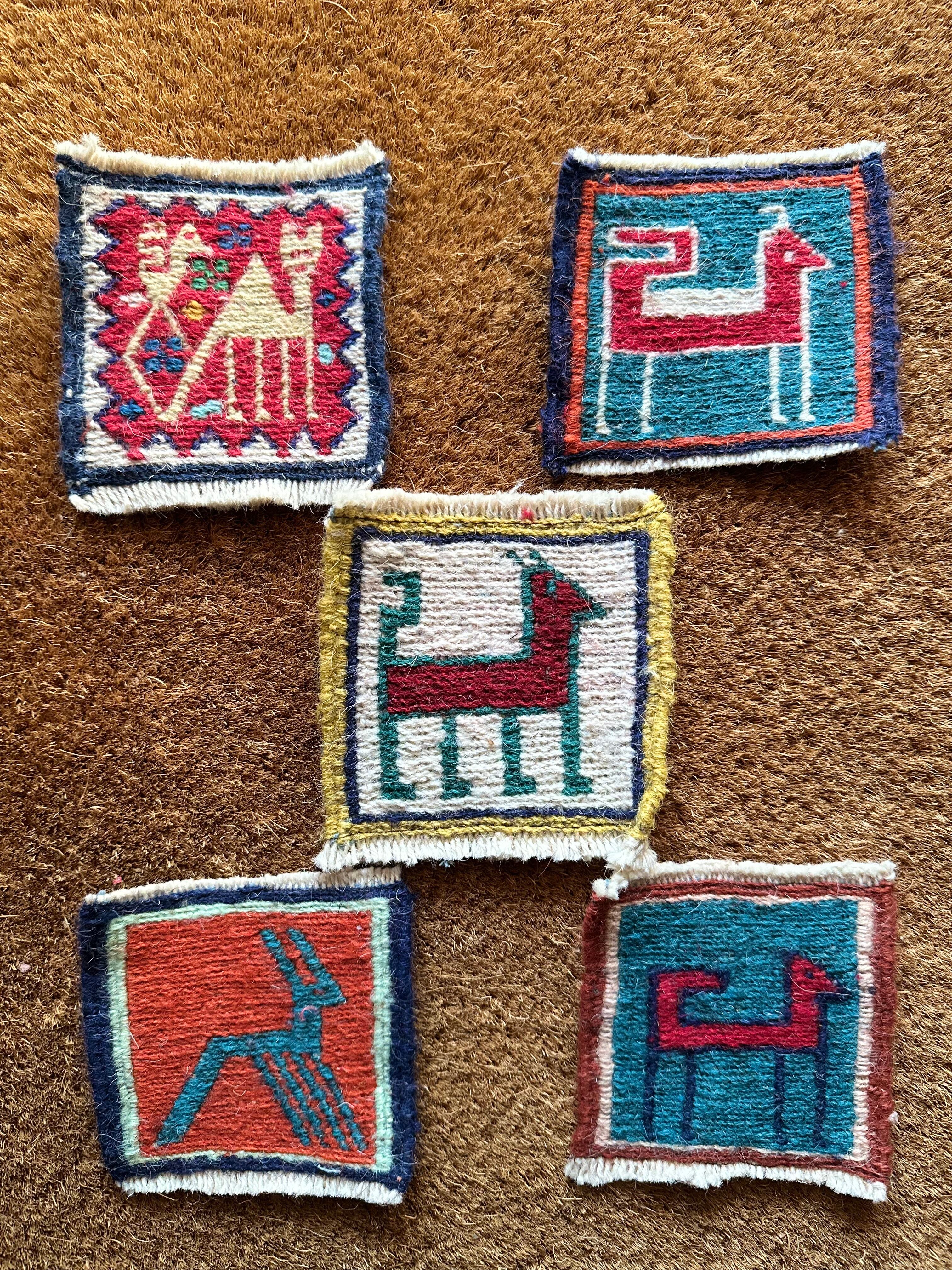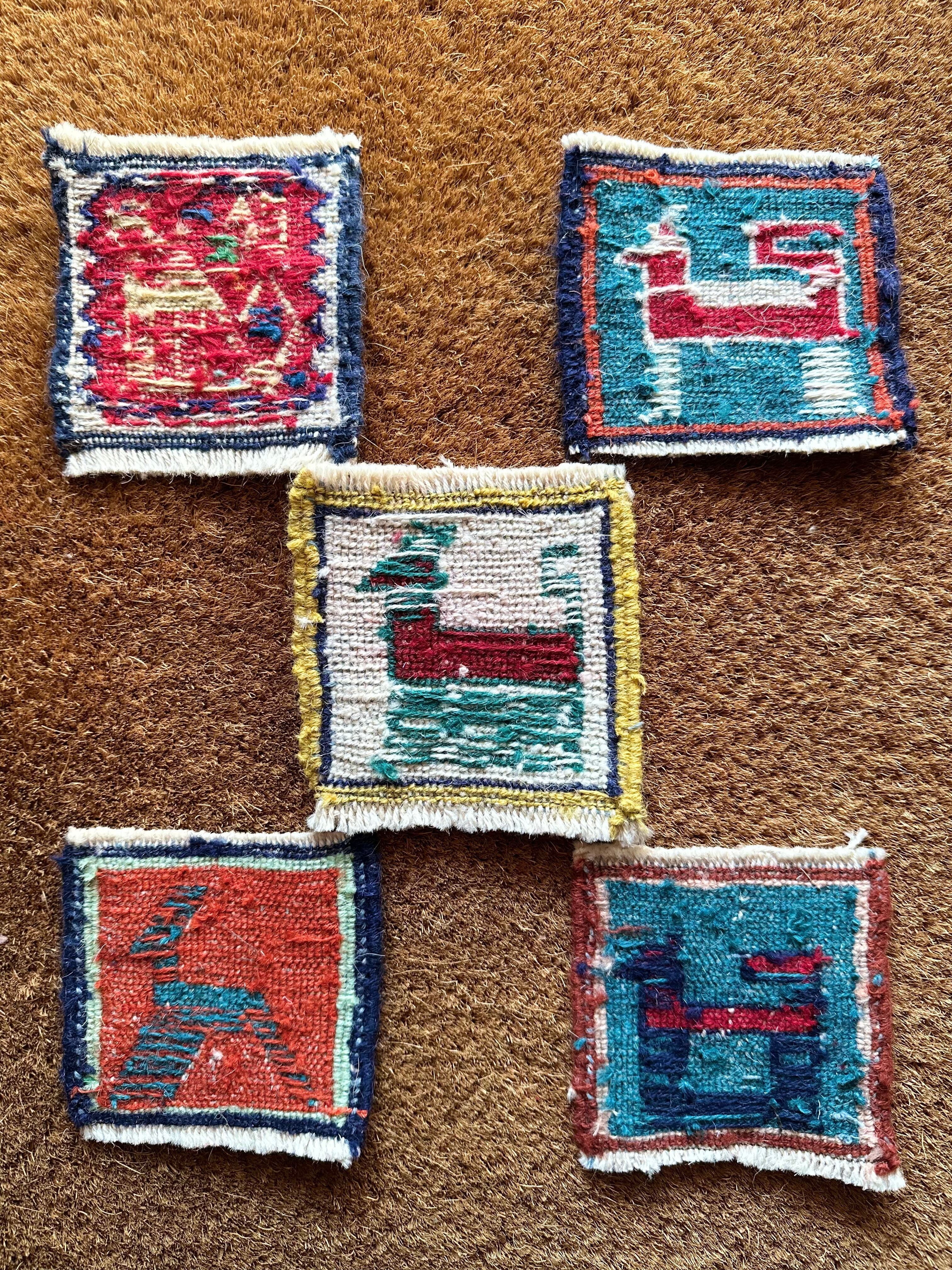 こちらはラクダや猫に鹿などが織り込まれた動物柄の5枚セットになり、製作段階では20枚綴りの帯状ですが、イラン現地にてカットとフリンジのほどけ防止のかがり縫いを施してあり、本来のスマック織りならではの裏面のムダ毛もカットしています。