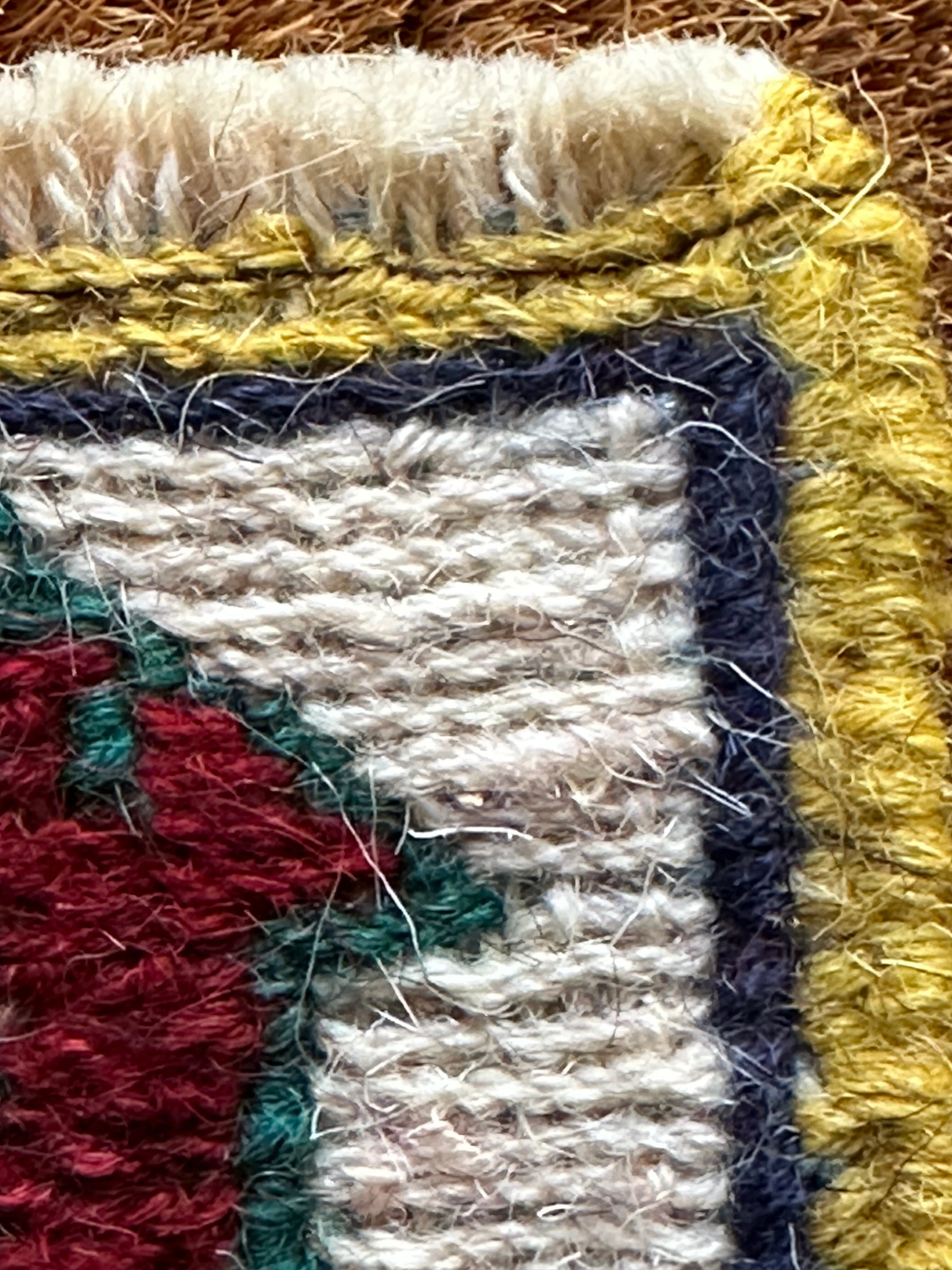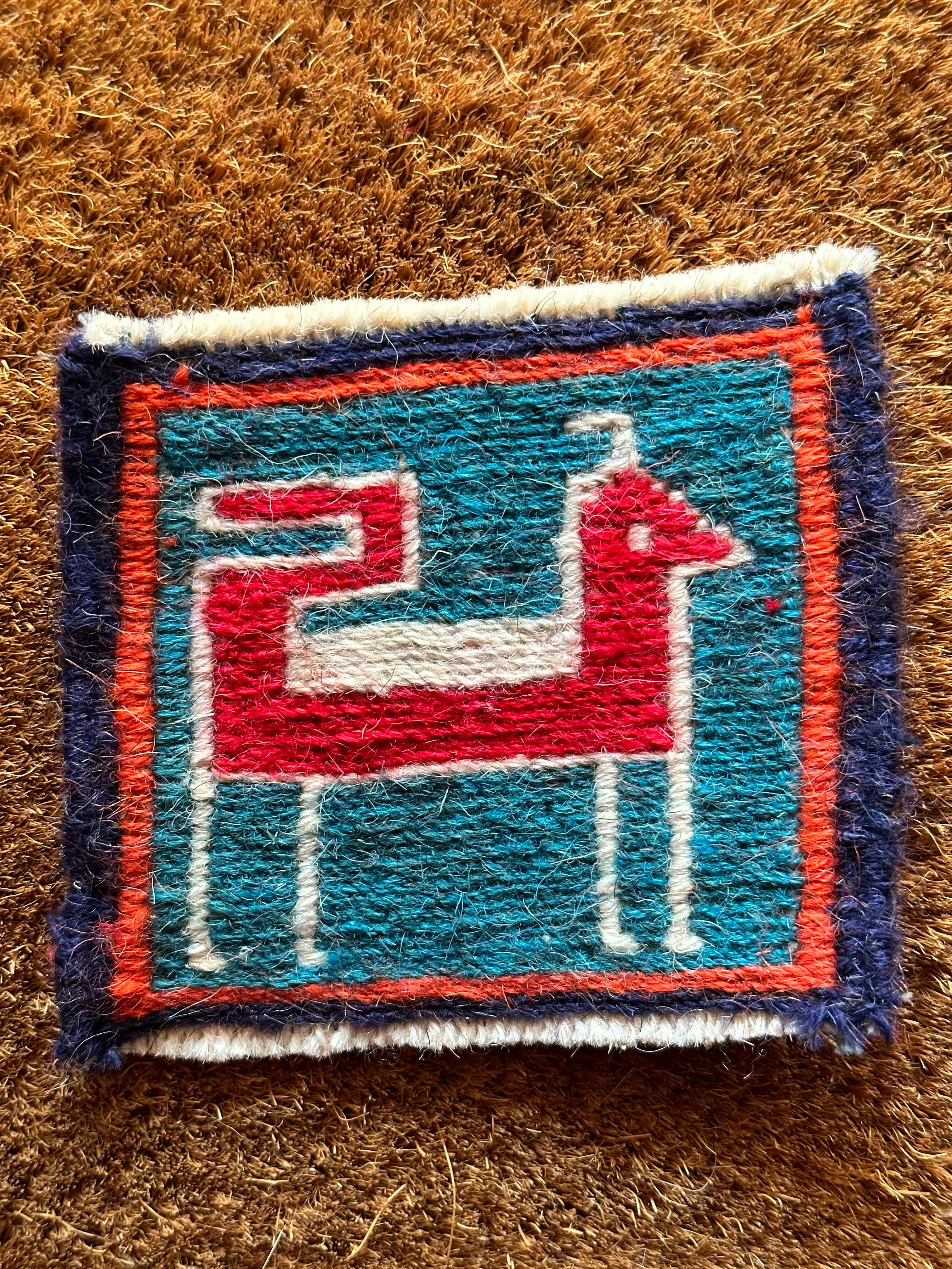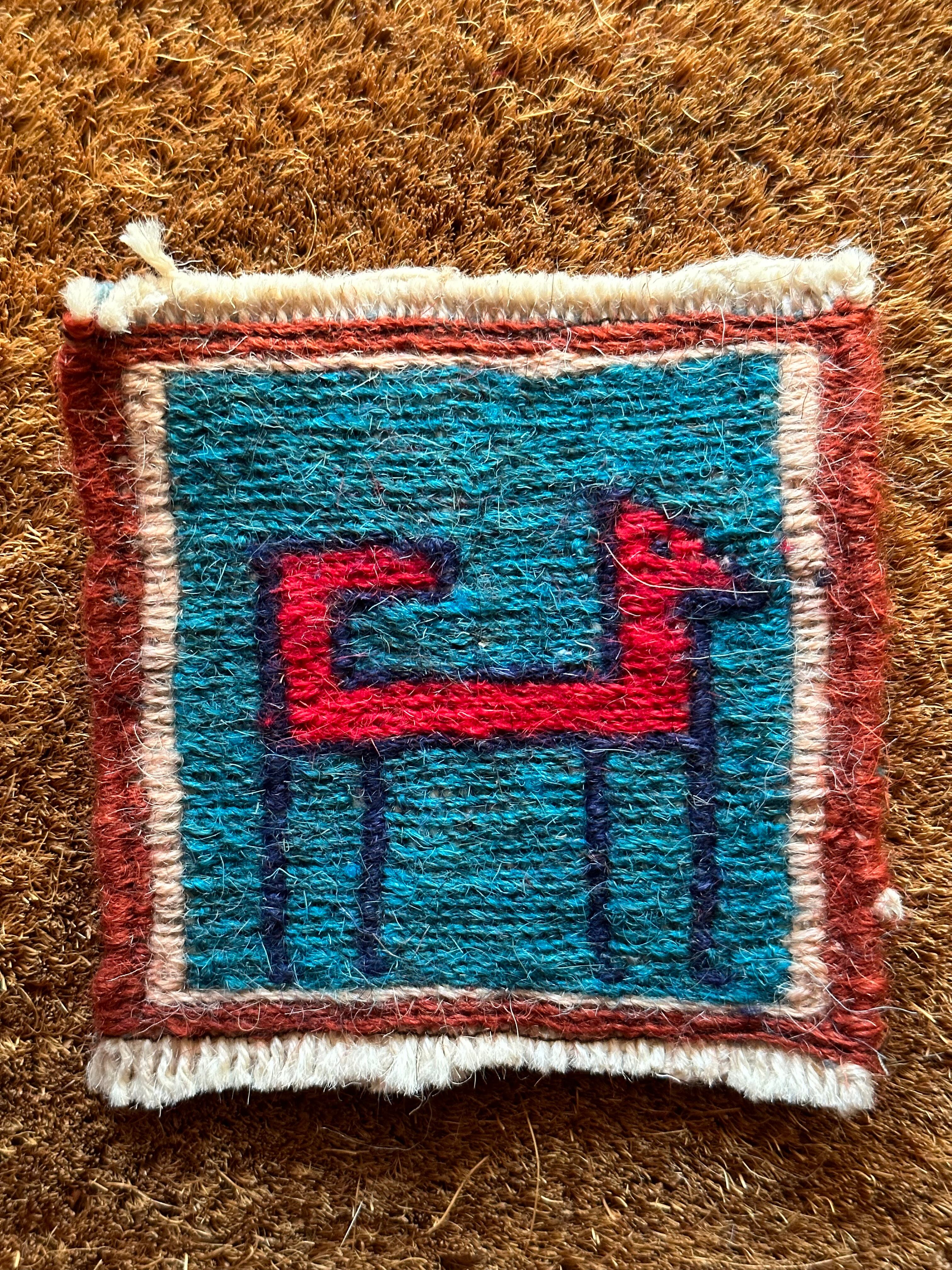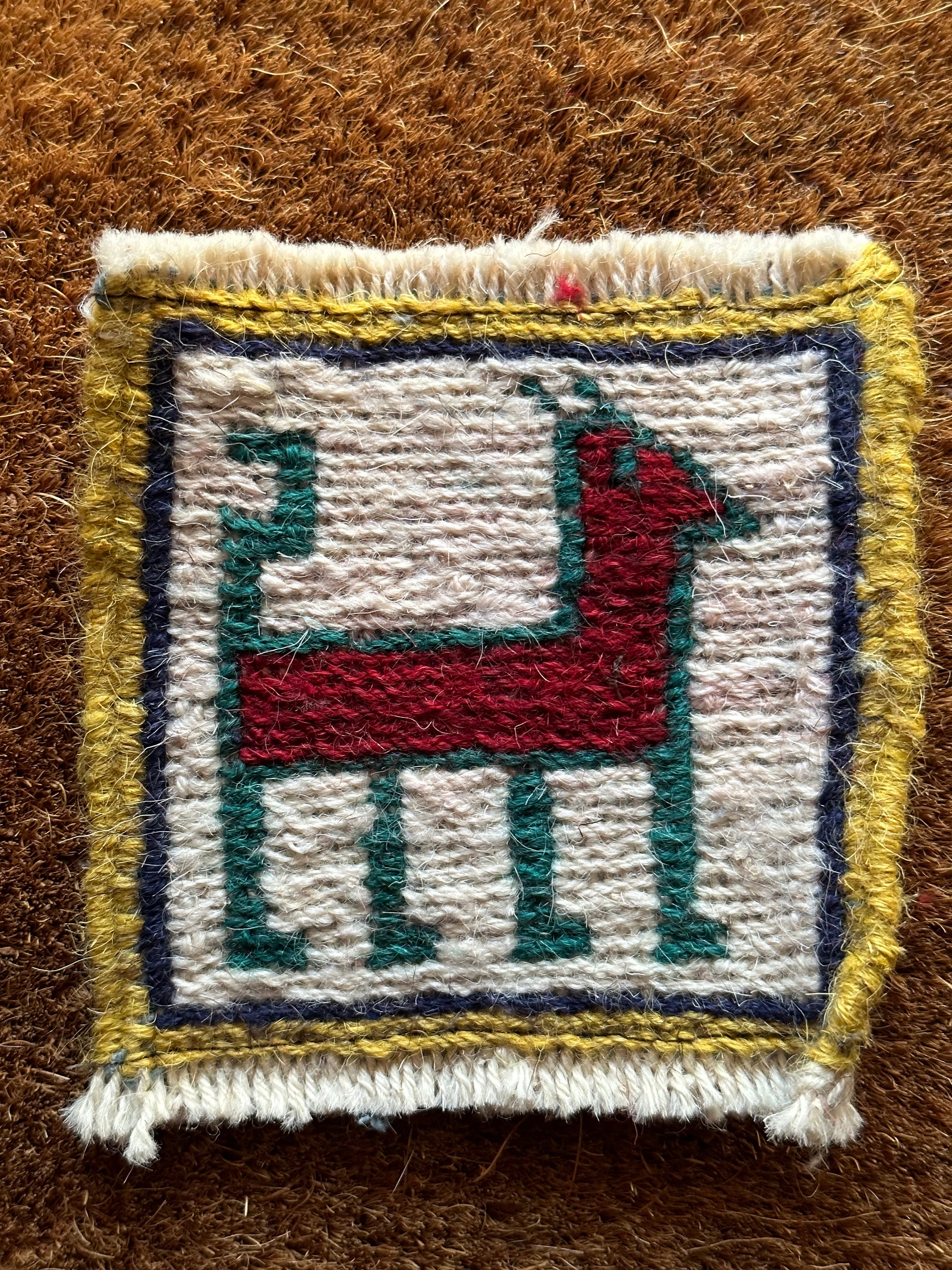 こちらはラクダや猫に鹿などが織り込まれた動物柄の5枚セットになり、製作段階では20枚綴りの帯状ですが、イラン現地にてカットとフリンジのほどけ防止のかがり縫いを施してあり、本来のスマック織りならではの裏面のムダ毛もカットしています。