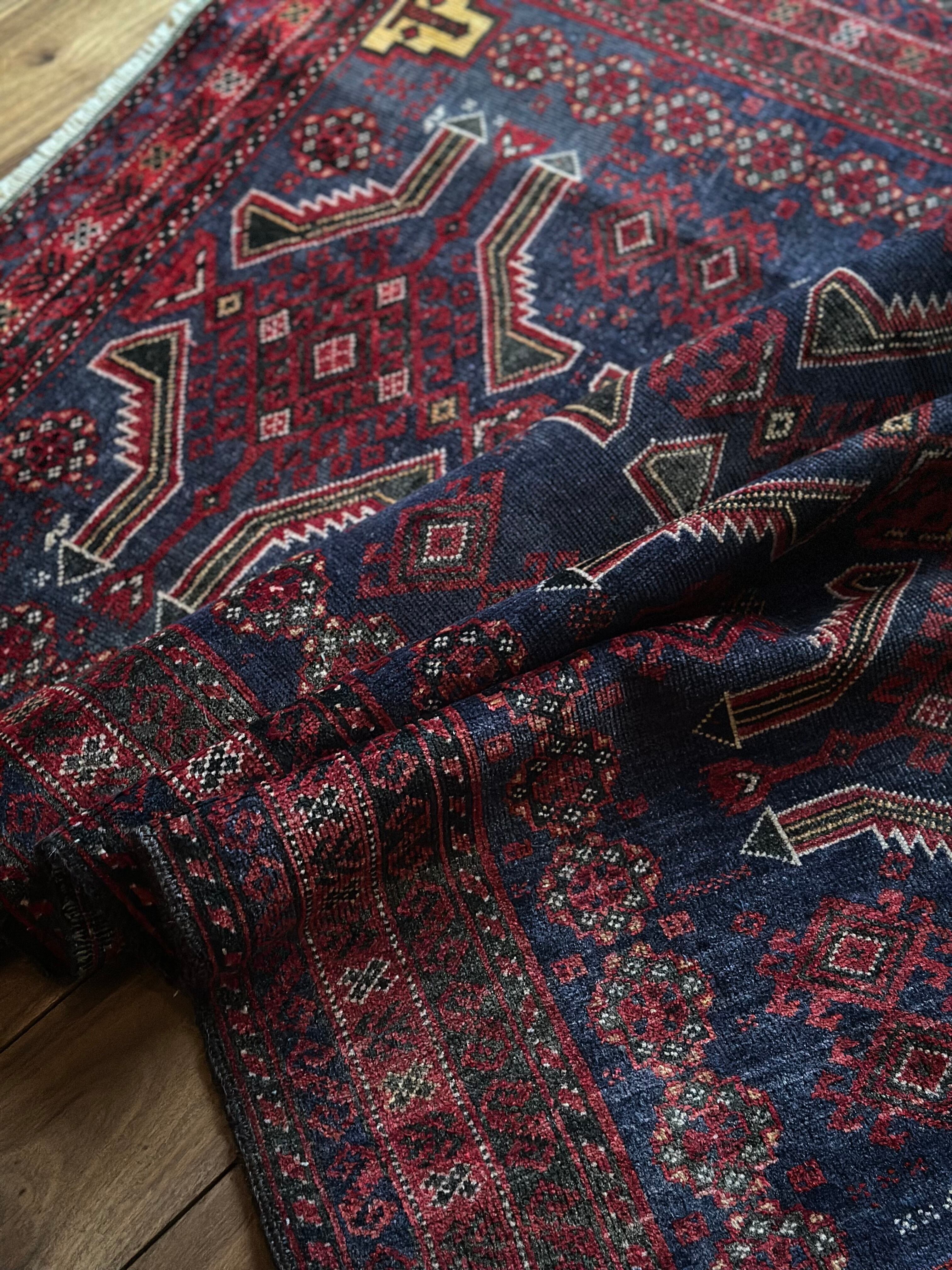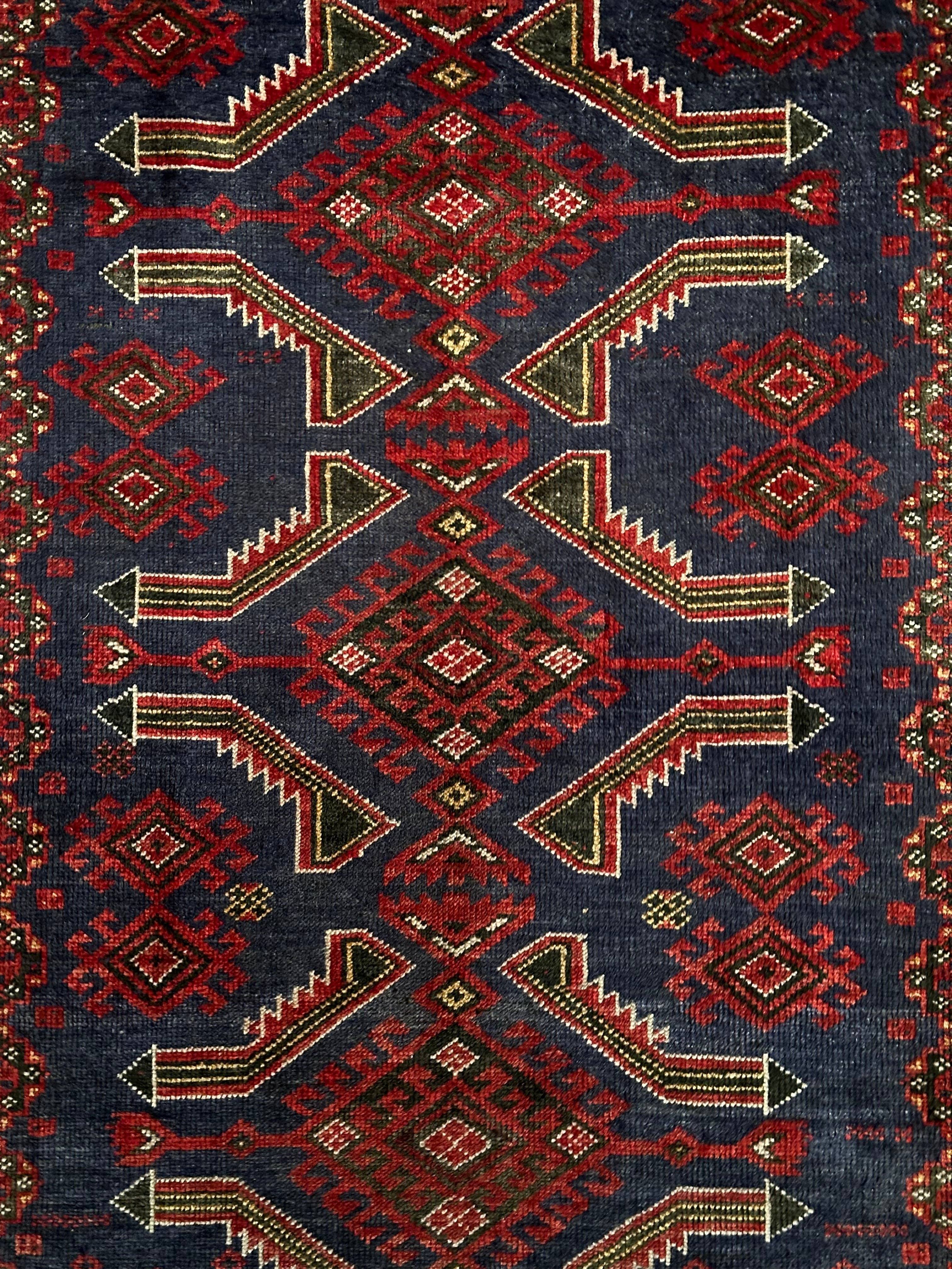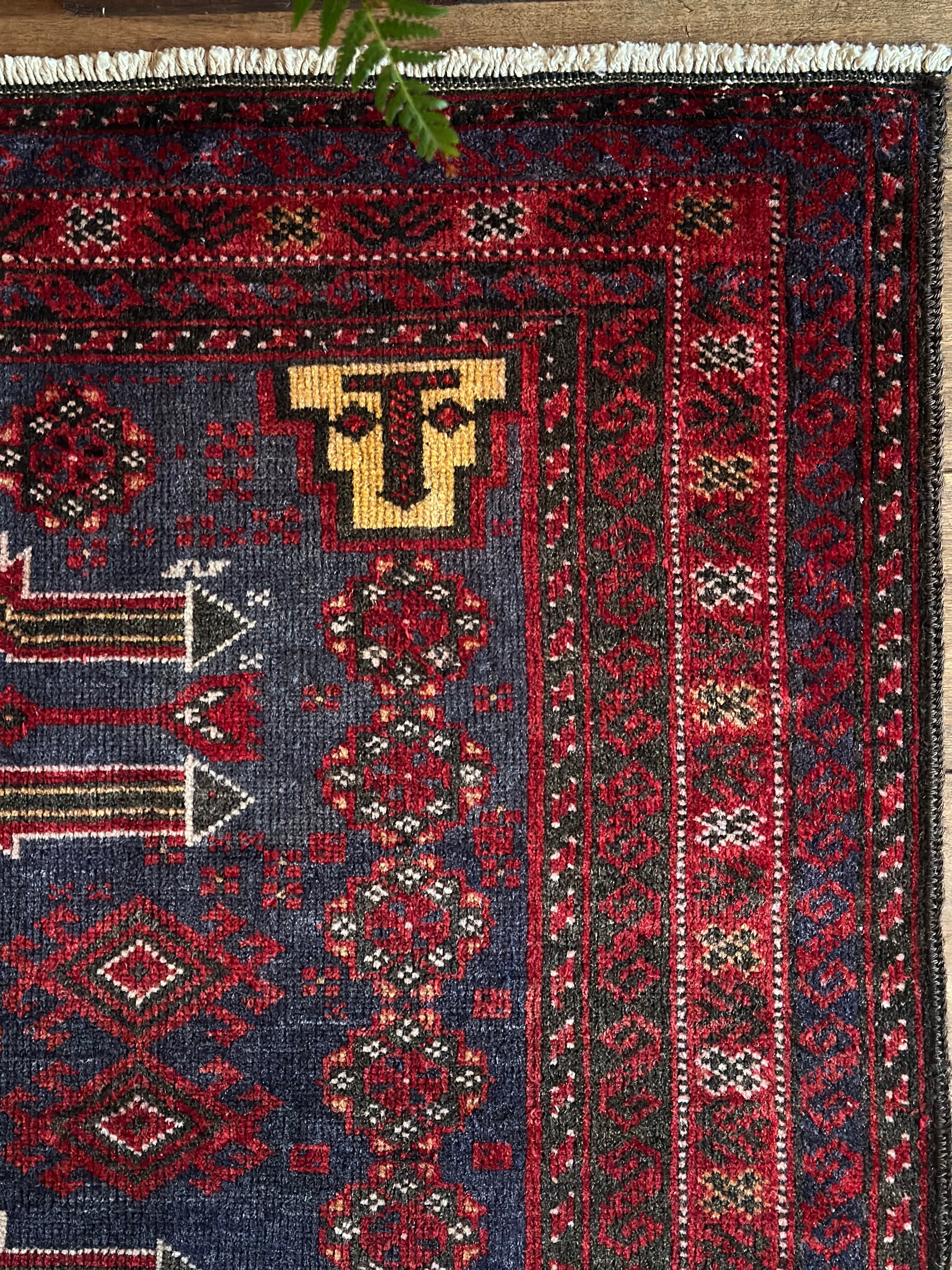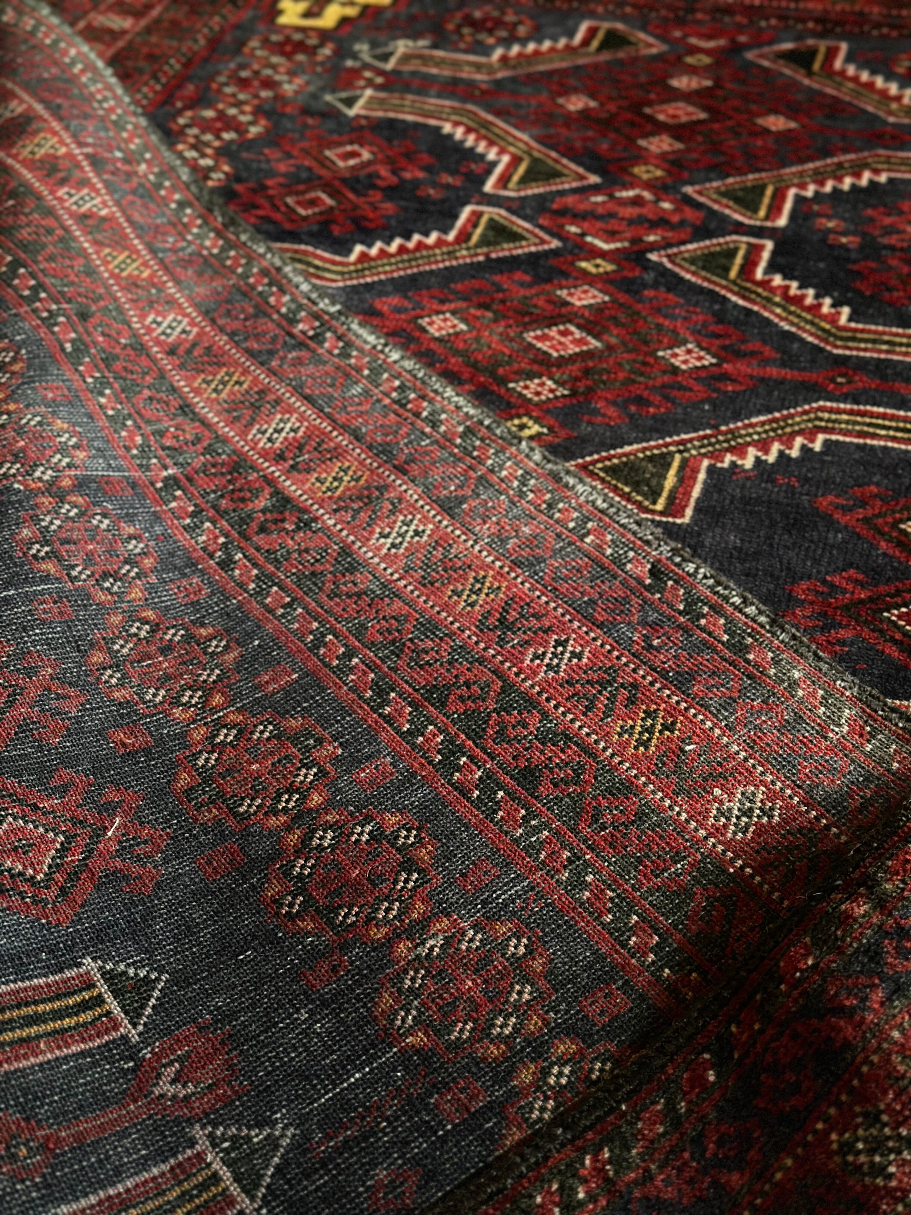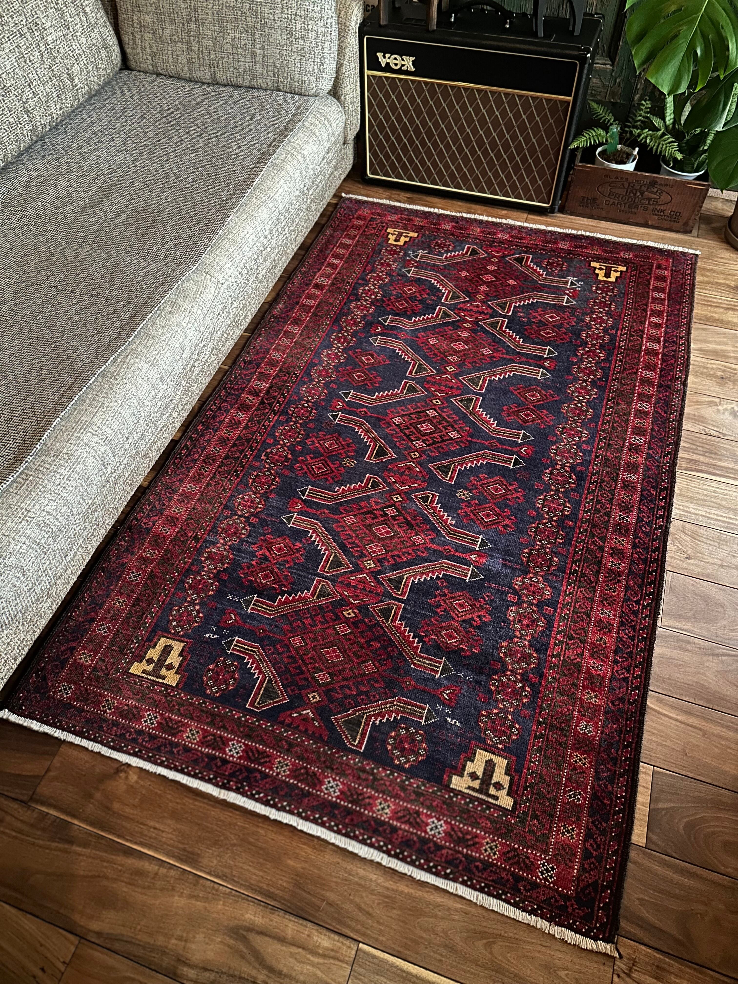 年代物ならではの擦れたネイビーに褐色がかったボルドーな赤が渋さを感じさせてくれるバルーチ族のトライバルラグにならます。