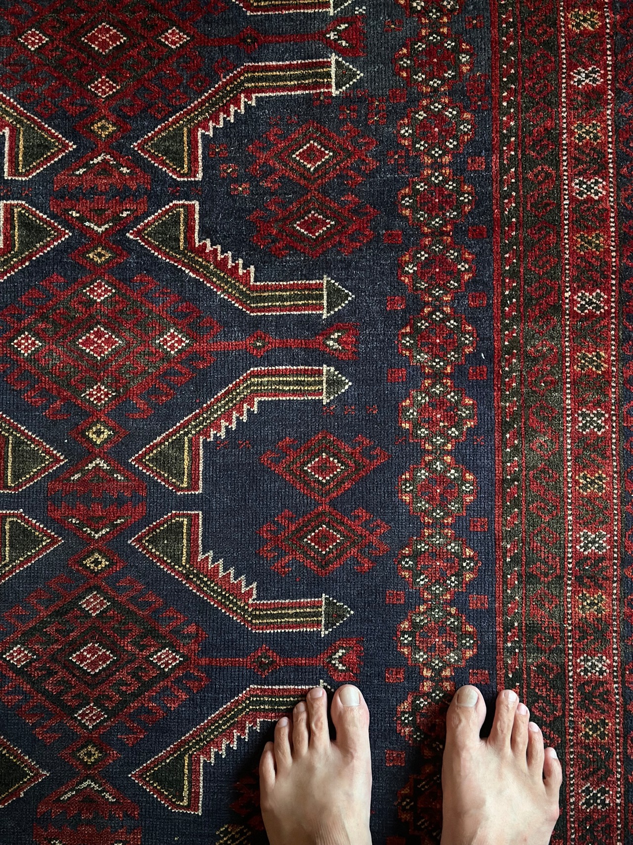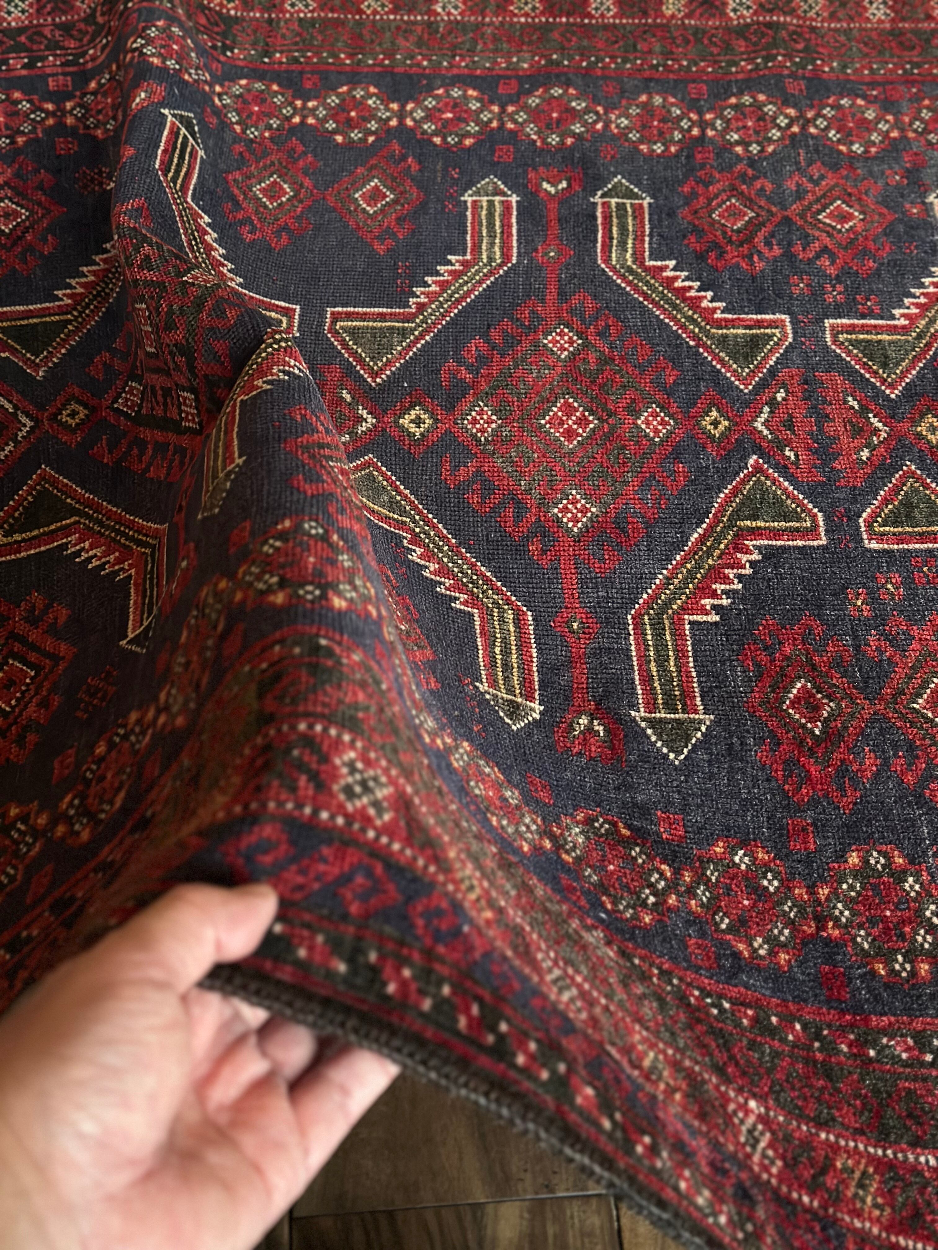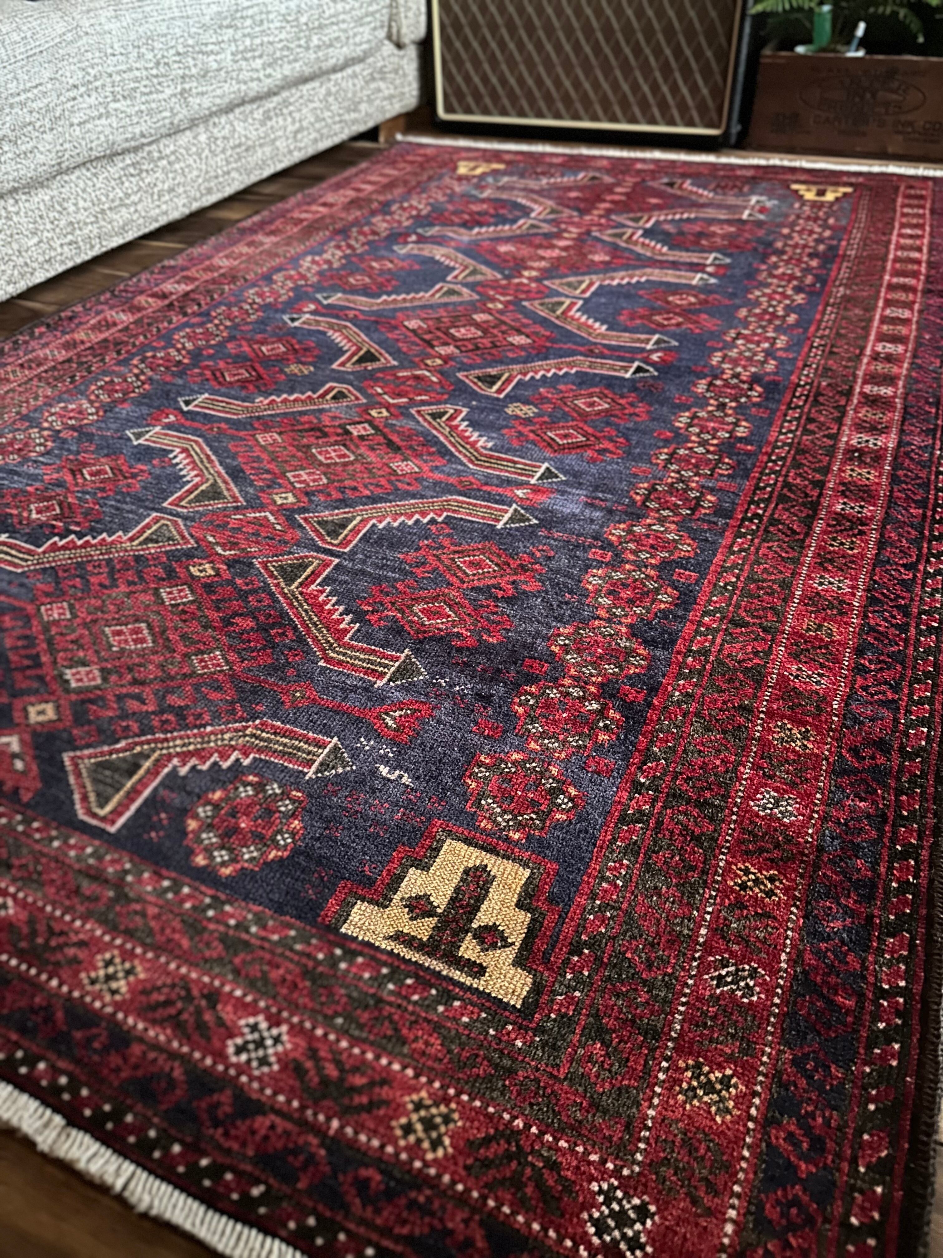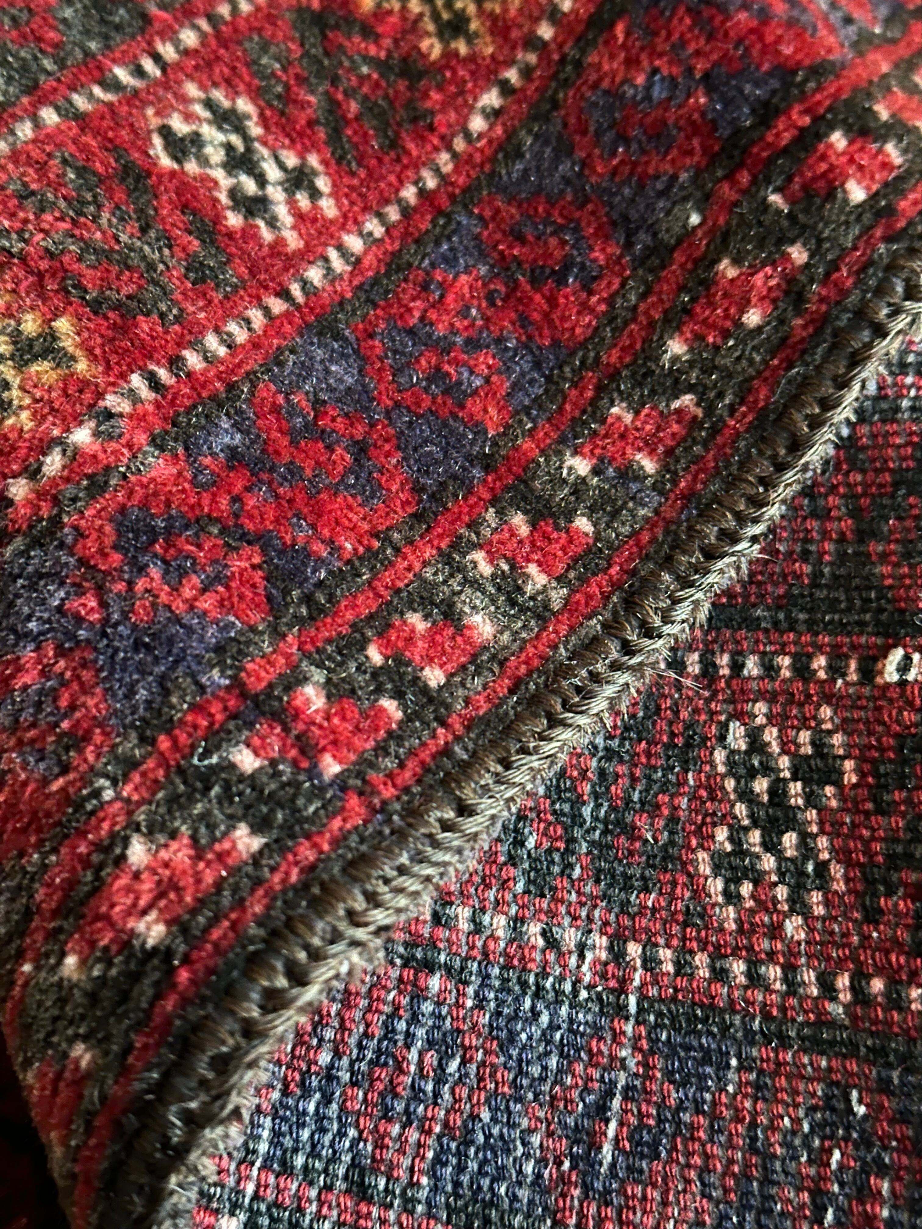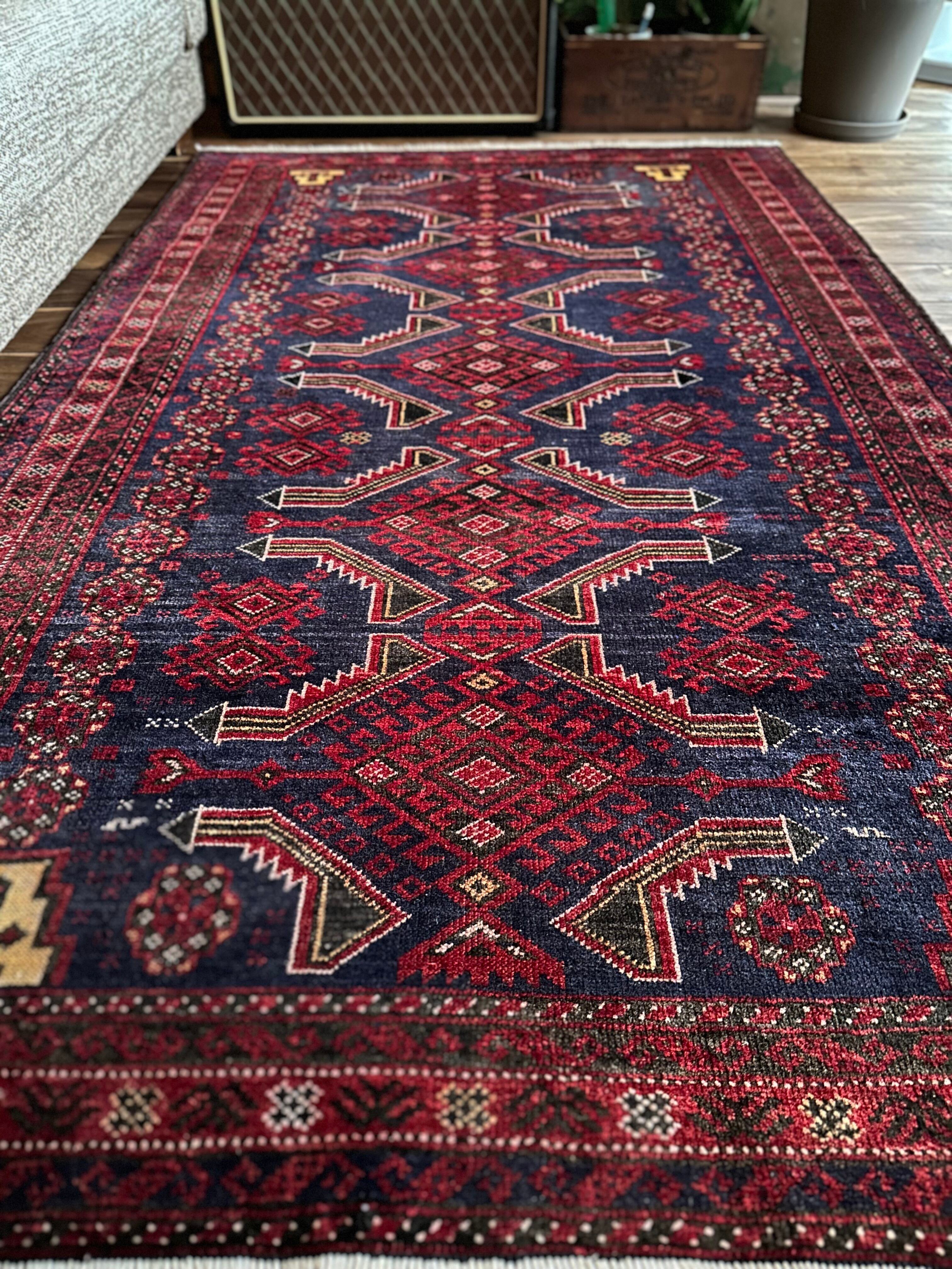 年代物ならではの擦れたネイビーに褐色がかったボルドーな赤が渋さを感じさせてくれるバルーチ族のトライバルラグにならます。