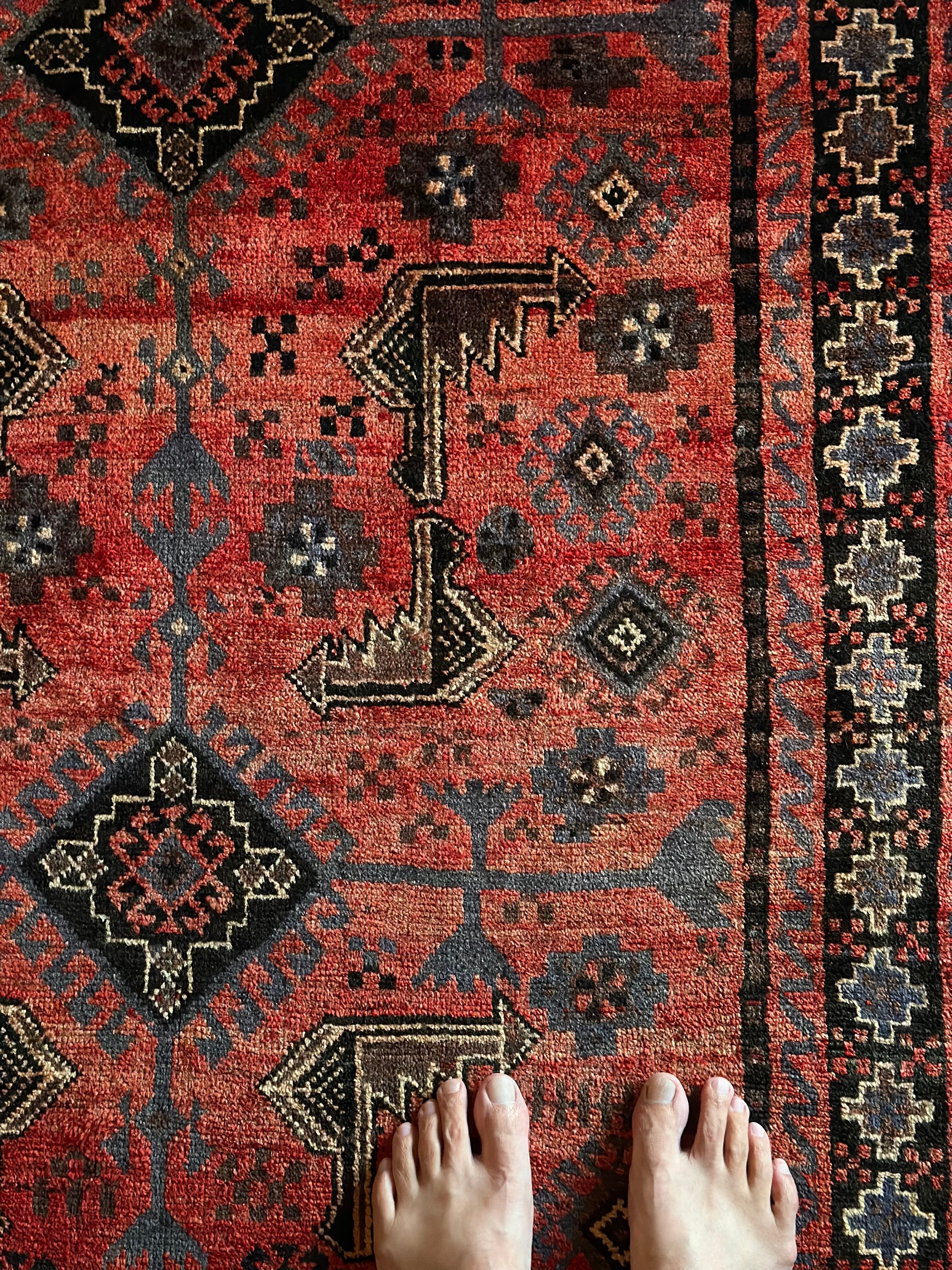 経年70年と思しきこちらは年代物の割に肉厚なのは言うまでもなくパイルの毛足もほど良く残っていて、大きさ的にもリビングのソファ前やベッドサイドにうってつけかと。また特に目立つダメージや気になるリペアも見あたらないグッドコンディションで、全体的な雰囲気は下記URLの Instagramにて最後の動画(室内での自然光にて撮影)を参照して下さい。
