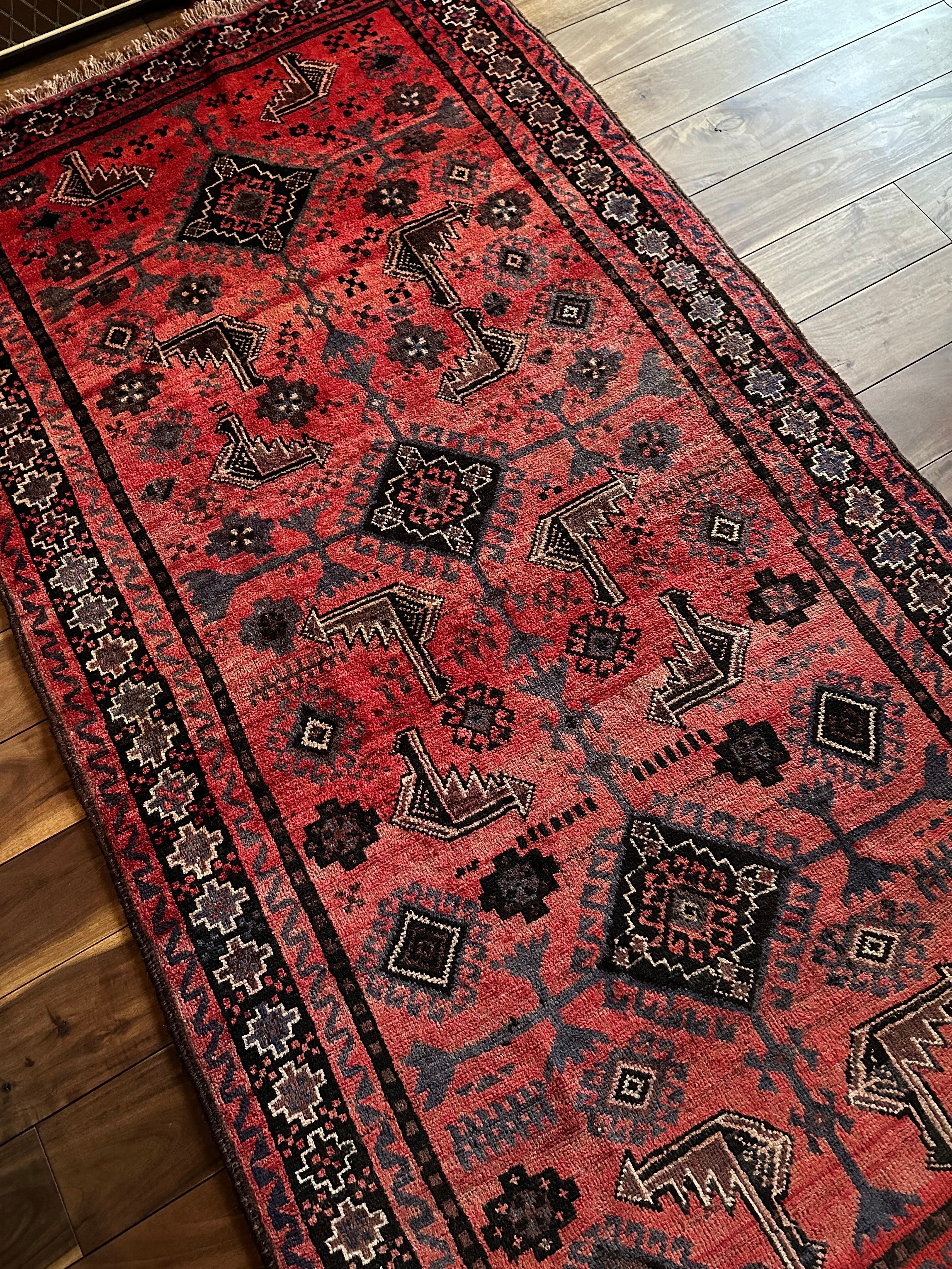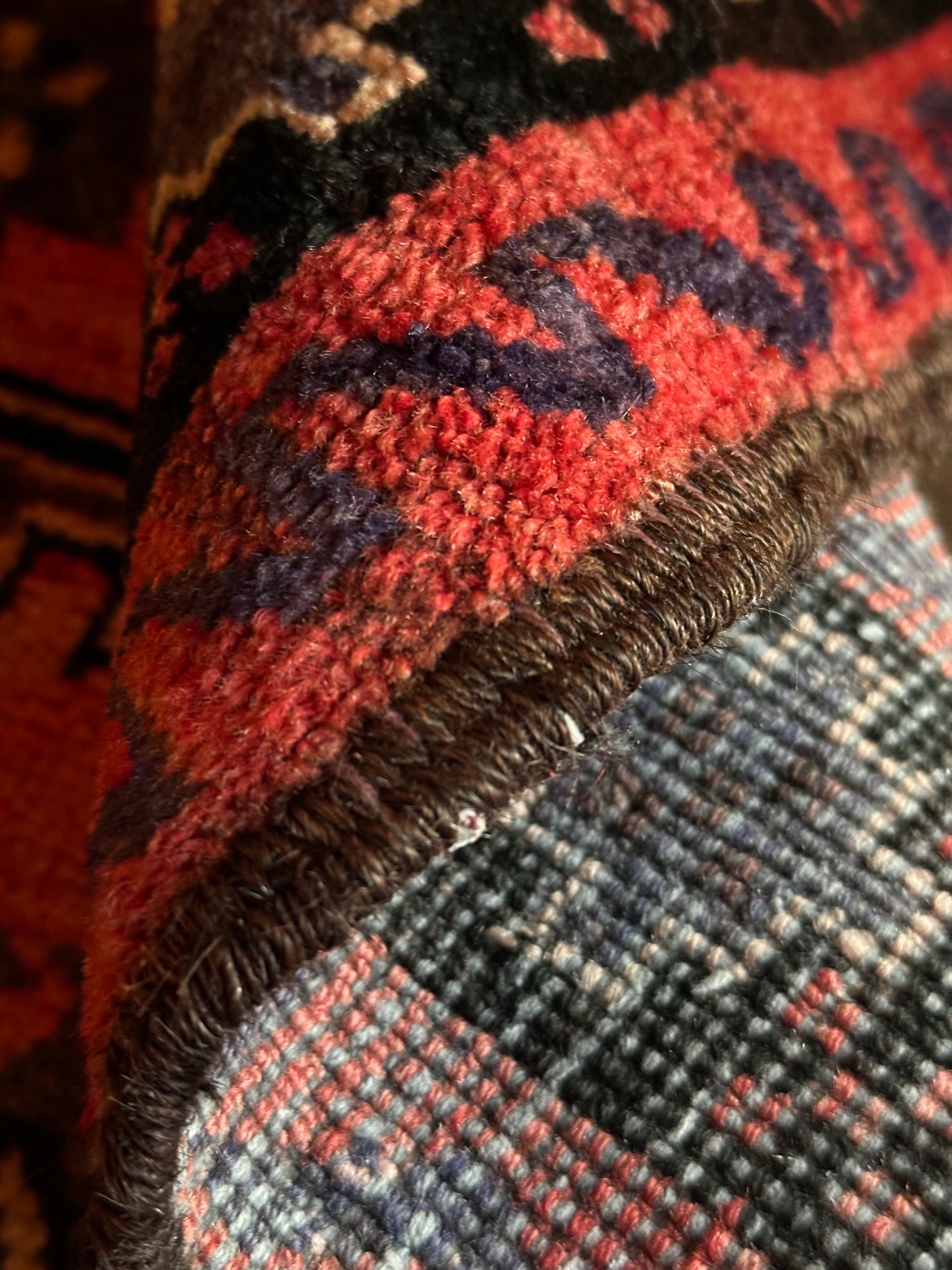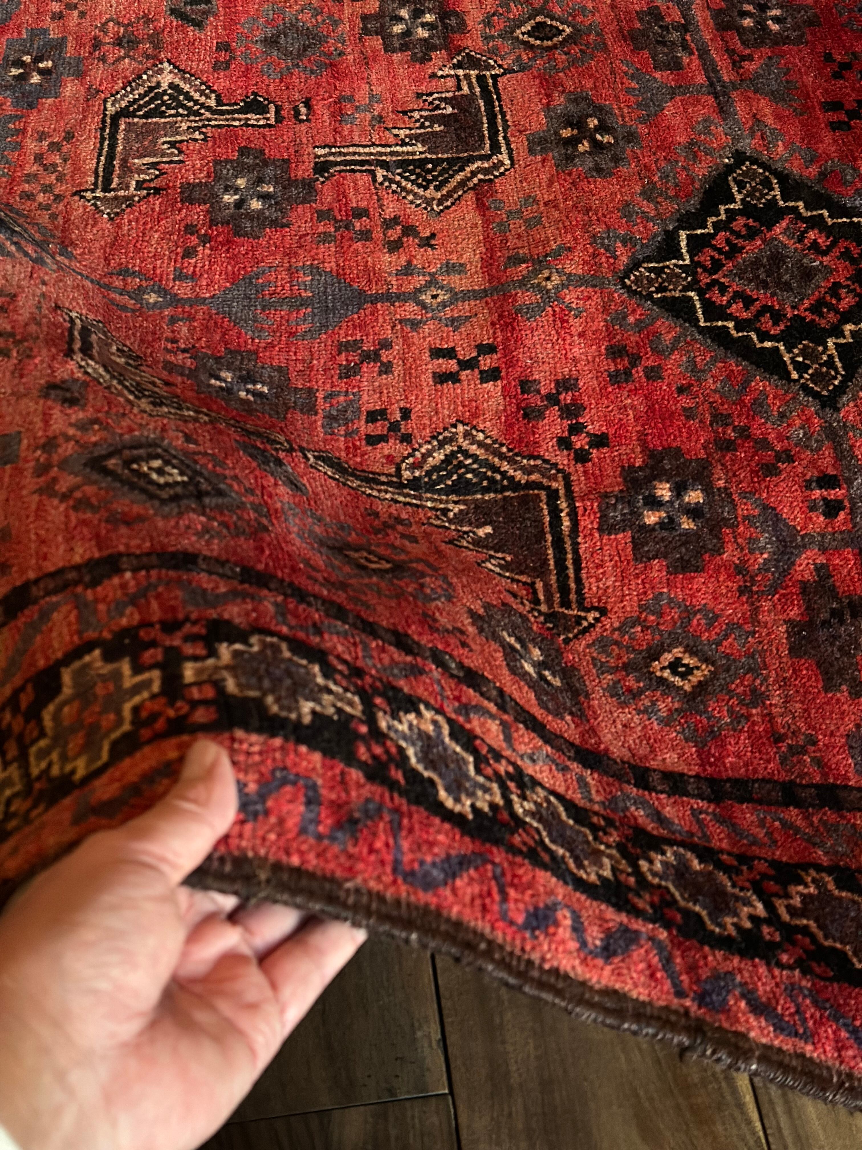 経年変化が見せる色褪せた真紅に濃淡な風合いのアブラッシュが芸術的なセミアンティークのバルーチ族トライバルラグになります。