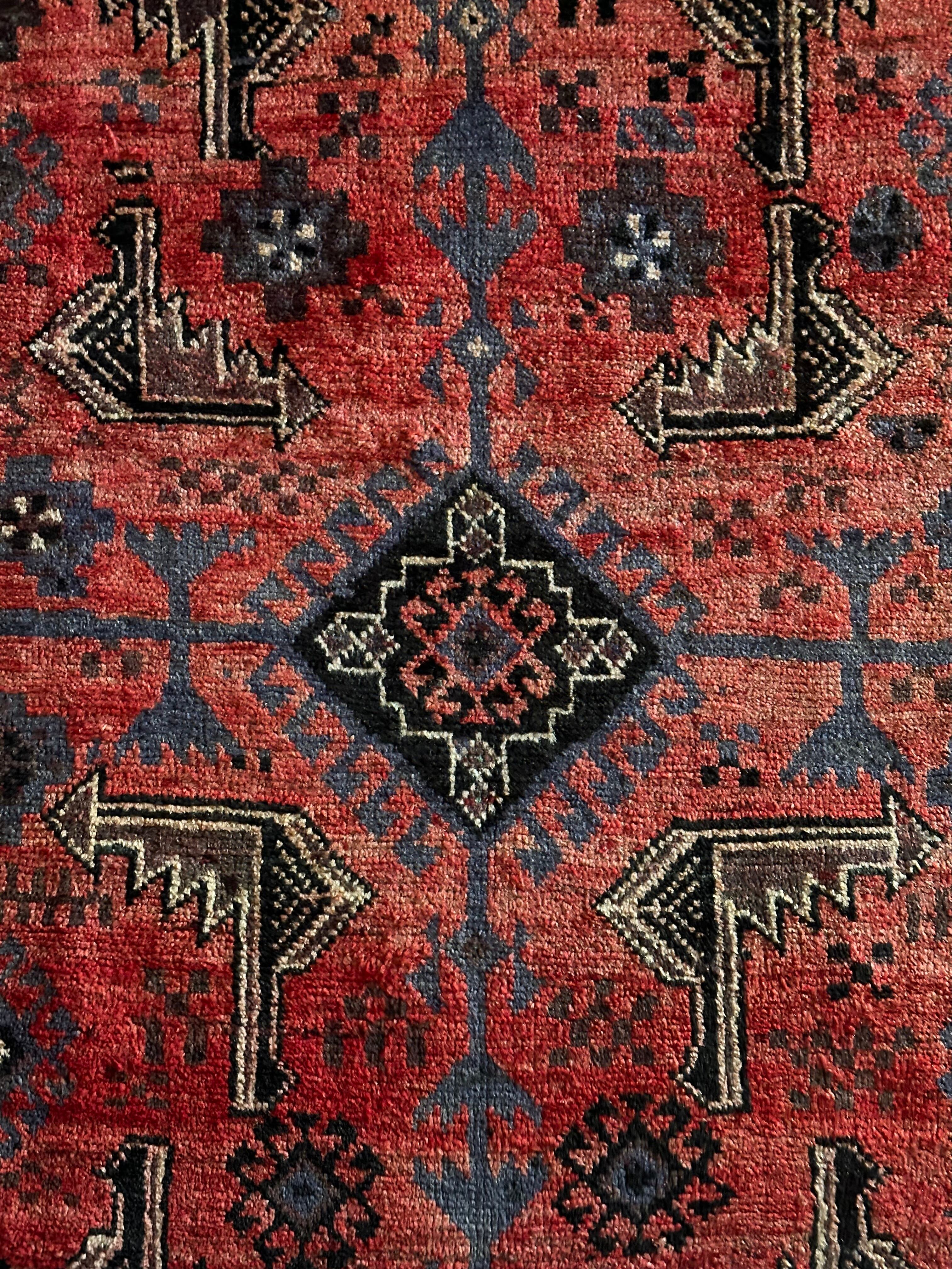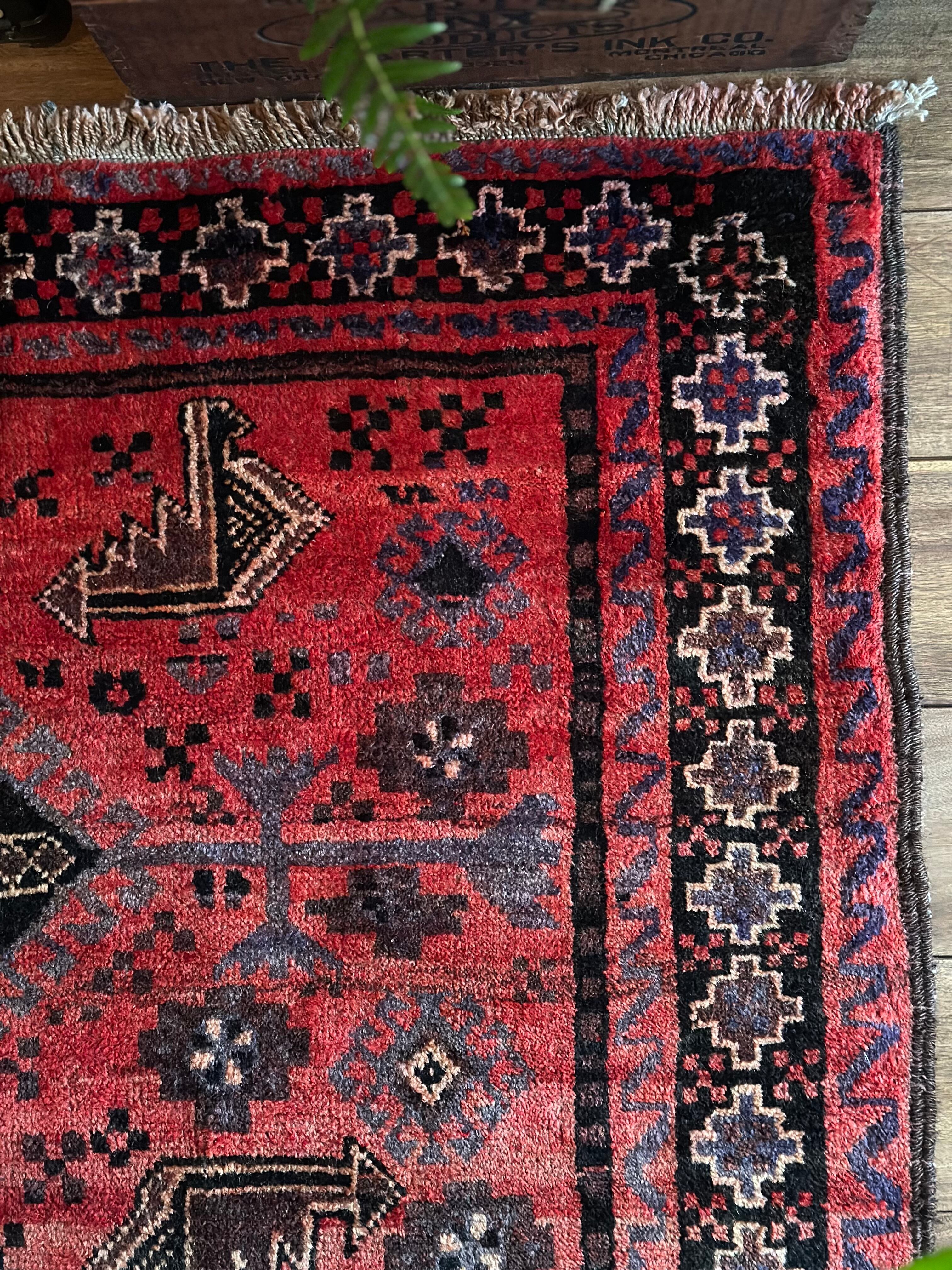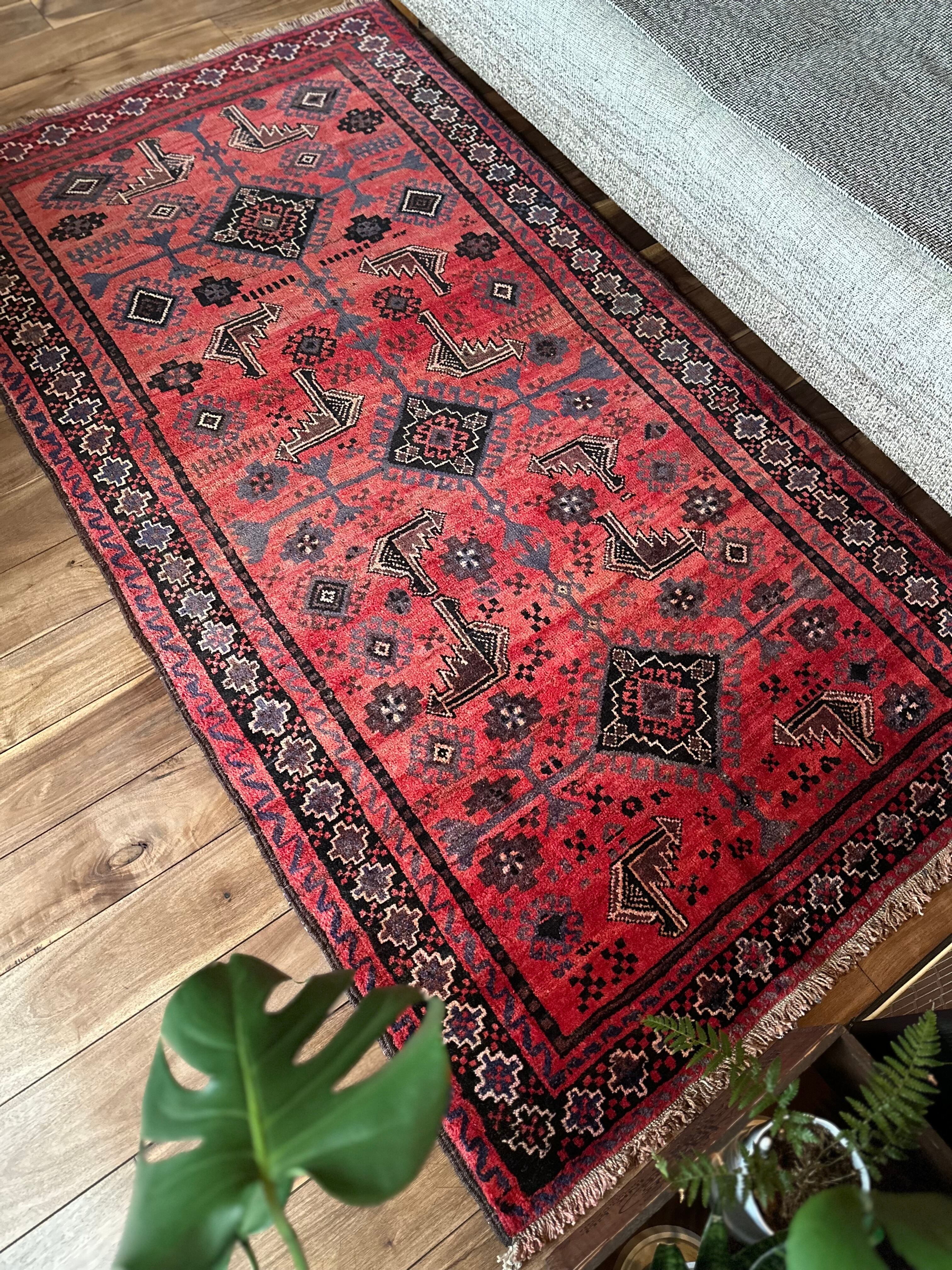 経年変化が見せる色褪せた真紅に濃淡な風合いのアブラッシュが芸術的なセミアンティークのバルーチ族トライバルラグになります。