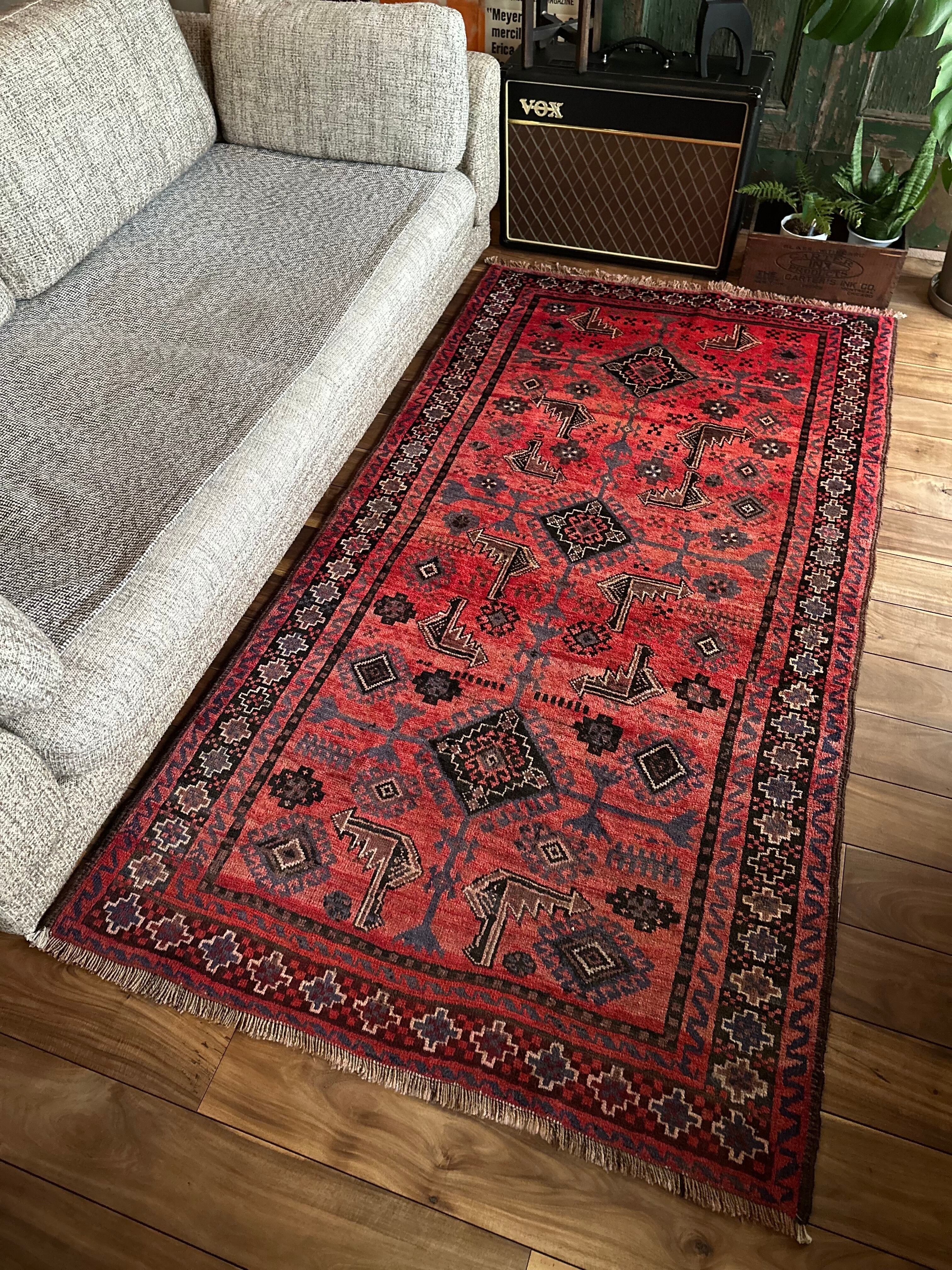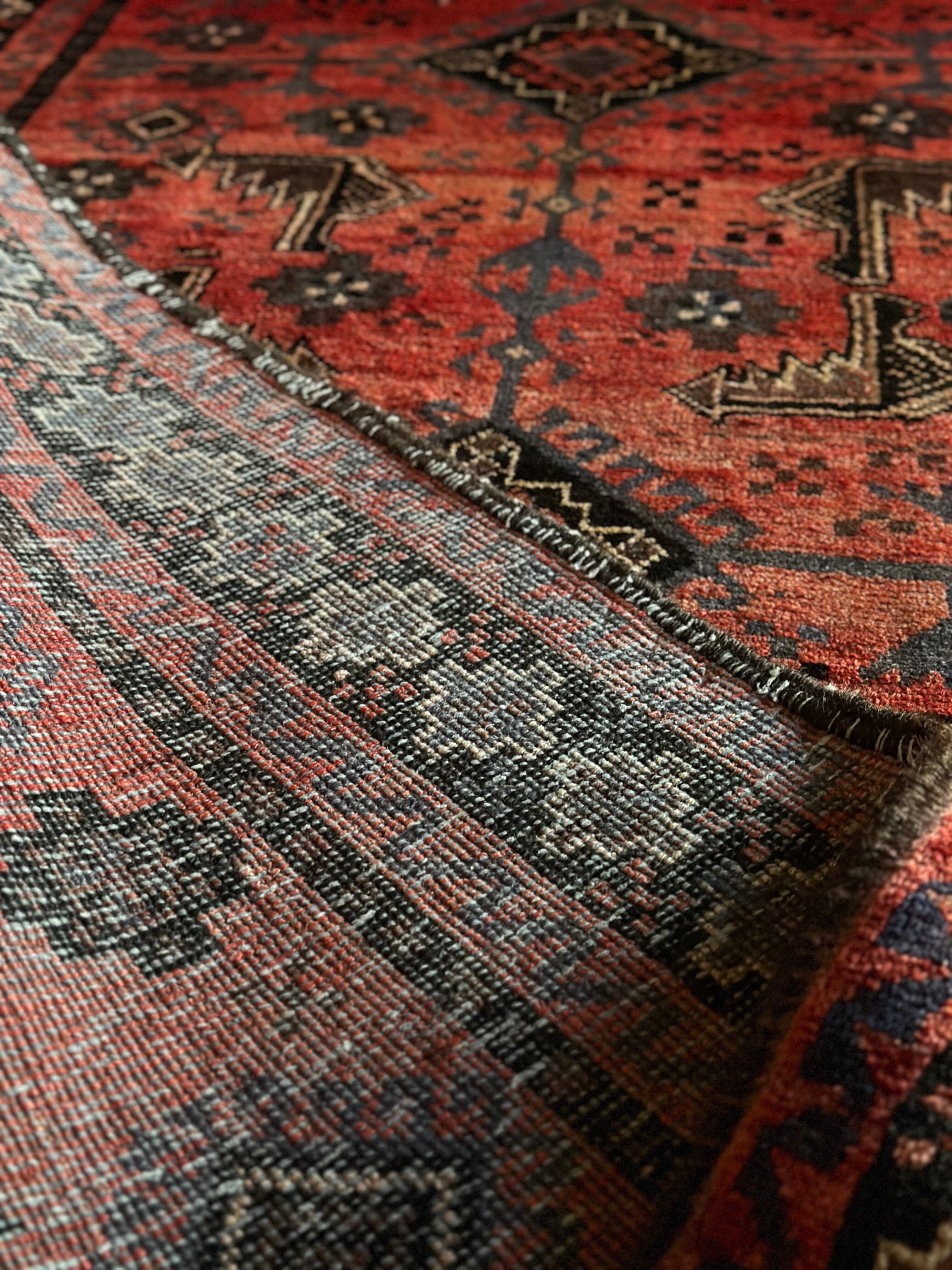 またラグそのものに関しては羊毛特有の匂いがあり、手織りならではの歪みに水洗いクリーニングによる縮み、また草木染めによる経年劣化の色ムラなどがありますが、それもまたヴィンテージラグの魅力かとご理解ください。
