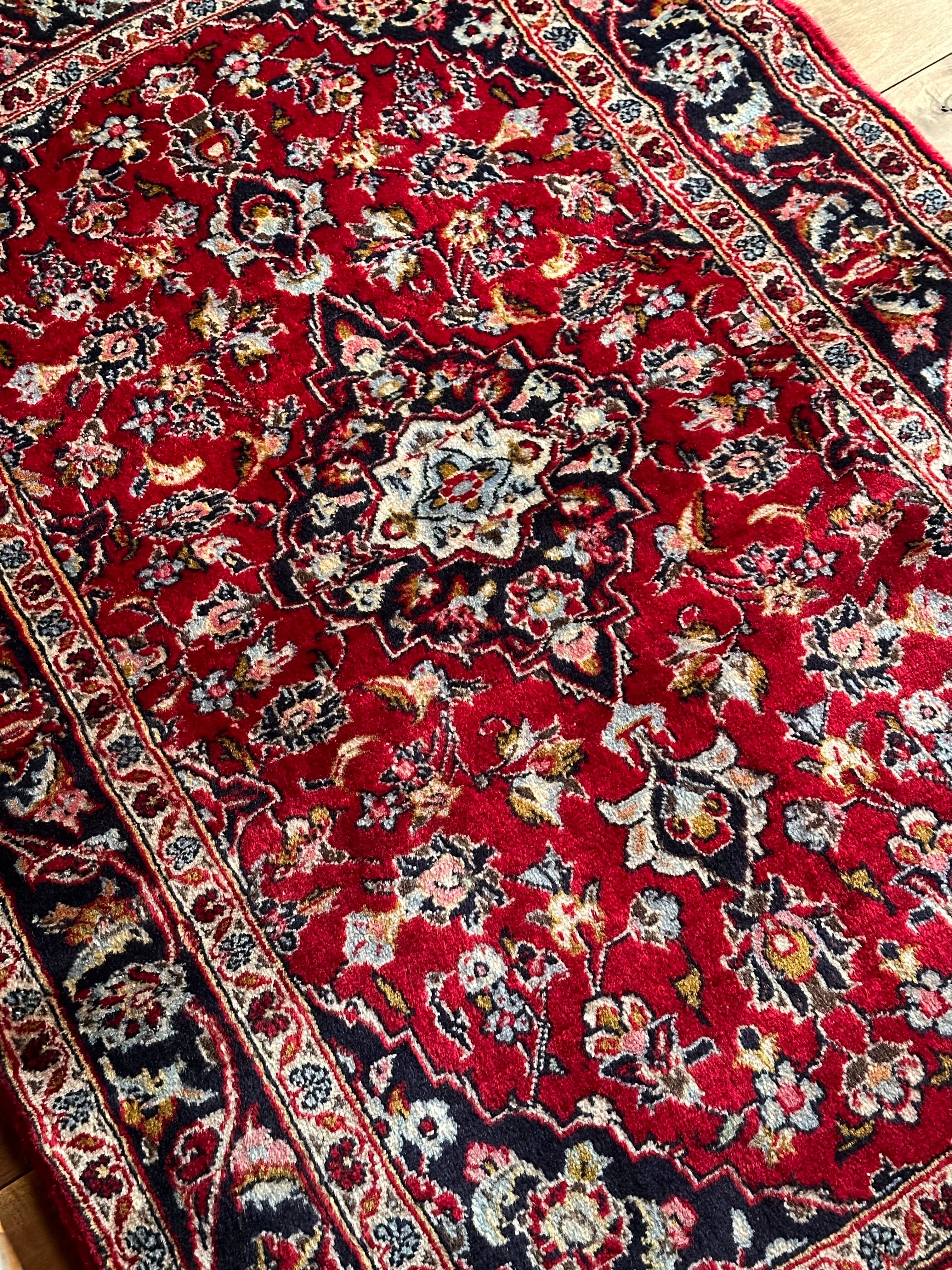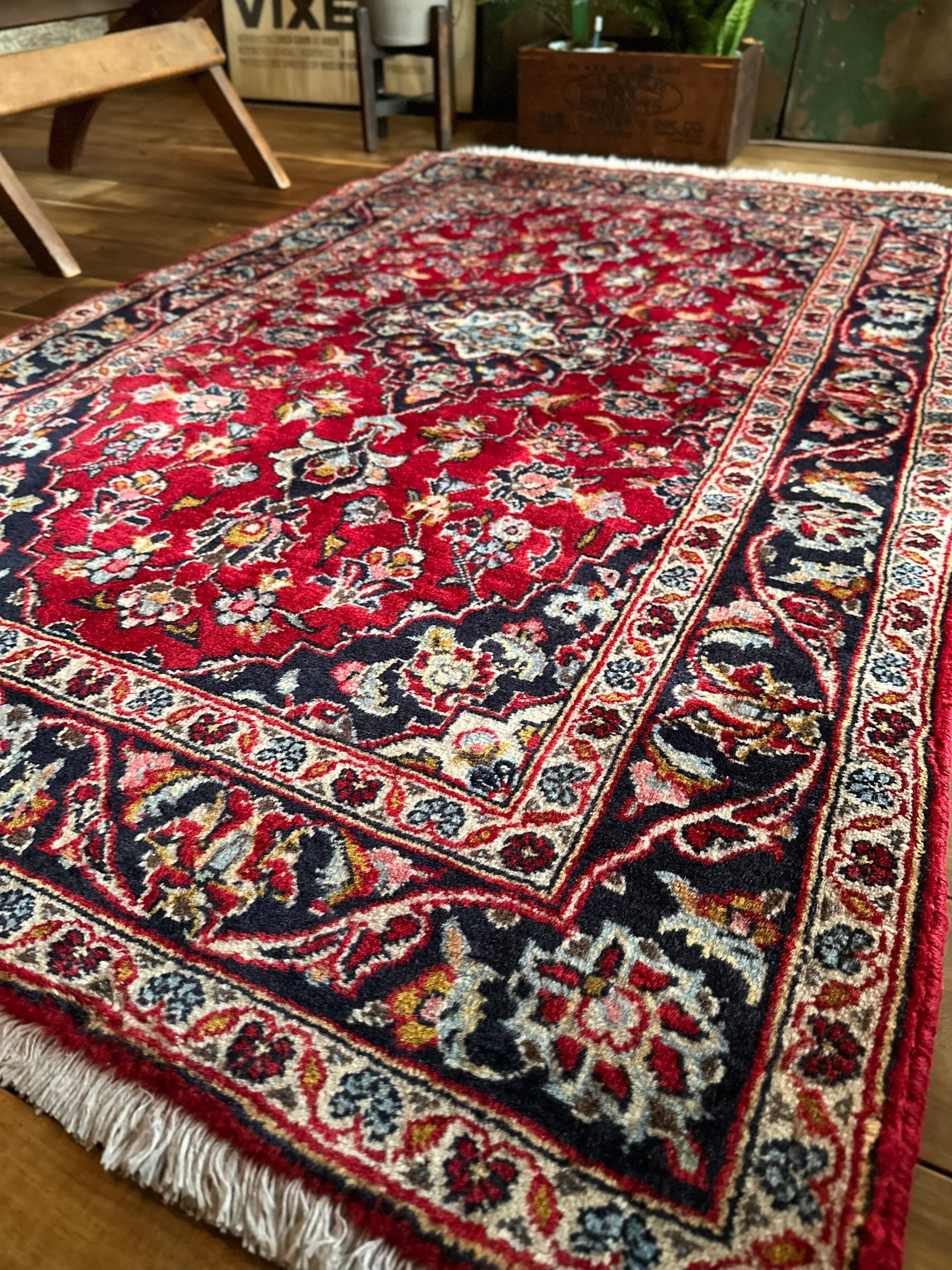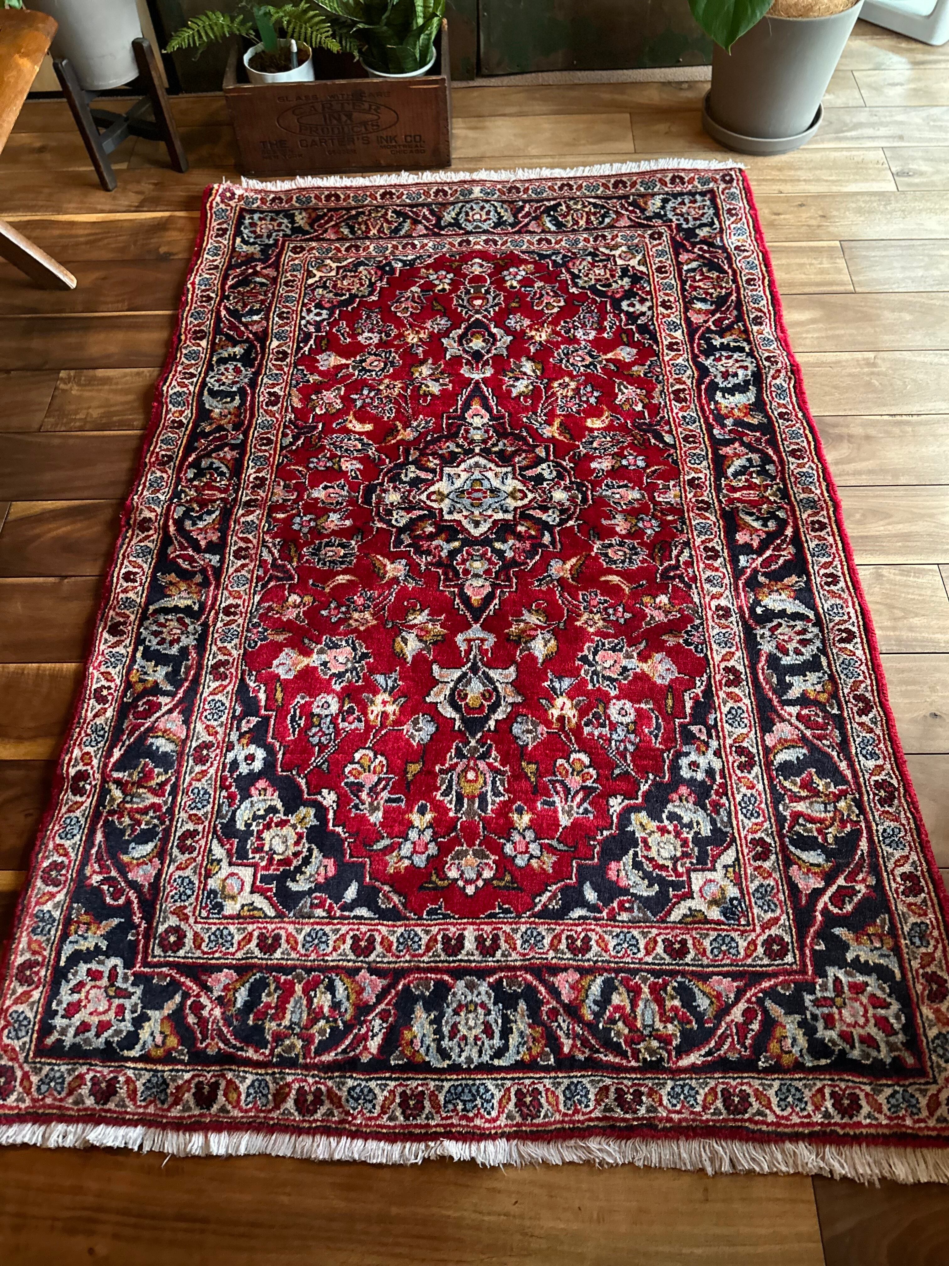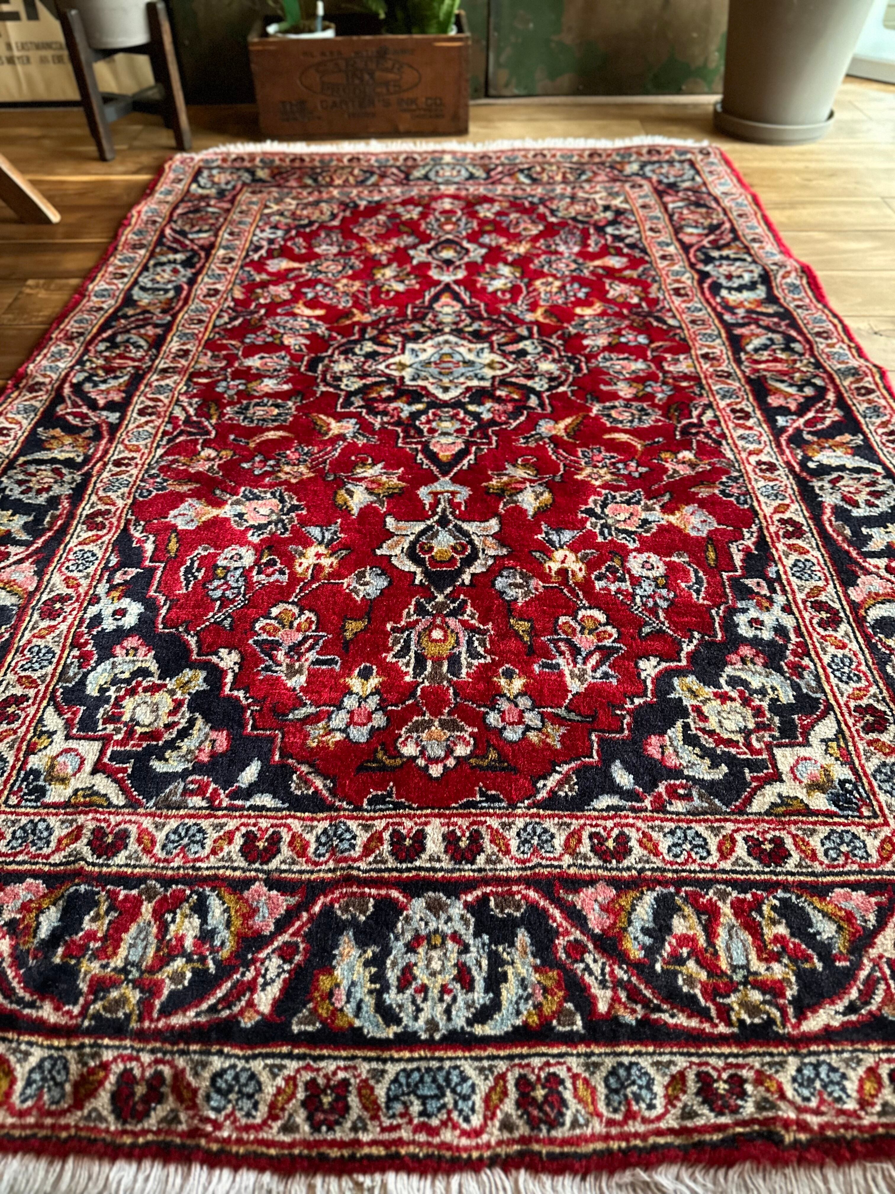 中央のメダリオンに四隅を分割したメダリオンが取り囲む得意なスタイルで、フィールドの赤を引き立てるようにボーダー部分に暗めのネイビーを持ってくるのがカーシャーン独特のスタイルでしょうか。大概は2〜3メートルの大きなサイズが殆どですが、こちら中振なサイズ感でドレッサーや姿見鏡の足元にも使い勝手の良い1枚になります。