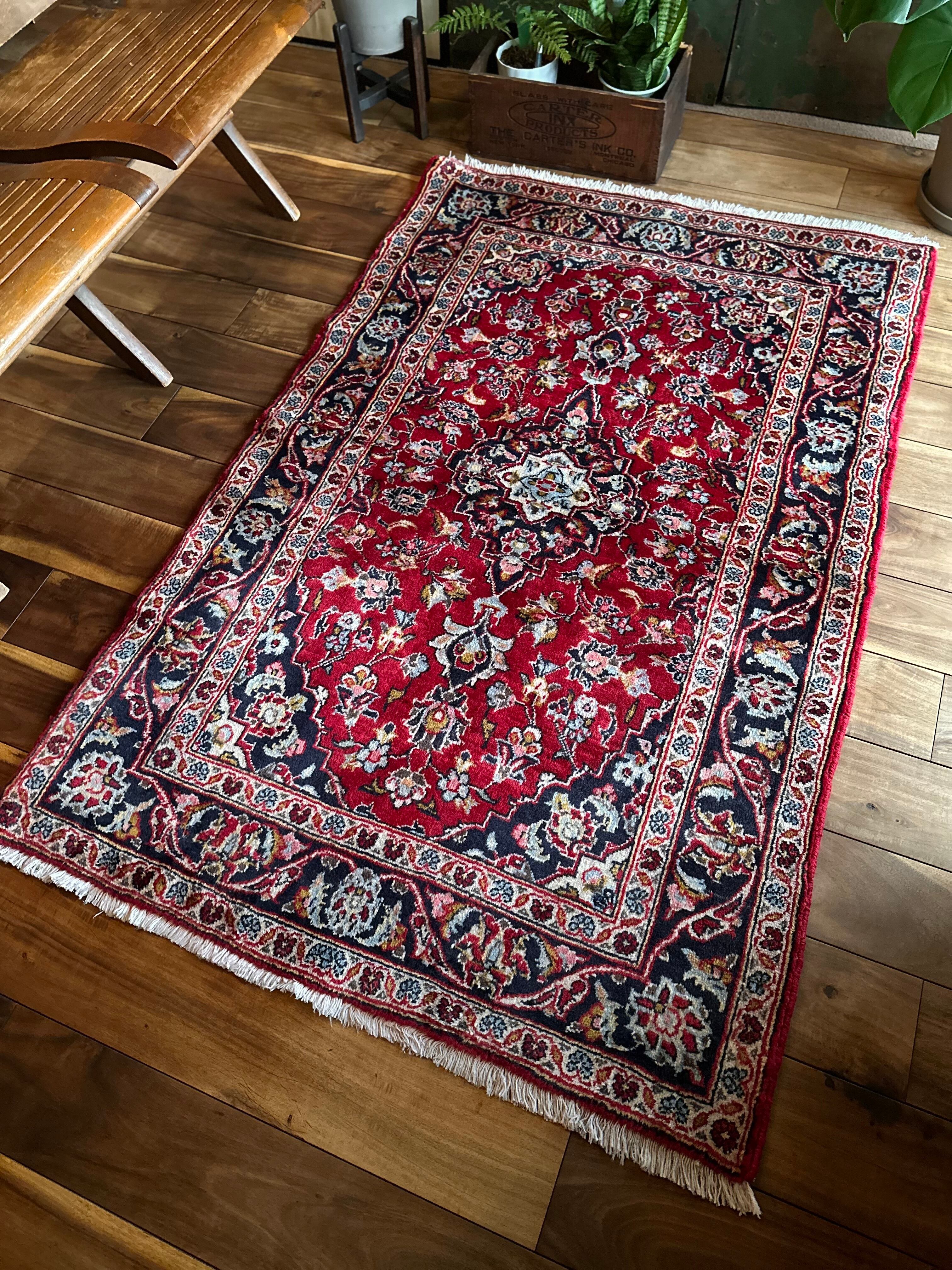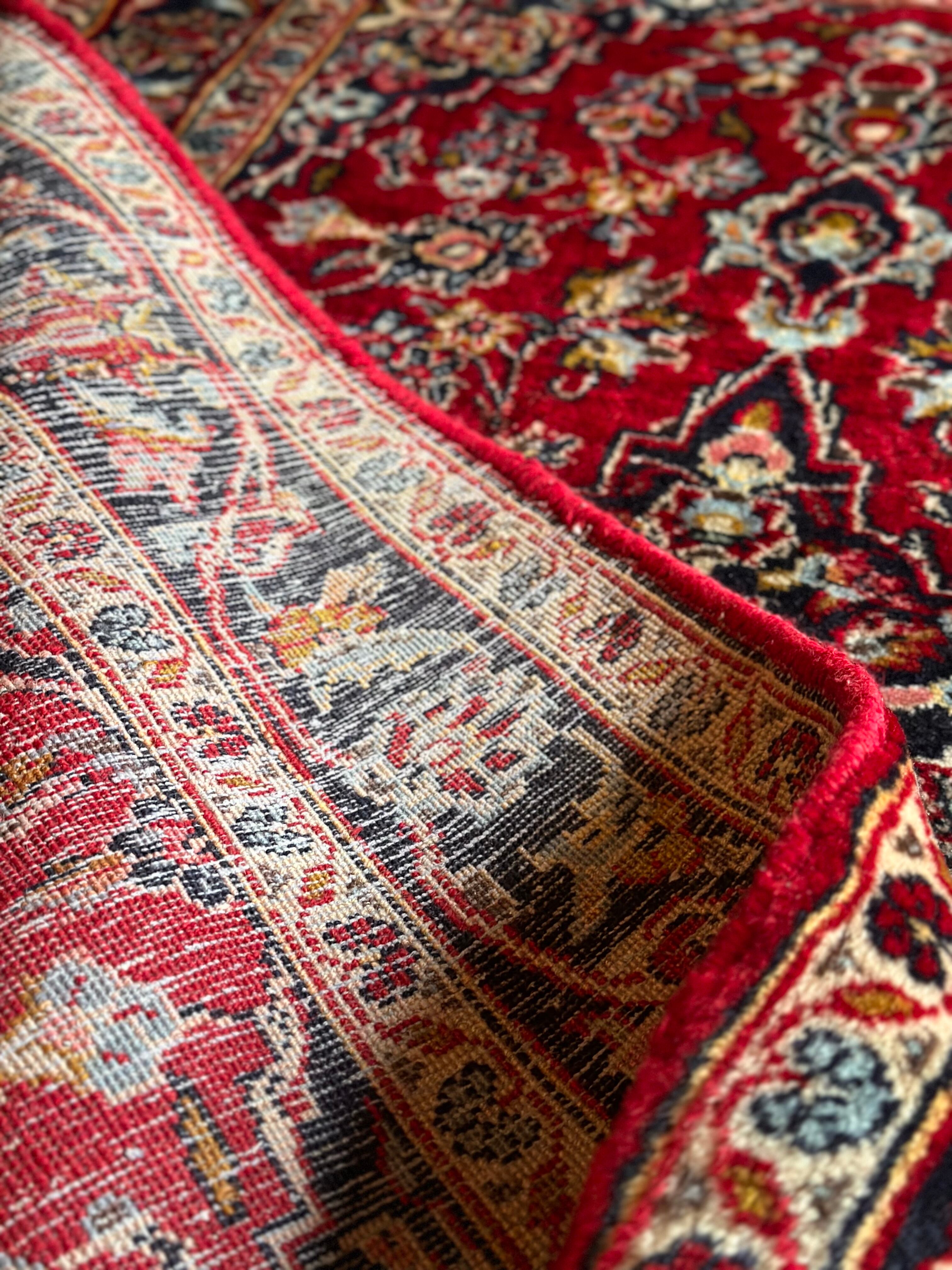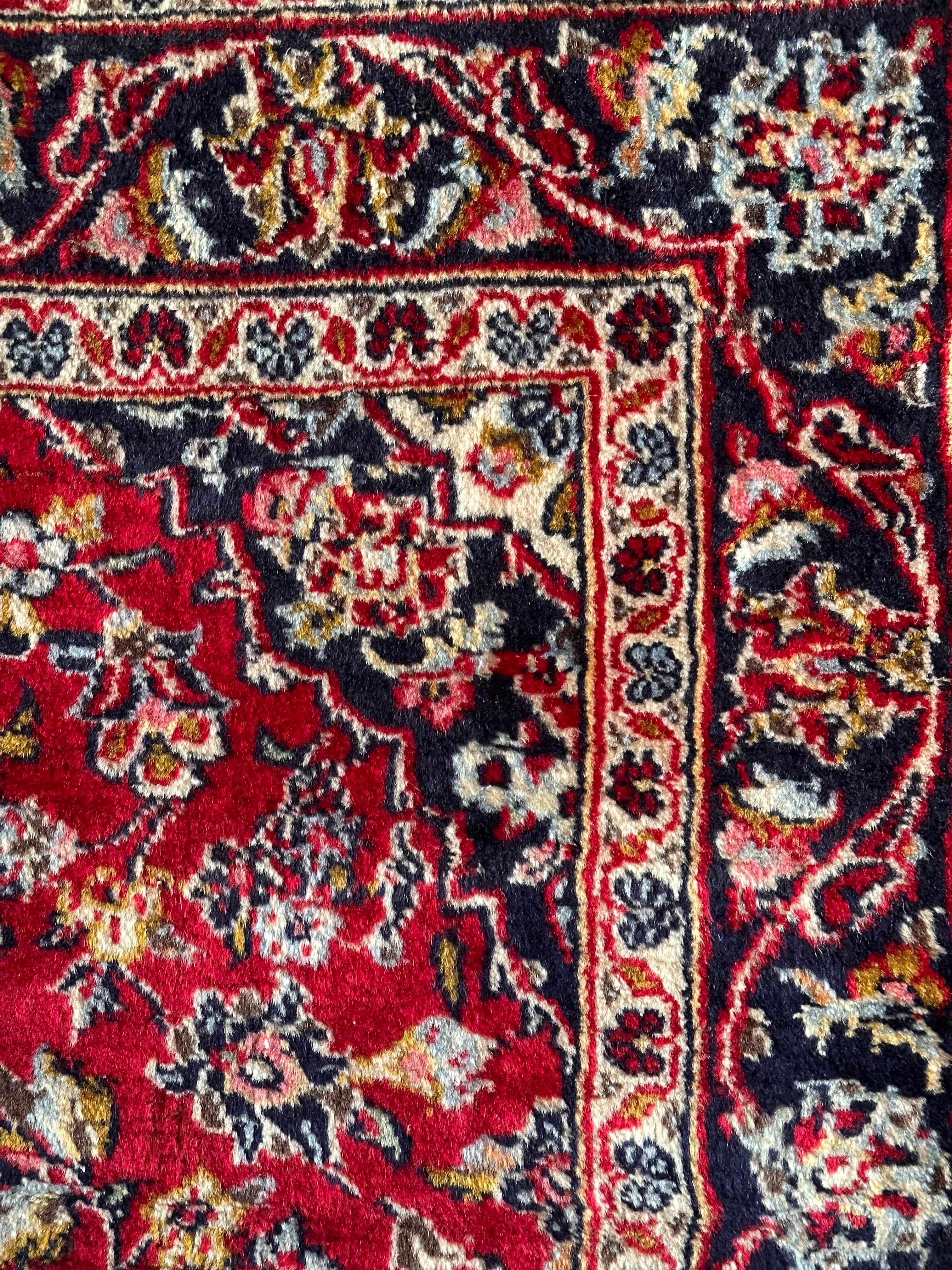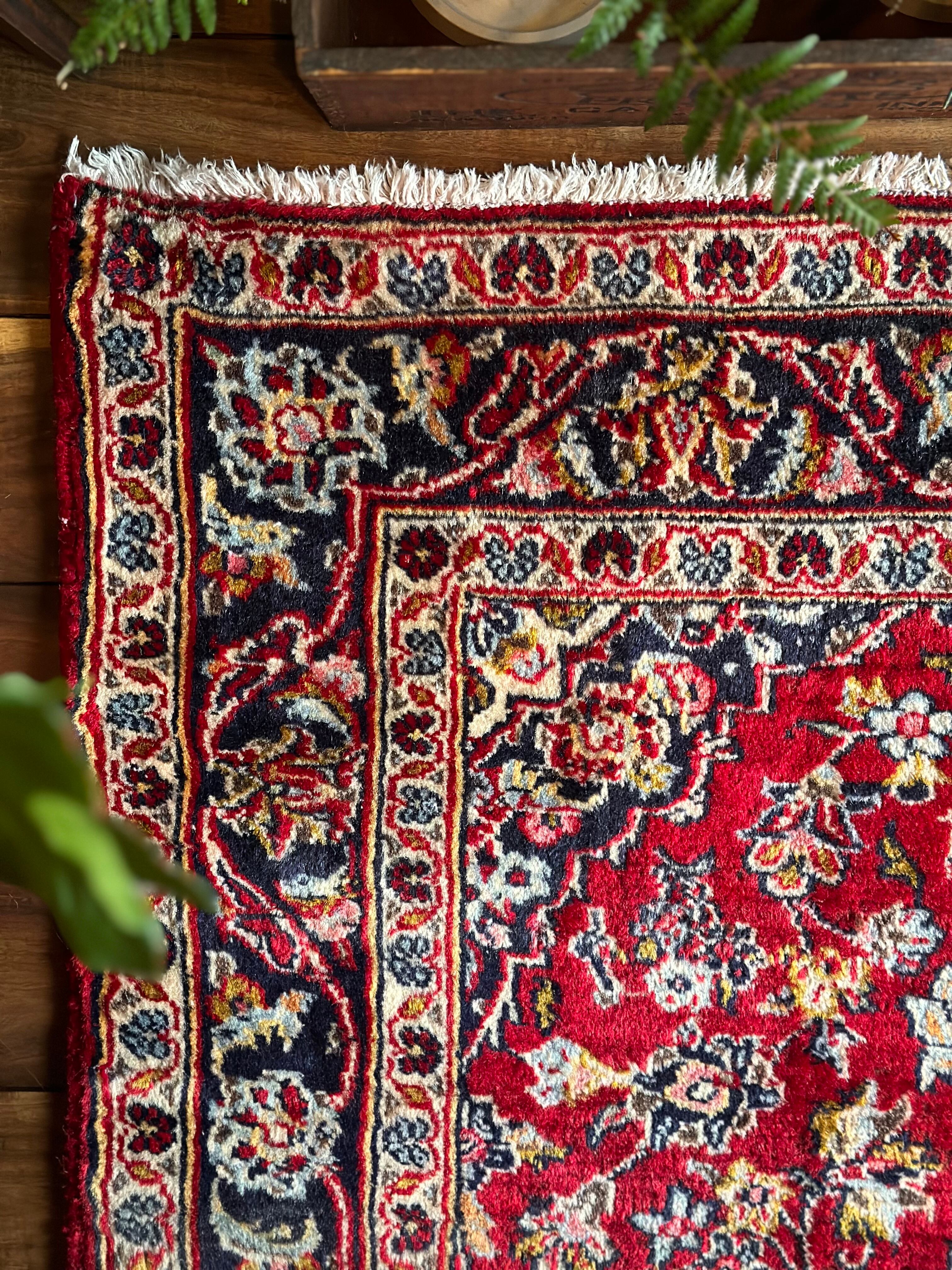 中央のメダリオンに四隅を分割したメダリオンが取り囲む得意なスタイルで、フィールドの赤を引き立てるようにボーダー部分に暗めのネイビーを持ってくるのがカーシャーン独特のスタイルでしょうか。大概は2〜3メートルの大きなサイズが殆どですが、こちら中振なサイズ感でドレッサーや姿見鏡の足元にも使い勝手の良い1枚になります。