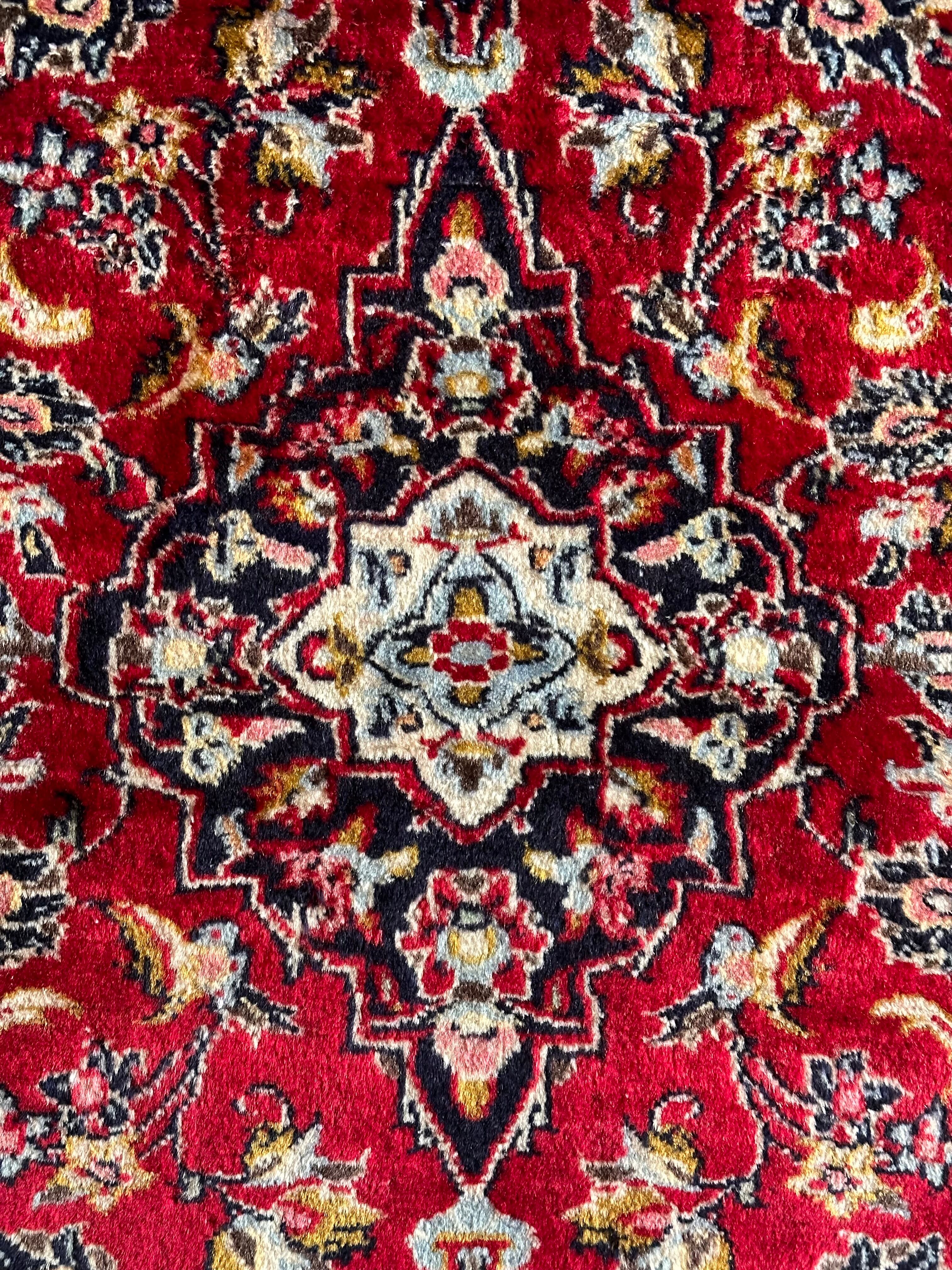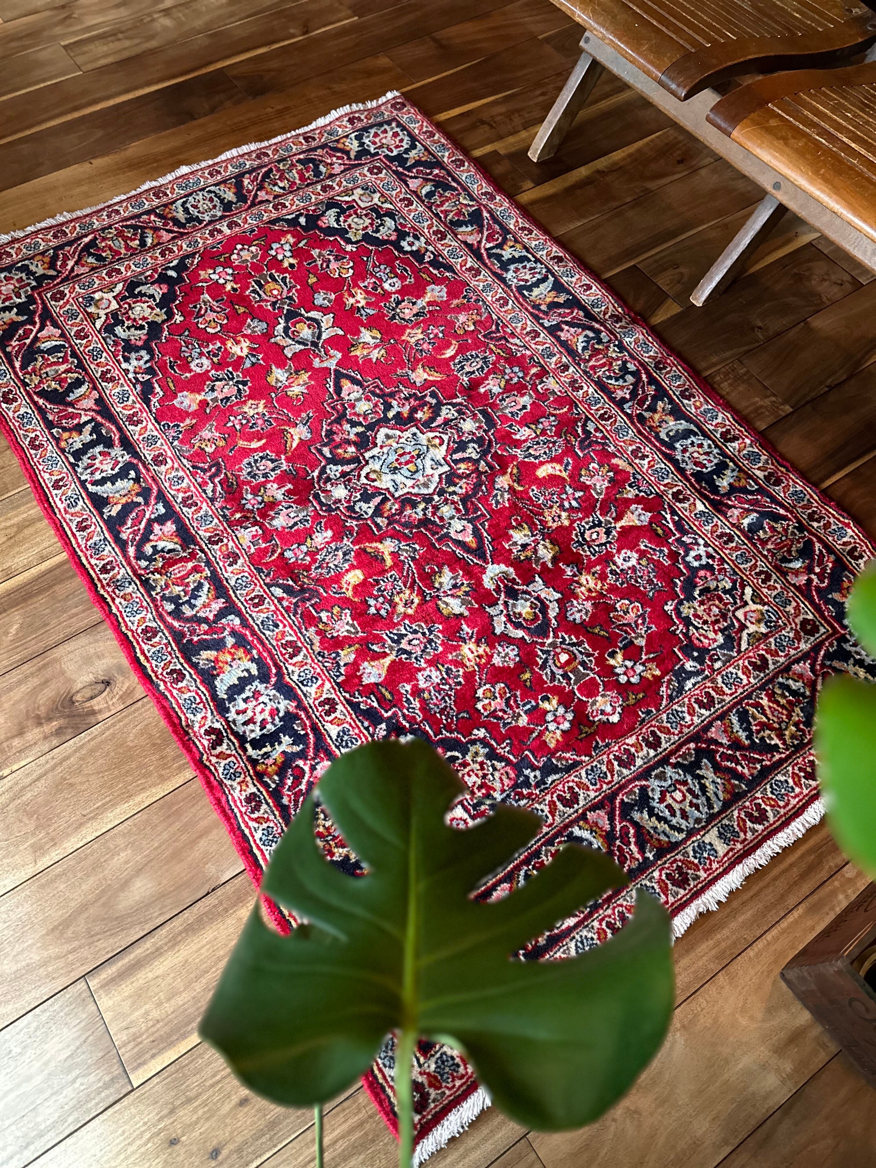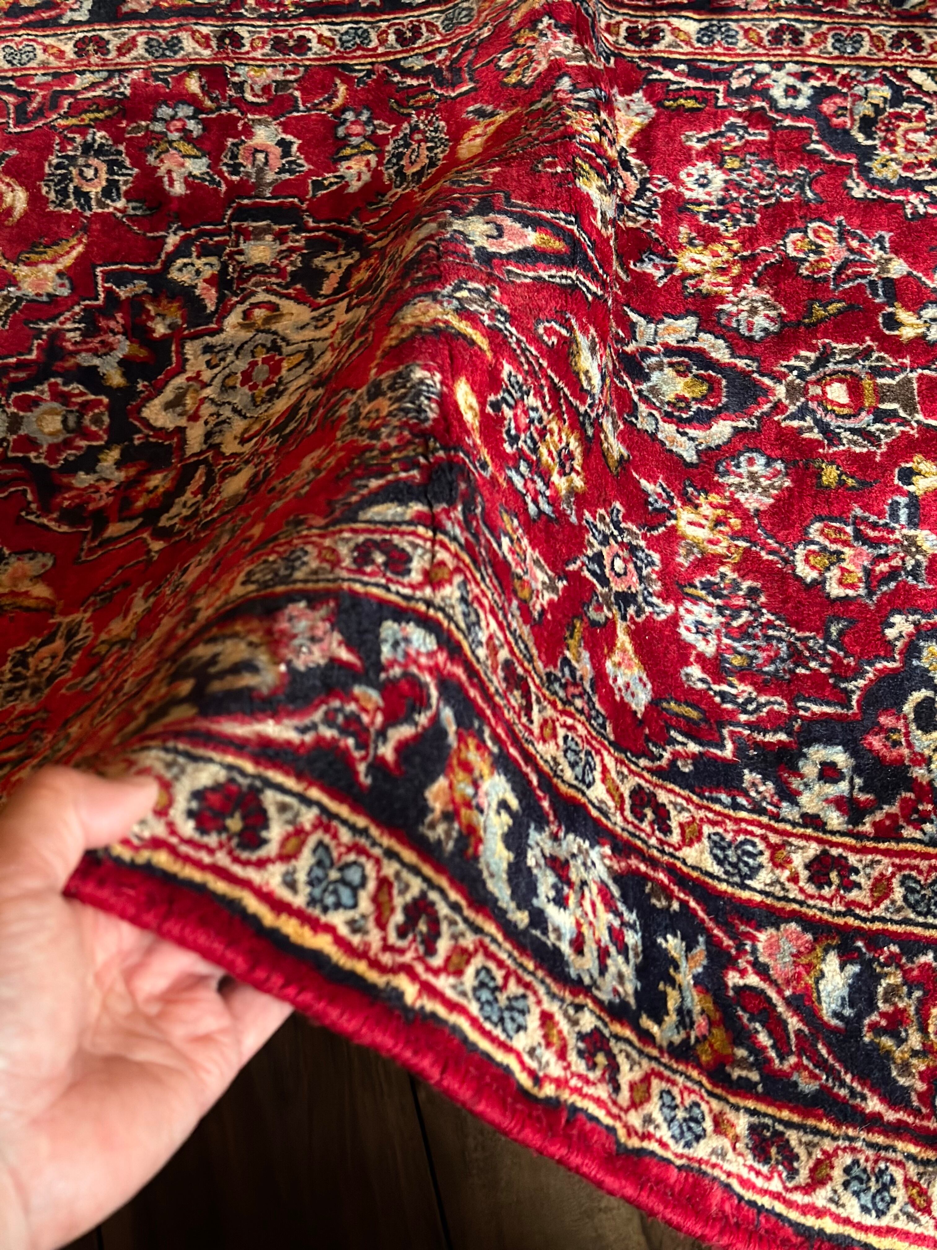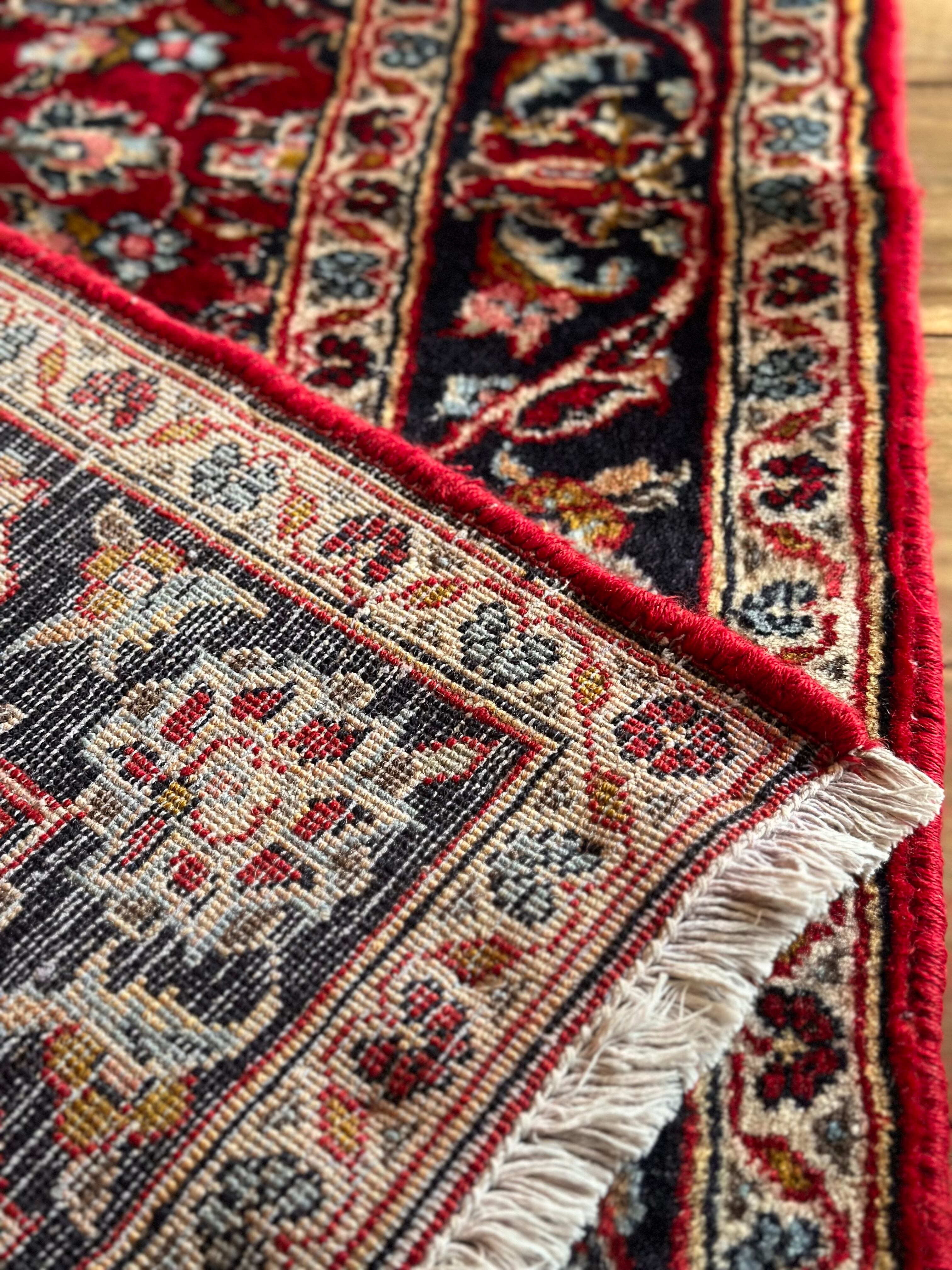 中央のメダリオンに四隅を分割したメダリオンが取り囲む得意なスタイルで、フィールドの赤を引き立てるようにボーダー部分に暗めのネイビーを持ってくるのがカーシャーン独特のスタイルでしょうか。大概は2〜3メートルの大きなサイズが殆どですが、こちら中振なサイズ感でドレッサーや姿見鏡の足元にも使い勝手の良い1枚になります。