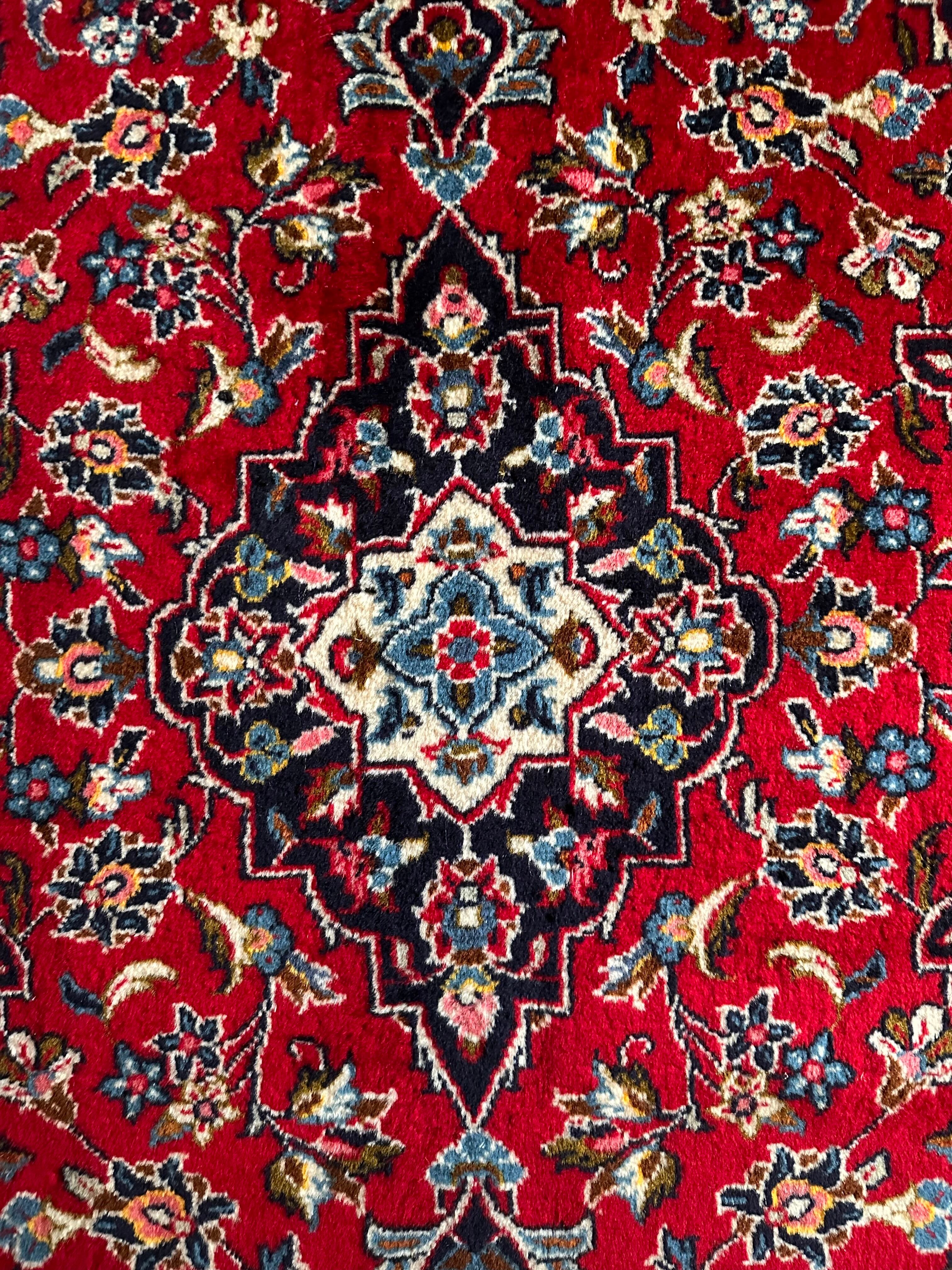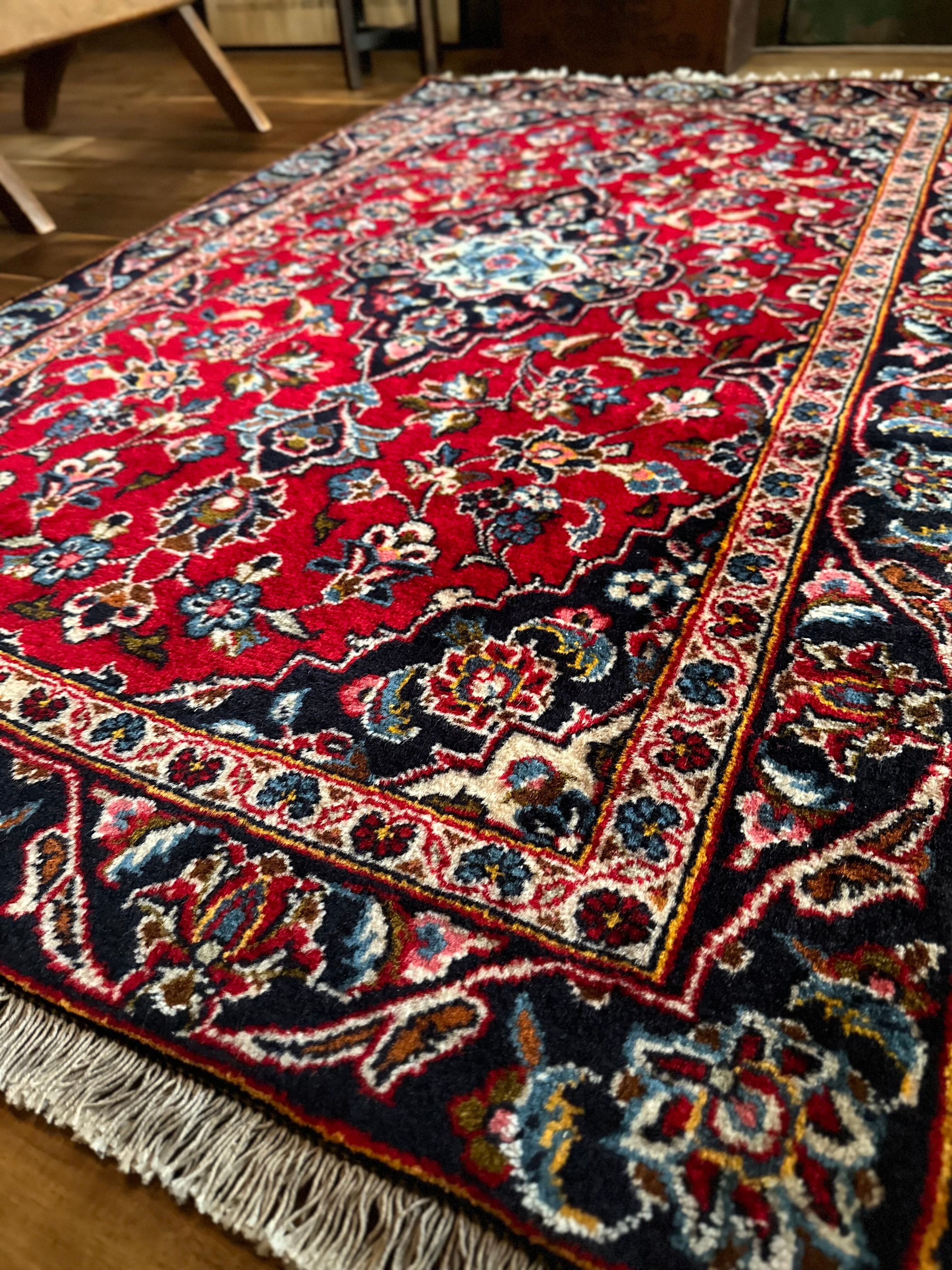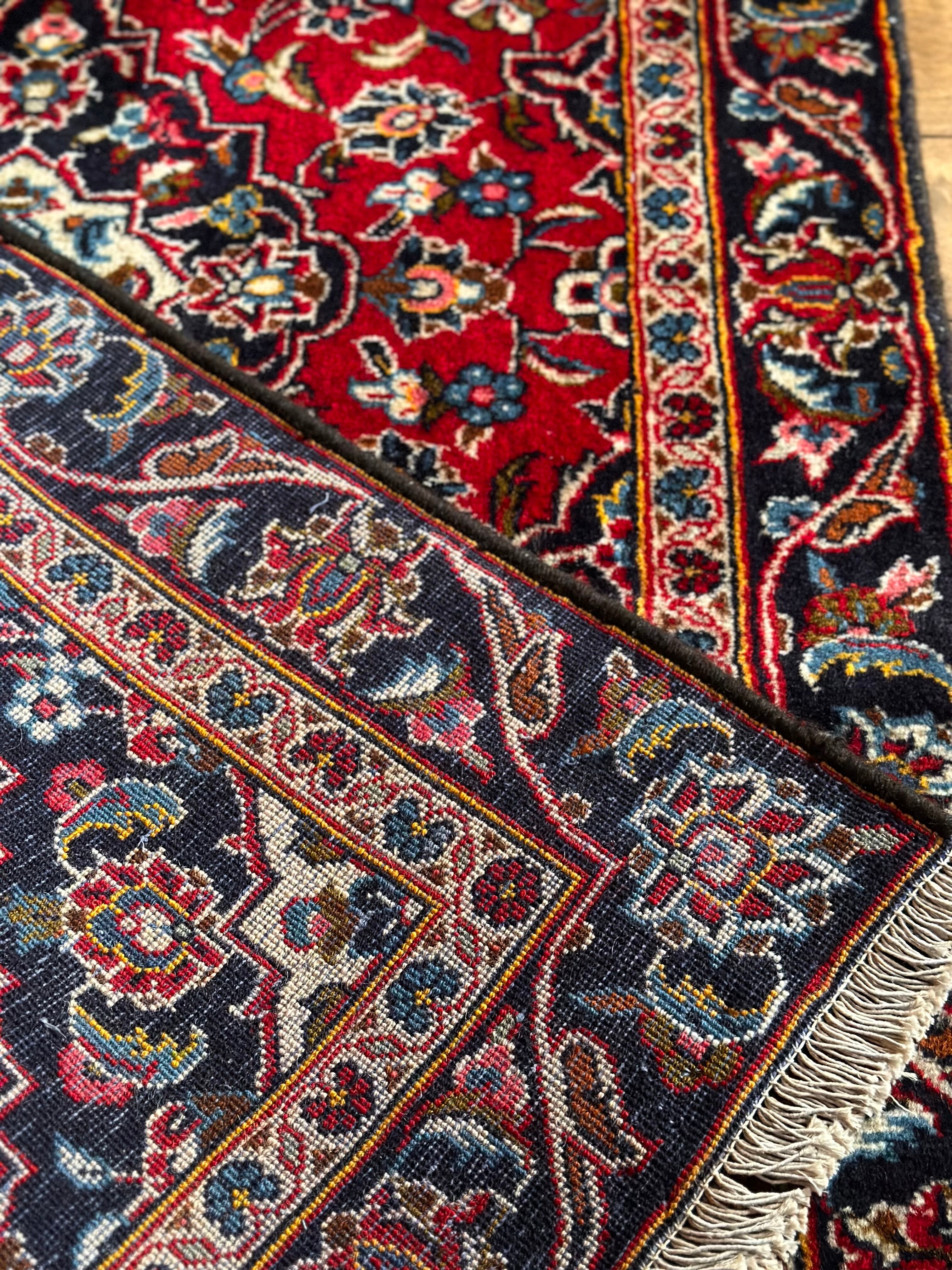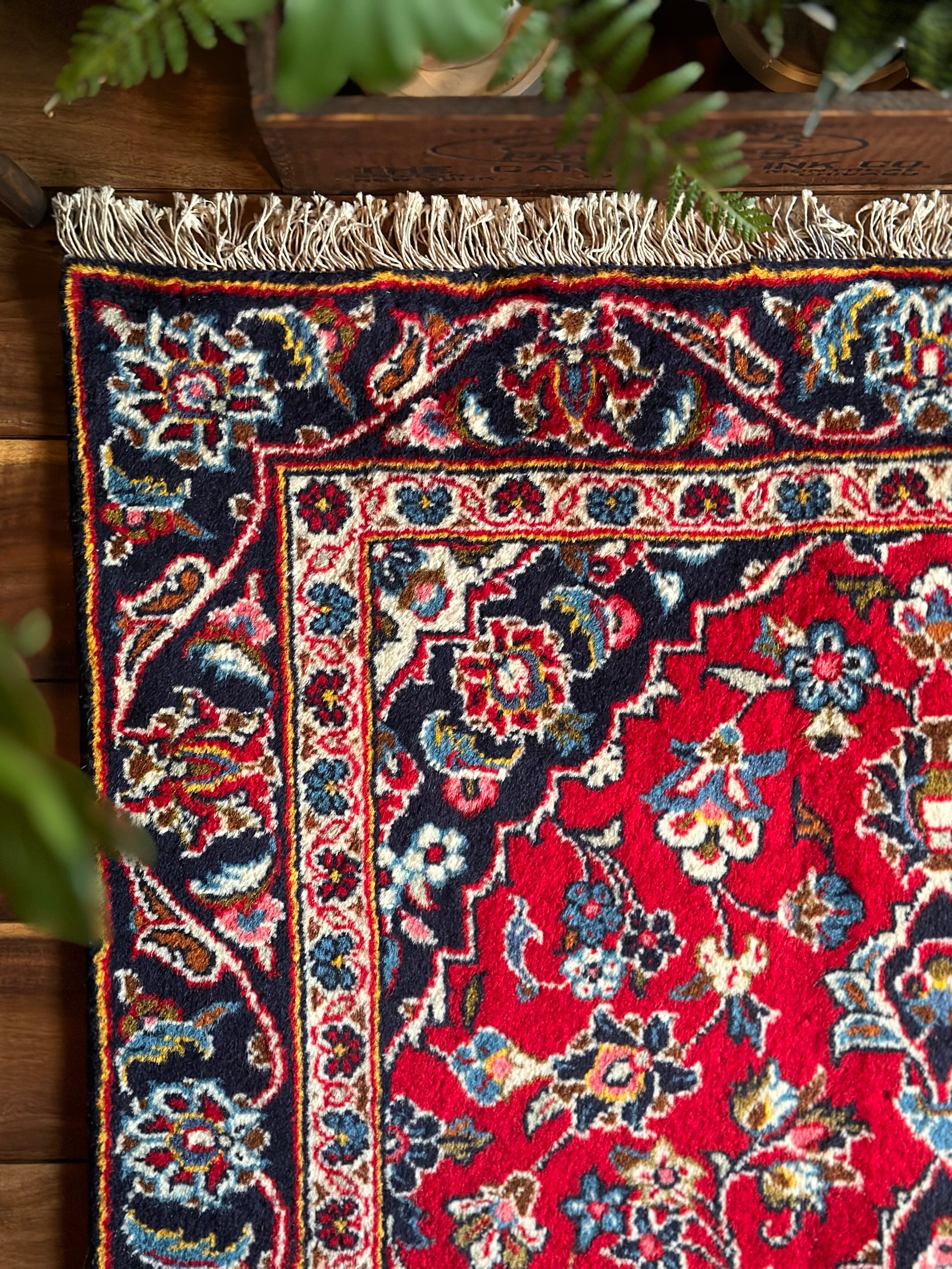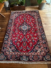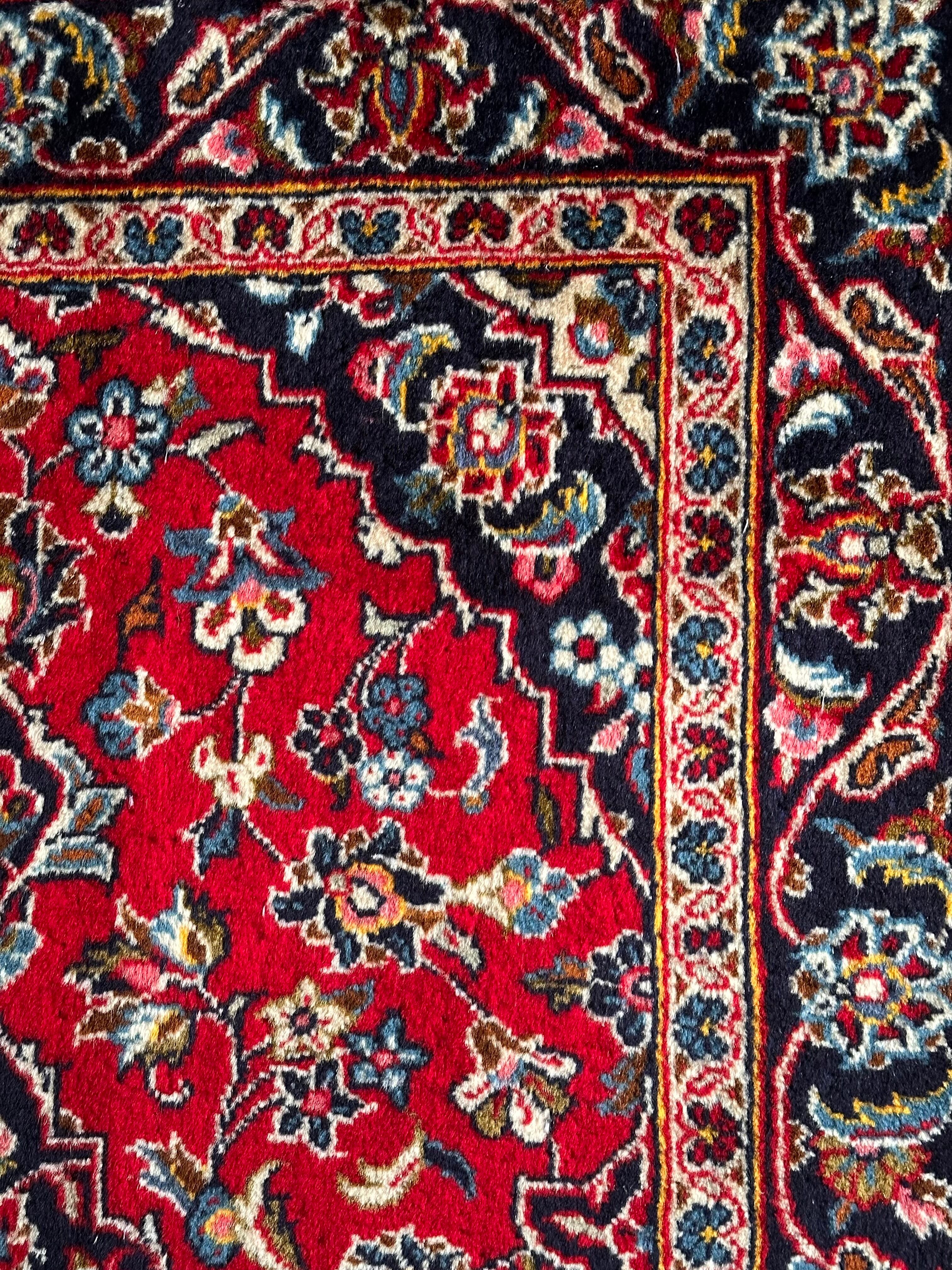中央のメダリオンに四隅を分割したメダリオンが取り囲む得意なスタイルで、フィールドの赤を引き立てるようにボーダー部分に暗めのネイビーを持ってくるのがカーシャーン独特のスタイルでしょうか。大概は2〜3メートルの大きなサイズが殆どですが、こちら中振なサイズ感でドレッサーや姿見鏡の足元にも使い勝手の良い1枚になります。