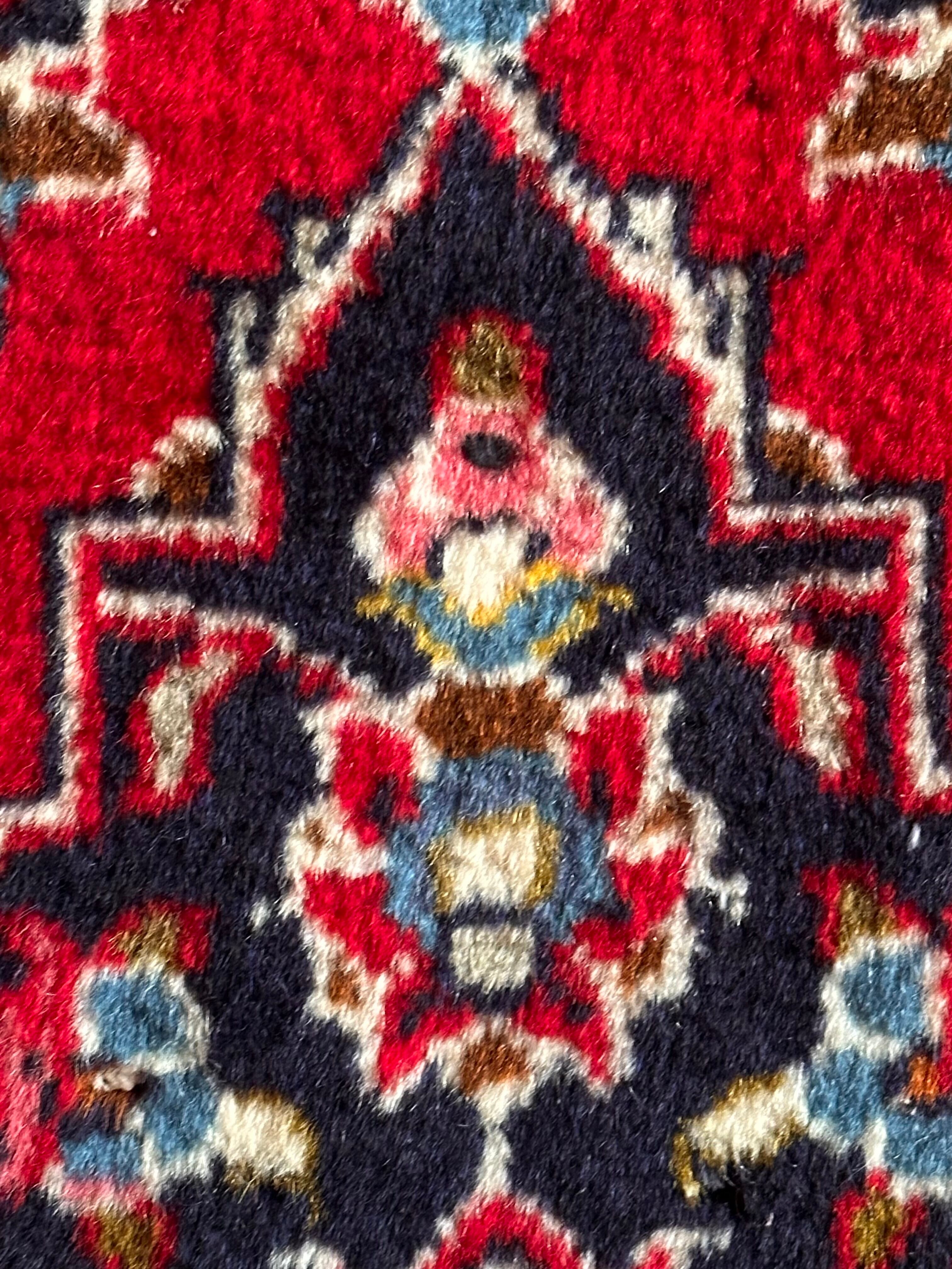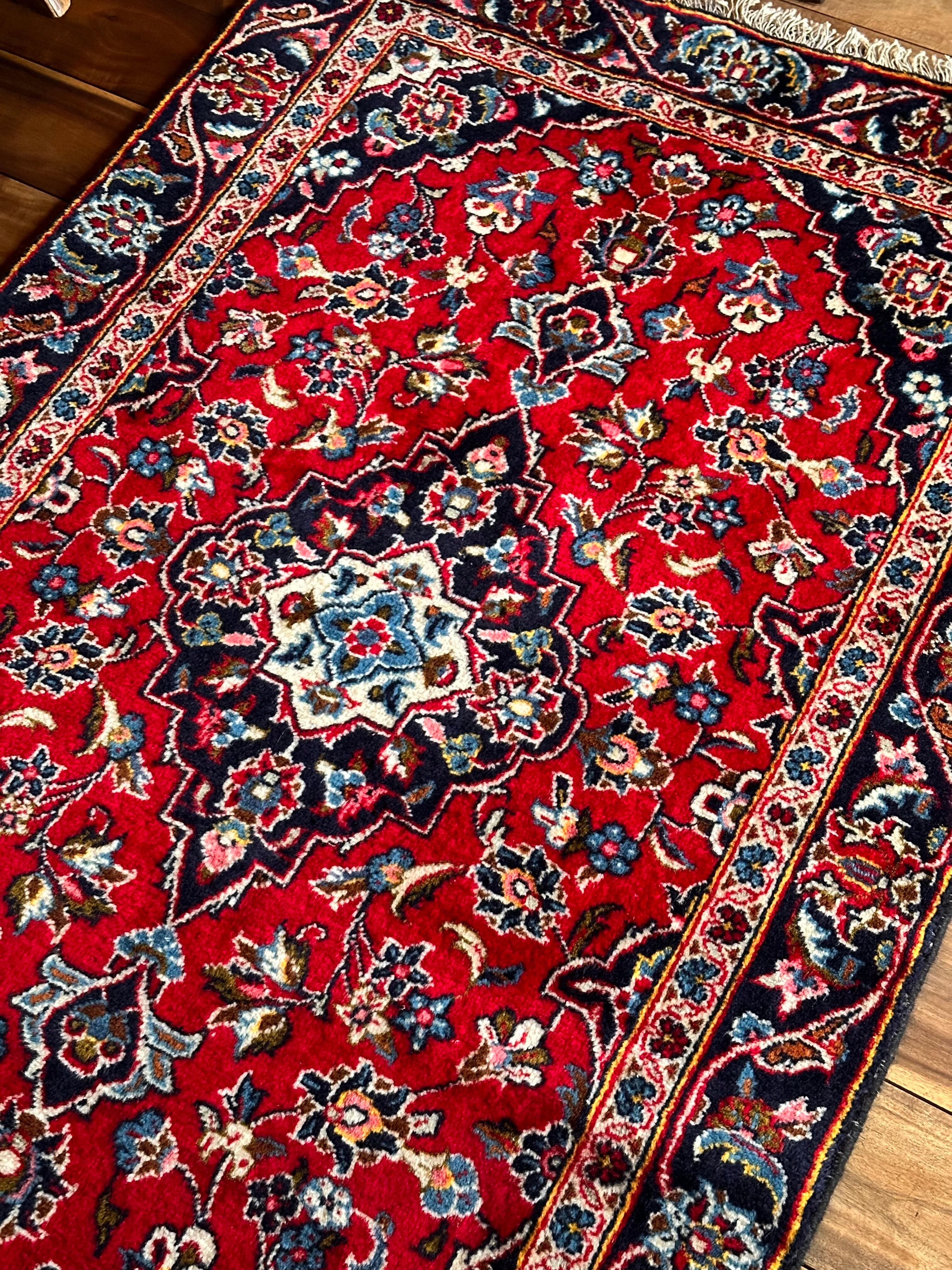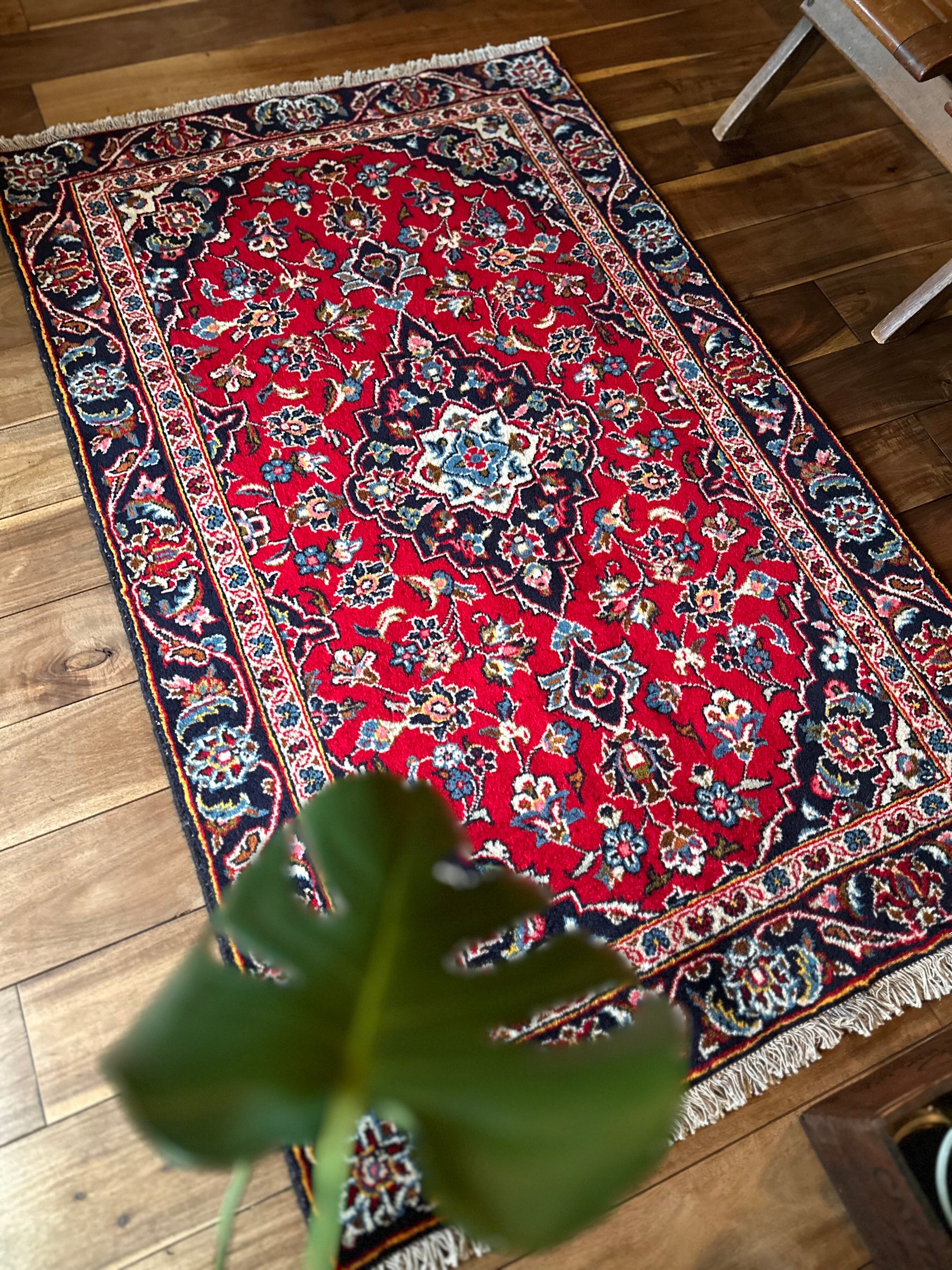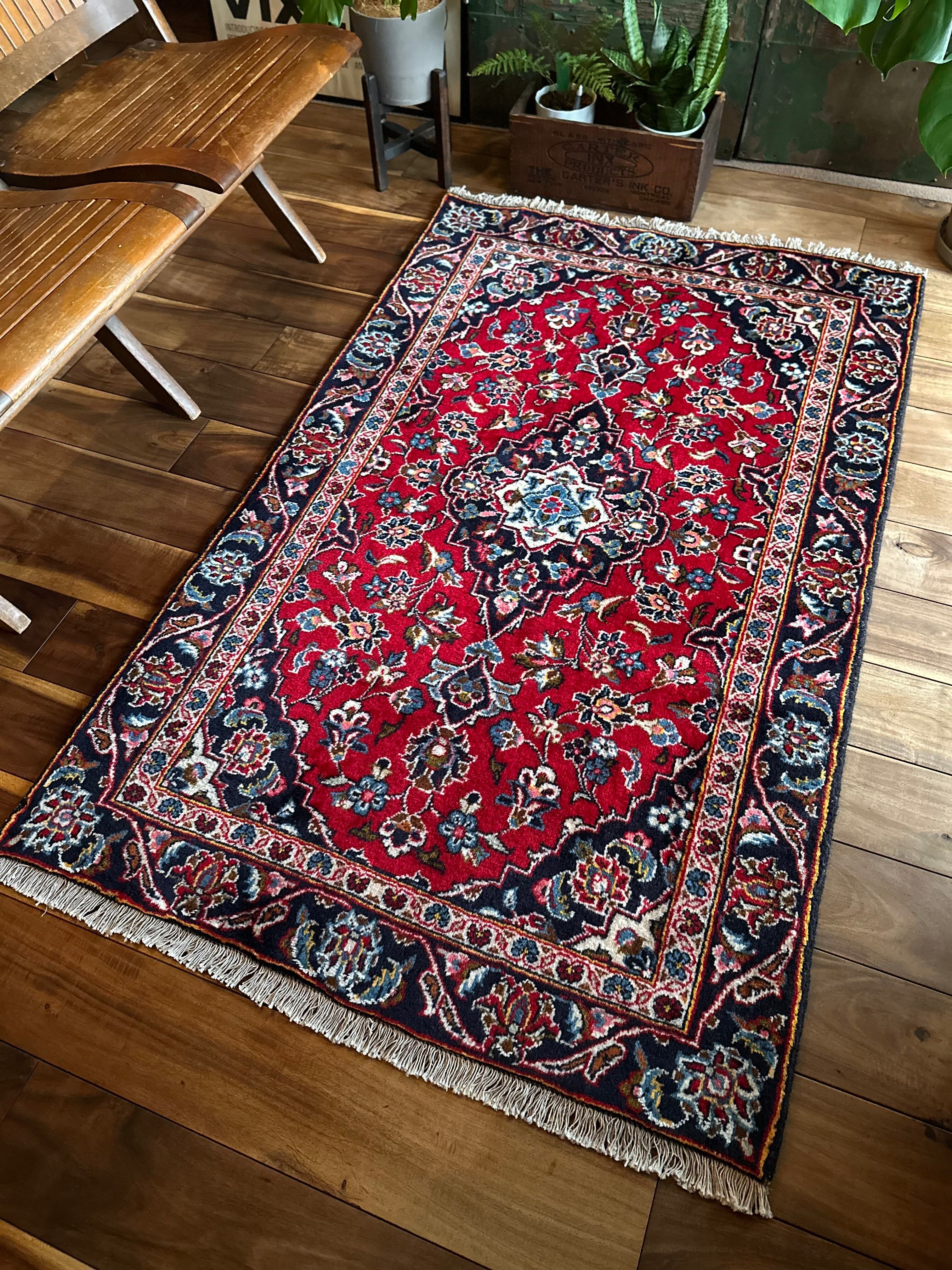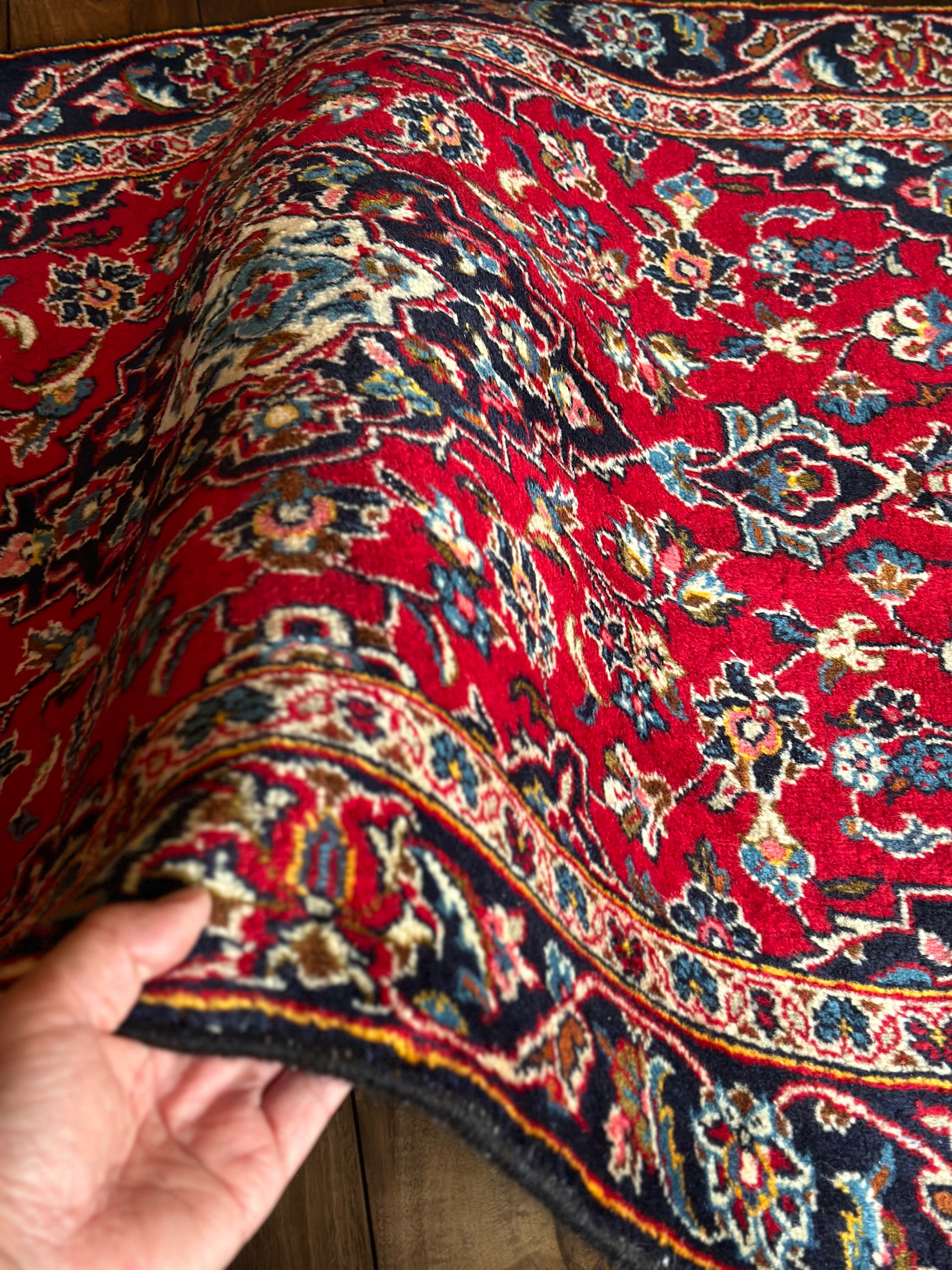 中央のメダリオンに四隅を分割したメダリオンが取り囲む得意なスタイルで、フィールドの赤を引き立てるようにボーダー部分に暗めのネイビーを持ってくるのがカーシャーン独特のスタイルでしょうか。大概は2〜3メートルの大きなサイズが殆どですが、こちら中振なサイズ感でドレッサーや姿見鏡の足元にも使い勝手の良い1枚になります。