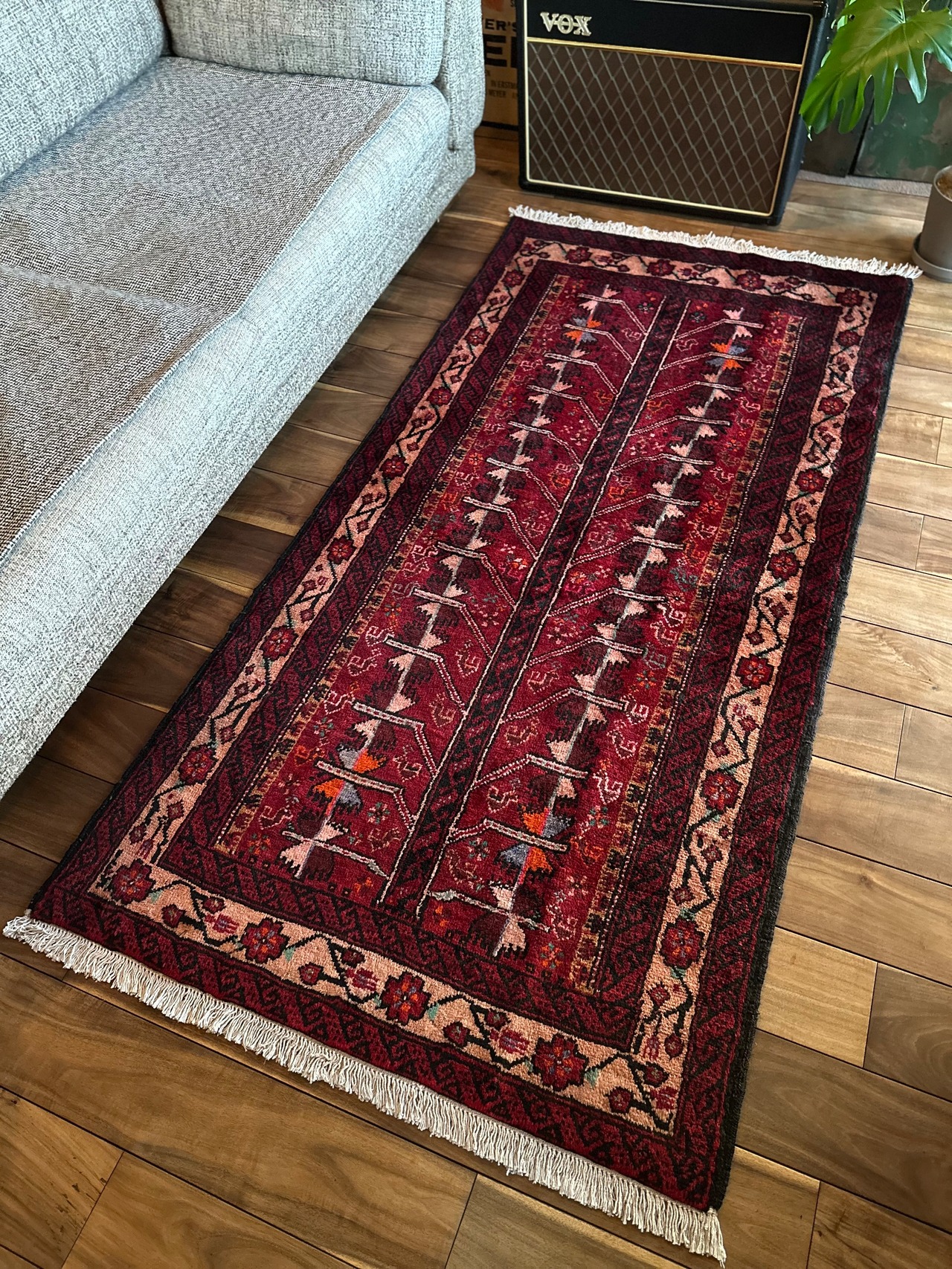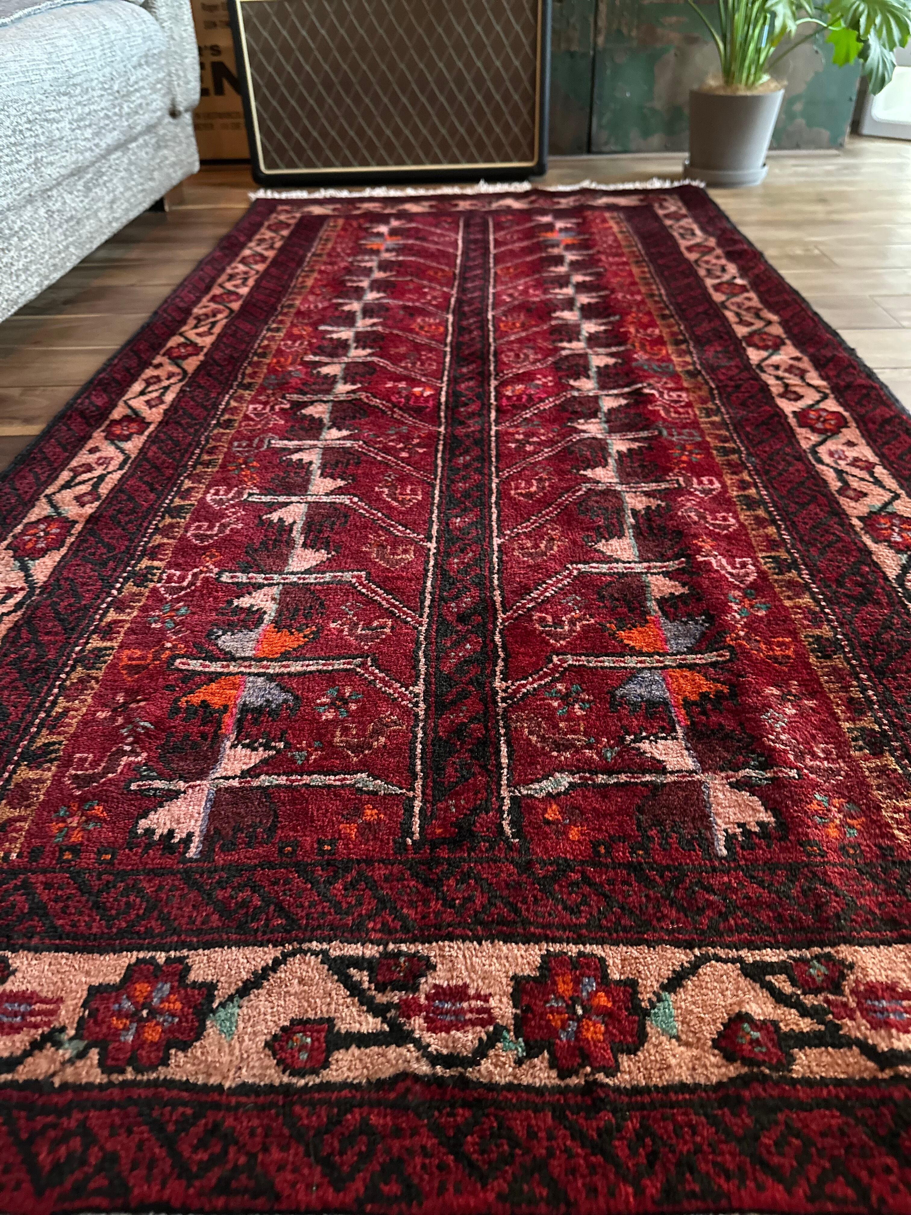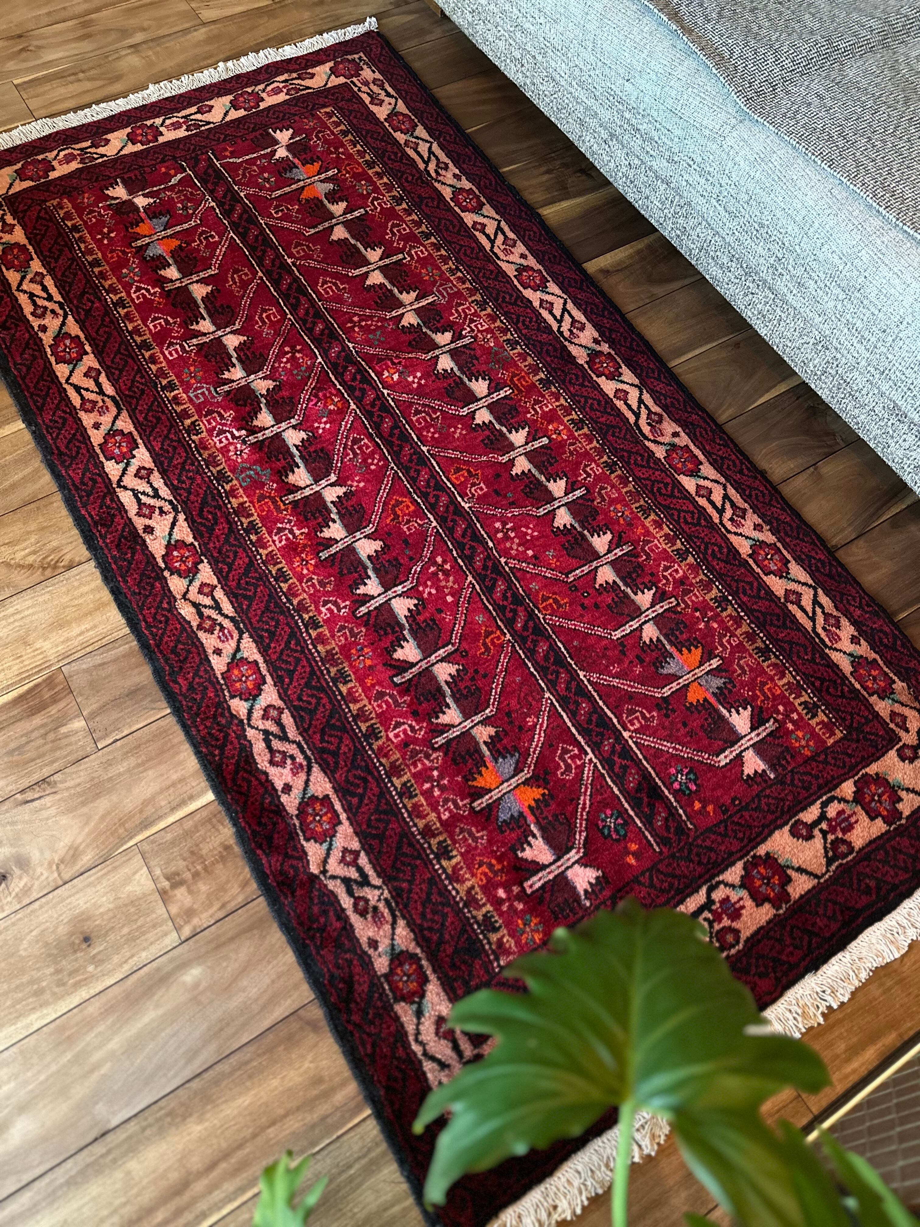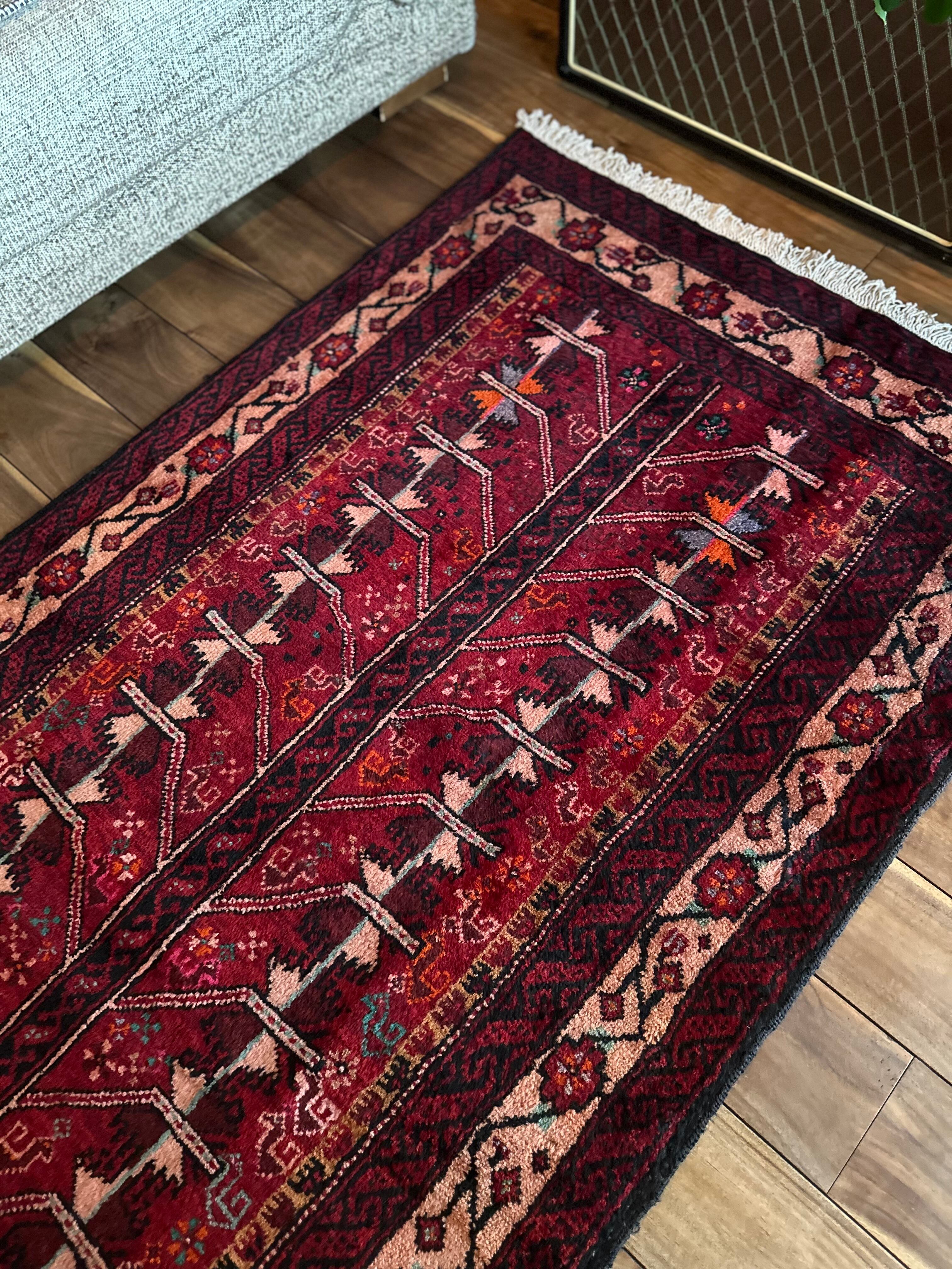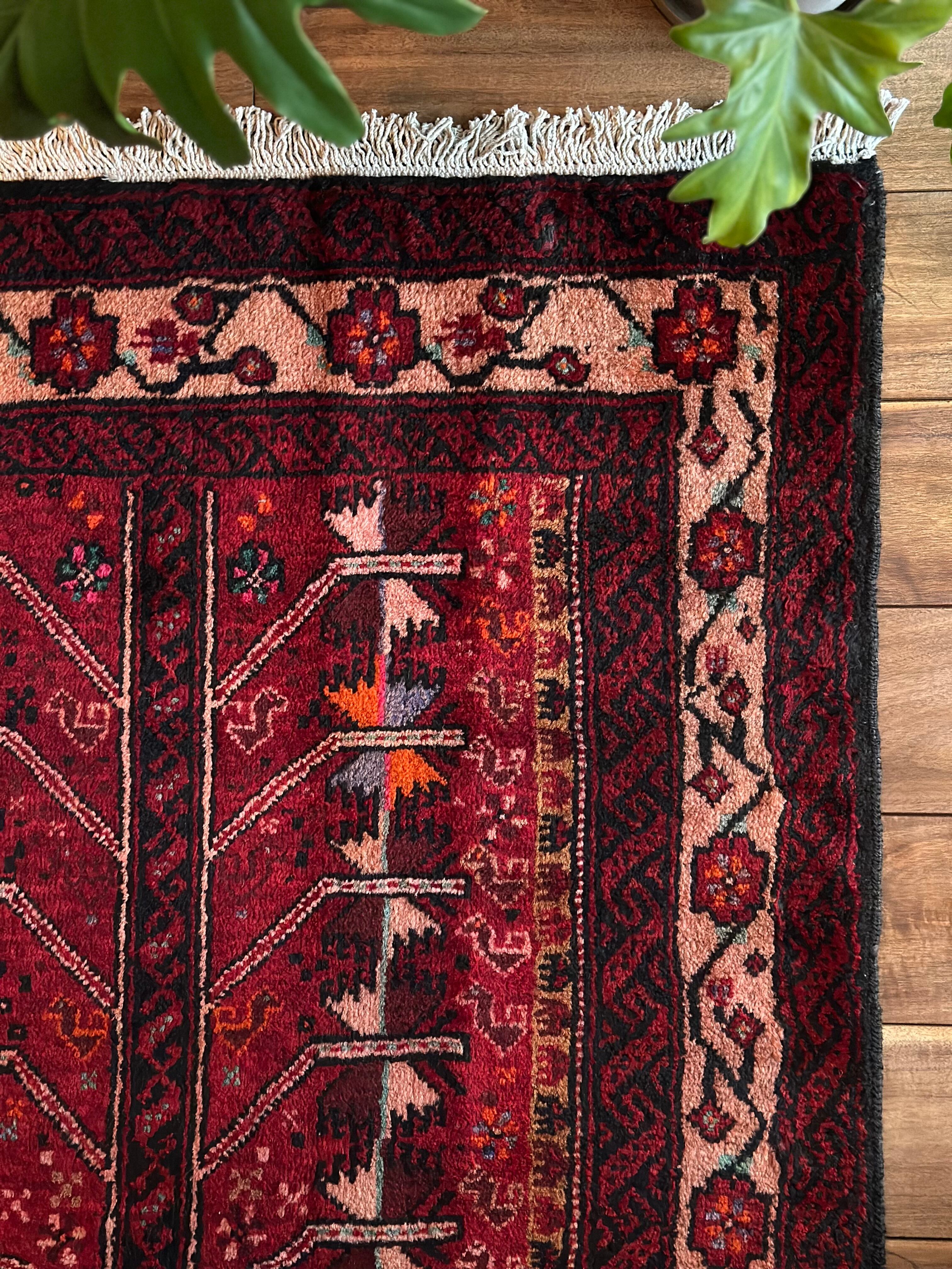 深いボルドーとベージュのコントラストがバルーチ族らしく、生命の樹から今にも落ちそうな枯葉のチナール模様に鳥たちが描かれたトライバルラグになります。