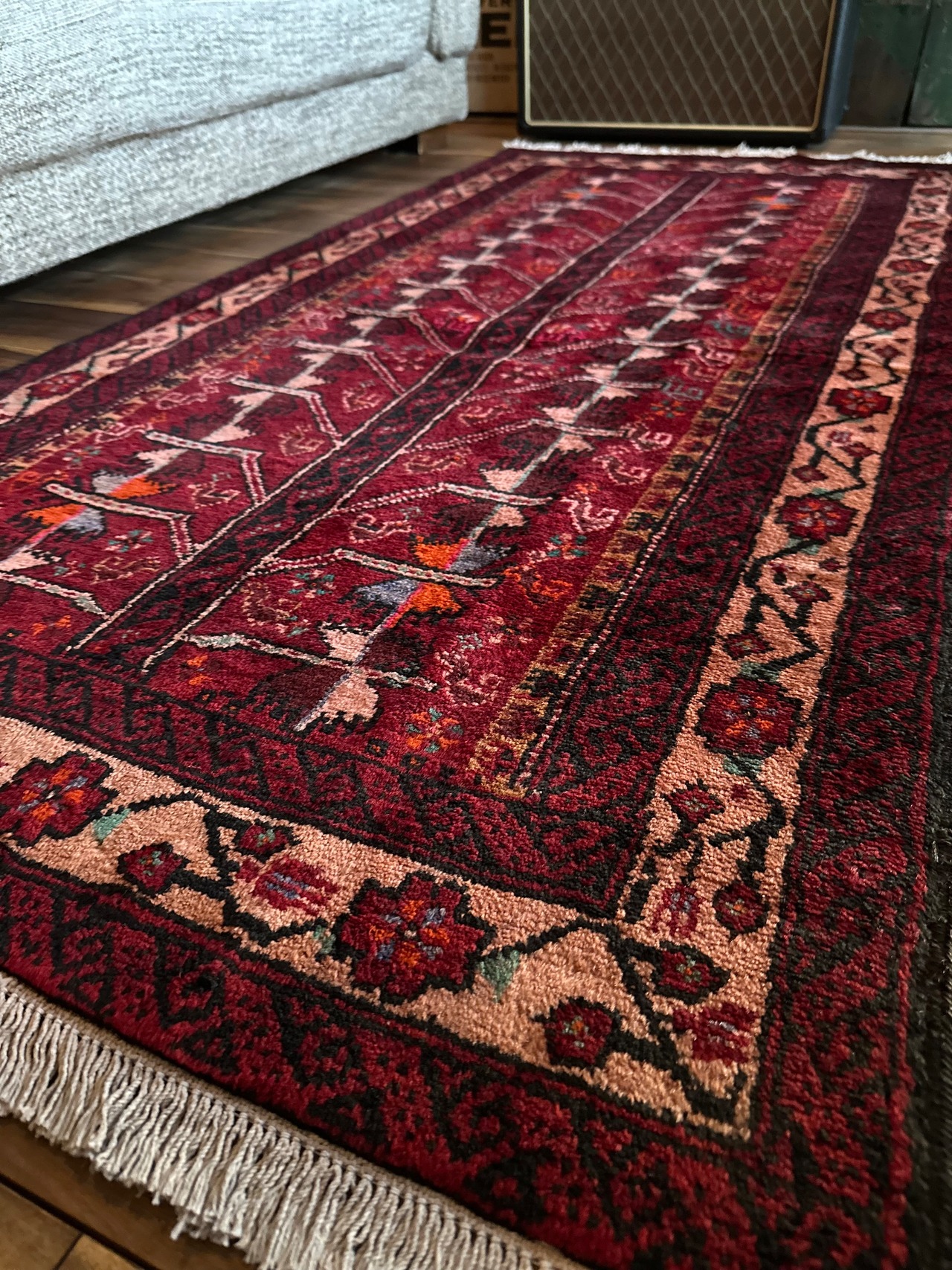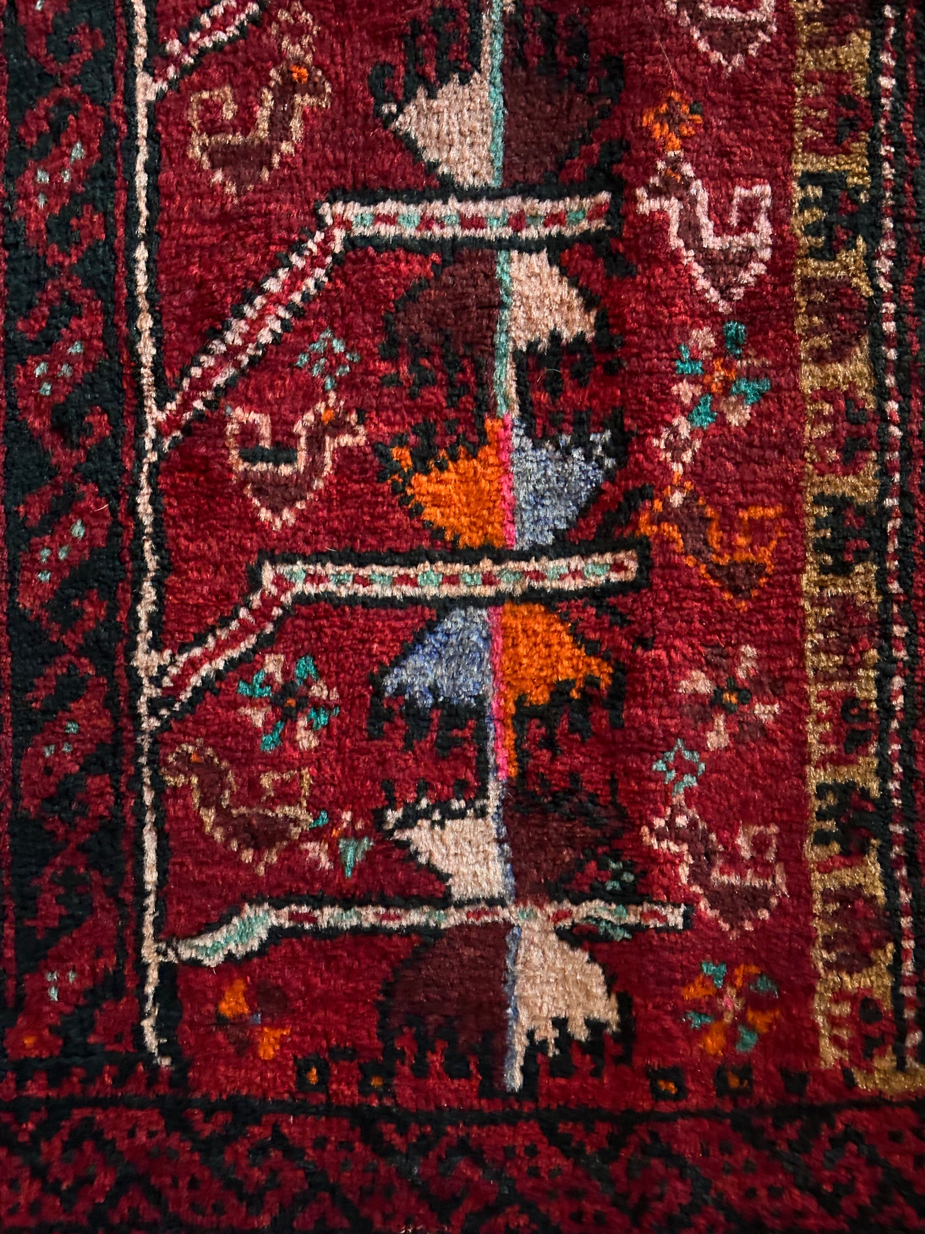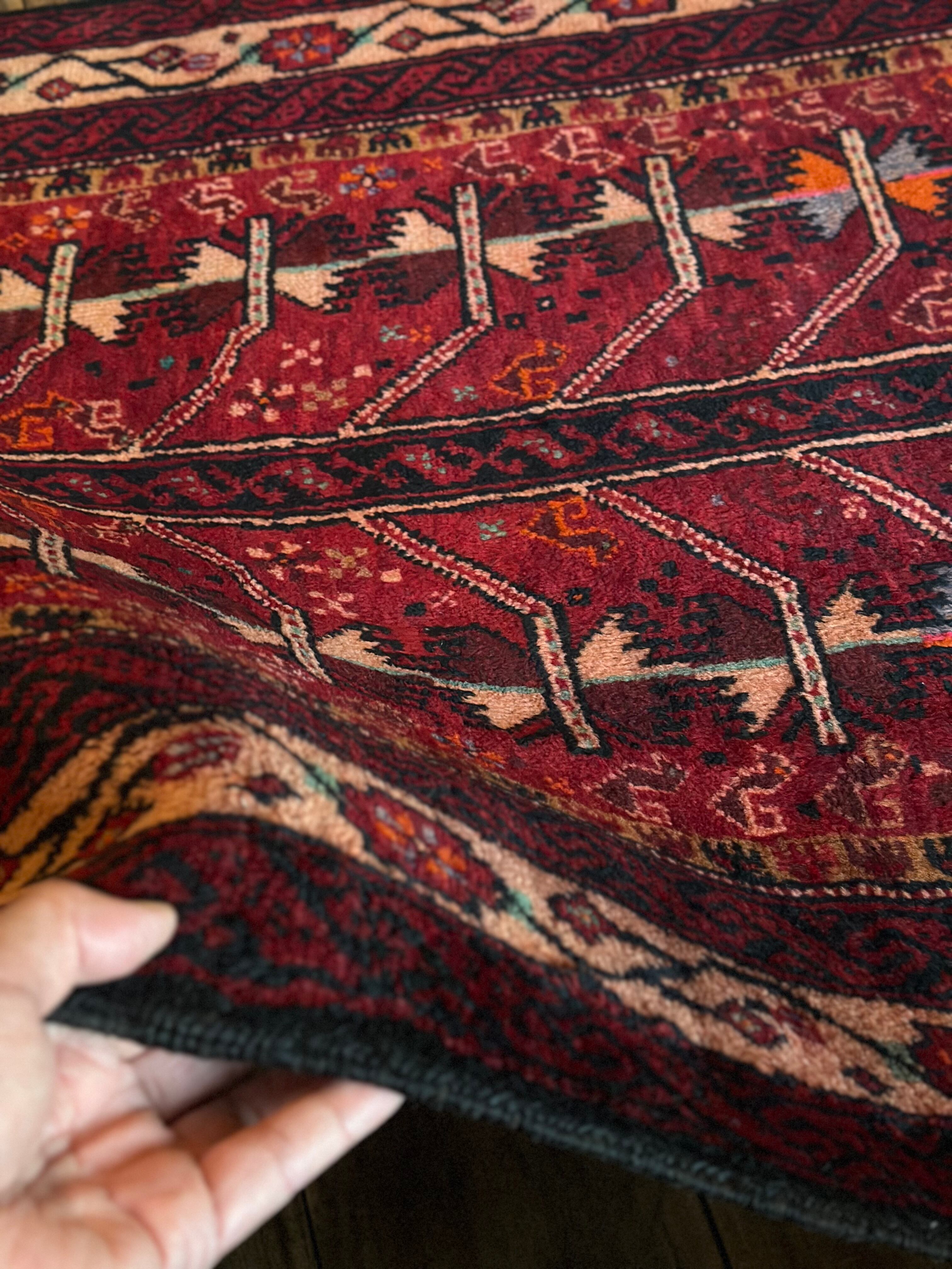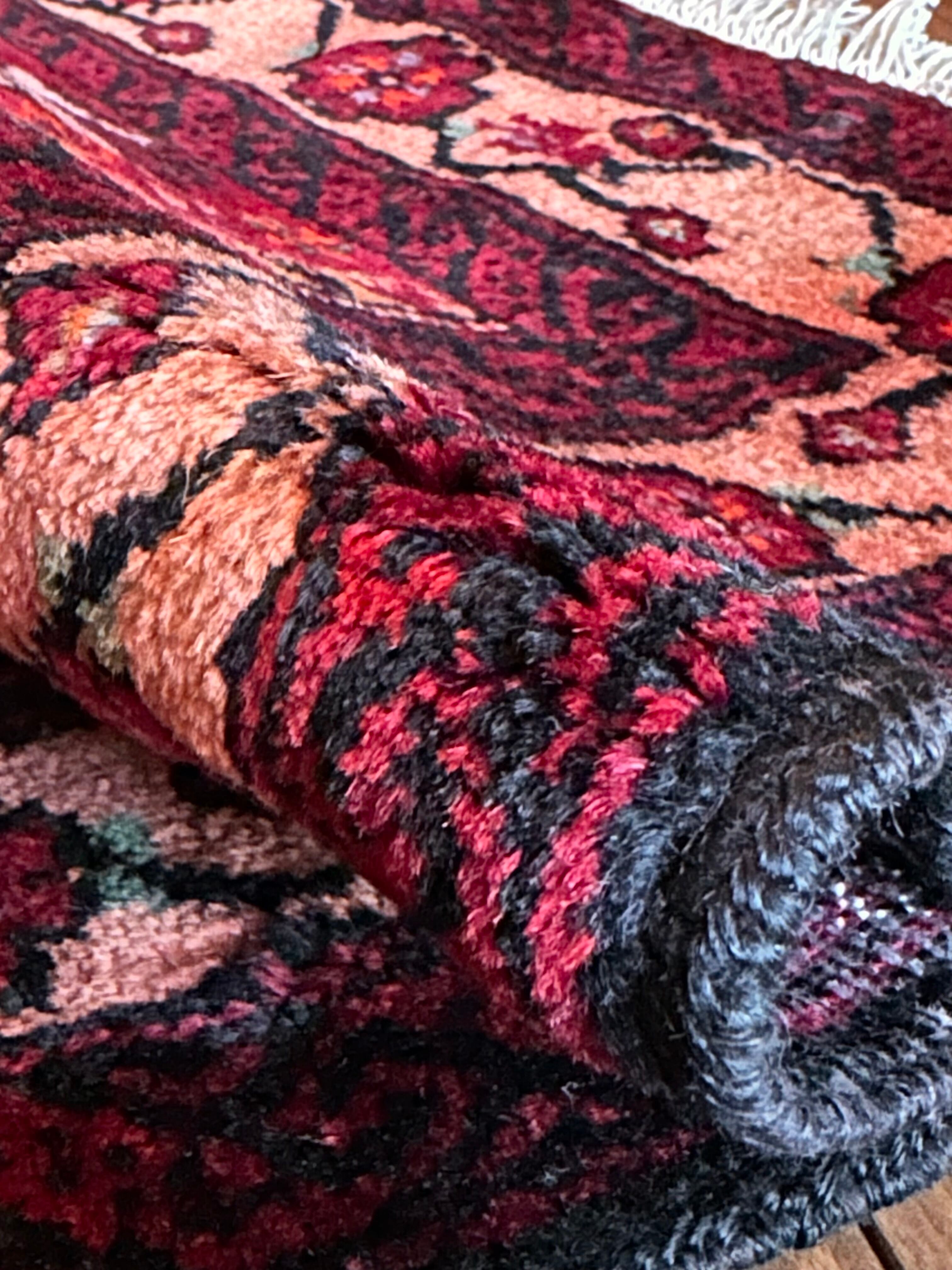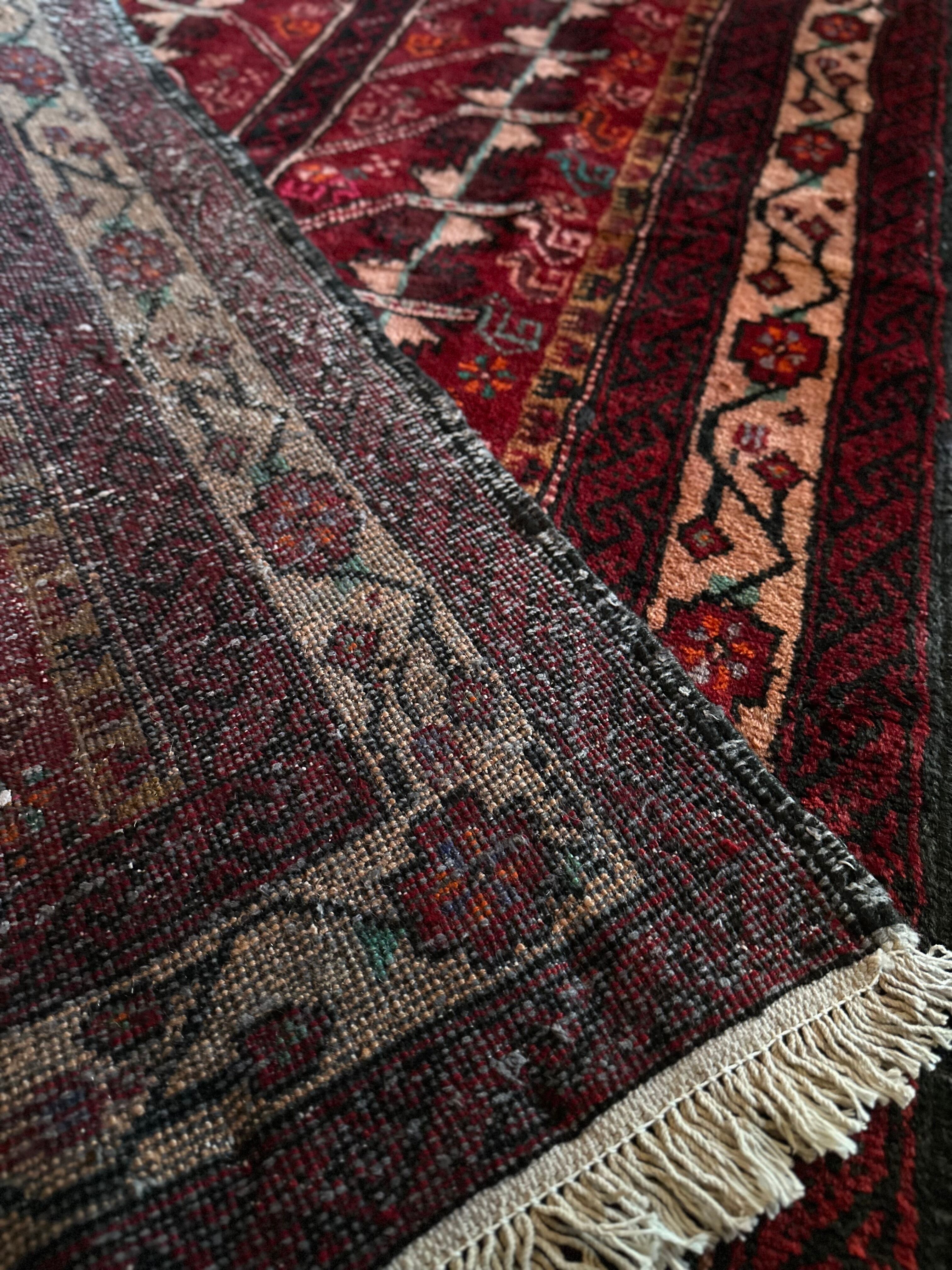 深いボルドーとベージュのコントラストがバルーチ族らしく、生命の樹から今にも落ちそうな枯葉のチナール模様に鳥たちが描かれたトライバルラグになります。