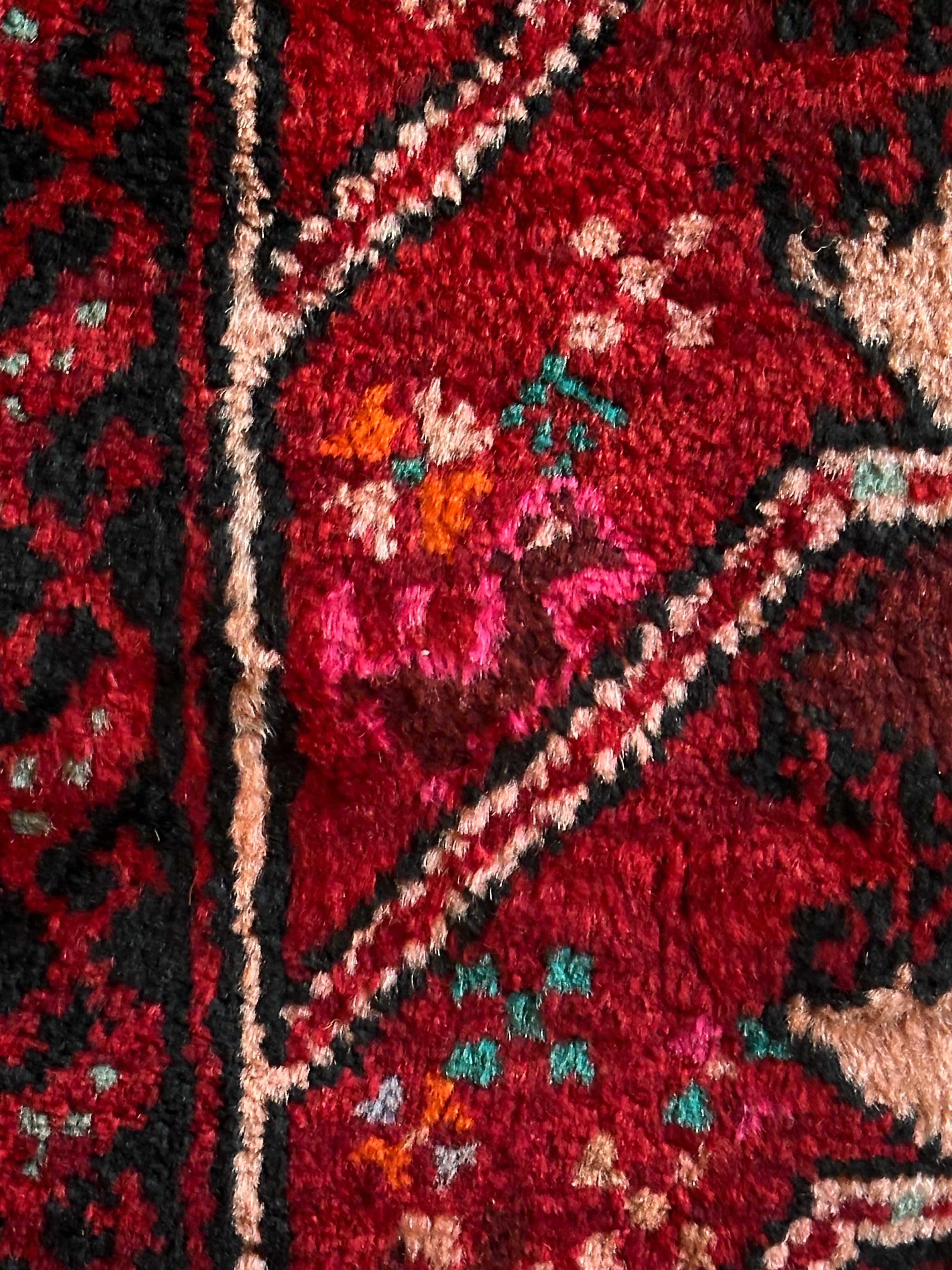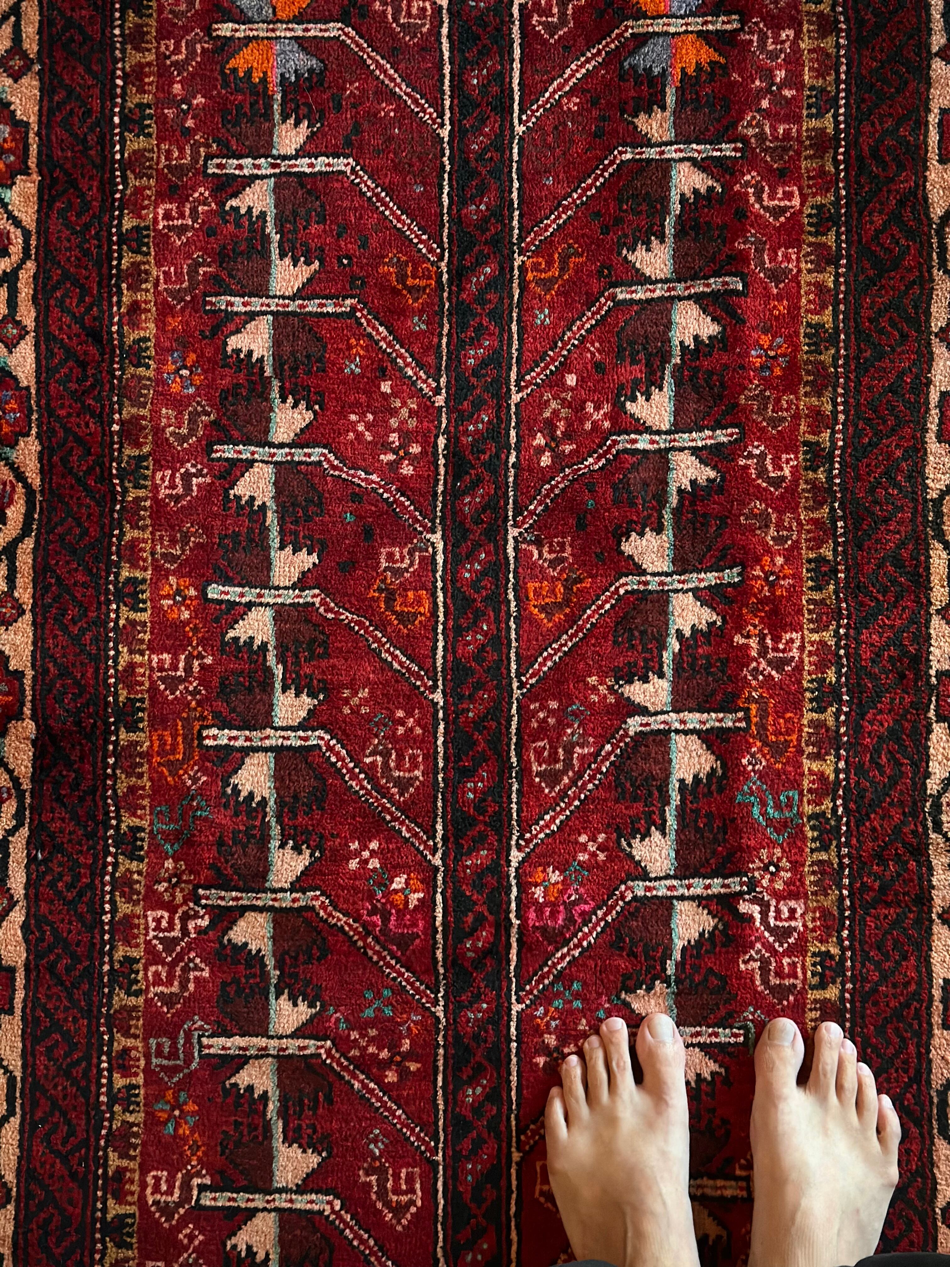 またラグそのものに関しては羊毛特有の匂いがあり、手織りならではの歪みに水洗いクリーニングによる縮み、また草木染めによる経年劣化の色ムラなどがありますが、それもまたヴィンテージラグの魅力かとご理解ください。