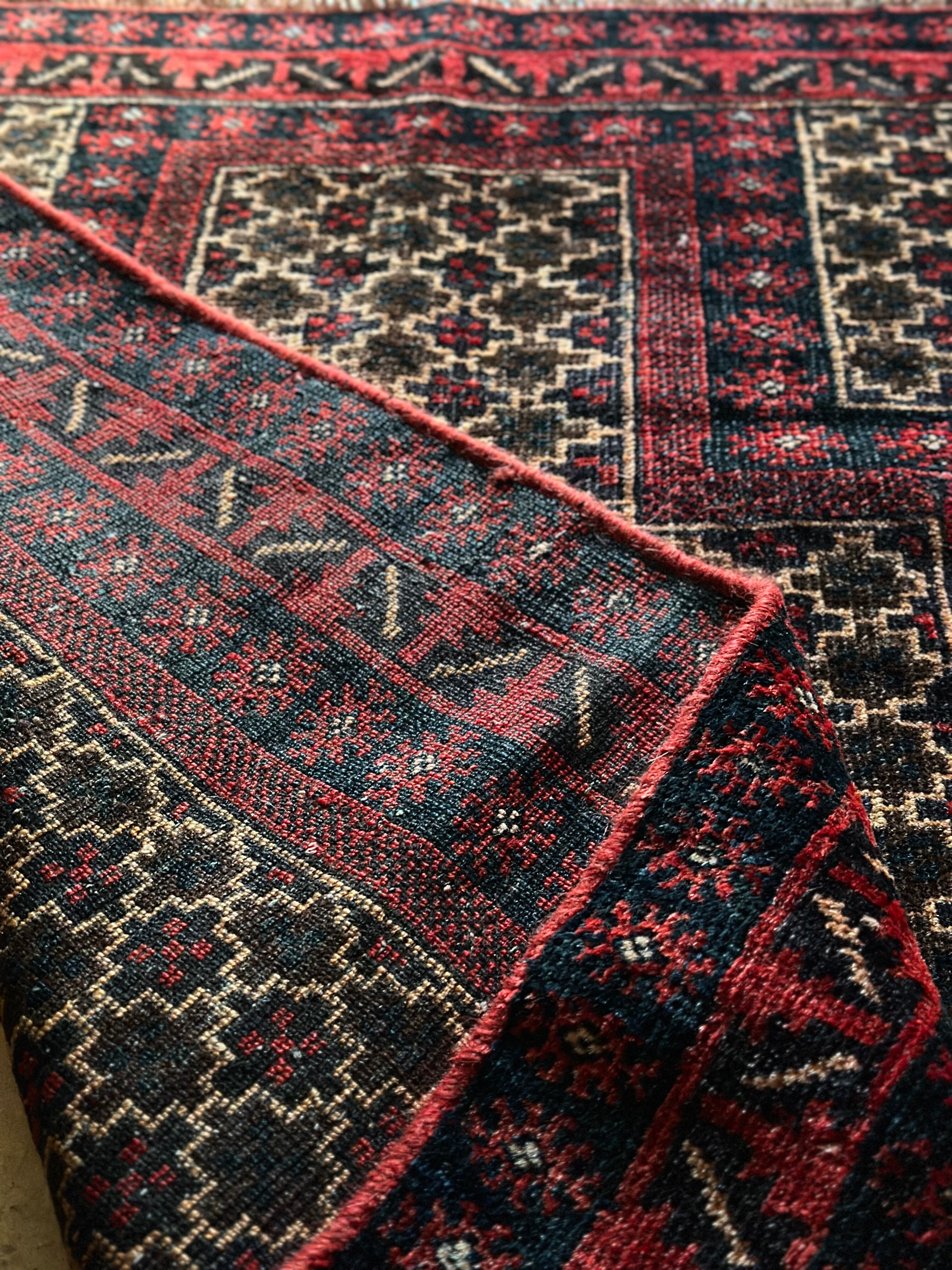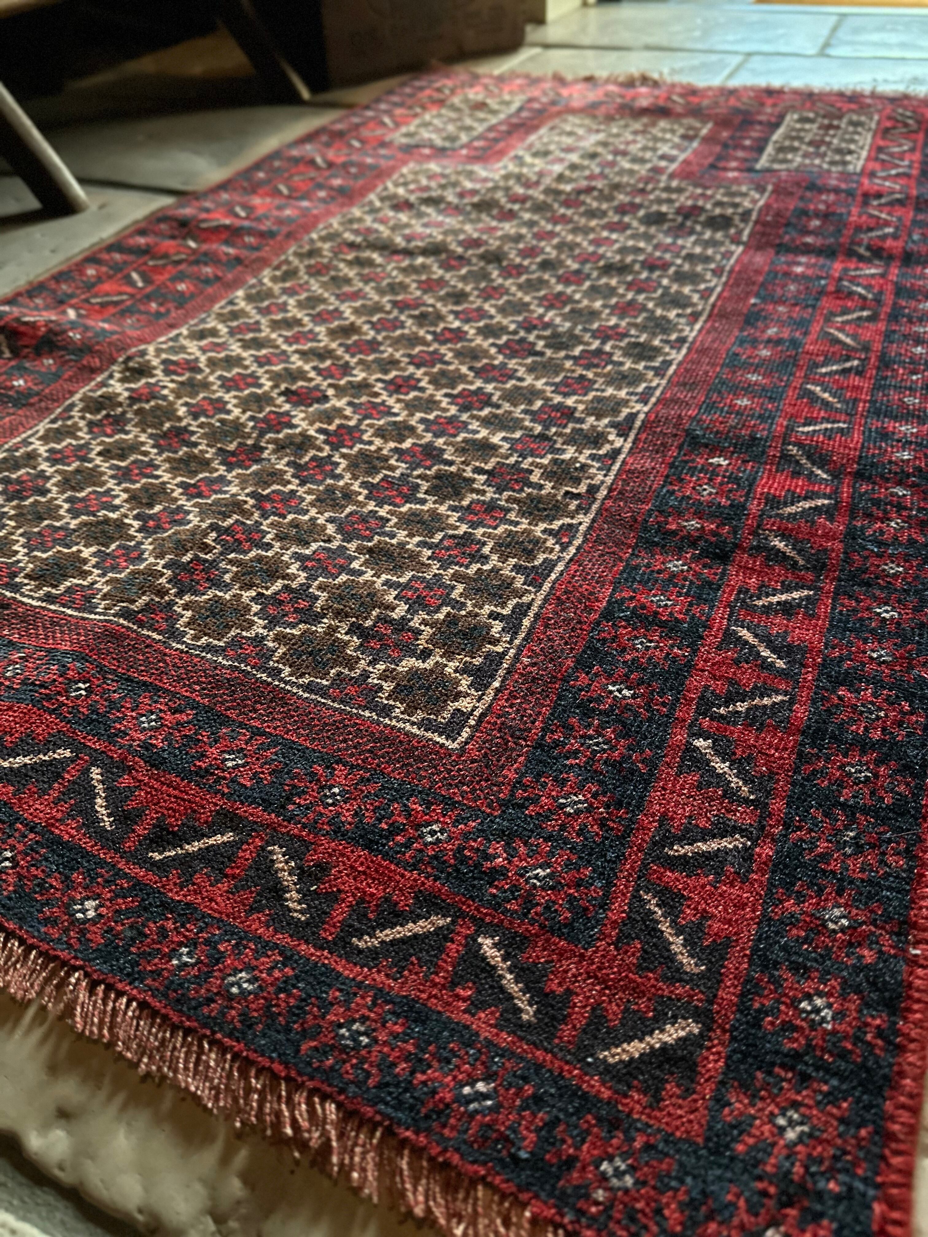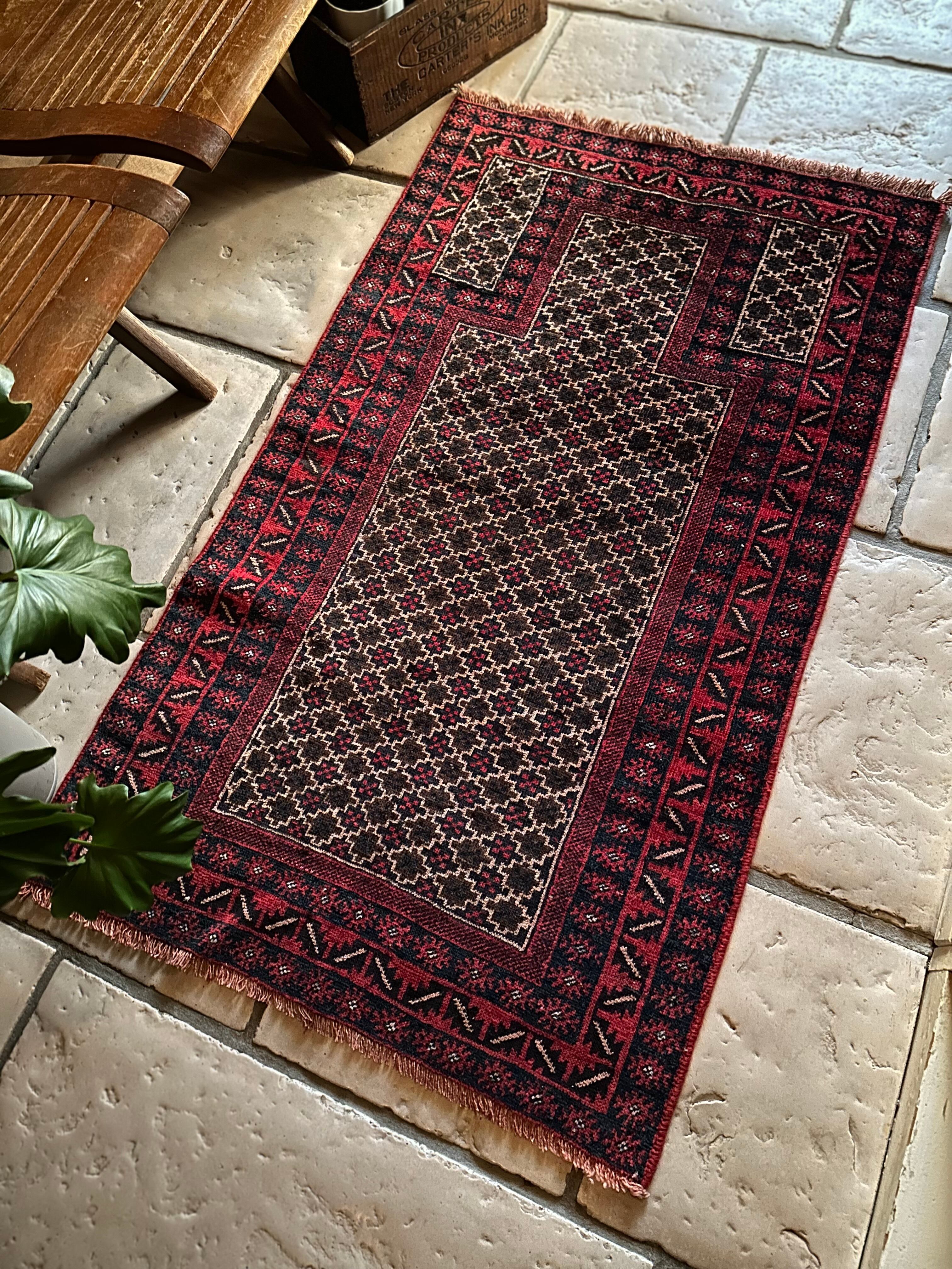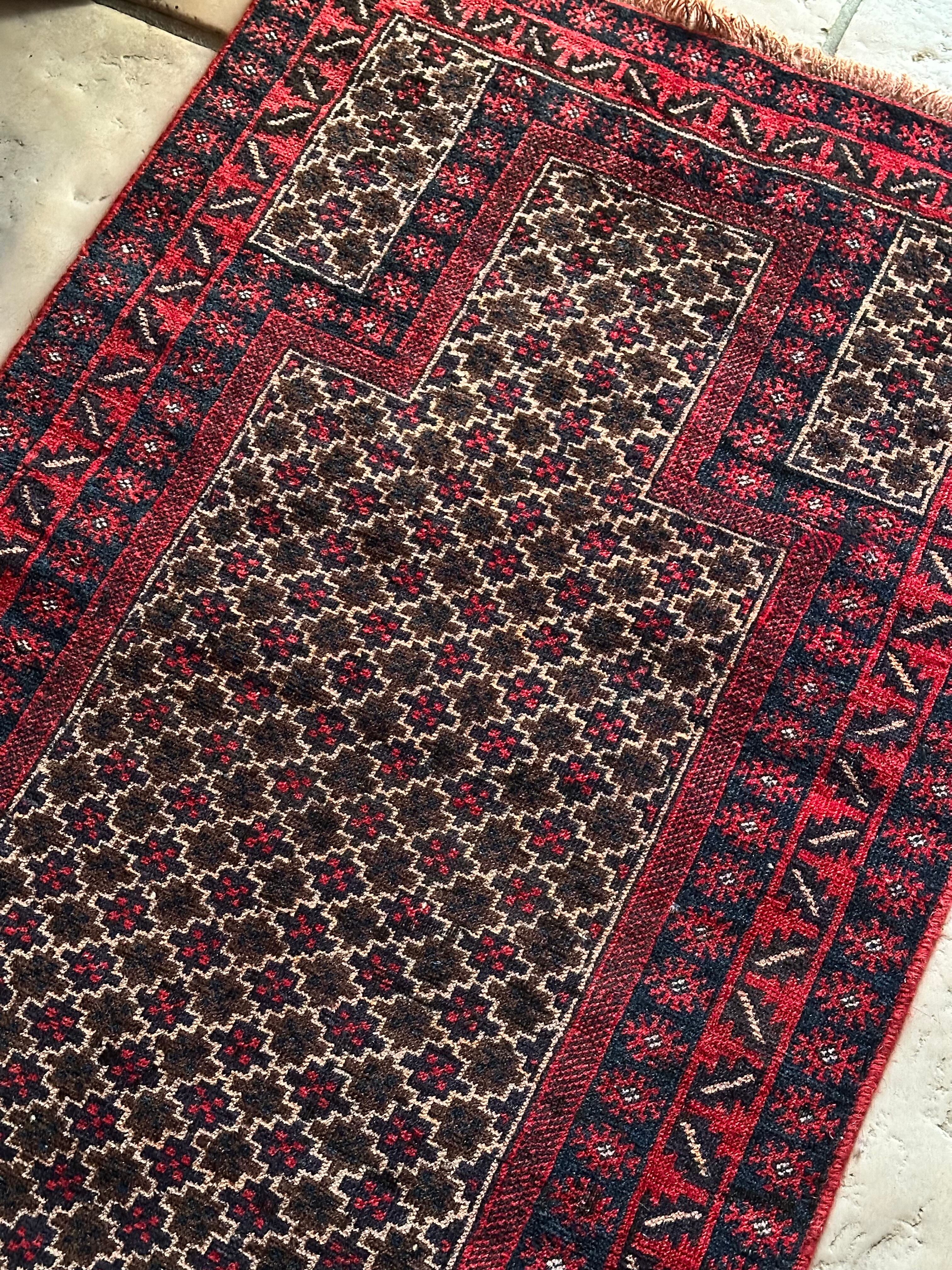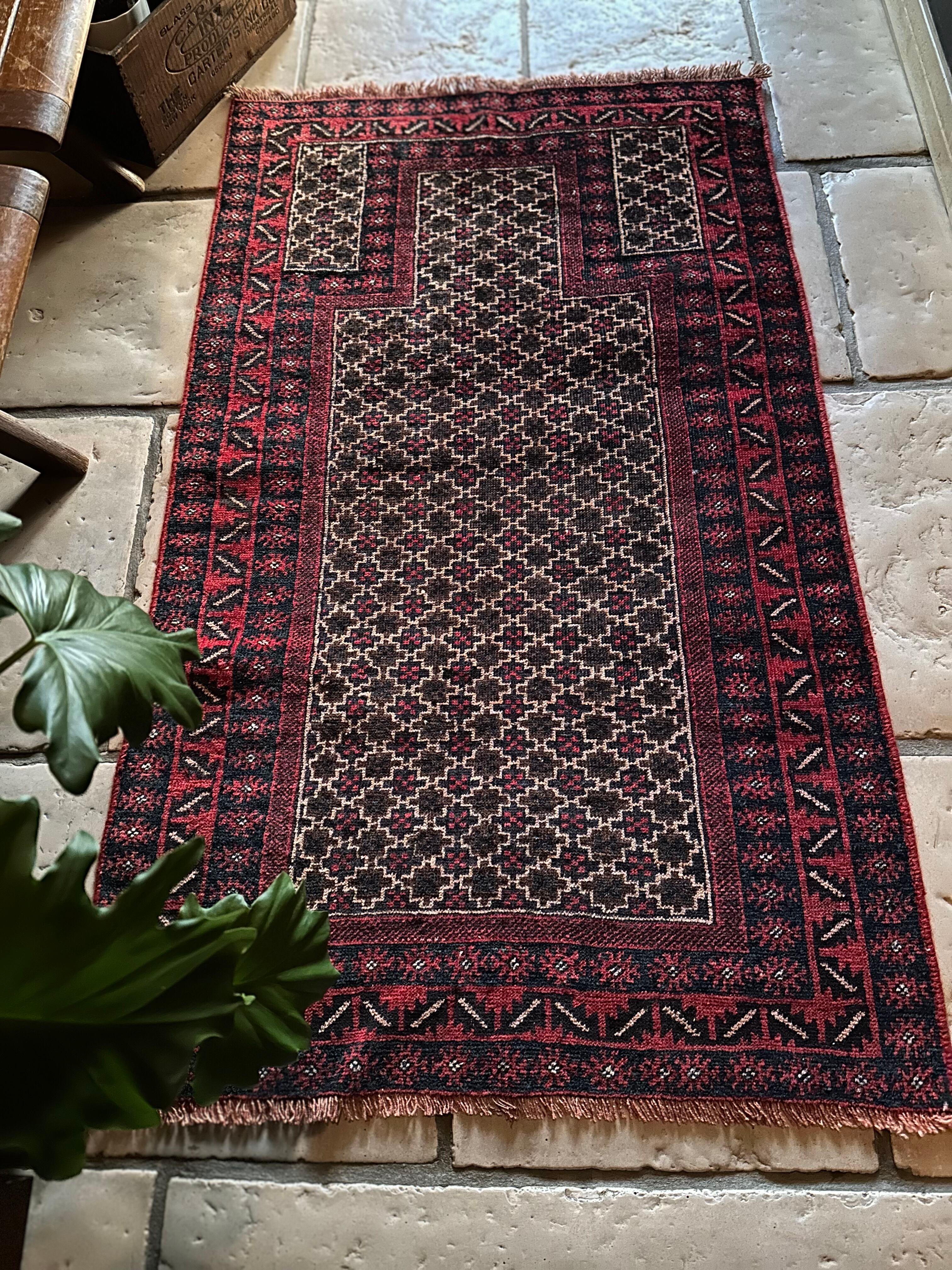 イスラム教信者にとってなくてはならない日々の祈祷用に使われる敷物として、両手に頭を垂れるミフラープが描かれたバルーチ族のプレイヤーラグになります。