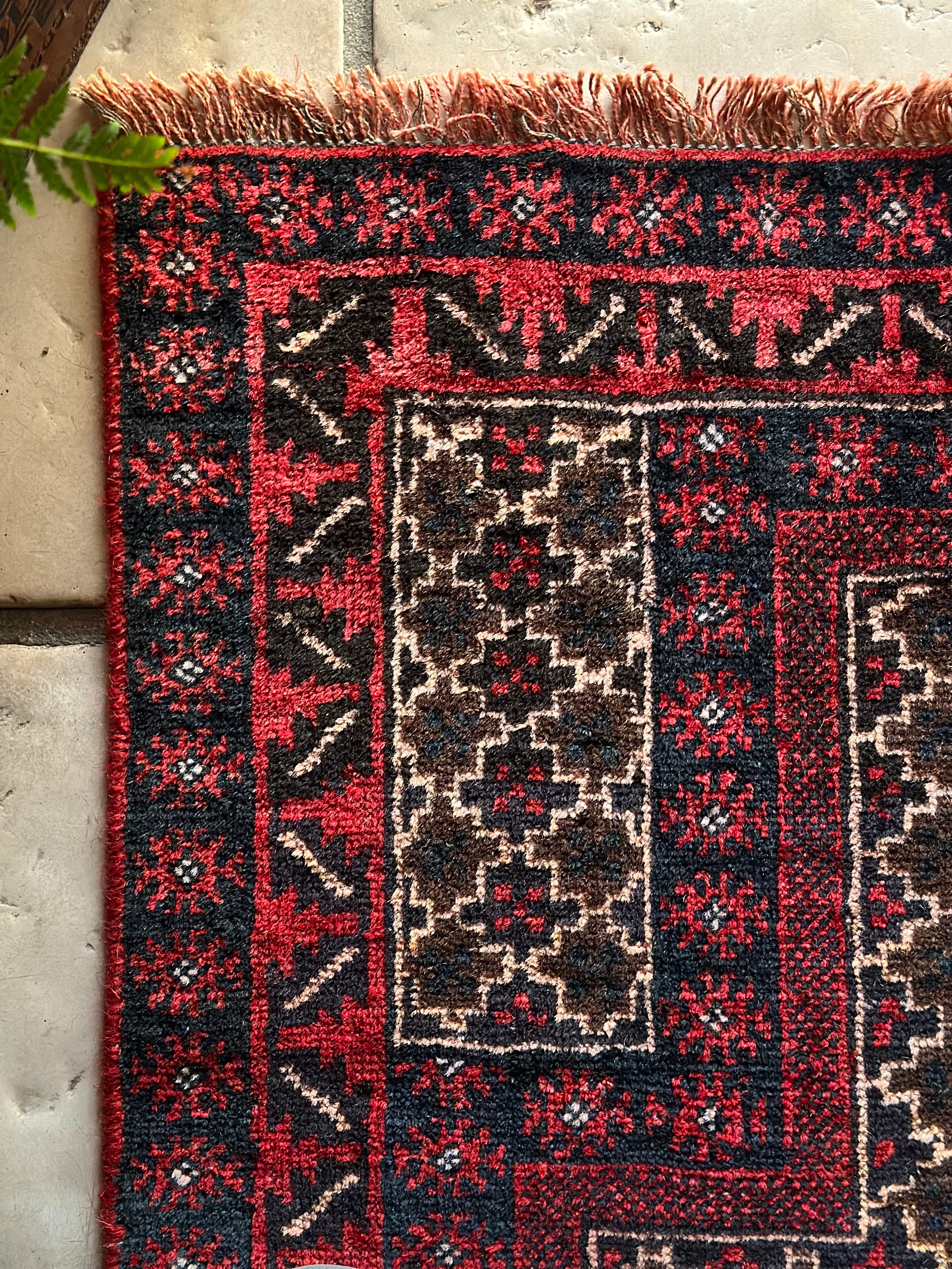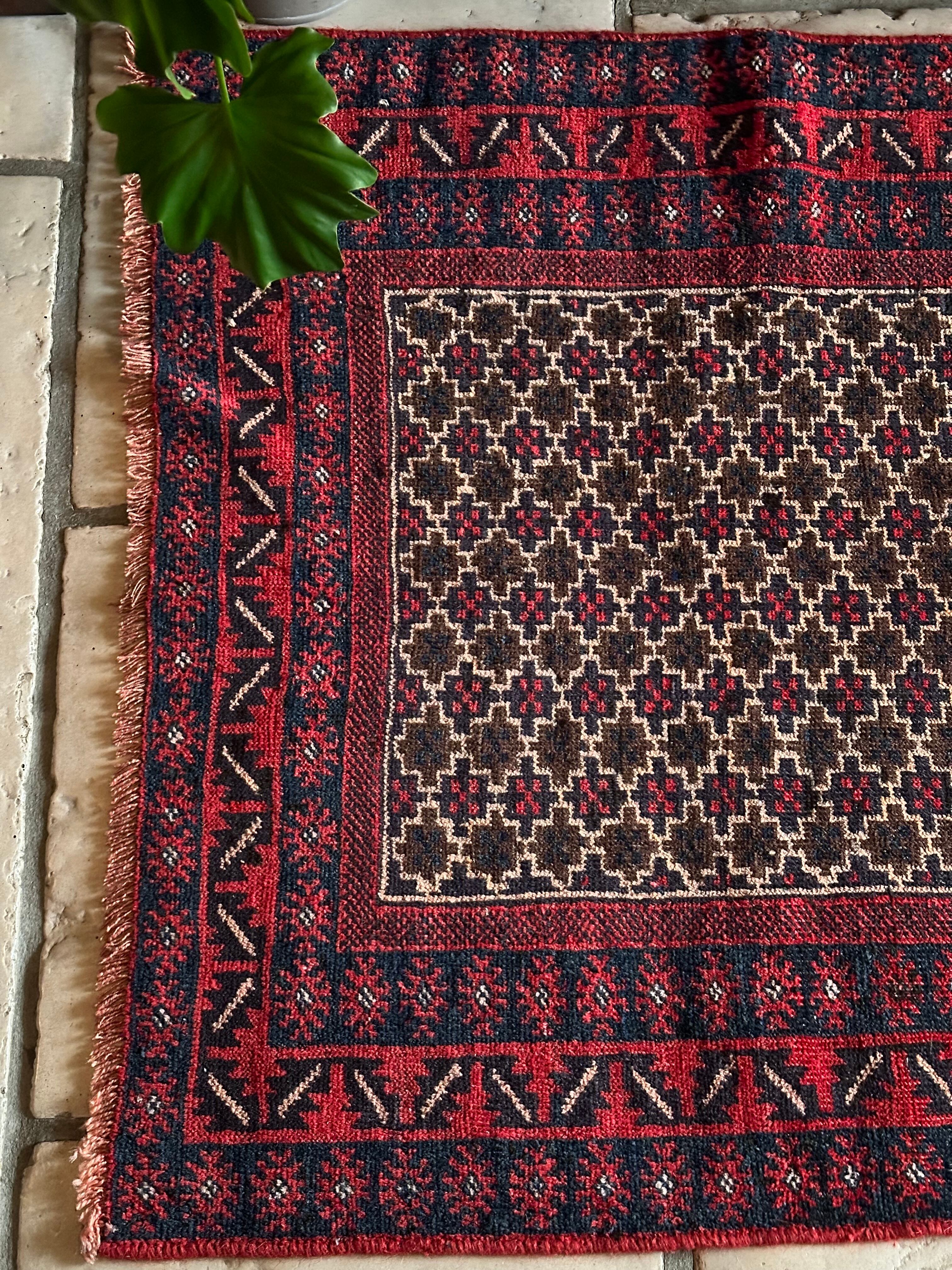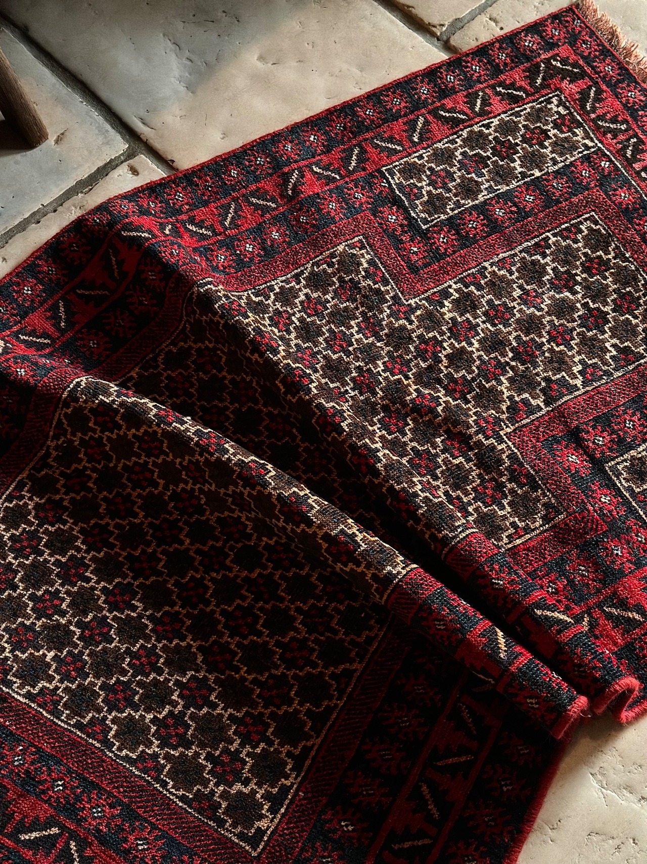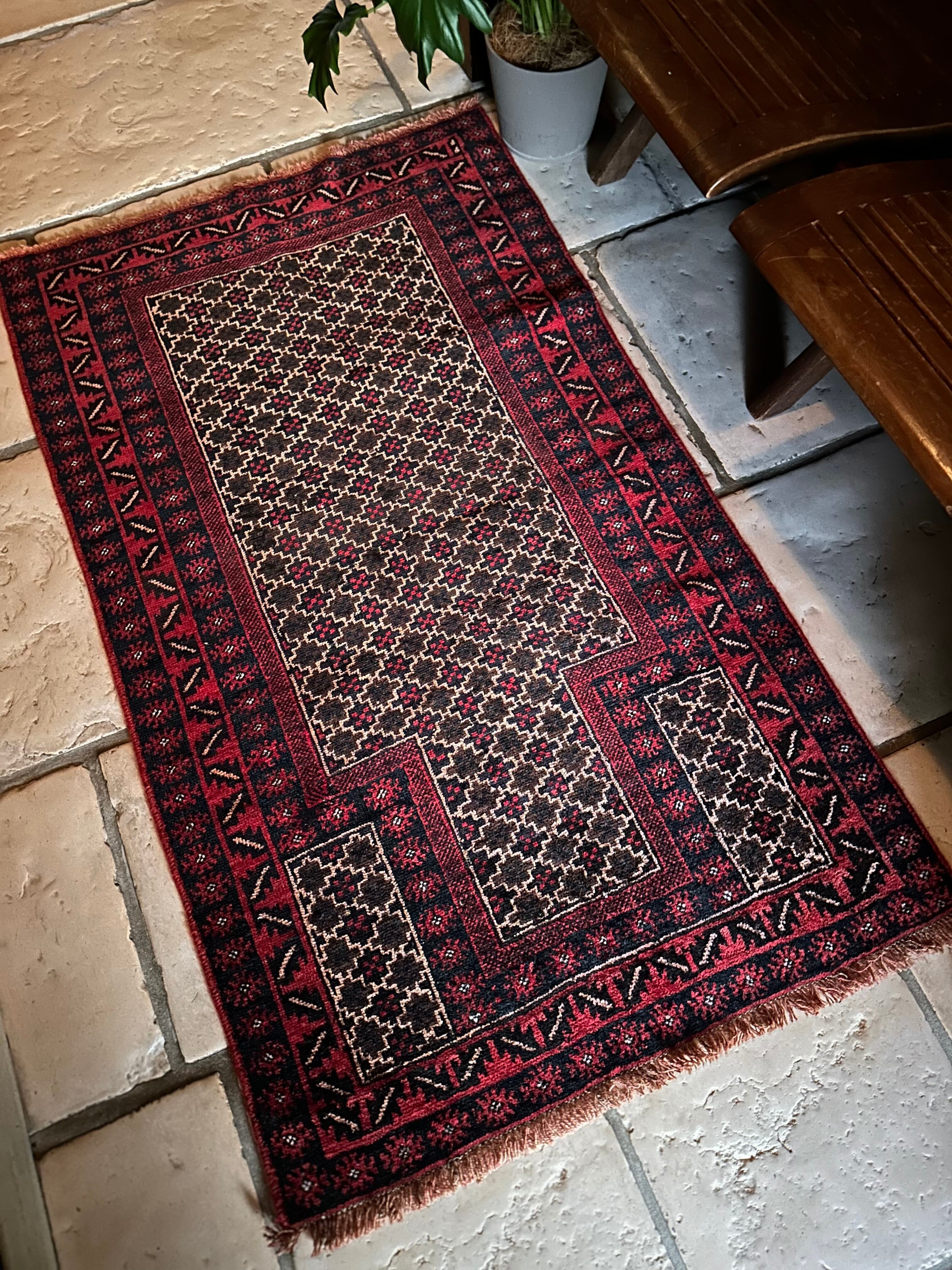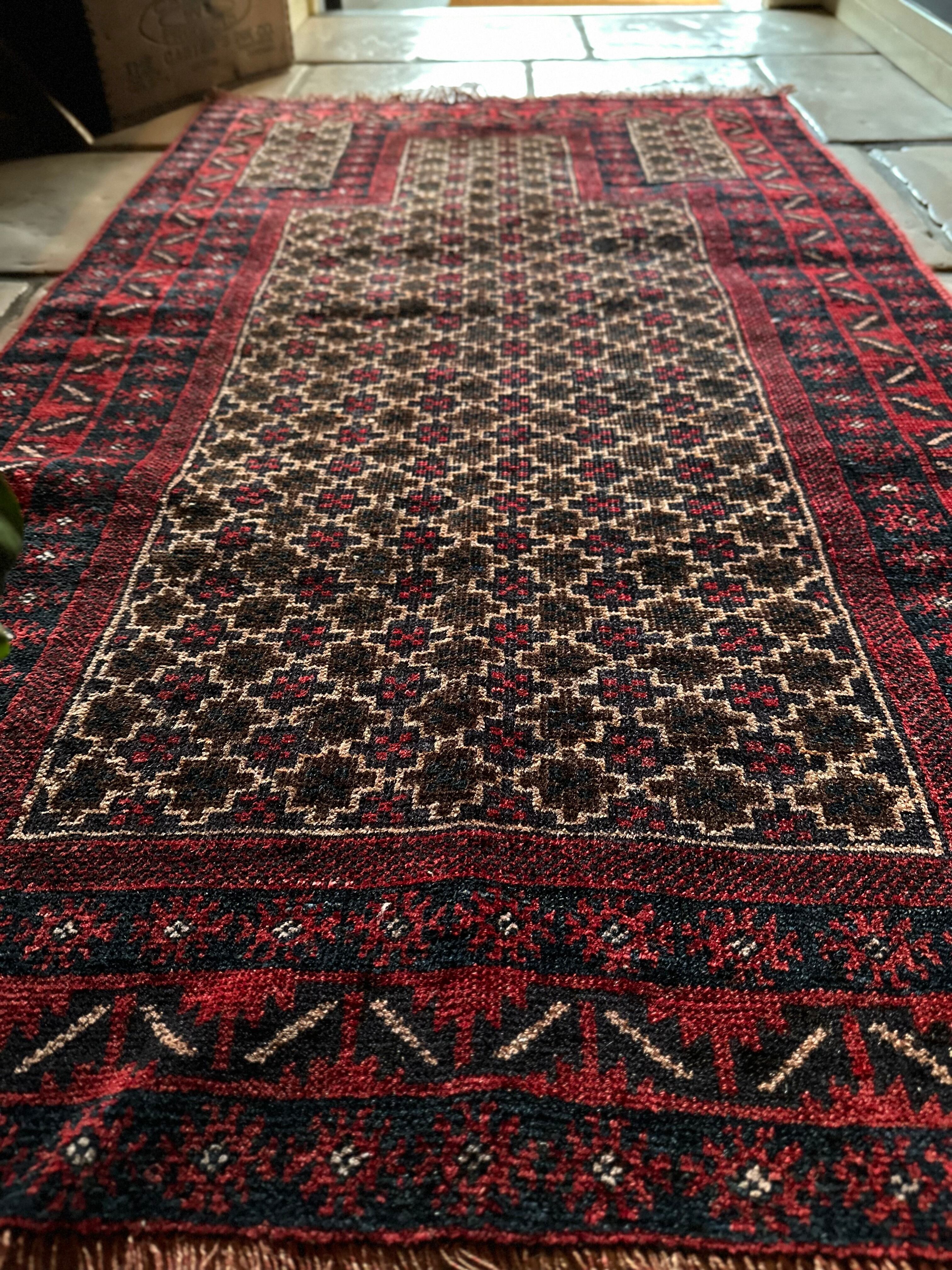 イスラム教信者にとってなくてはならない日々の祈祷用に使われる敷物として、両手に頭を垂れるミフラープが描かれたバルーチ族のプレイヤーラグになります。
