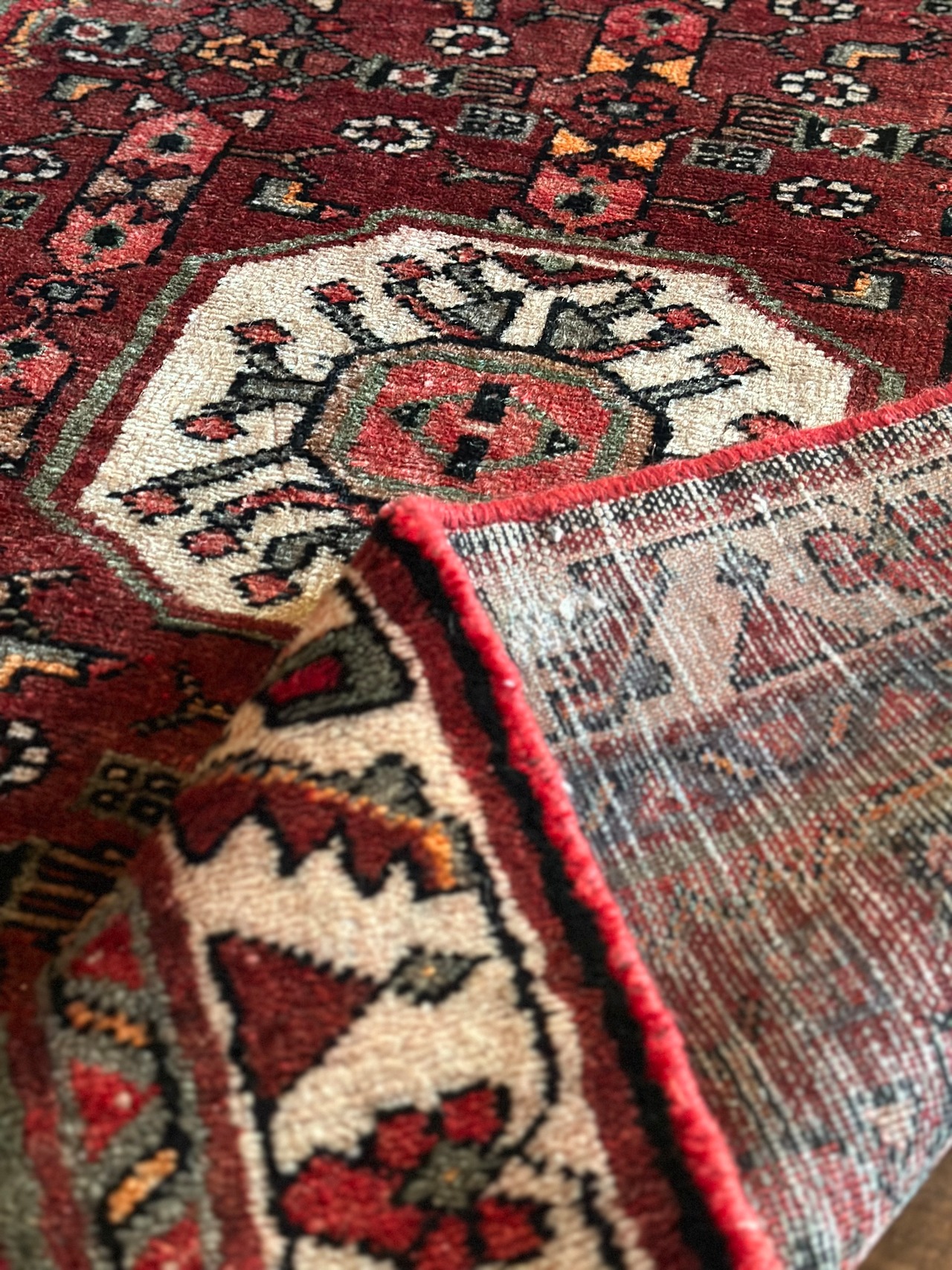 経年としては40年ほど前と思しきこちらは、それなりの使用感に色褪せ具合がヴィンテージラグっぽく、特に目立つダメージや気になるリペアはありませんが、写真に収めた箇所に5ミリ大のパイルが固くなった部分がありますのでご確認ください。また全体的な雰囲気は下記URLの Instagramにて最後の動画(室内での自然光にて撮影)を参照して下さい。
