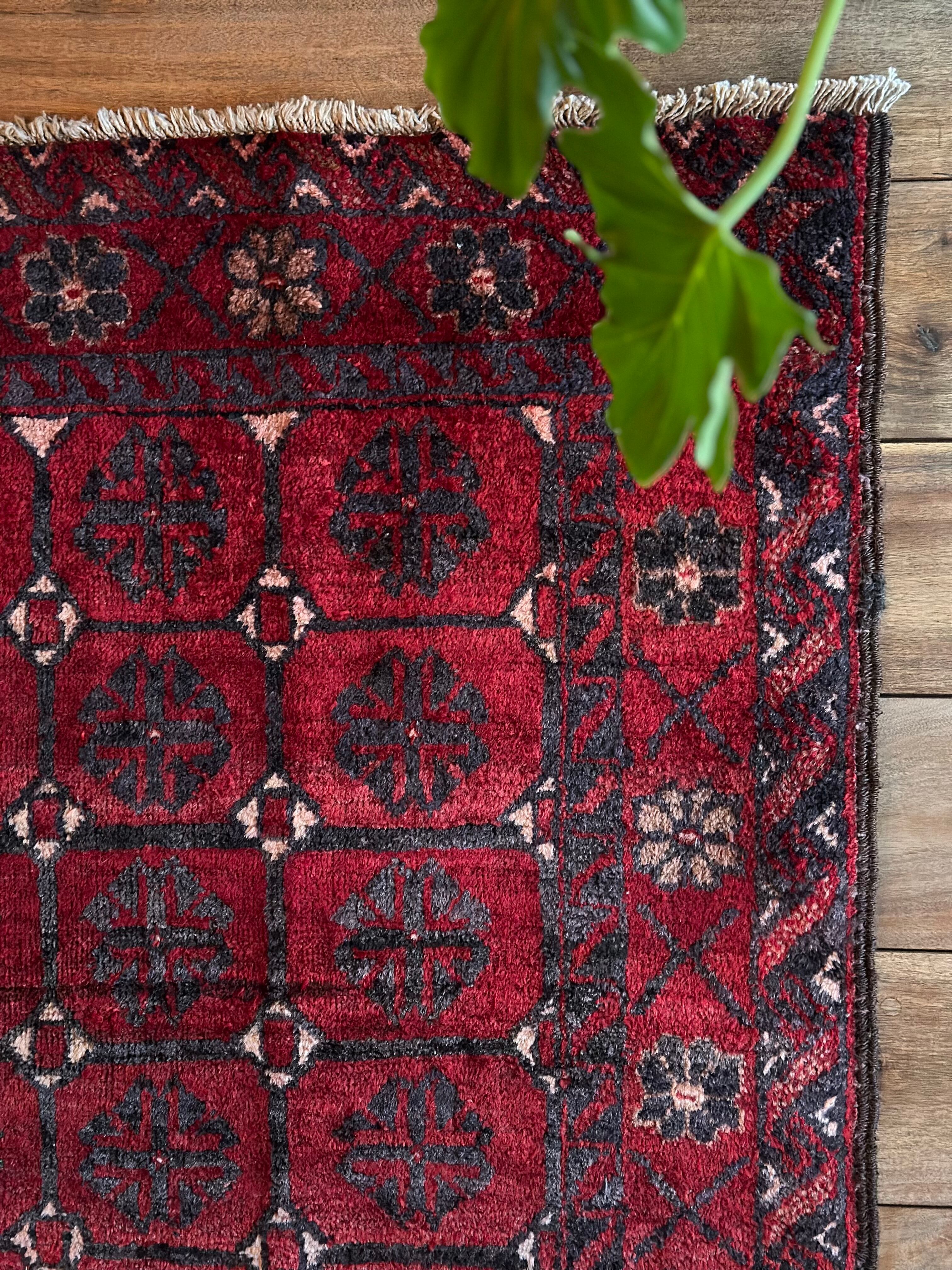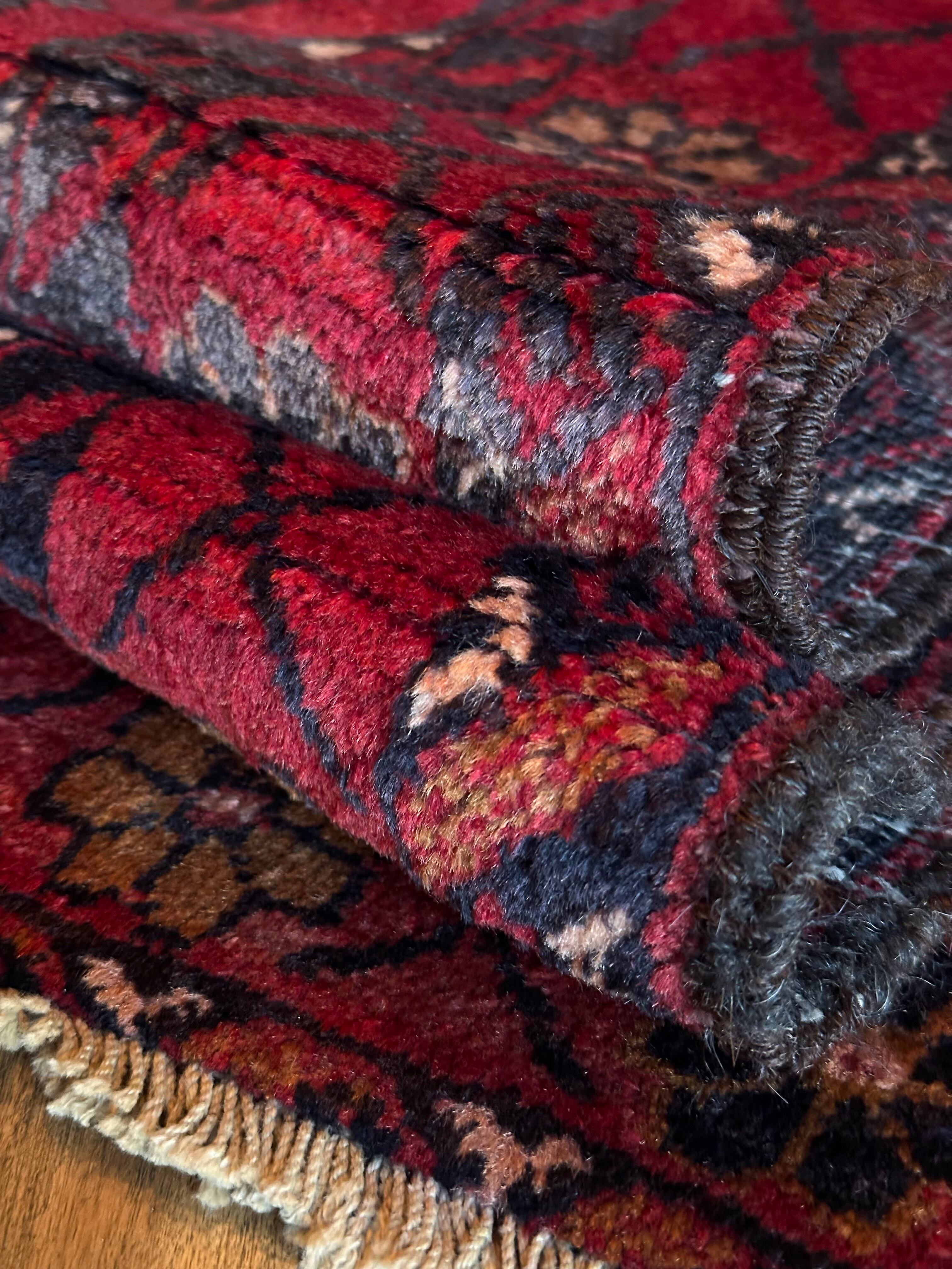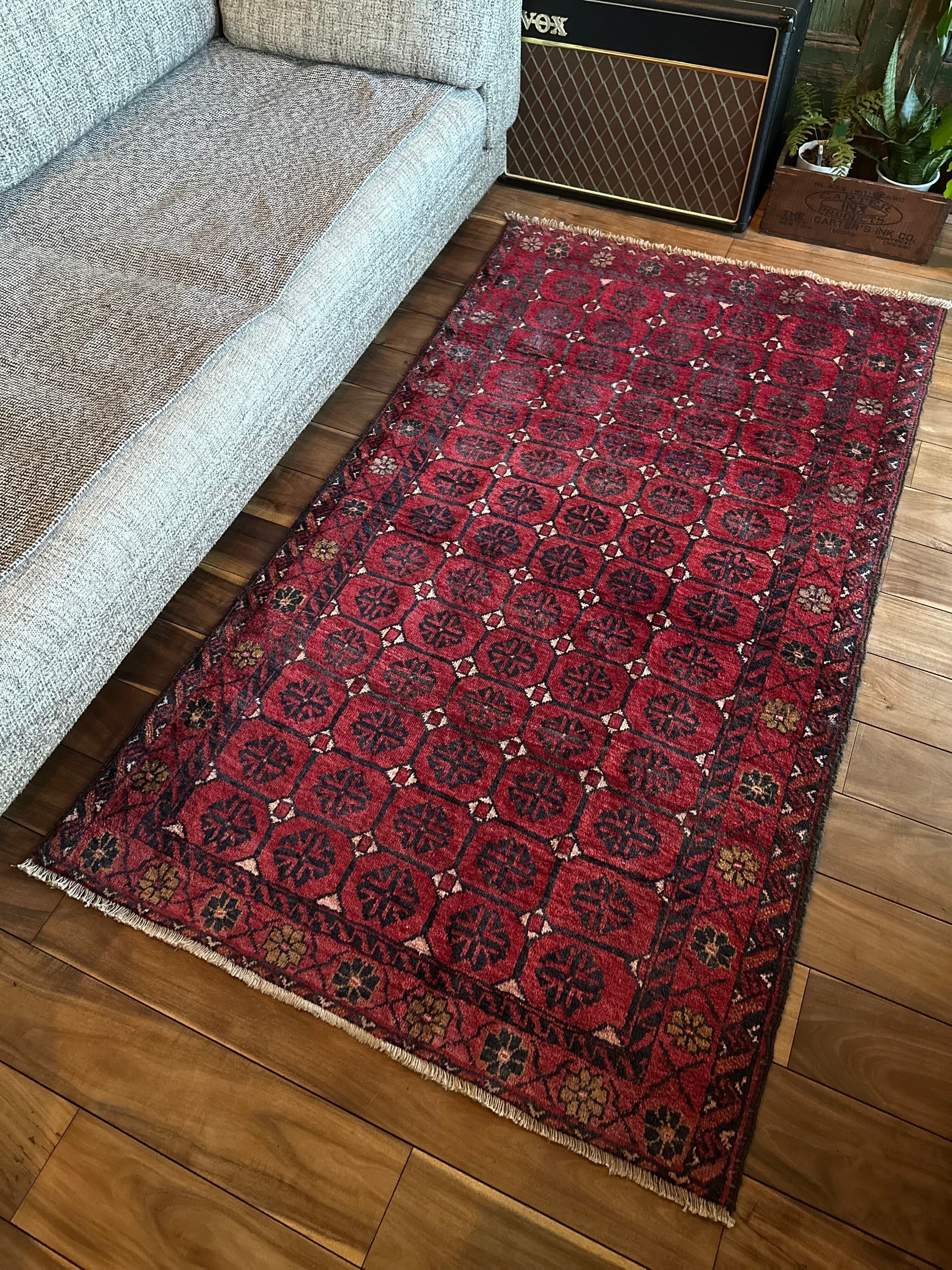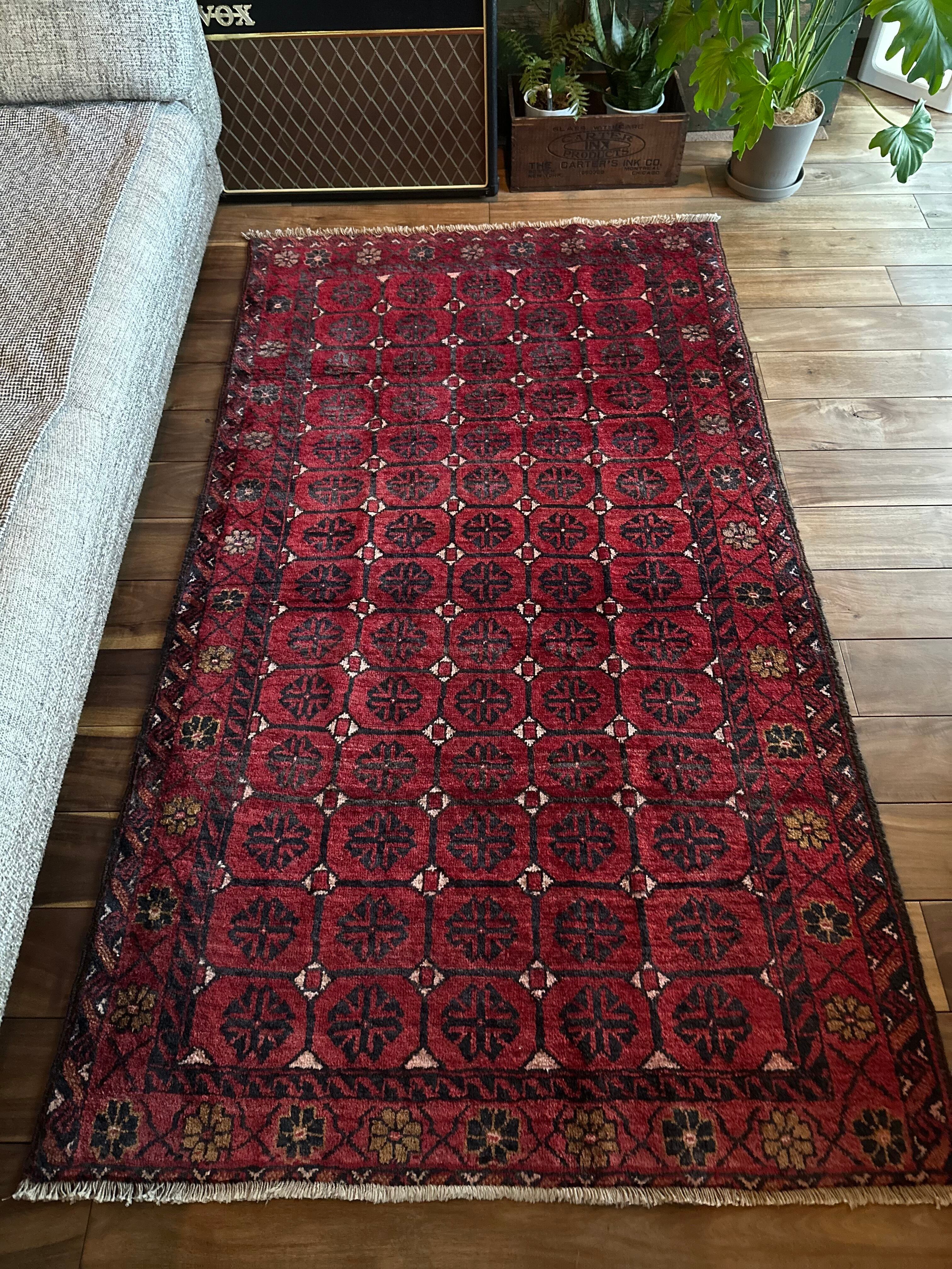擦り切れたパイルの風合いにヴィンテージラグらしい褐色がかったボルドーがプリミティブでかっこいいバルーチ族のトライバルラグになります。