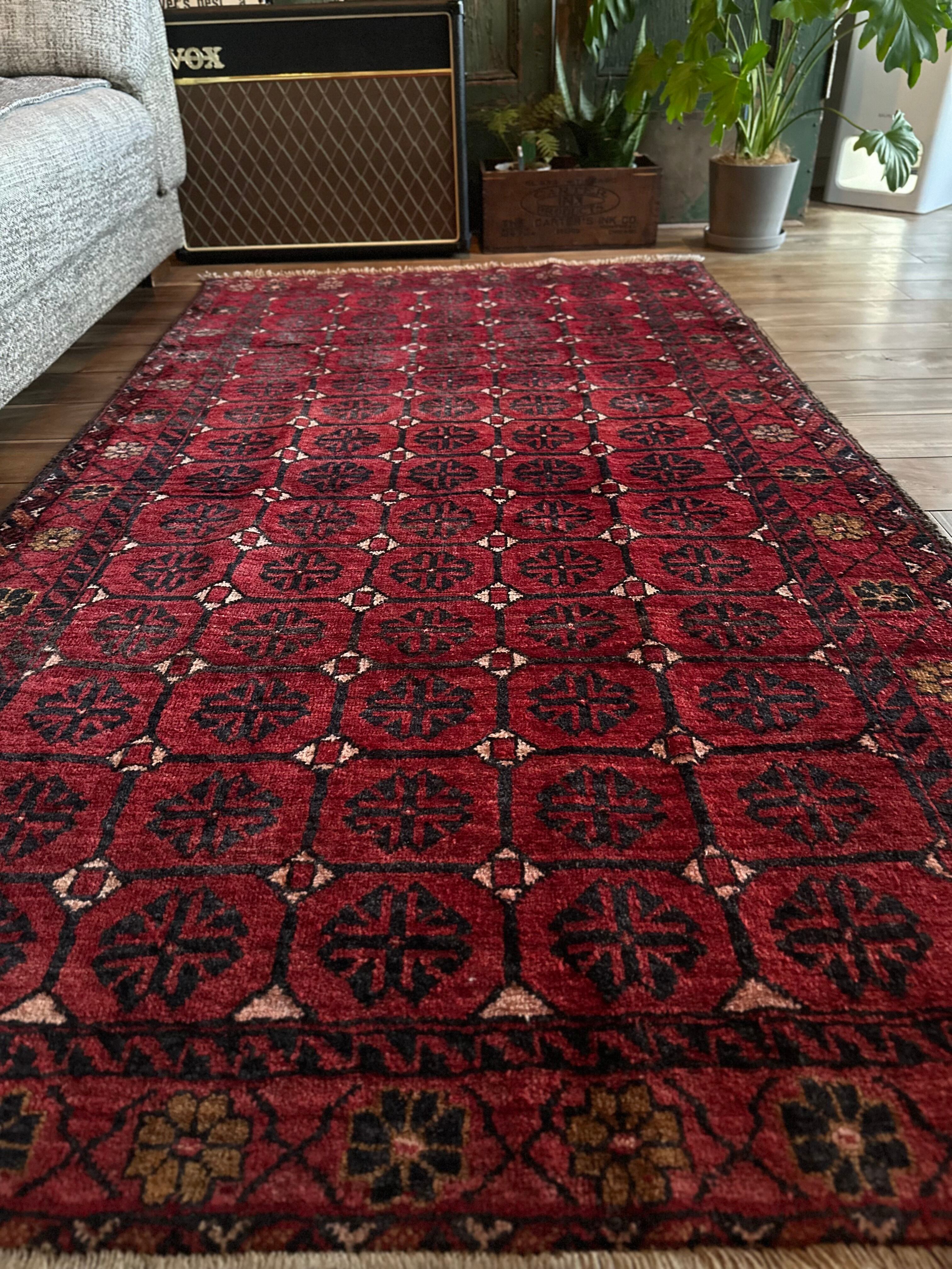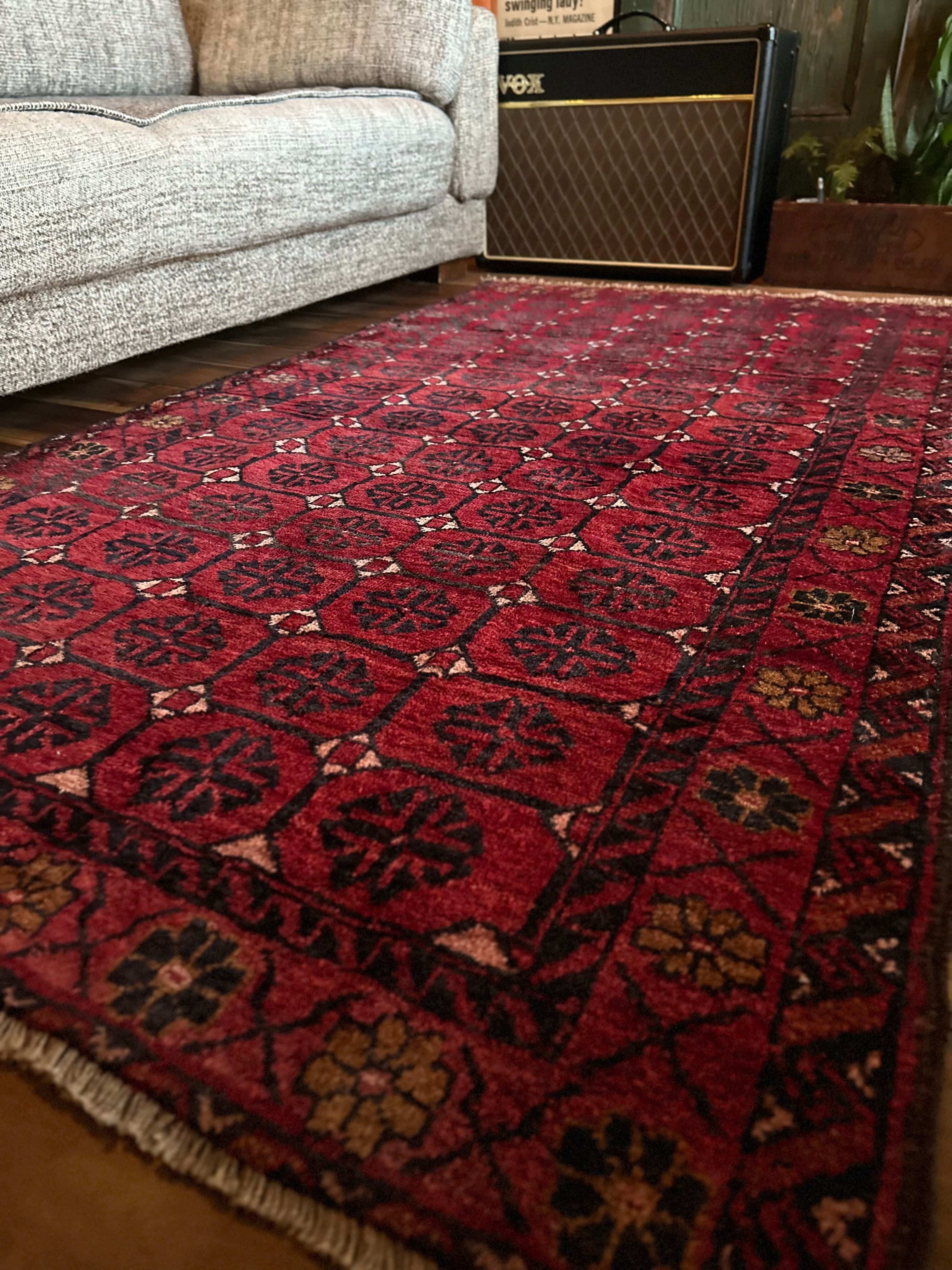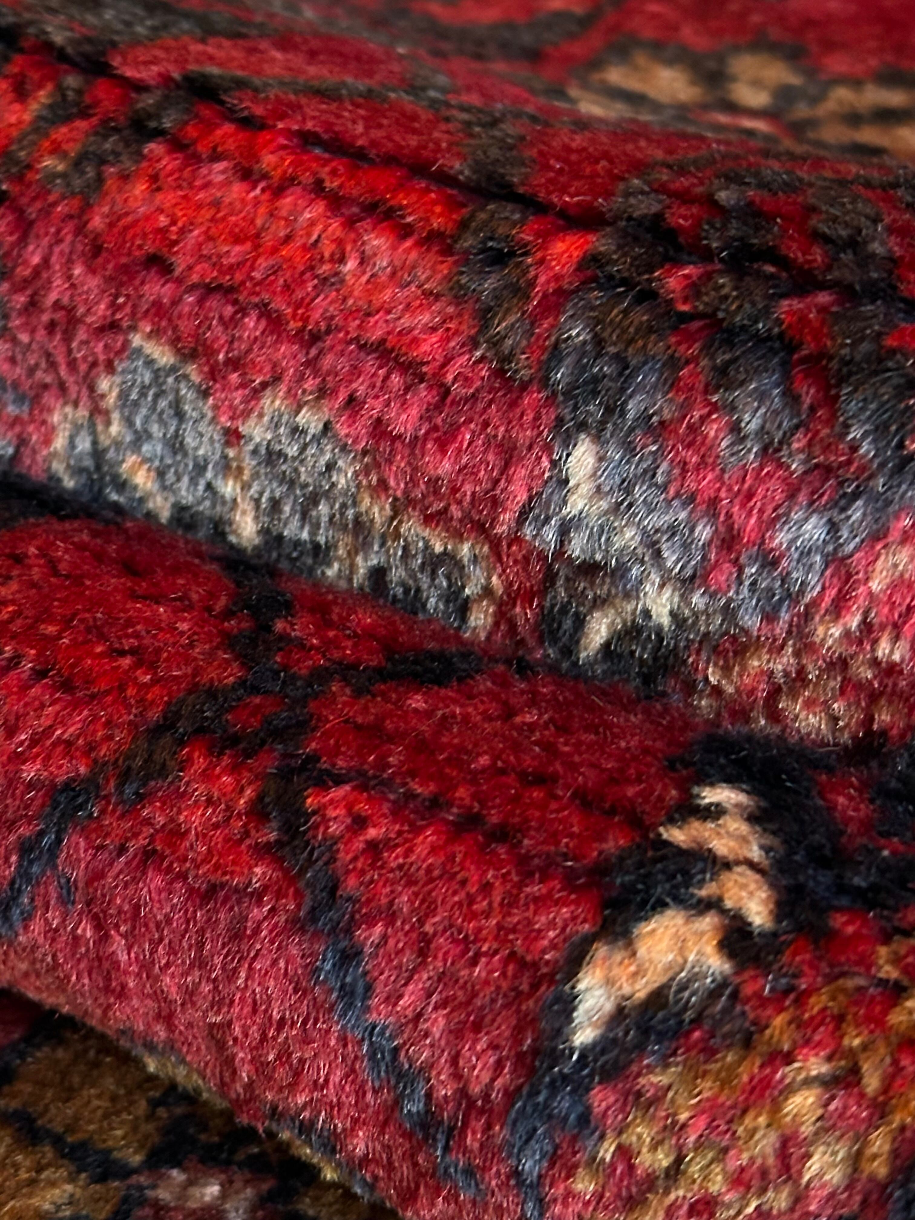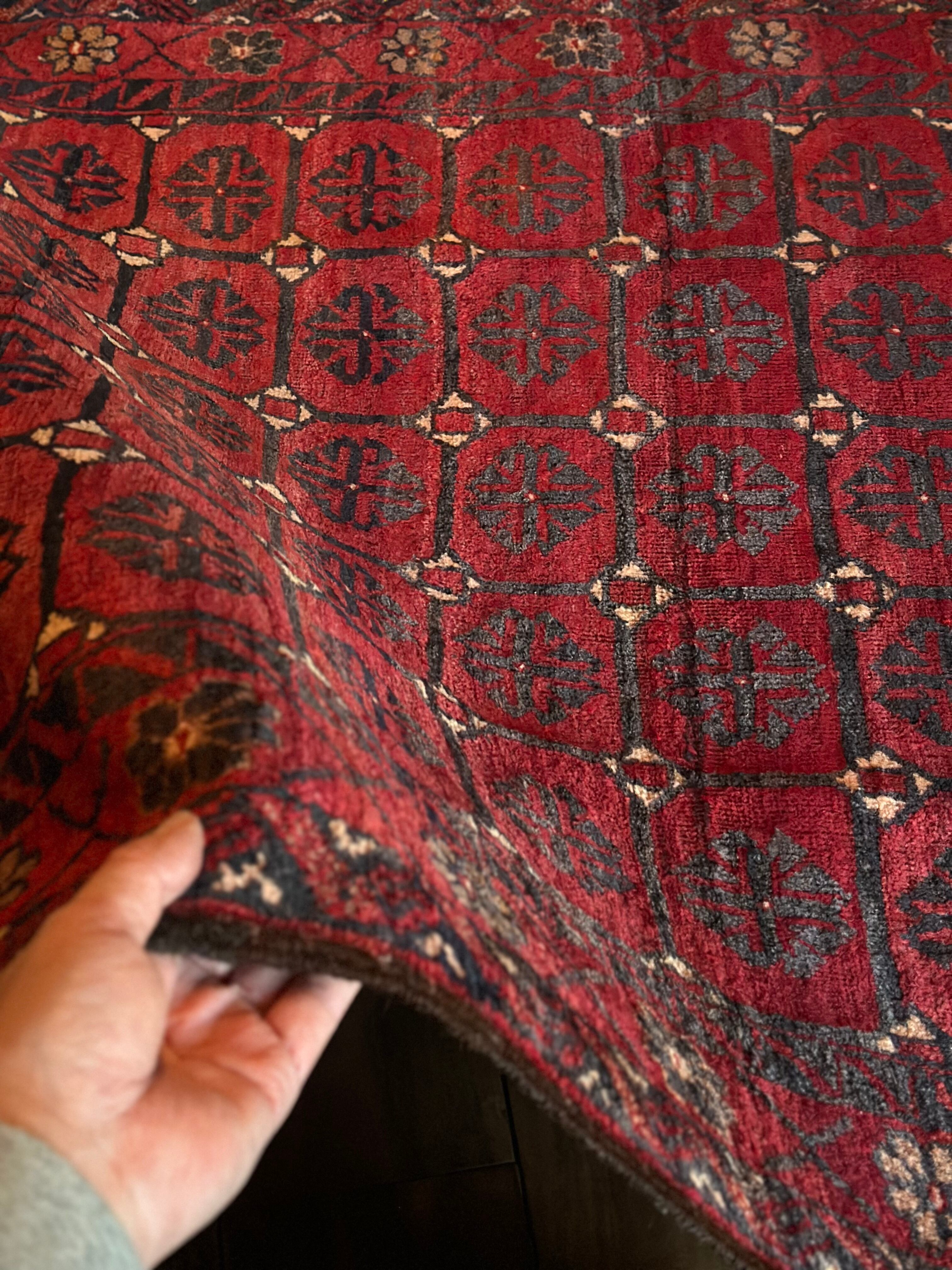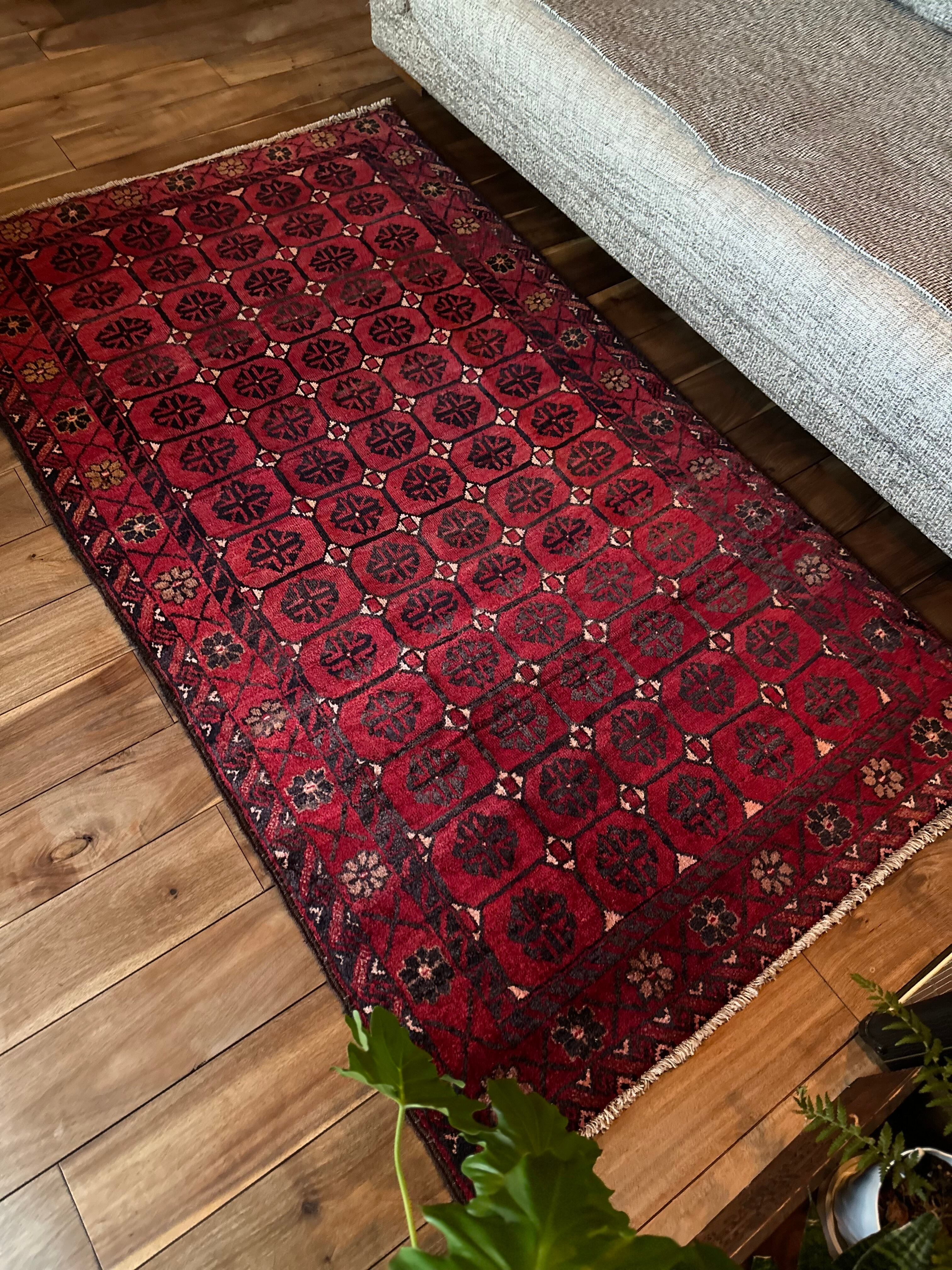 擦り切れたパイルの風合いにヴィンテージラグらしい褐色がかったボルドーがプリミティブでかっこいいバルーチ族のトライバルラグになります。