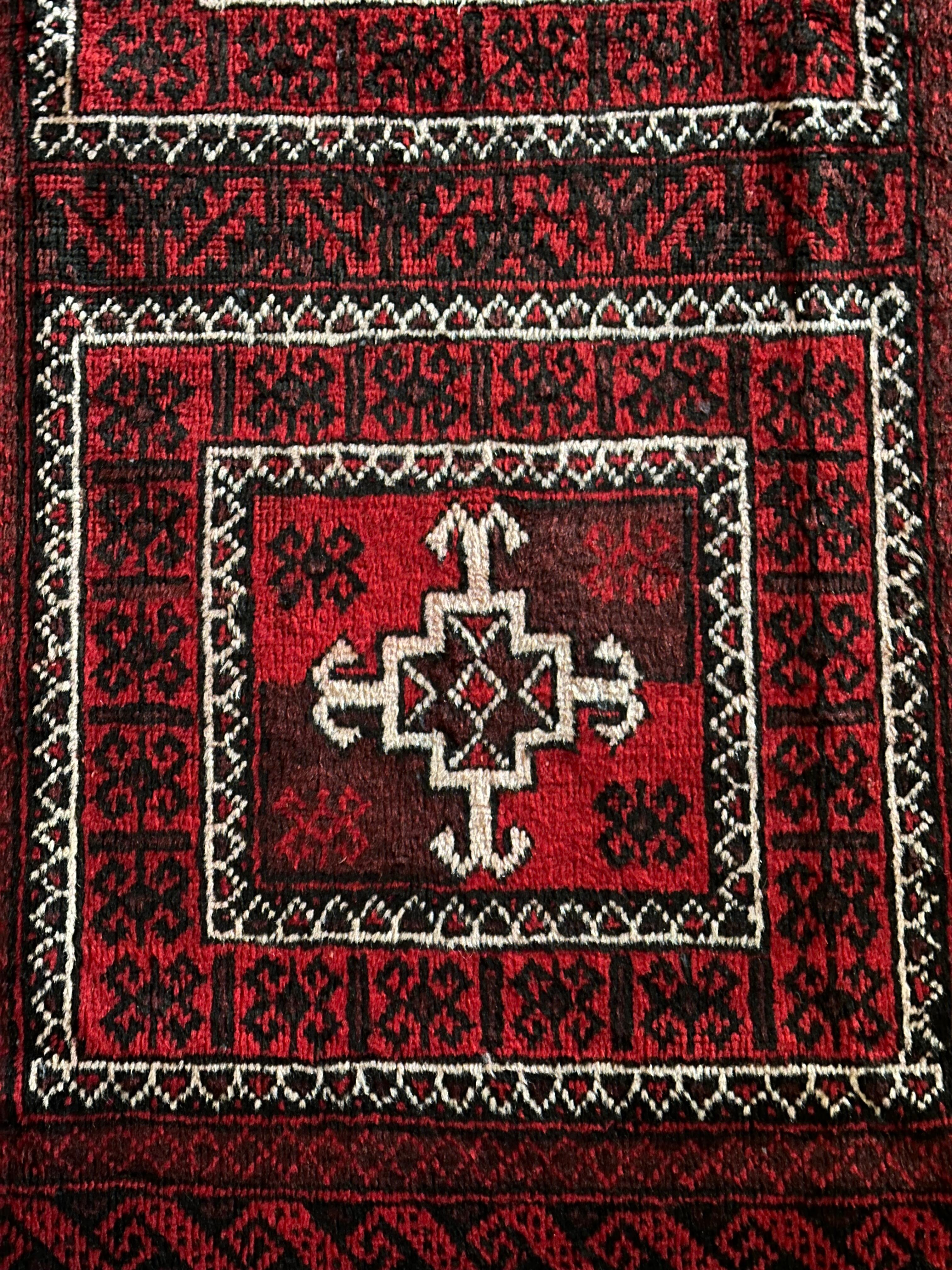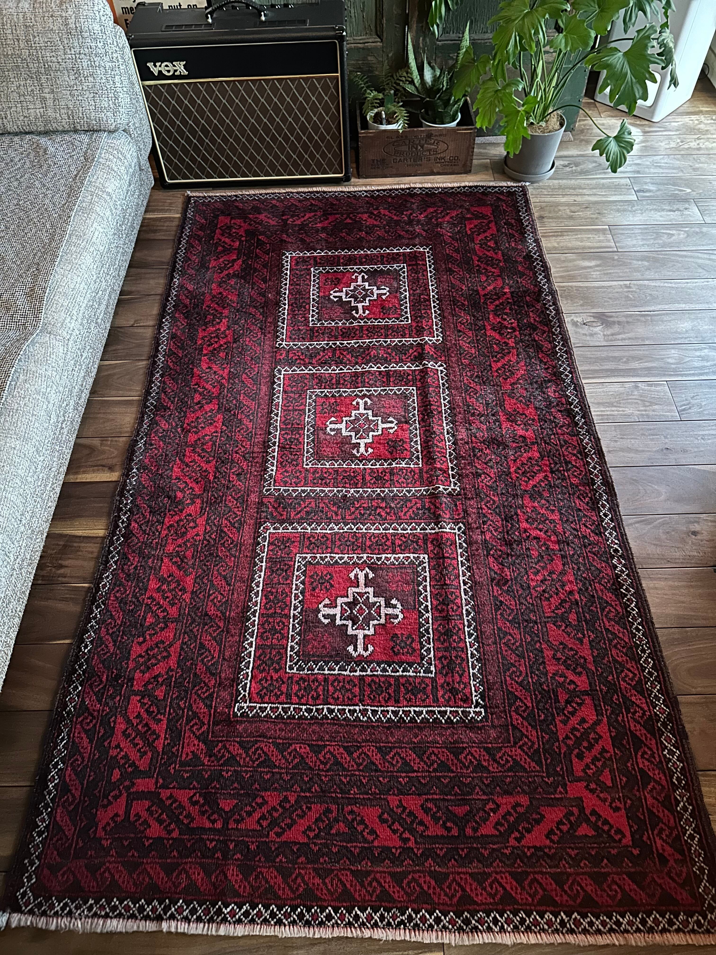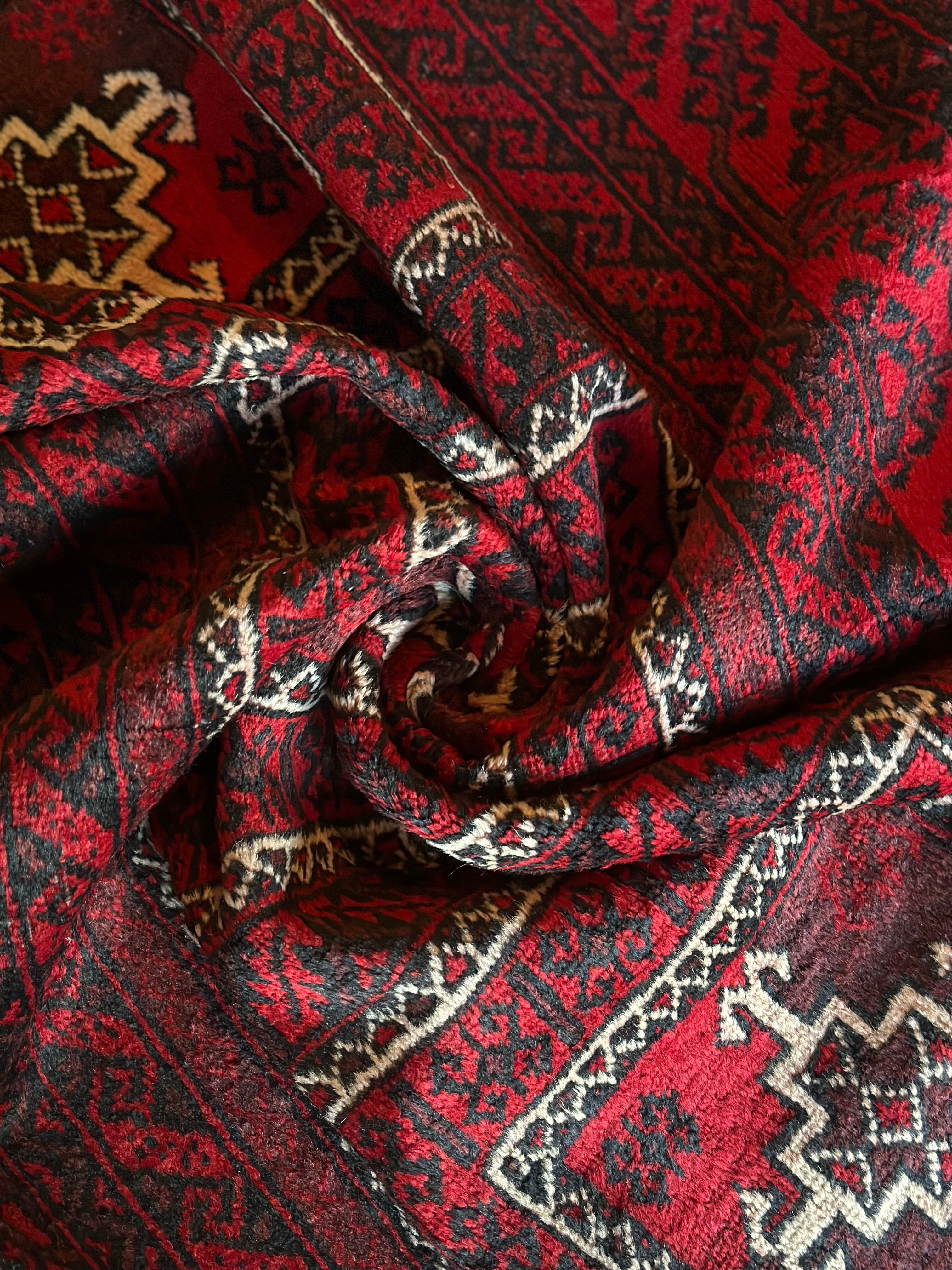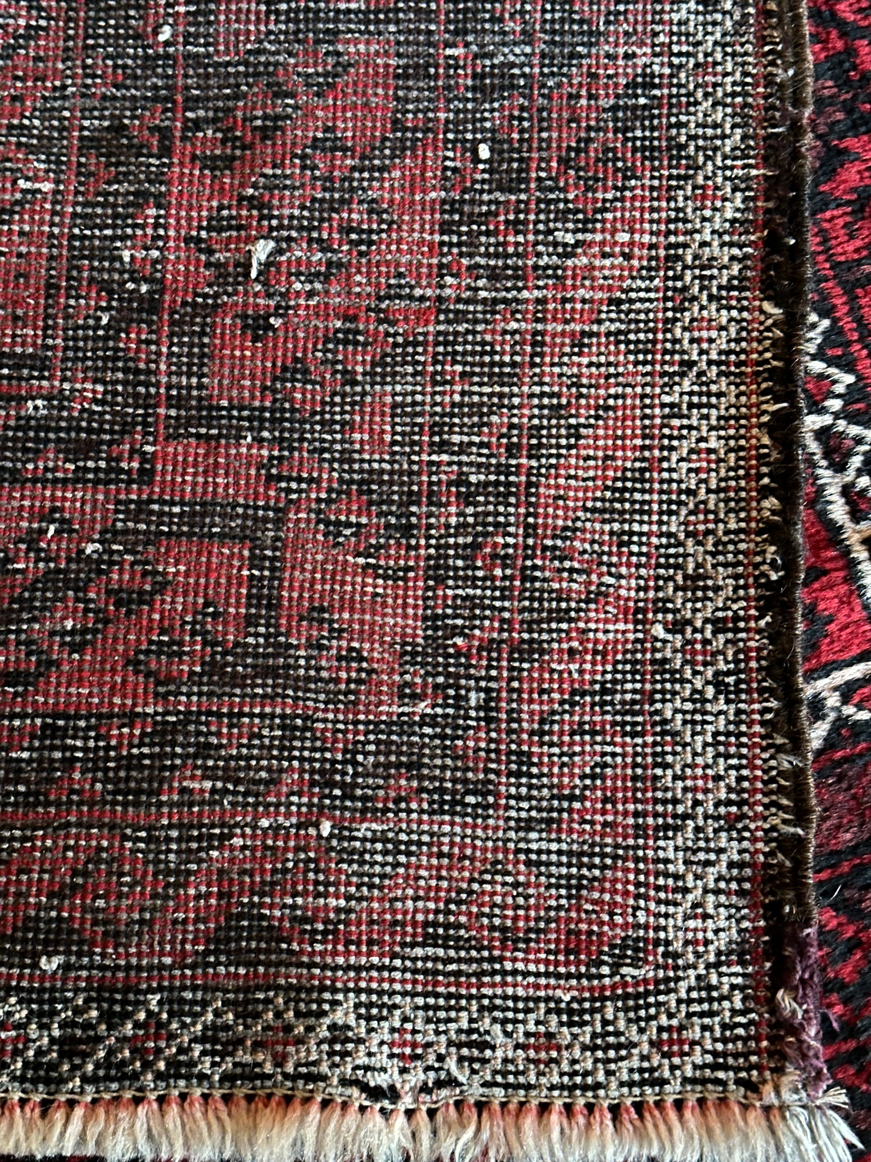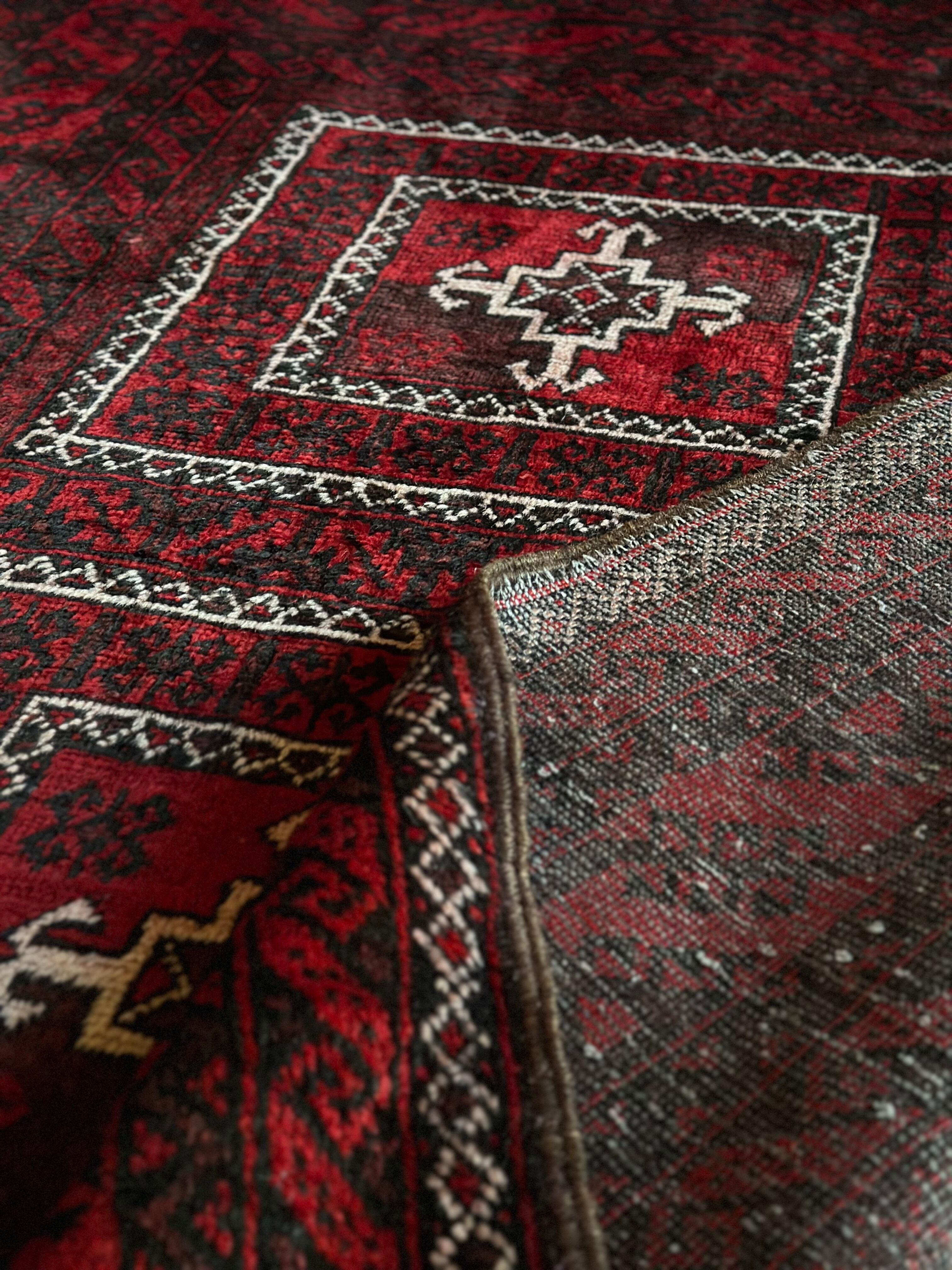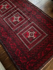 全体的に深みのある赤に黒を基調としながら、ハイライトに使われる白が浮きだって見えるバルーチ族のトライバルラグになります。