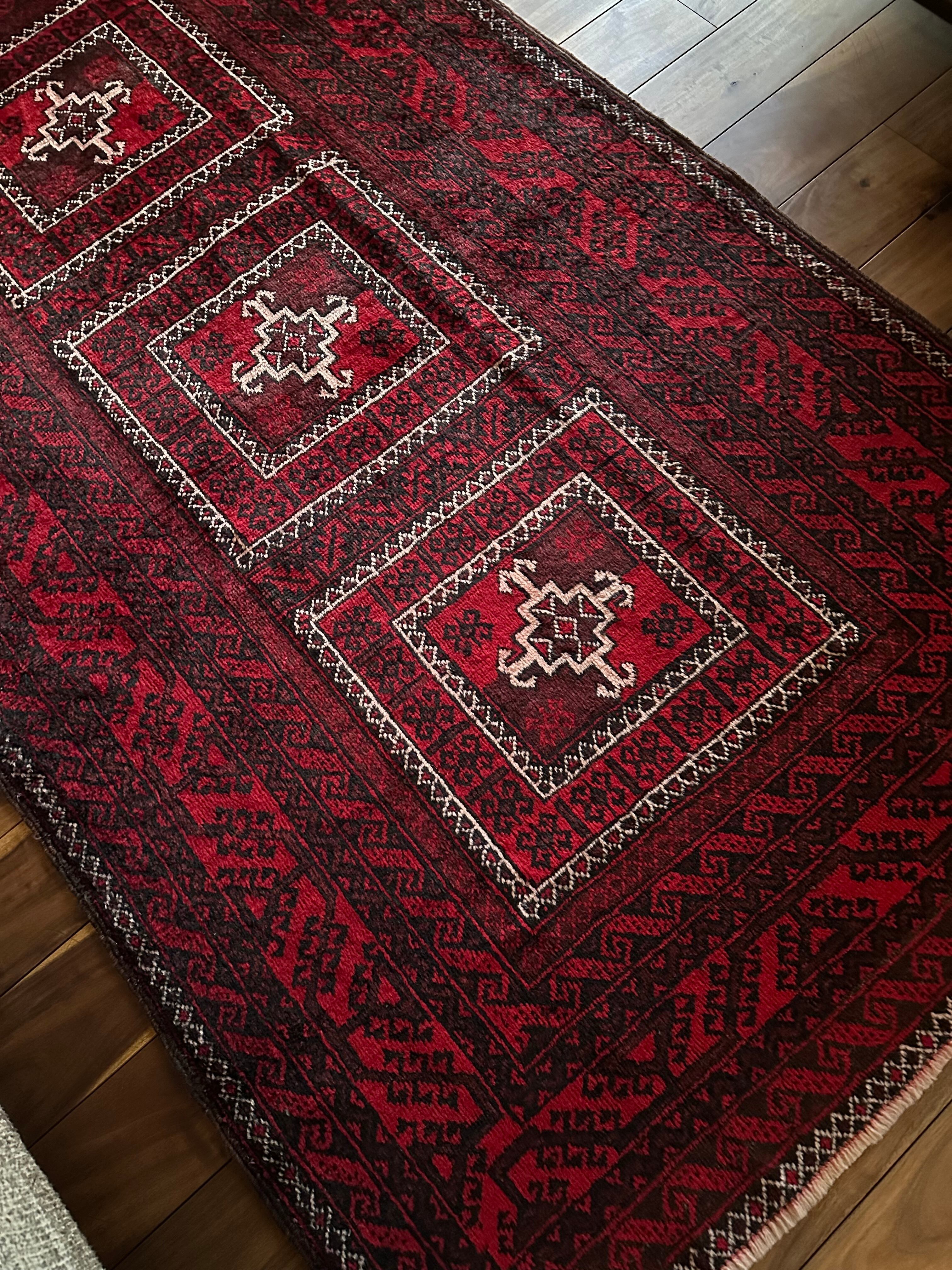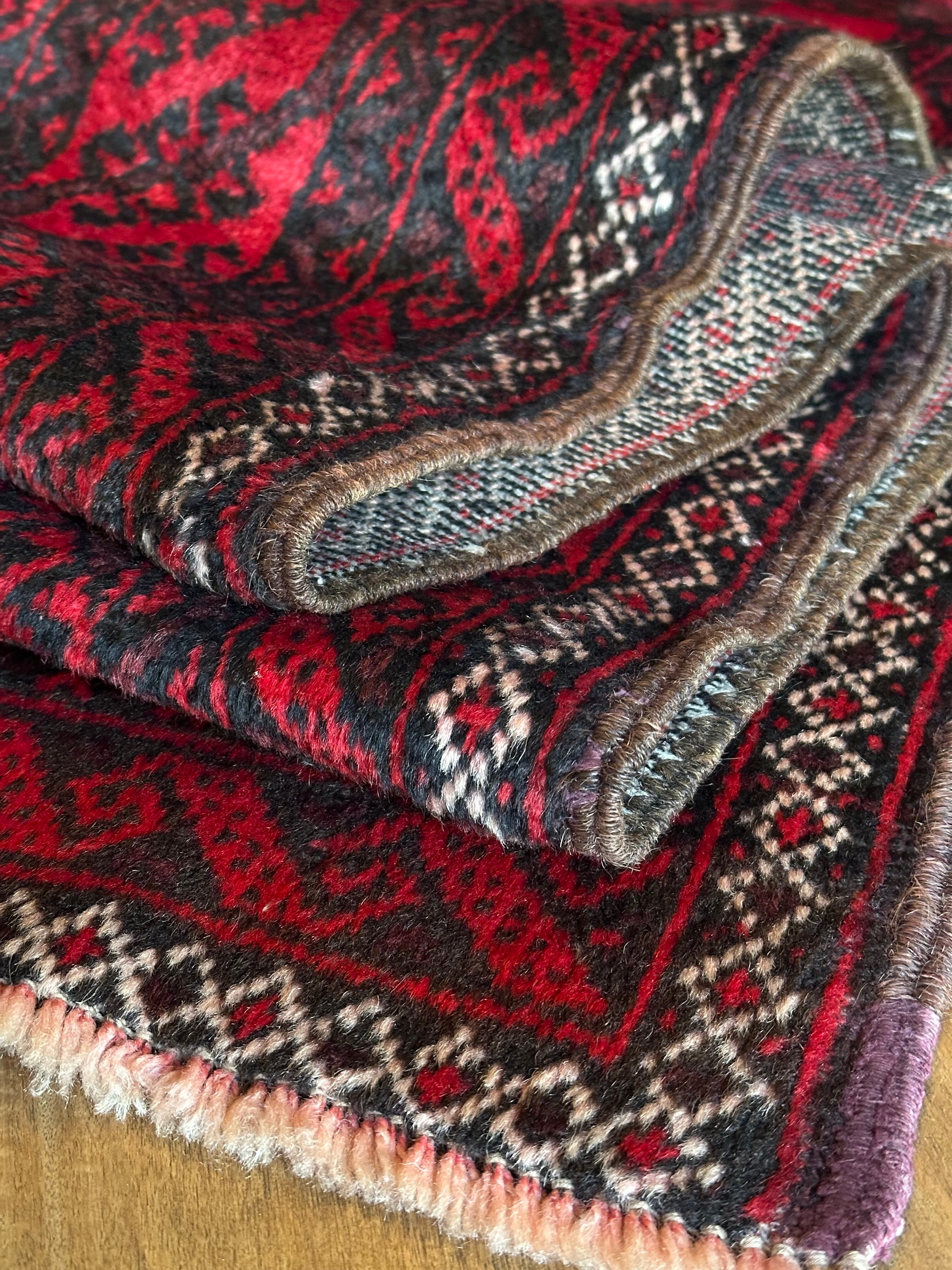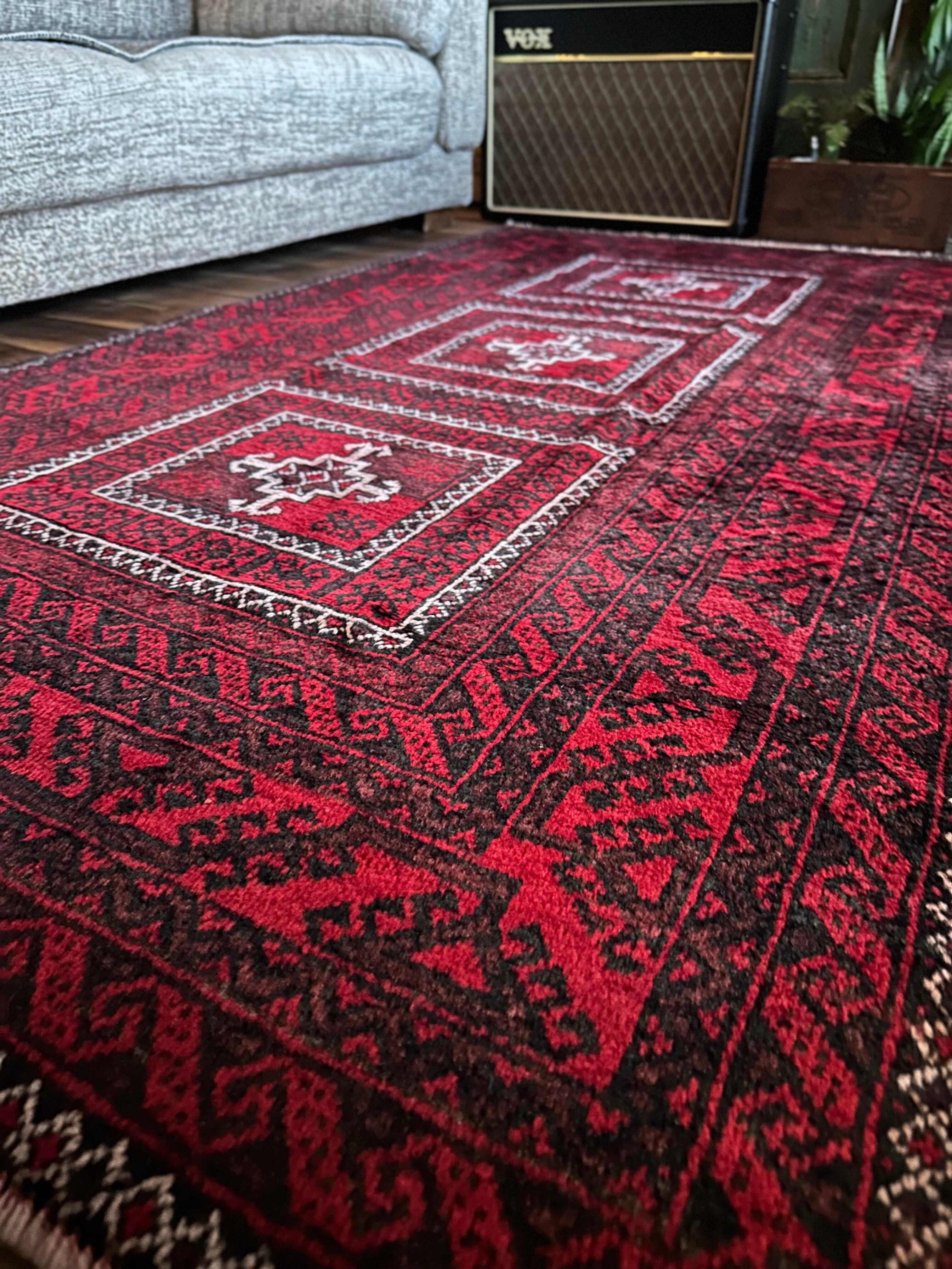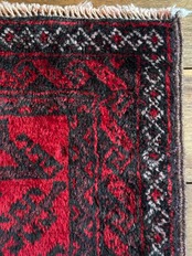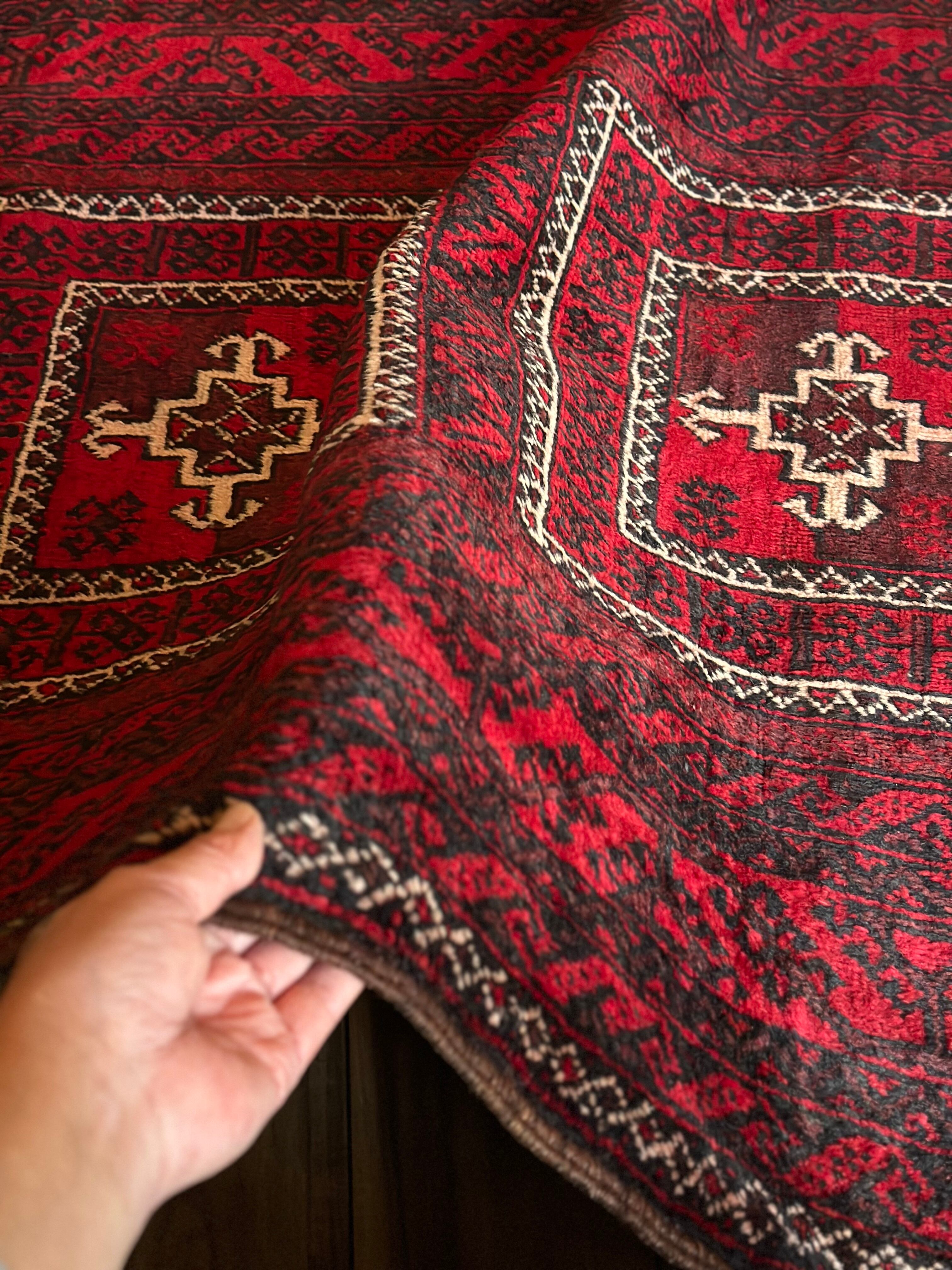 全体的に深みのある赤に黒を基調としながら、ハイライトに使われる白が浮きだって見えるバルーチ族のトライバルラグになります。