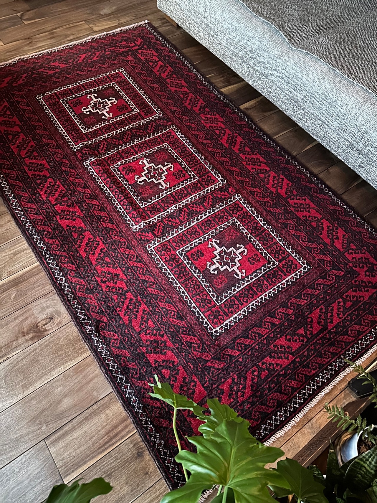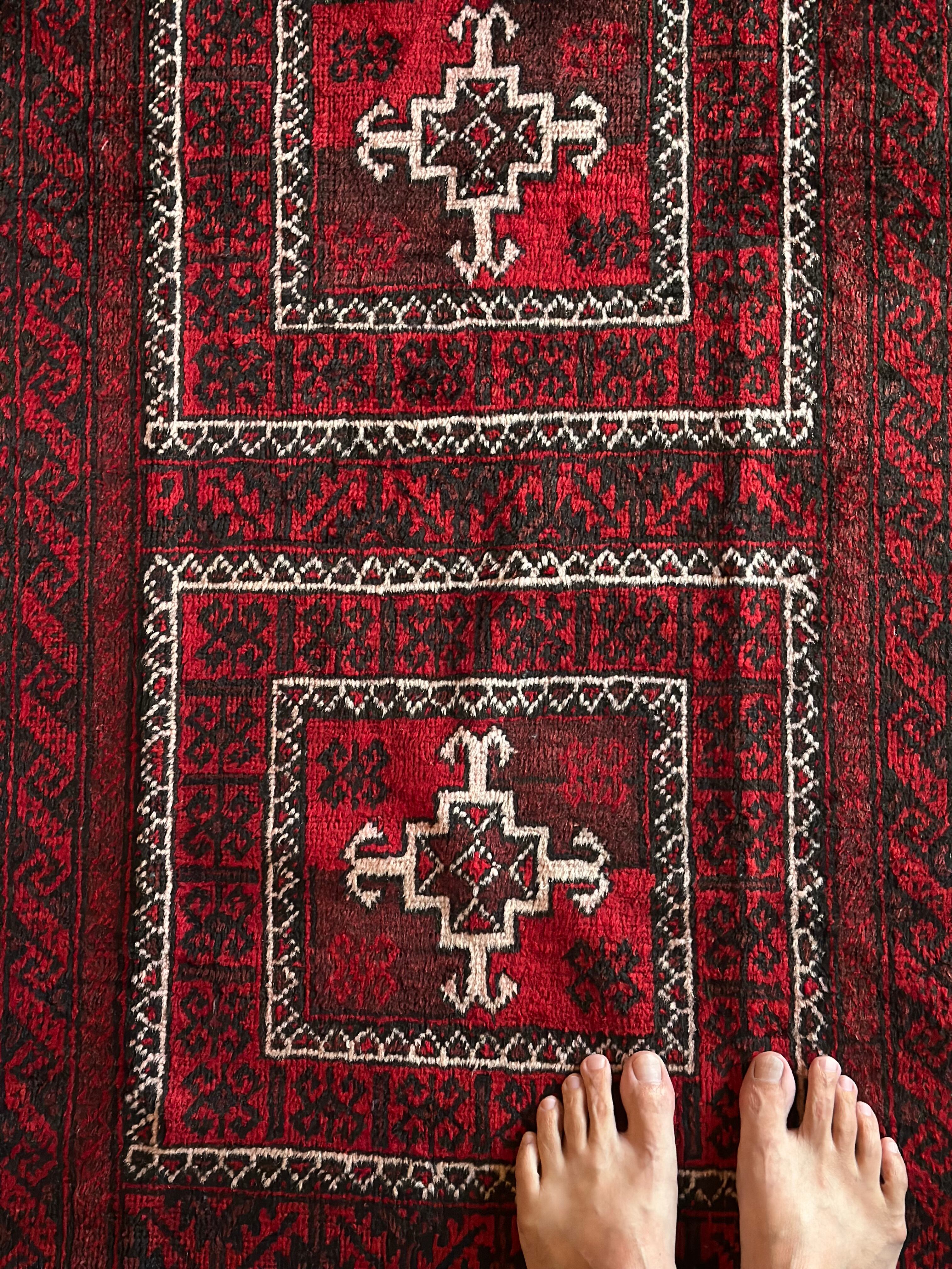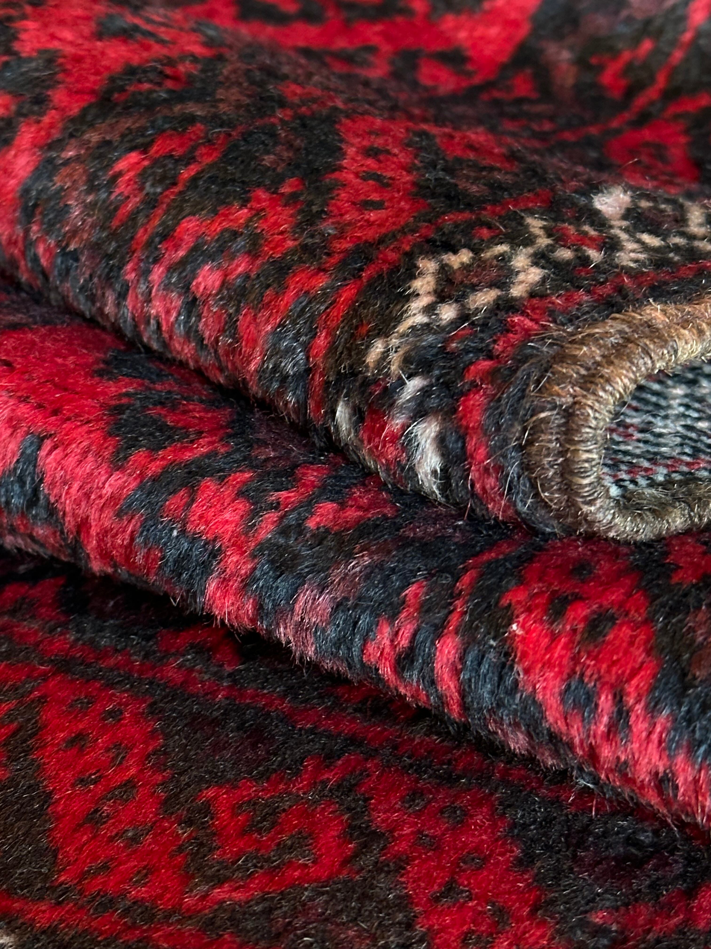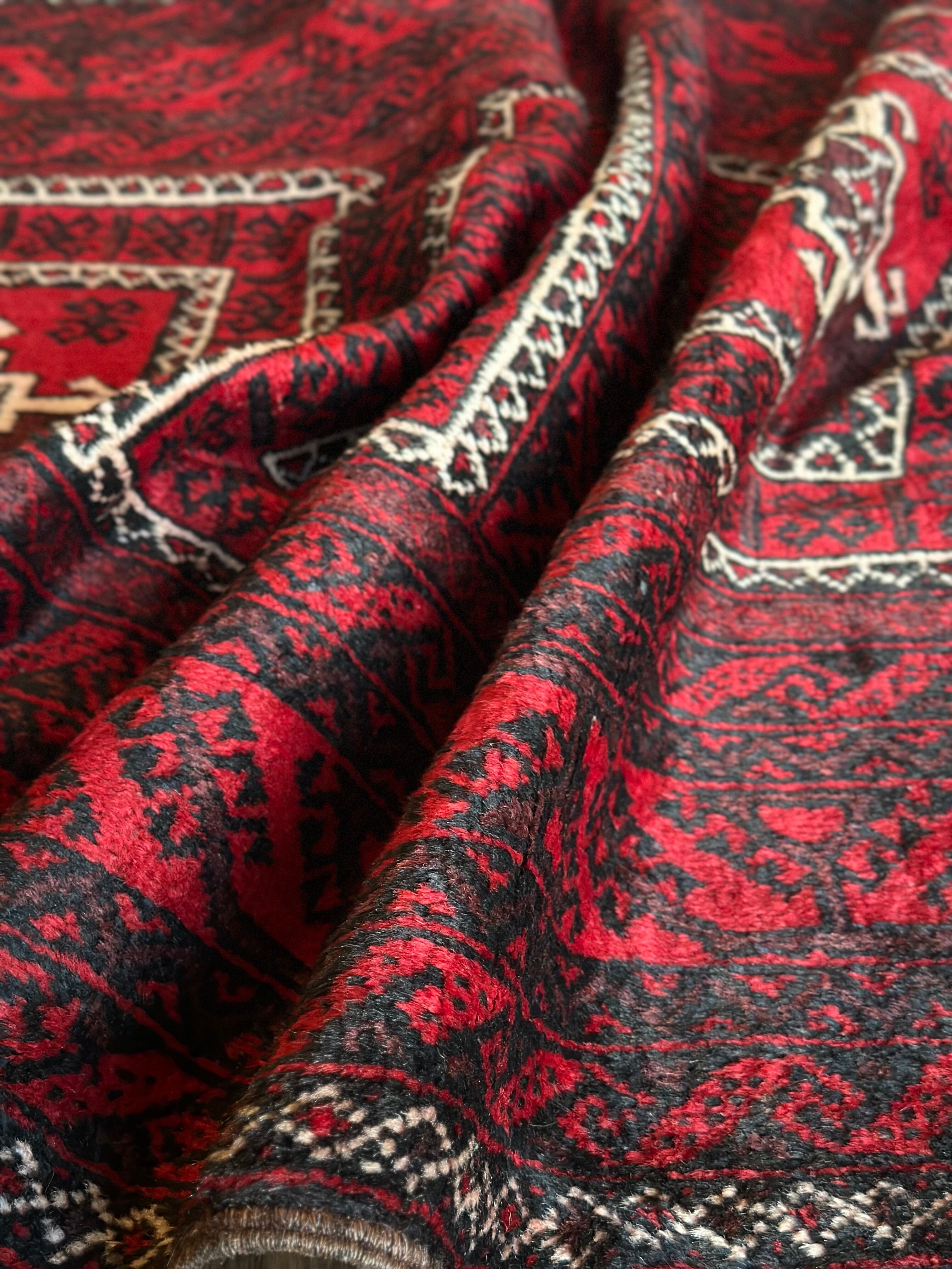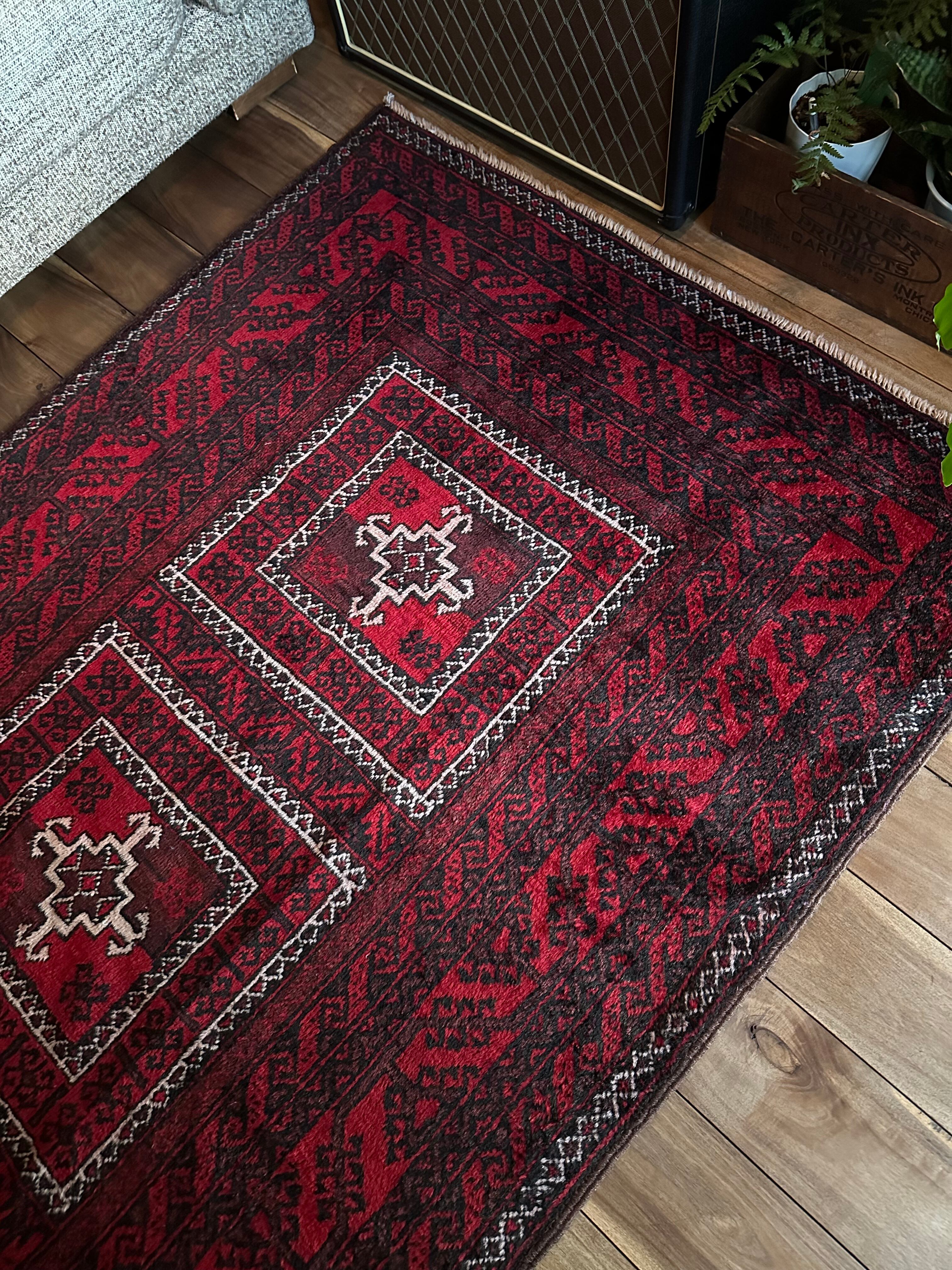 全体的に深みのある赤に黒を基調としながら、ハイライトに使われる白が浮きだって見えるバルーチ族のトライバルラグになります。